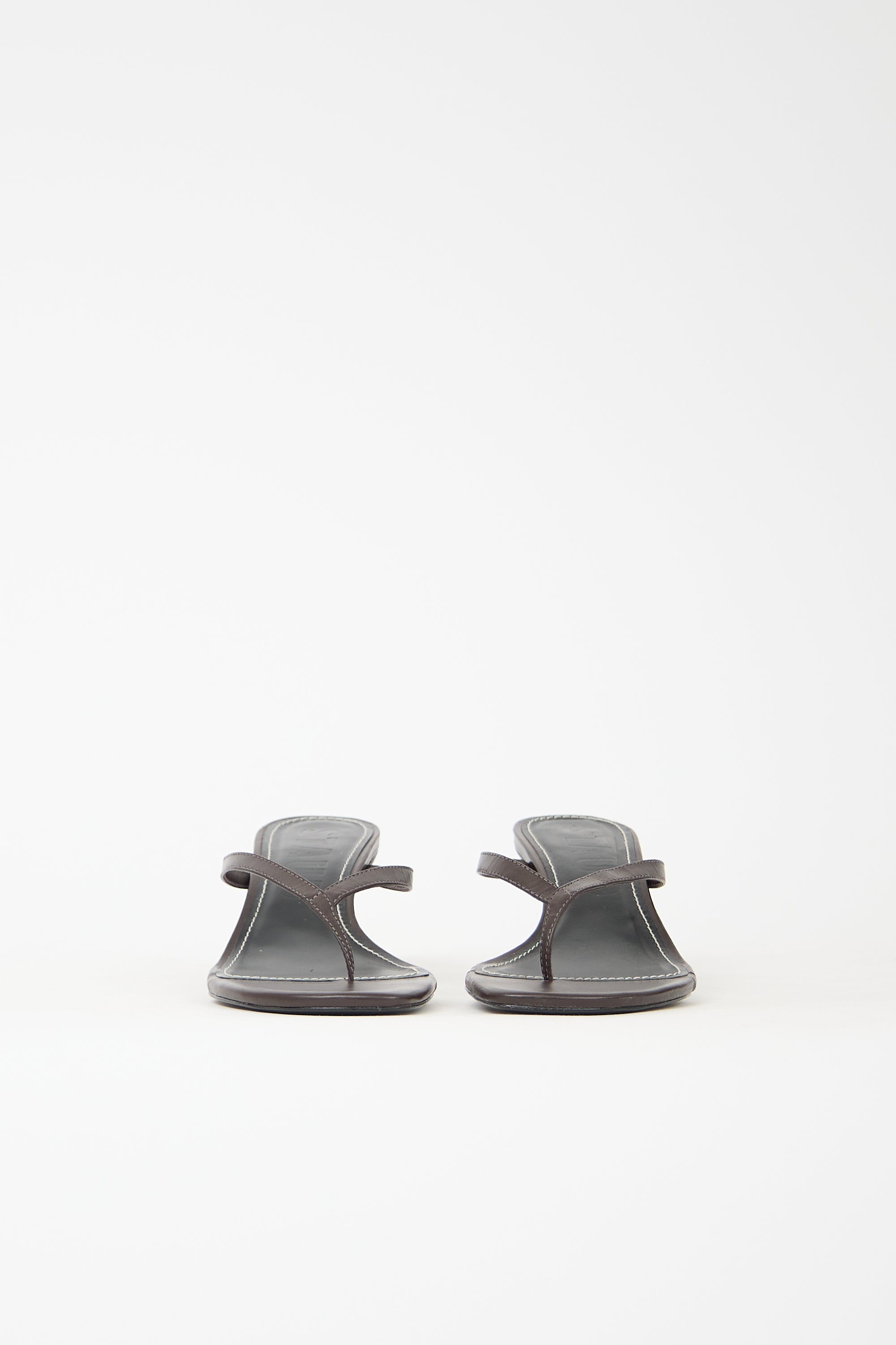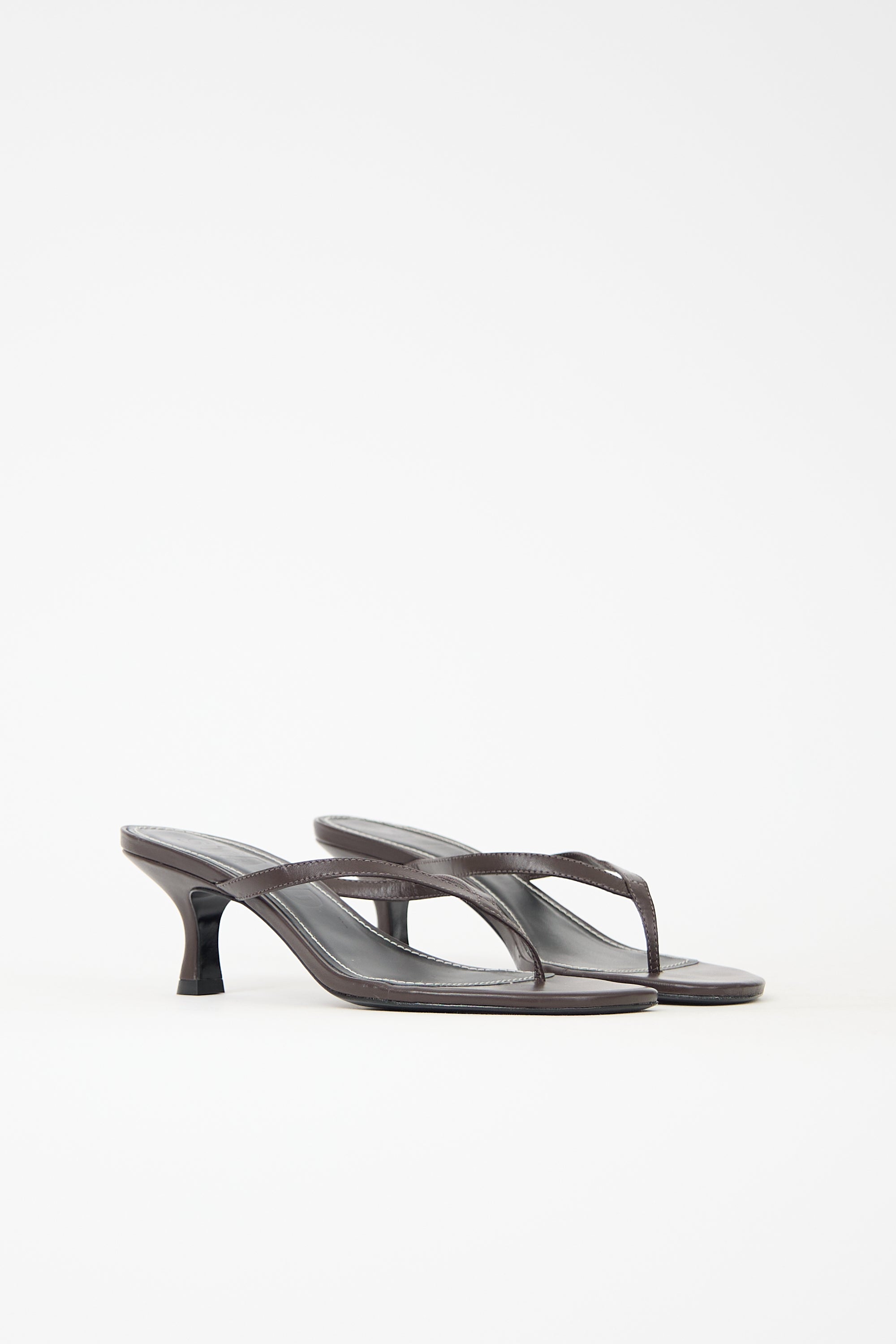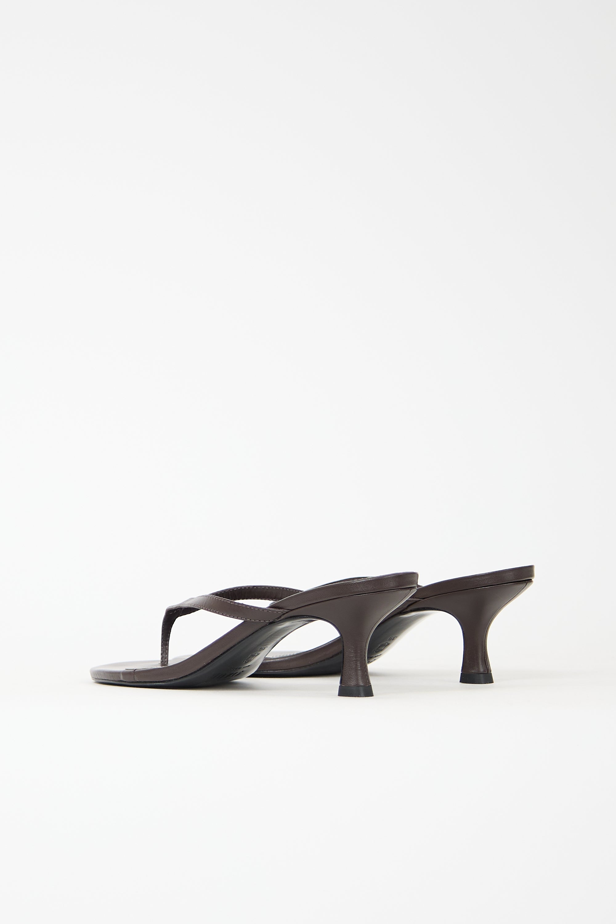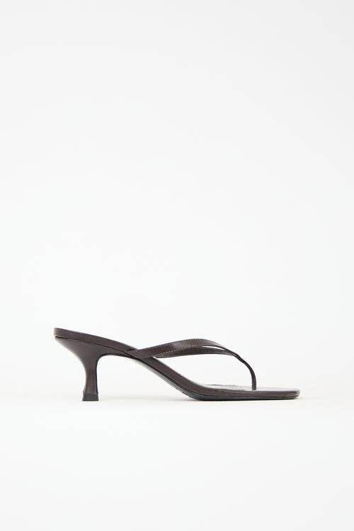 Pre-owned Staud brown leather Freja heels featuring open rounded toe, thong strap, slip on entry, and covered comma heel.