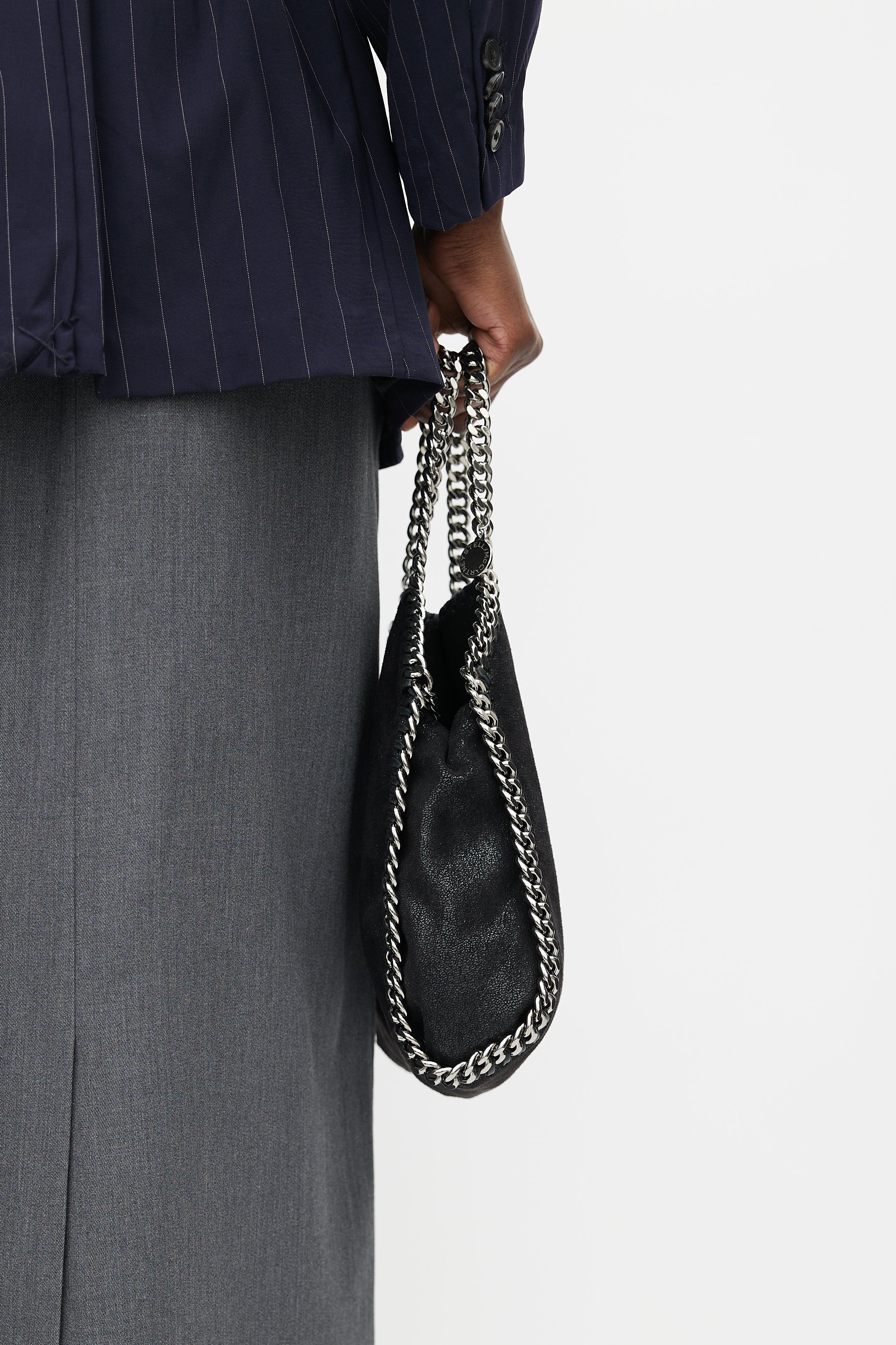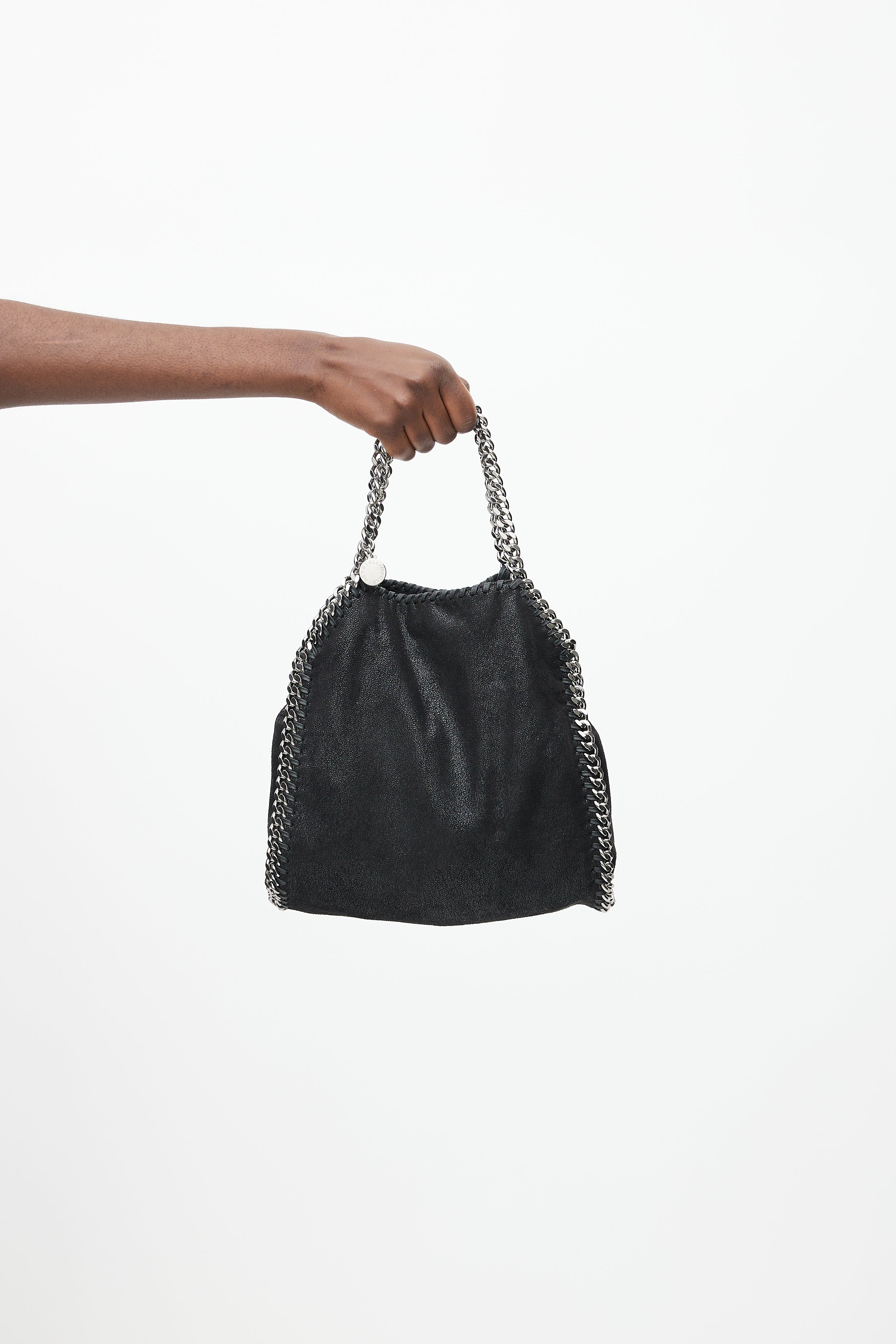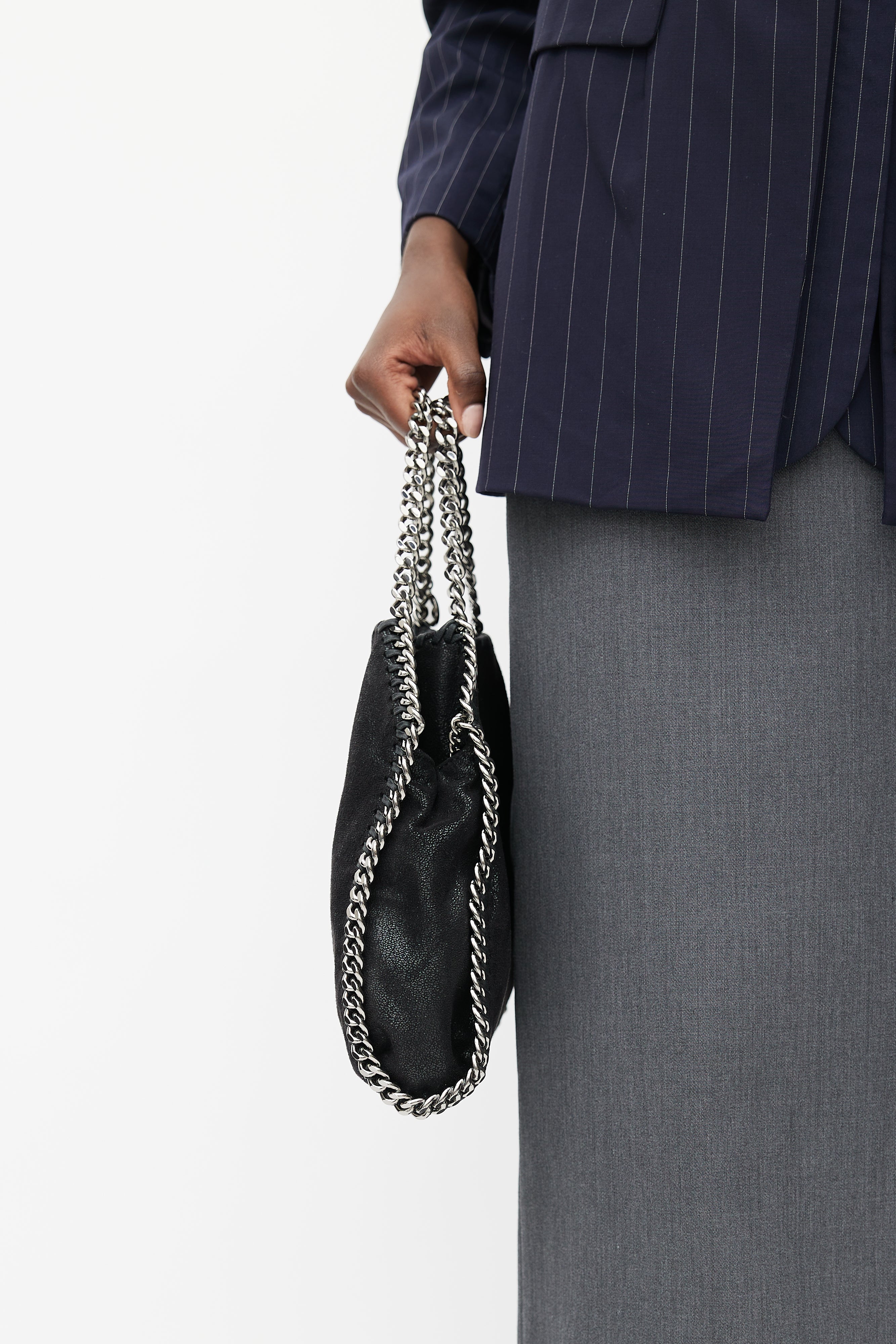 Pre-owned Stella McCartney black small Falabella bag featuring silver tone braided chain trim at side, chain link shoulder strap, two top handles, one main compartment with one slip pocket, and magnetic top closure. Comes with original dust bag.
