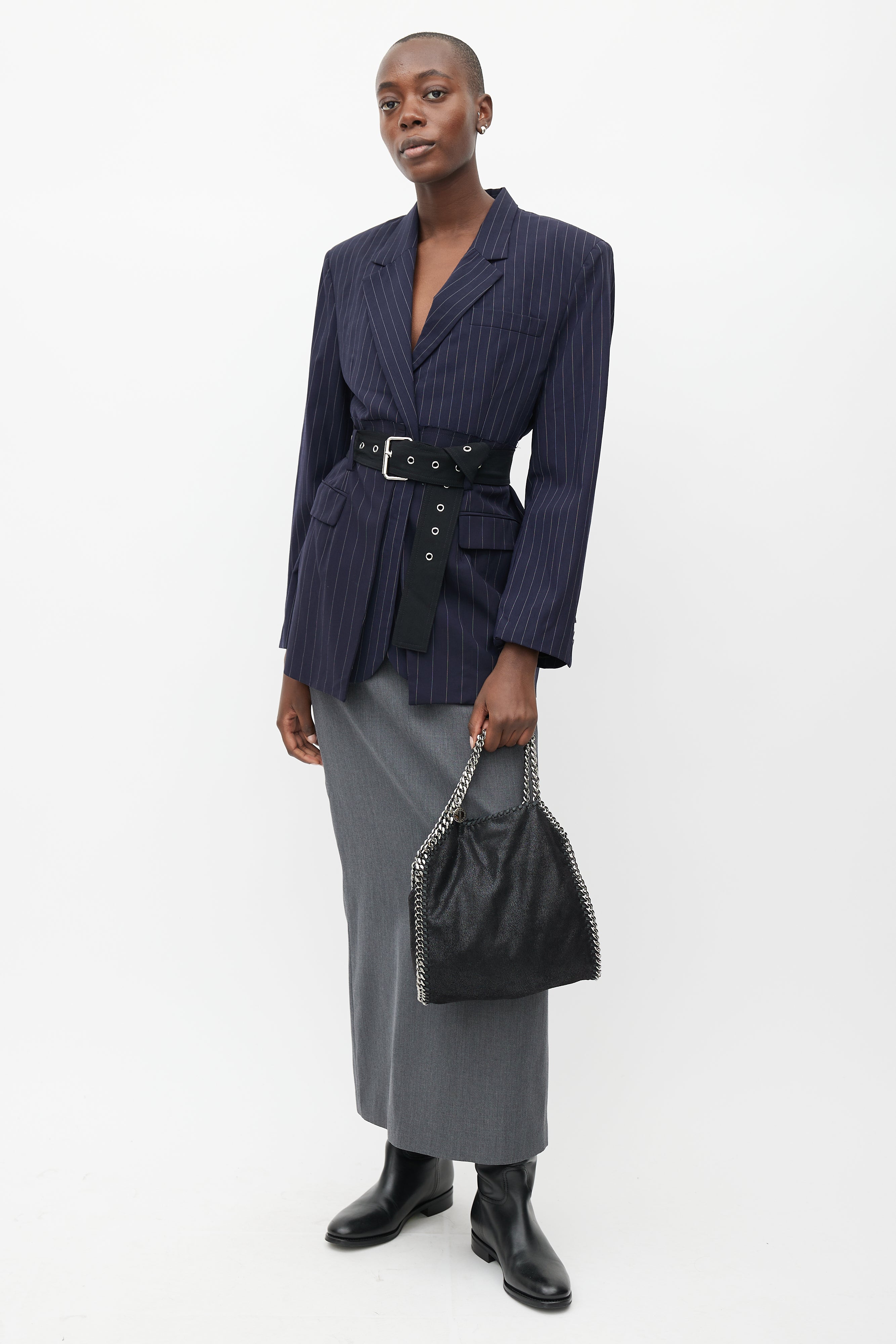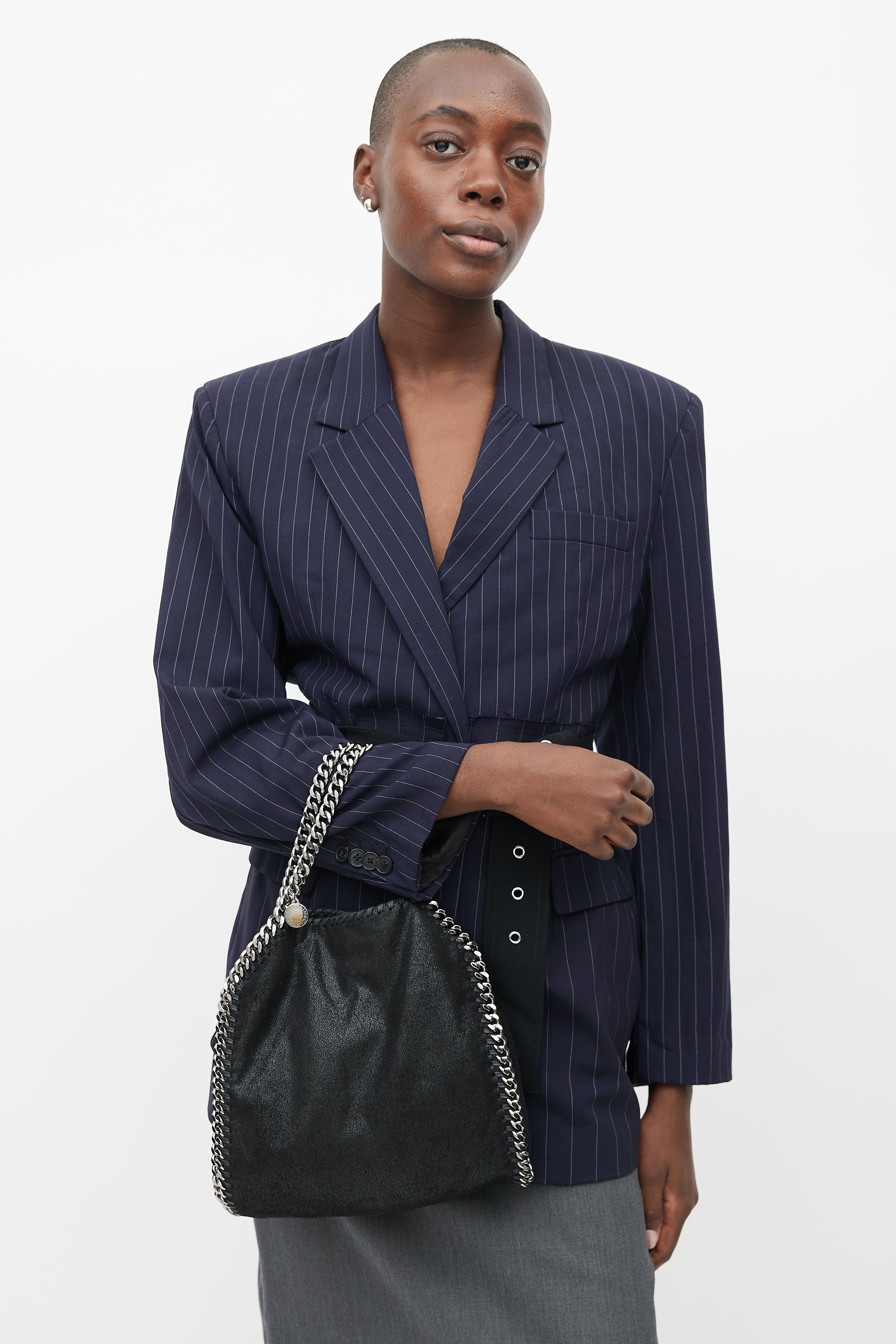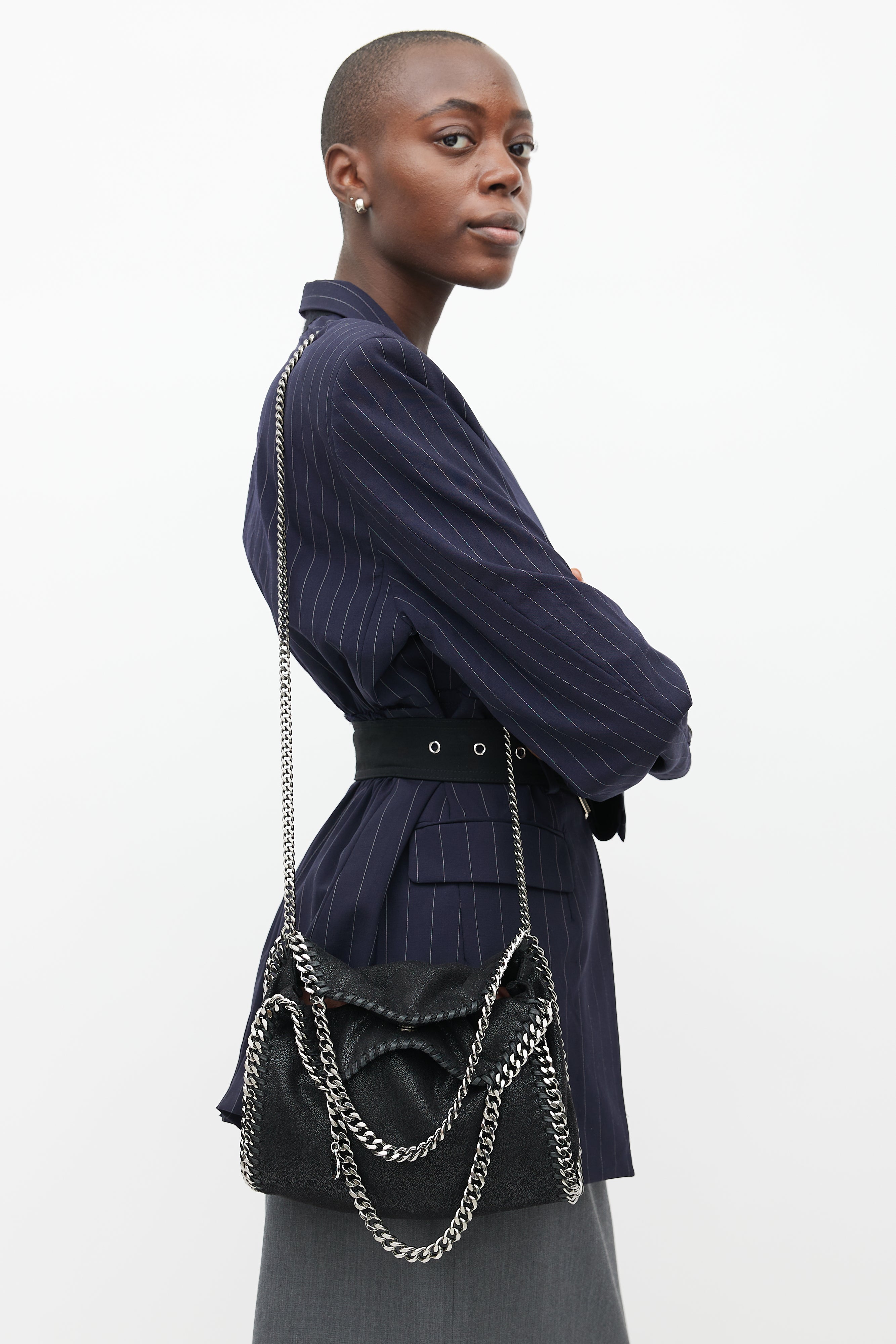 Pre-owned Stella McCartney black small Falabella bag featuring silver tone braided chain trim at side, chain link shoulder strap, two top handles, one main compartment with one slip pocket, and magnetic top closure. Comes with original dust bag.