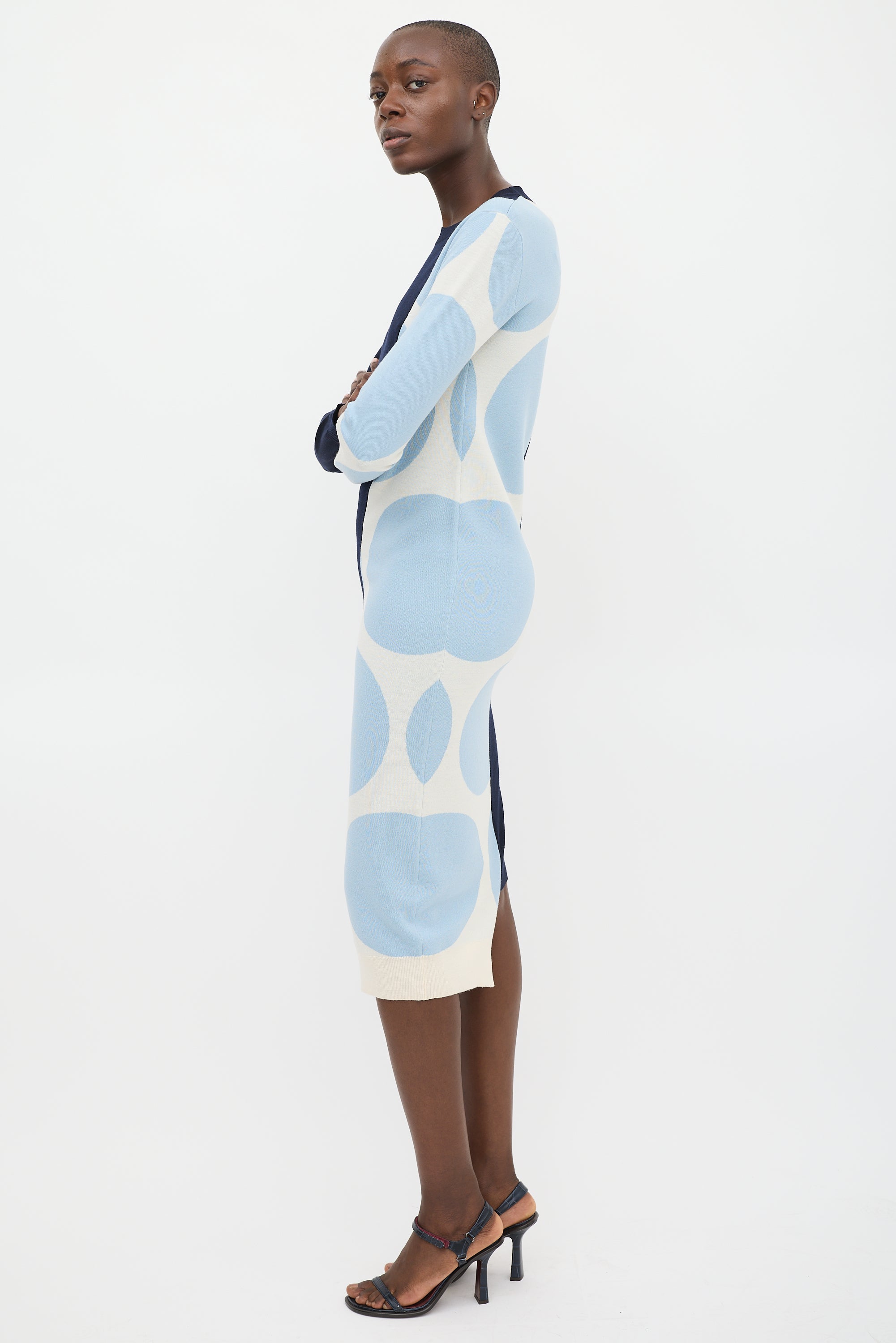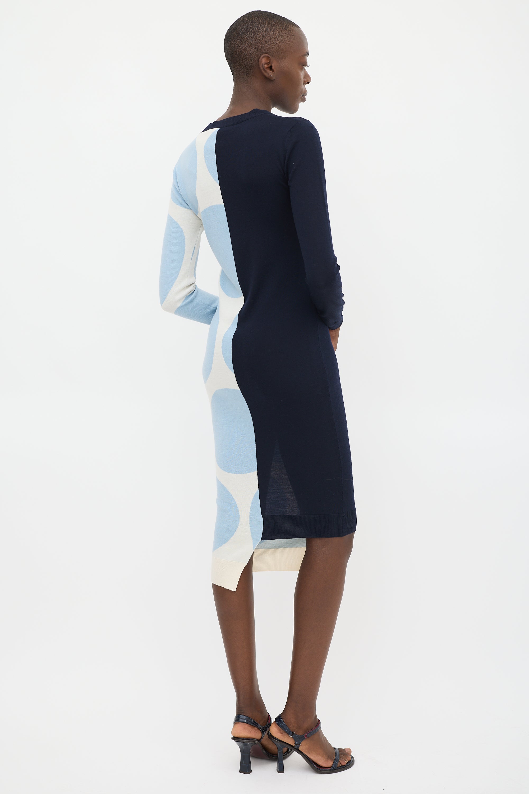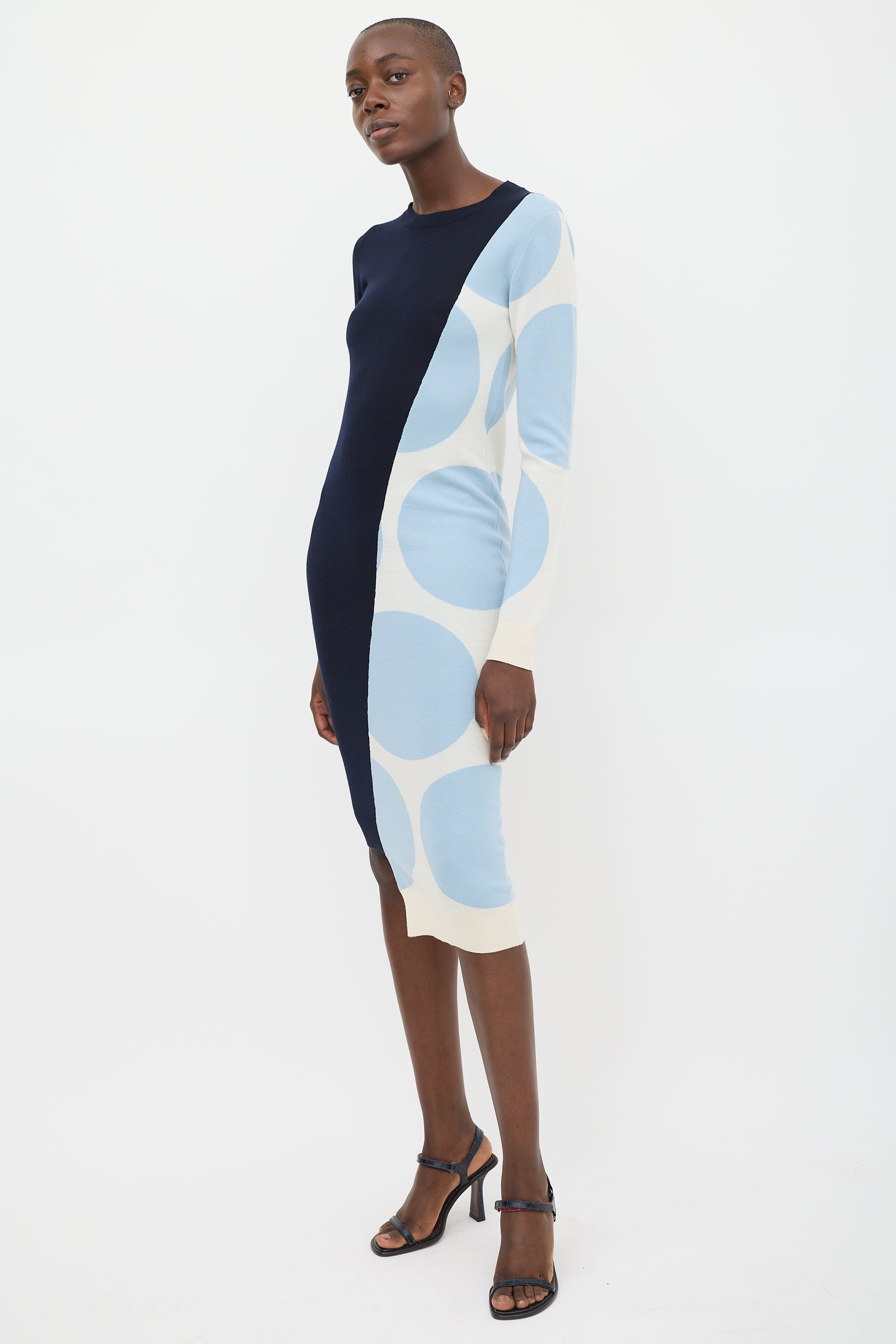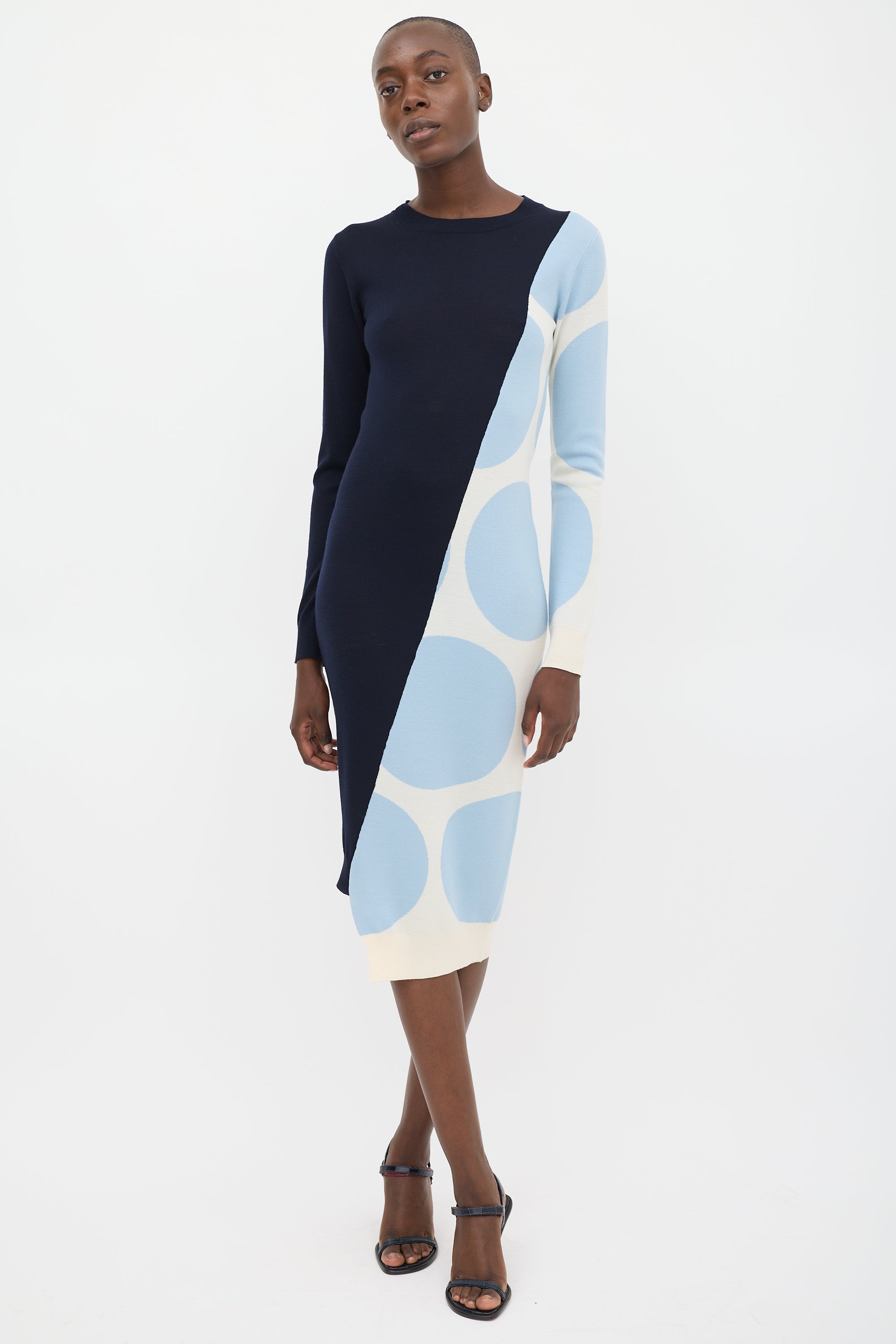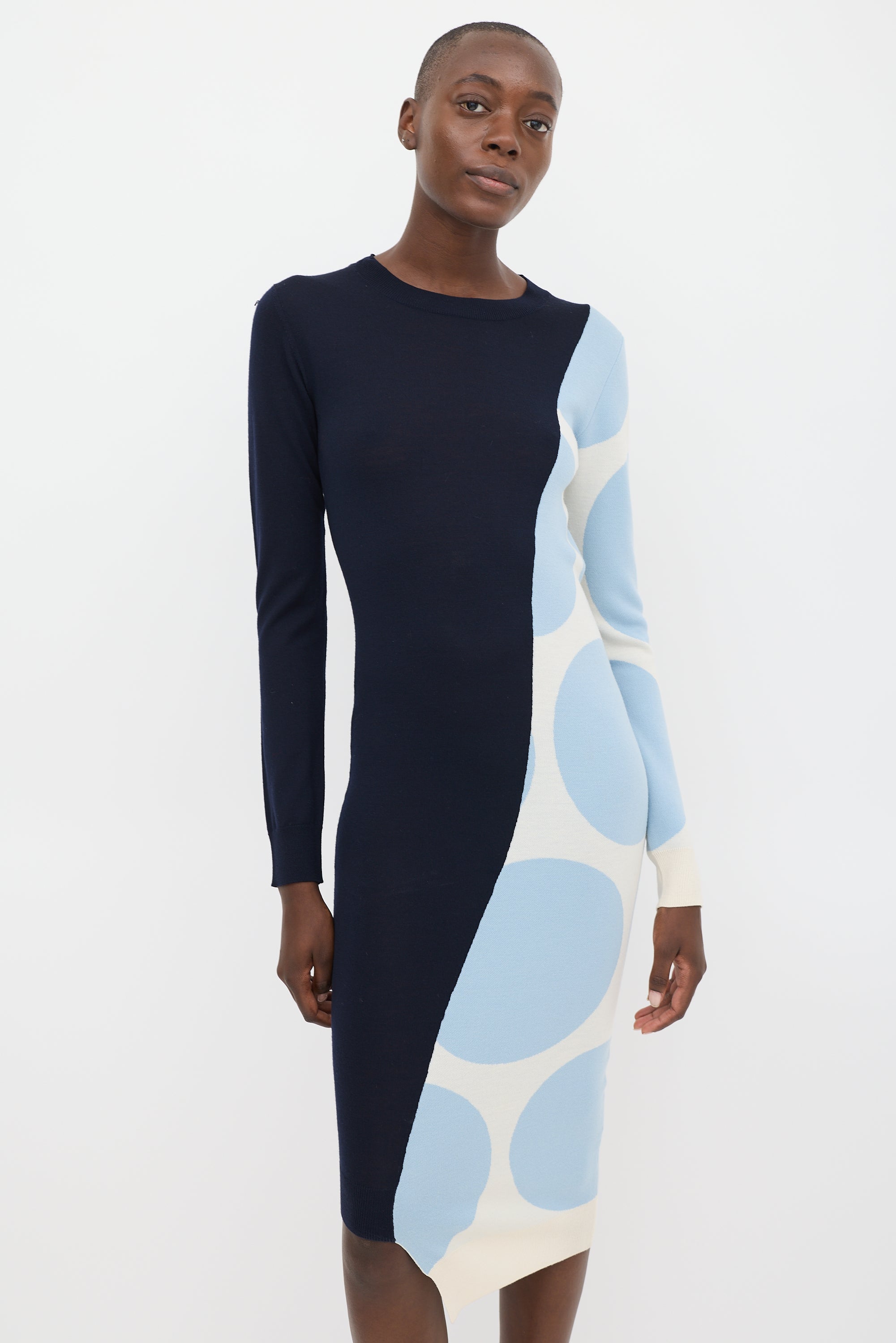Pre-owned Stella McCartney navy, light blue, and white wool midi sweater dress featuring a round neck, asymmetrical split design, polka dot intarsia throughout left side, uneven hem, long sleeves, and ribbing at neck, hem, and cuffs.