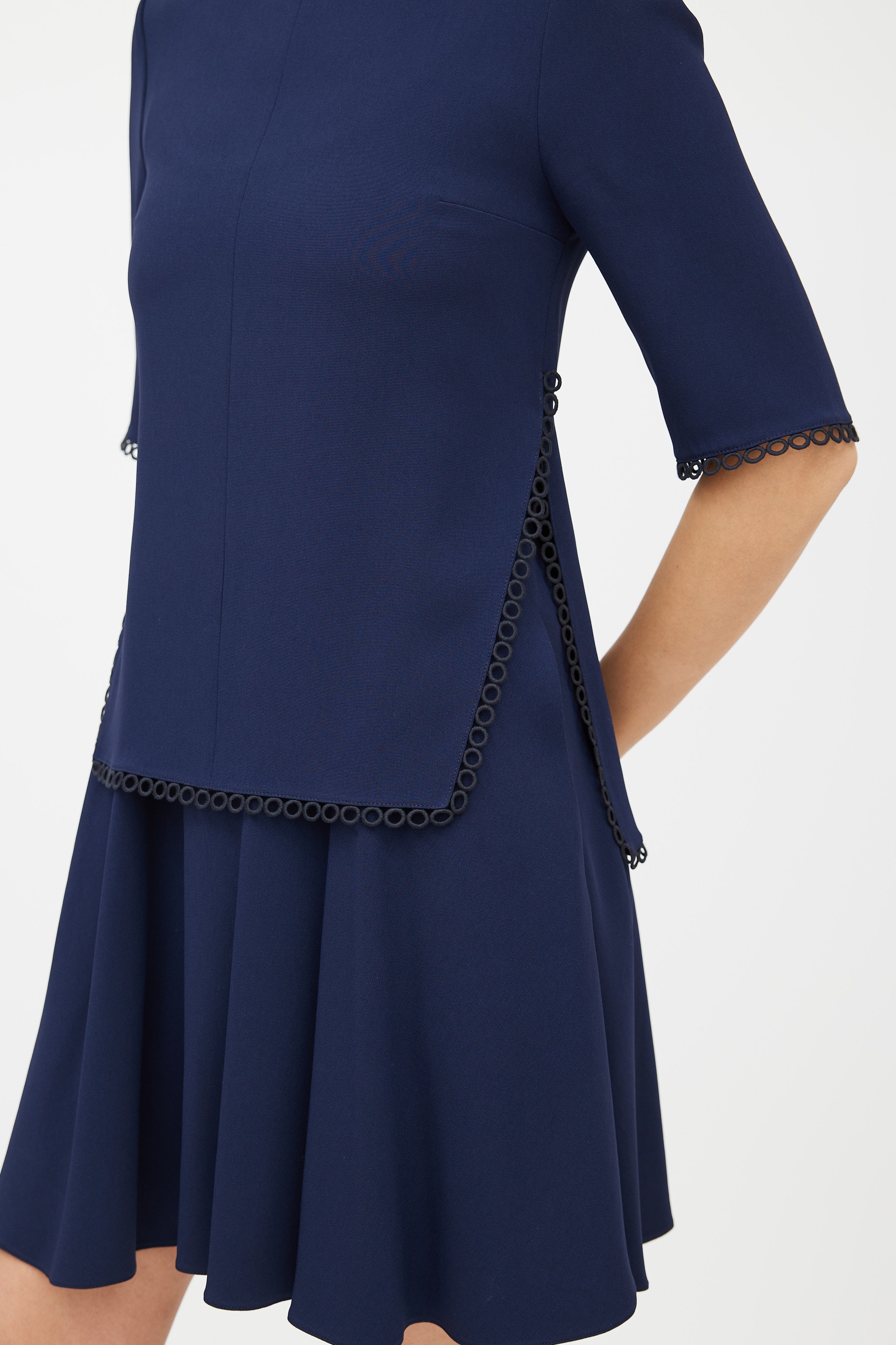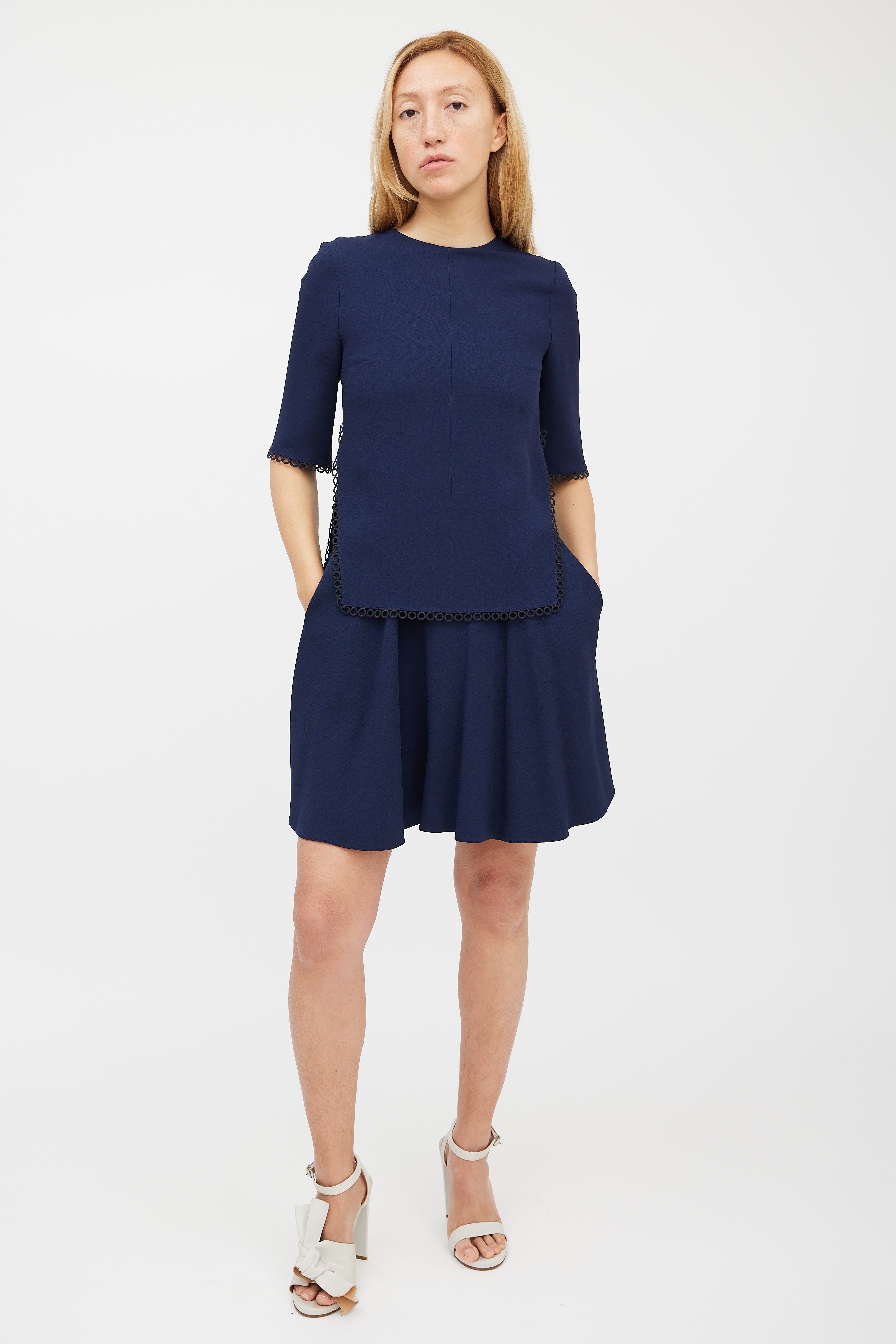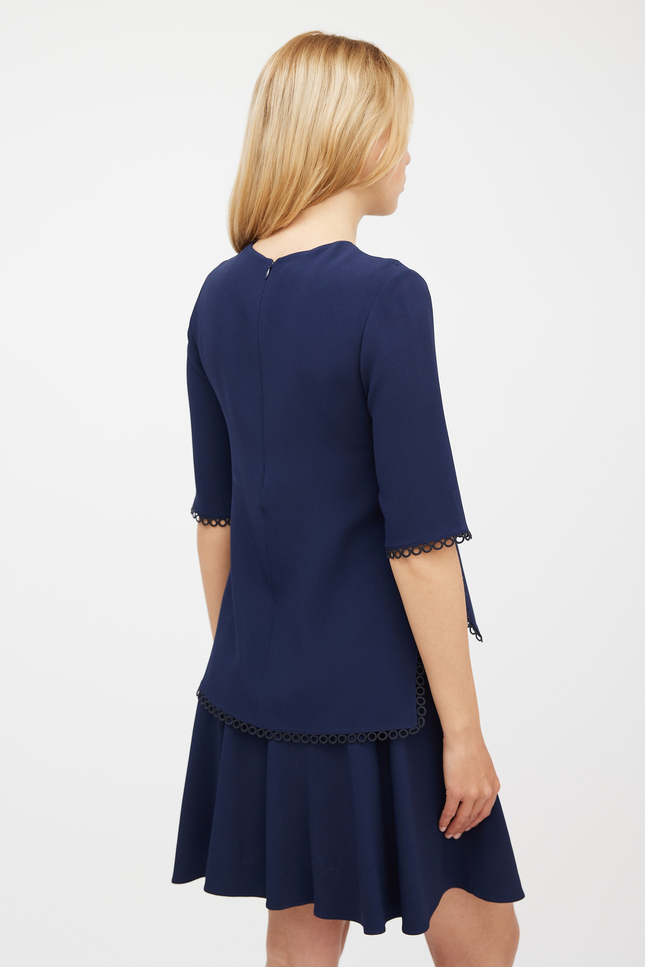 Pre-owned Stella McCartney navy dress featuring a round neckline, short sleeves, tonal layered detailing at bust, scalloped eyelet trim, two slip pockets at hip, and zip at back with hook and eye closure.