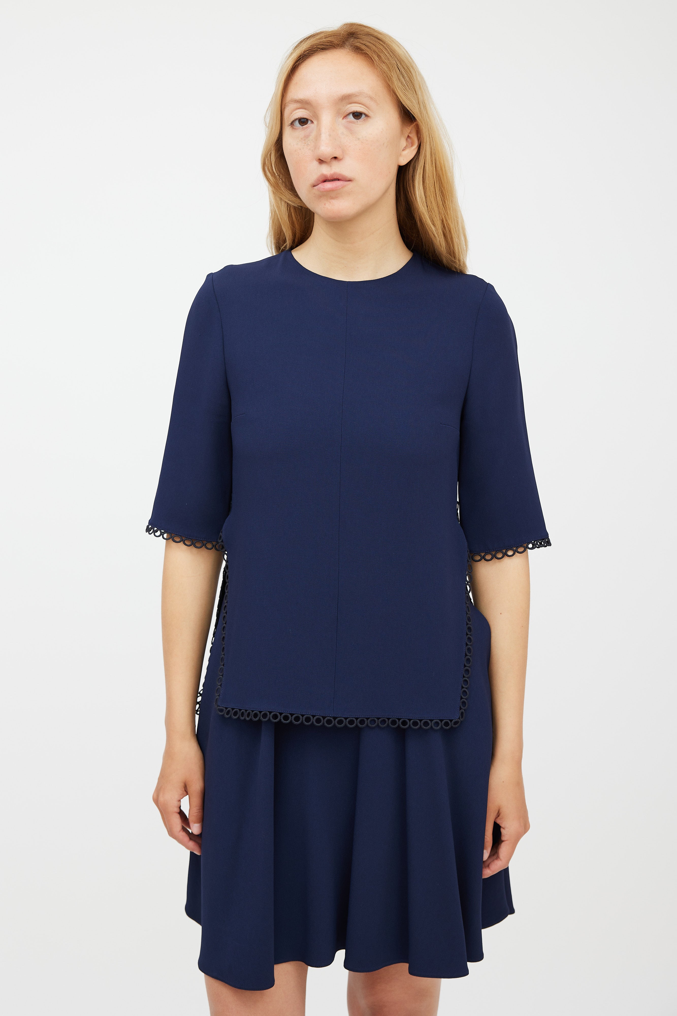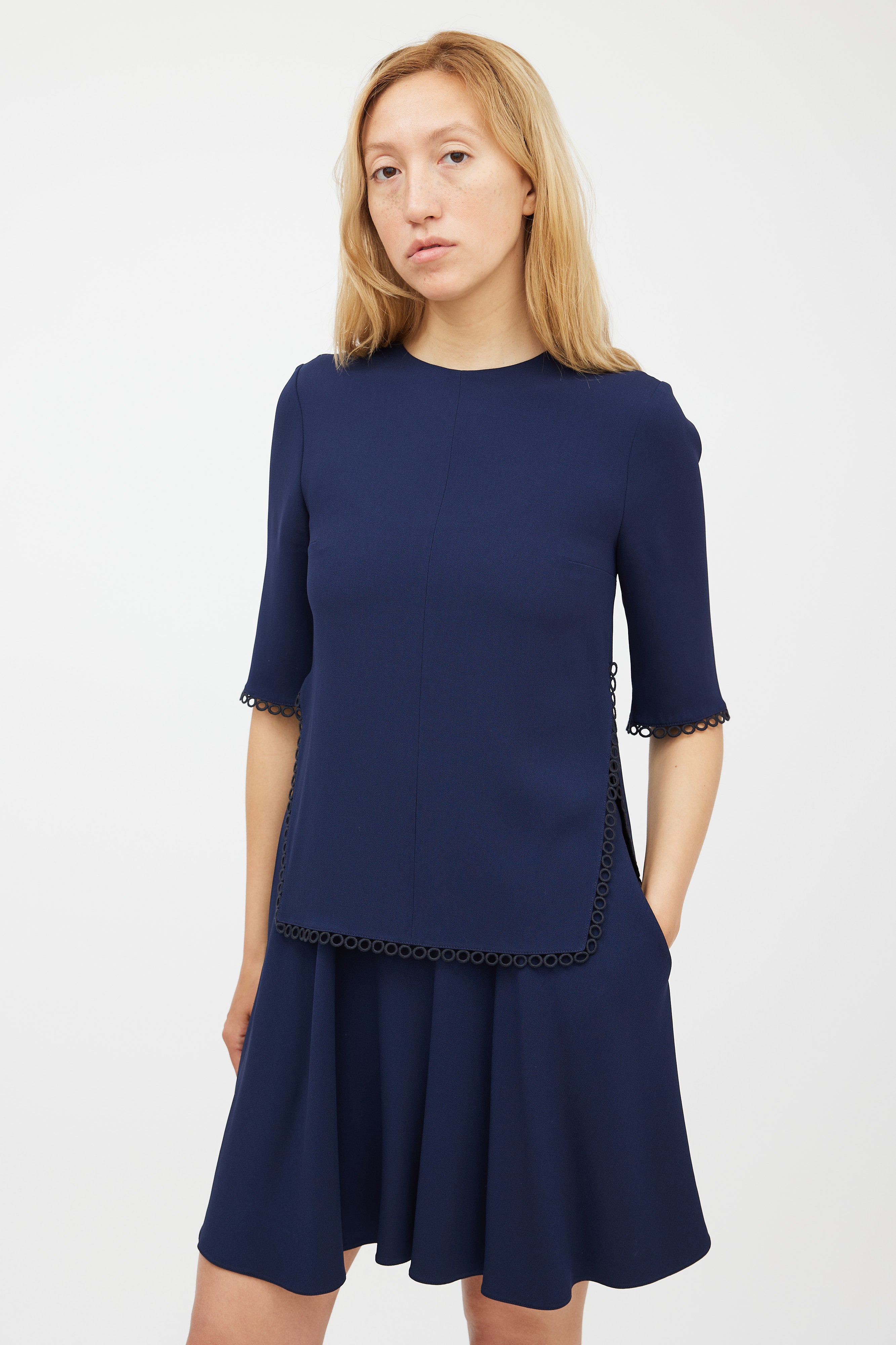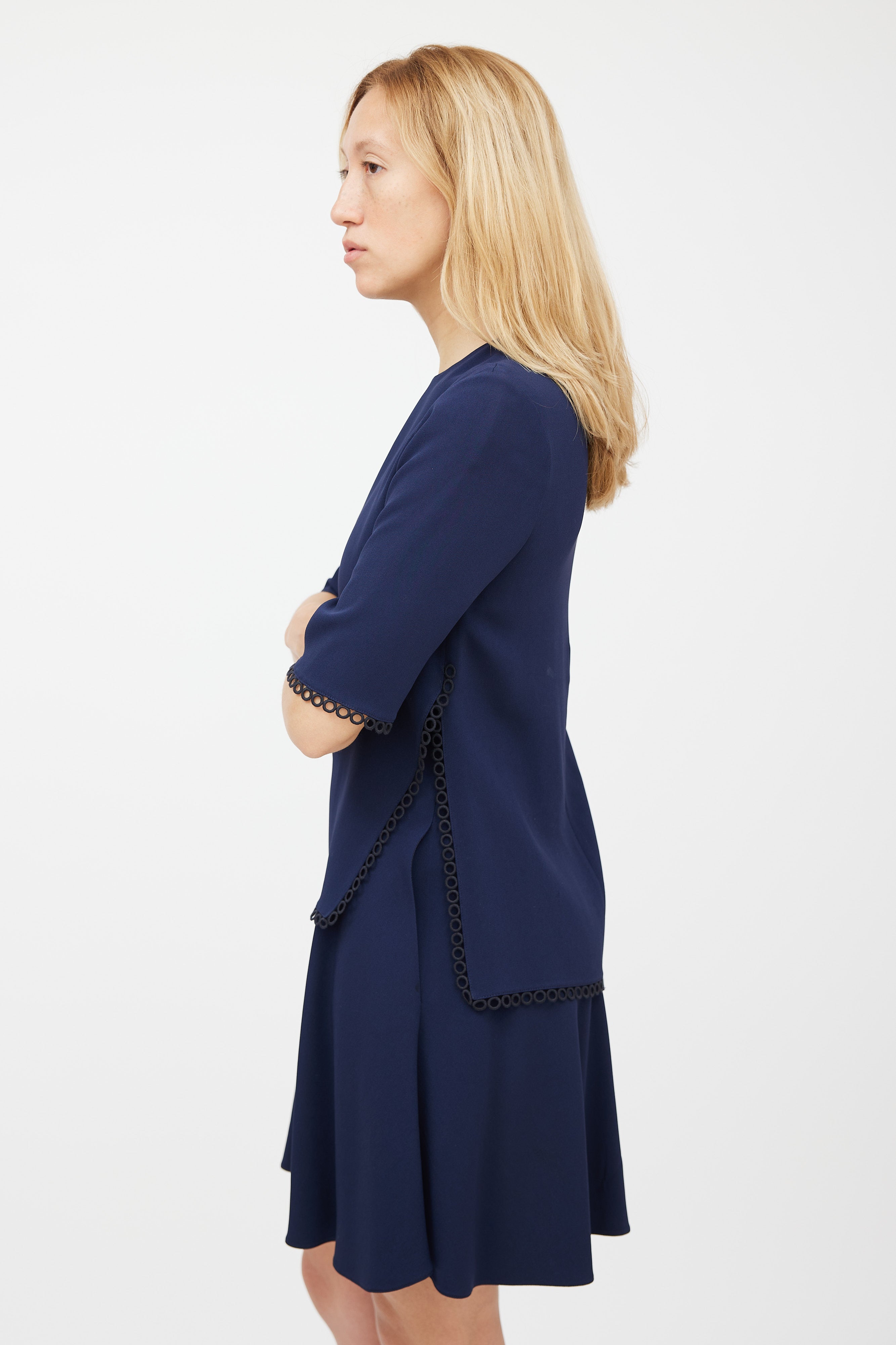 Pre-owned Stella McCartney navy dress featuring a round neckline, short sleeves, tonal layered detailing at bust, scalloped eyelet trim, two slip pockets at hip, and zip at back with hook and eye closure.