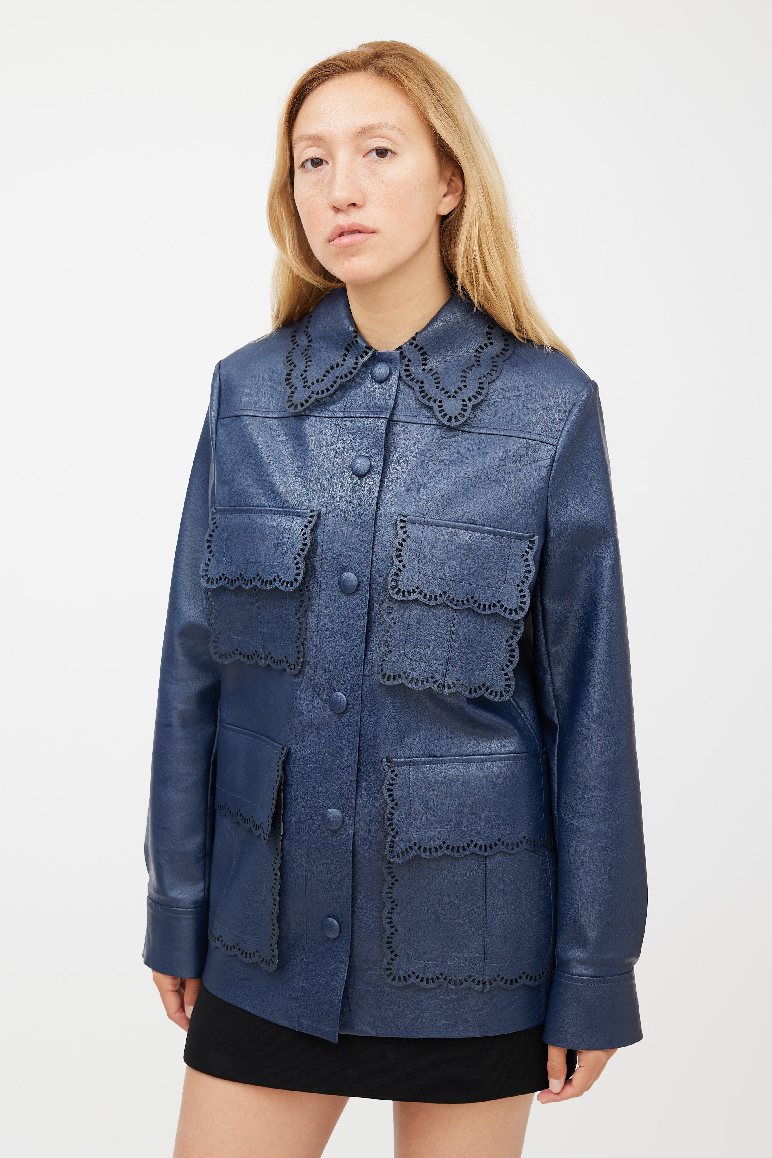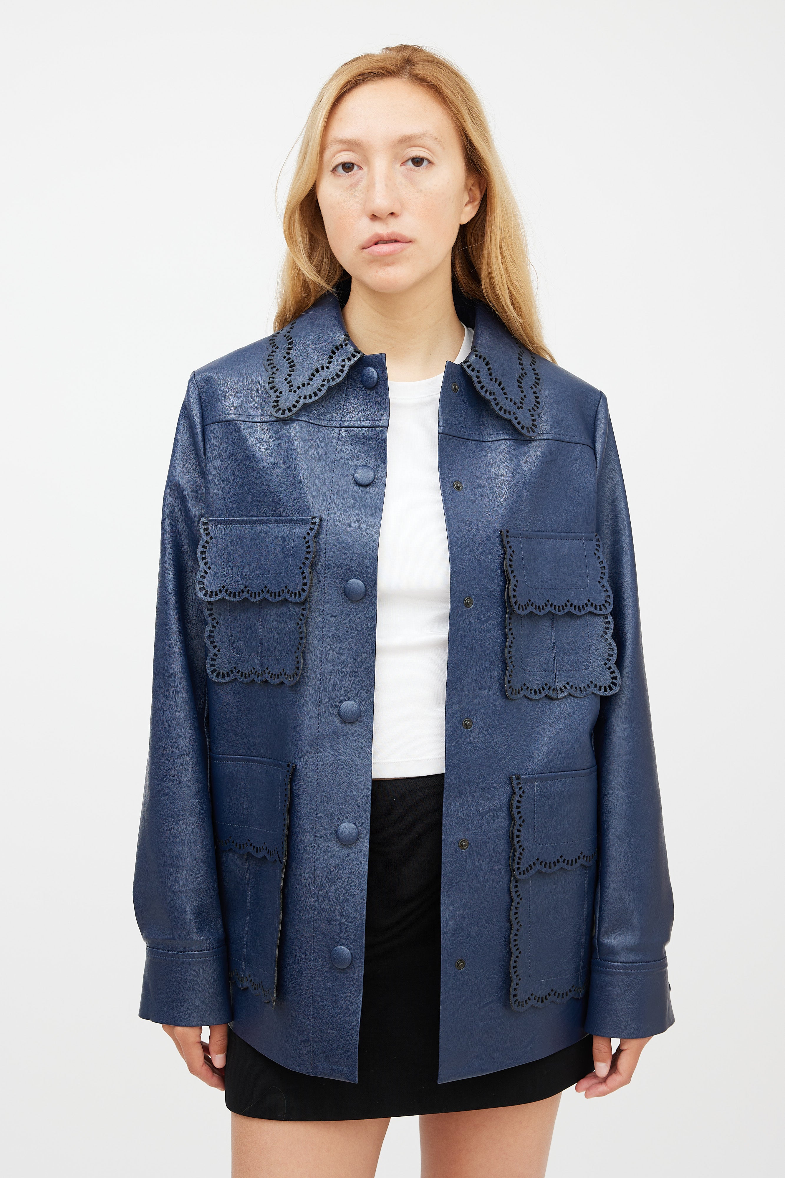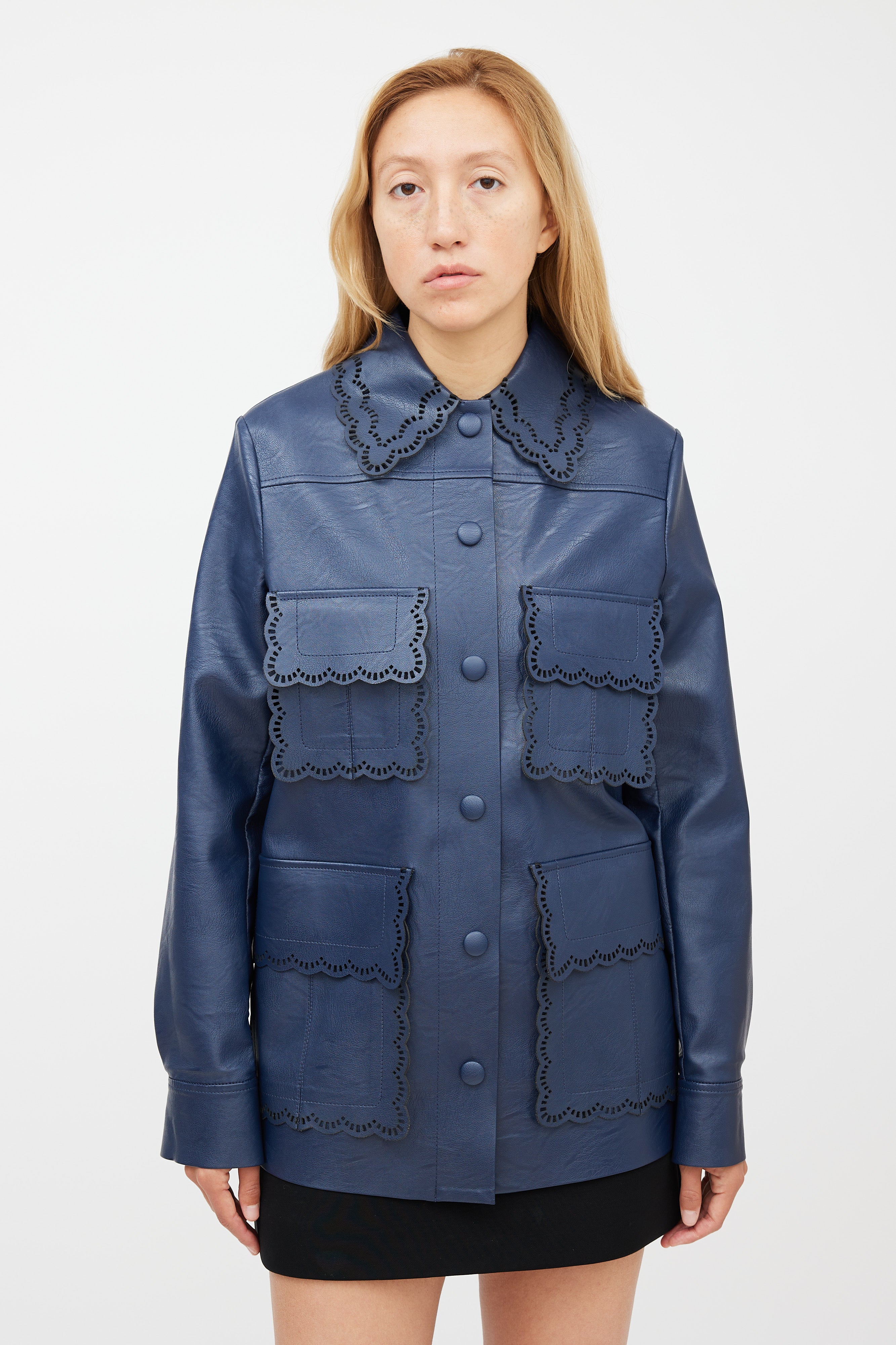 Pre-owned Stella McCartney navy faux leather jacket featuring a pointed collar, long sleeves with buttoned cuffs, four flap pockets at front with scalloped eyelet trim, and snap button closure.