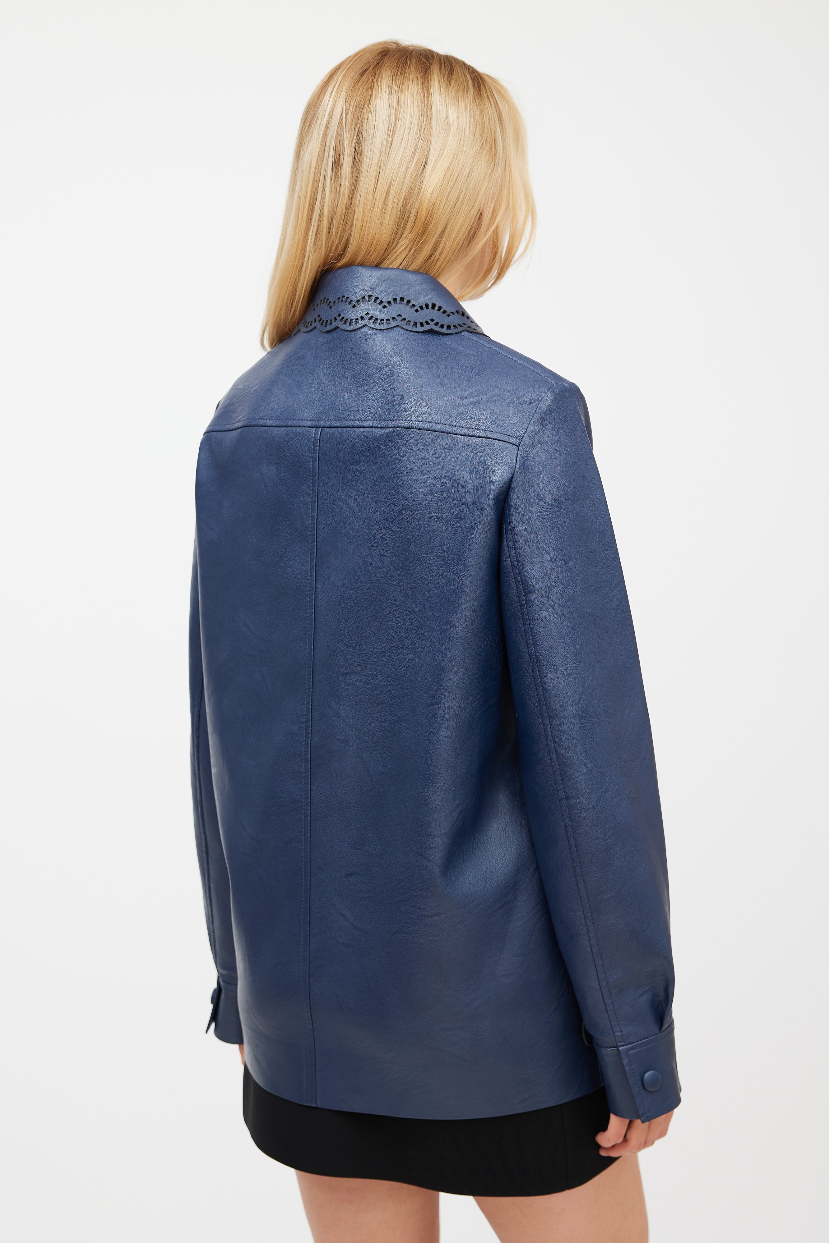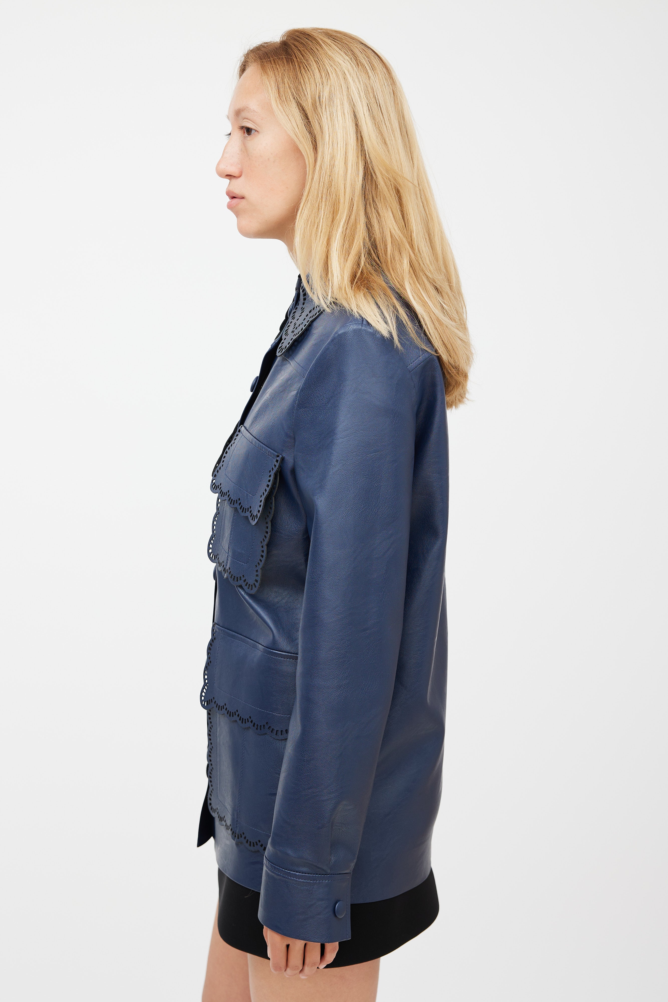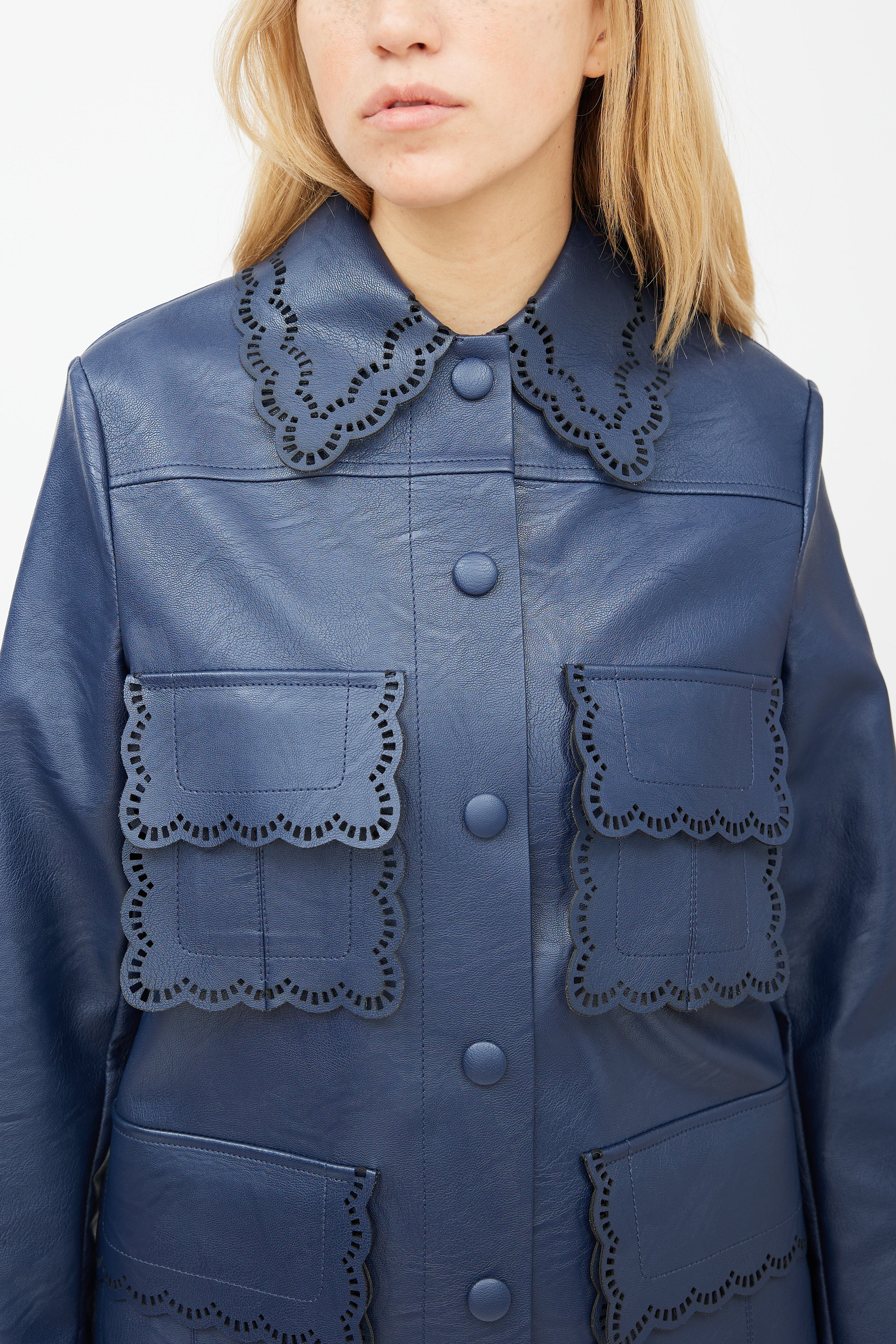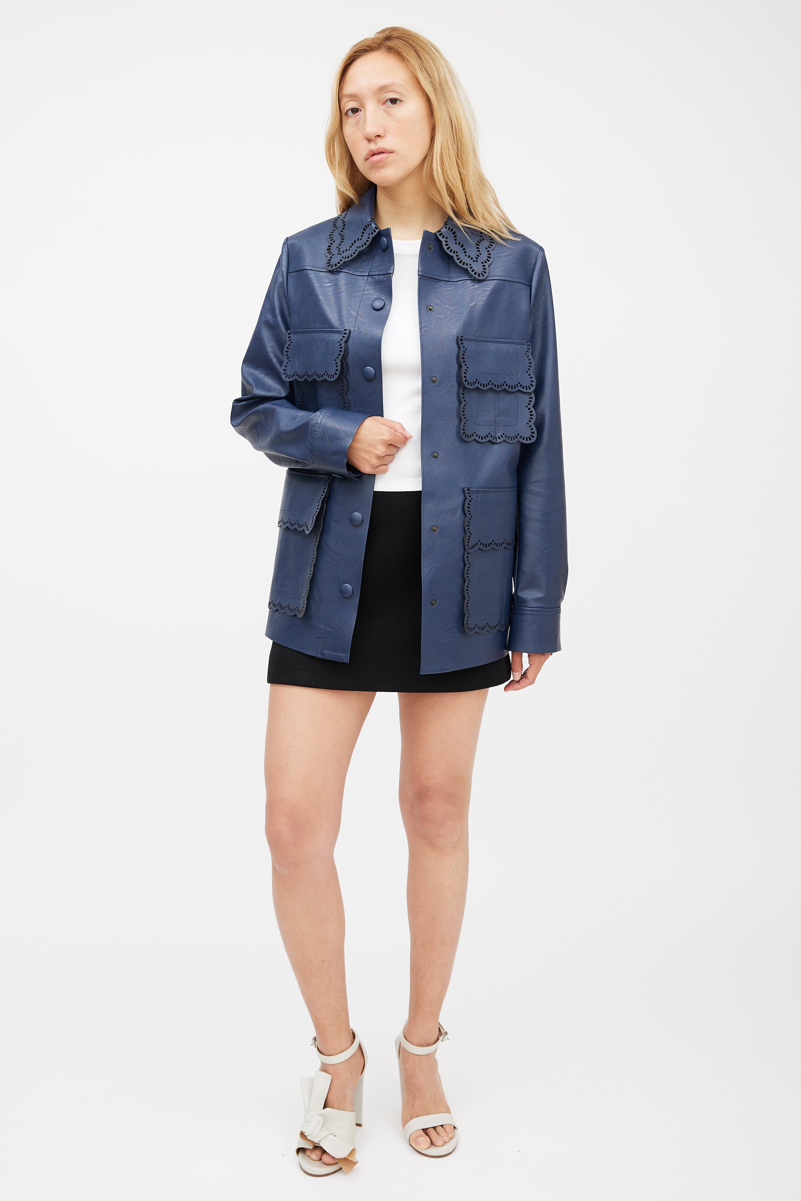 Pre-owned Stella McCartney navy faux leather jacket featuring a pointed collar, long sleeves with buttoned cuffs, four flap pockets at front with scalloped eyelet trim, and snap button closure.