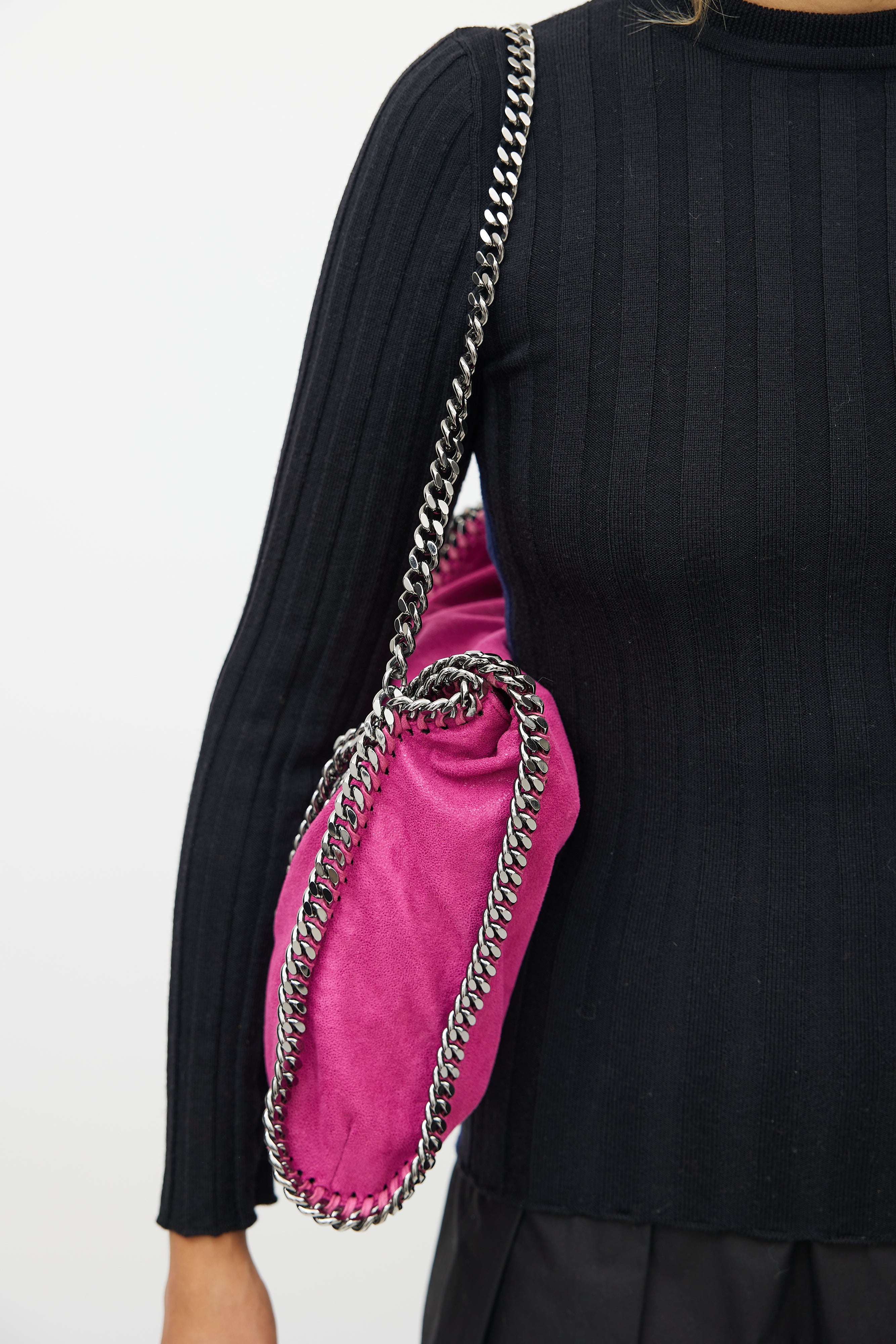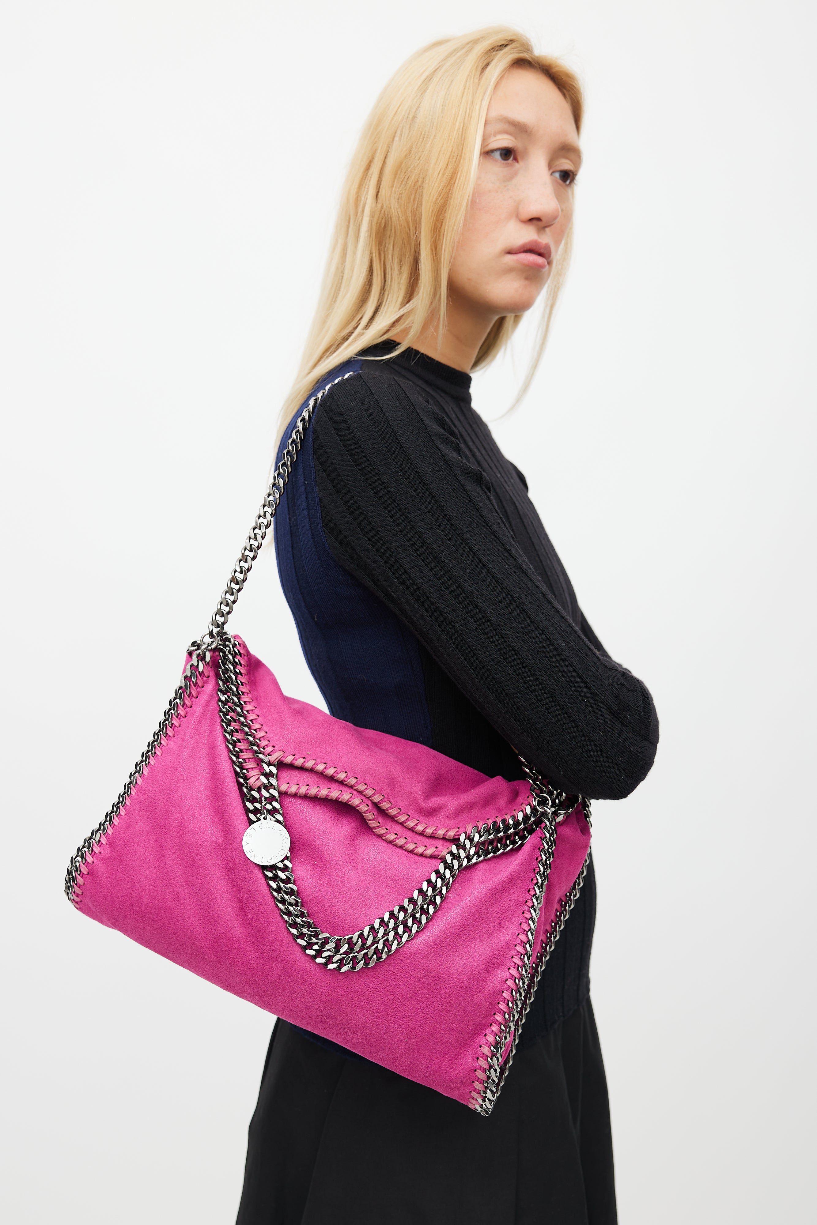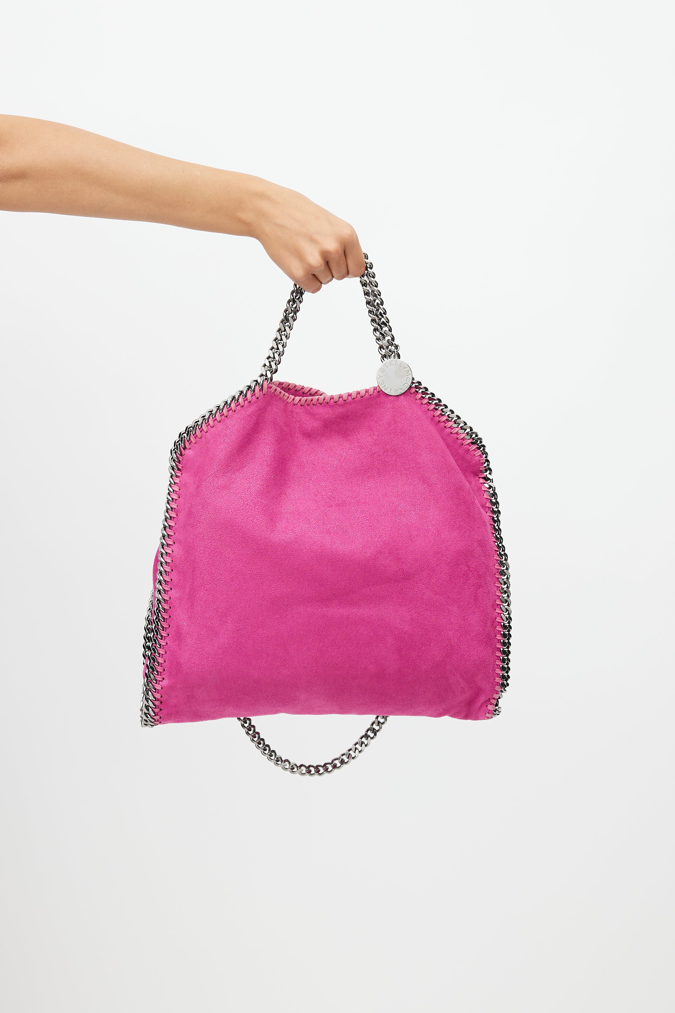 Pre-owned Stella McCartney pink Falabella bag featuring silver tone braided chain trim at side, chain link shoulder straps, one main compartment with one slip pocket, and magnetic top closure.