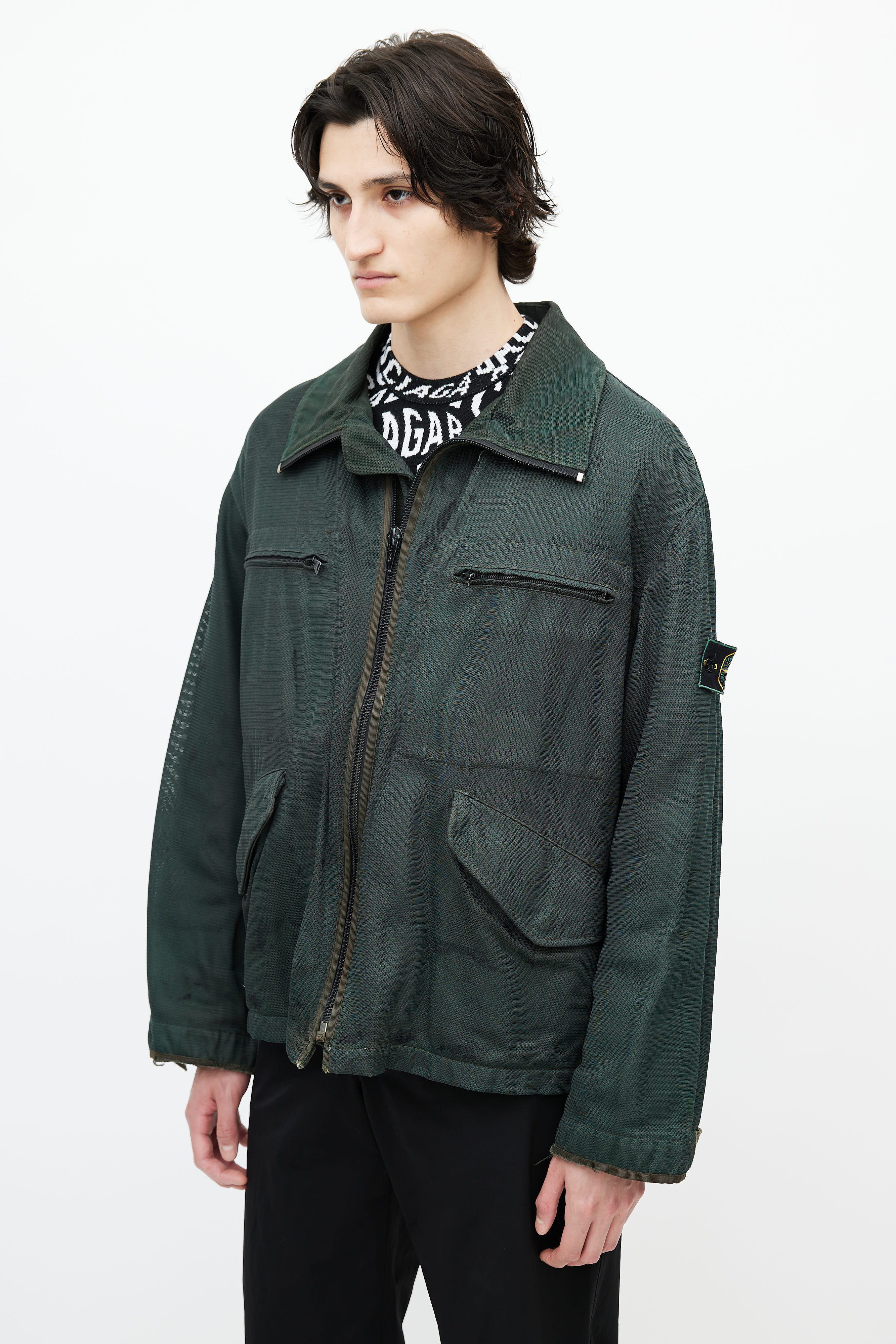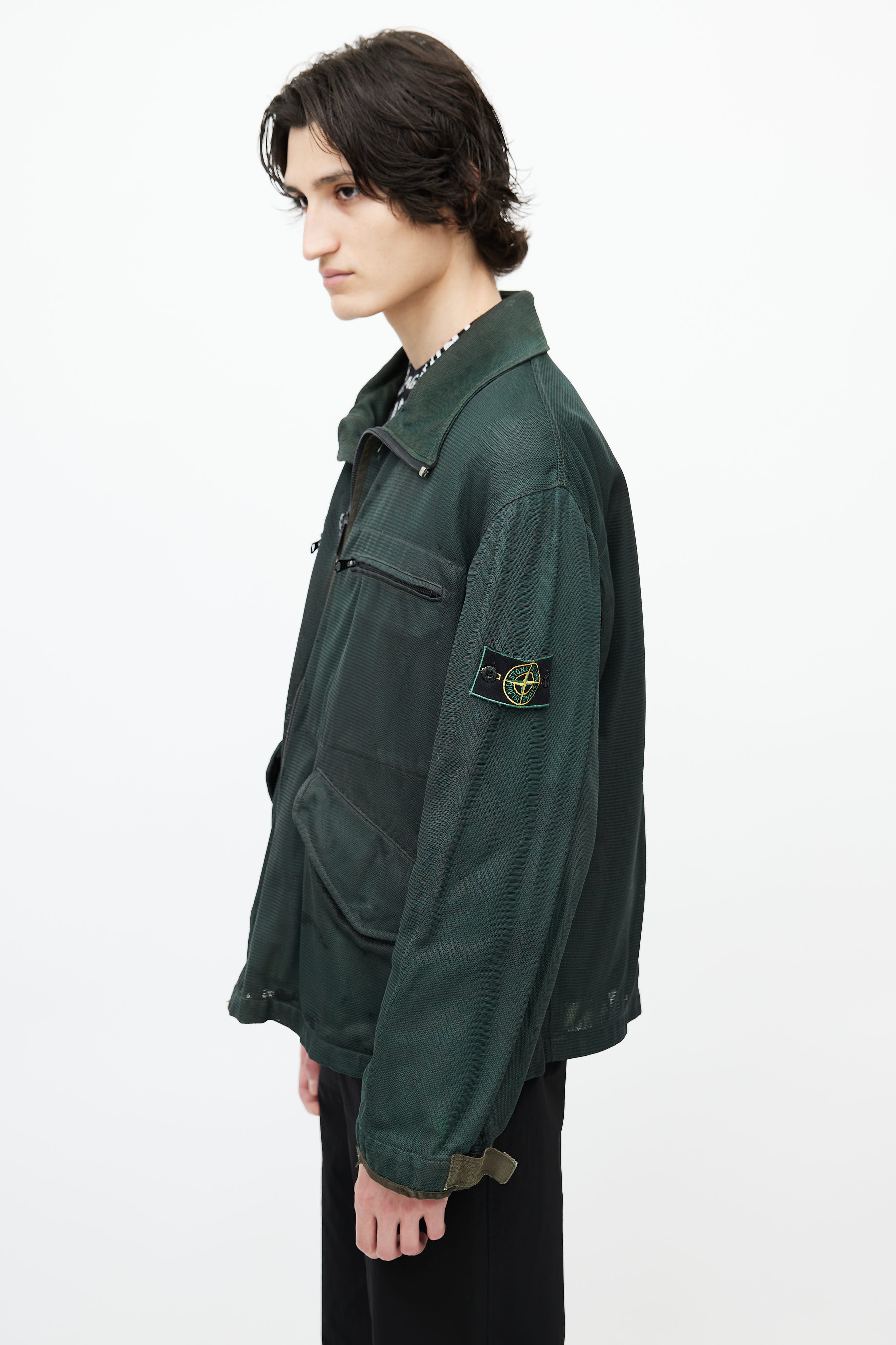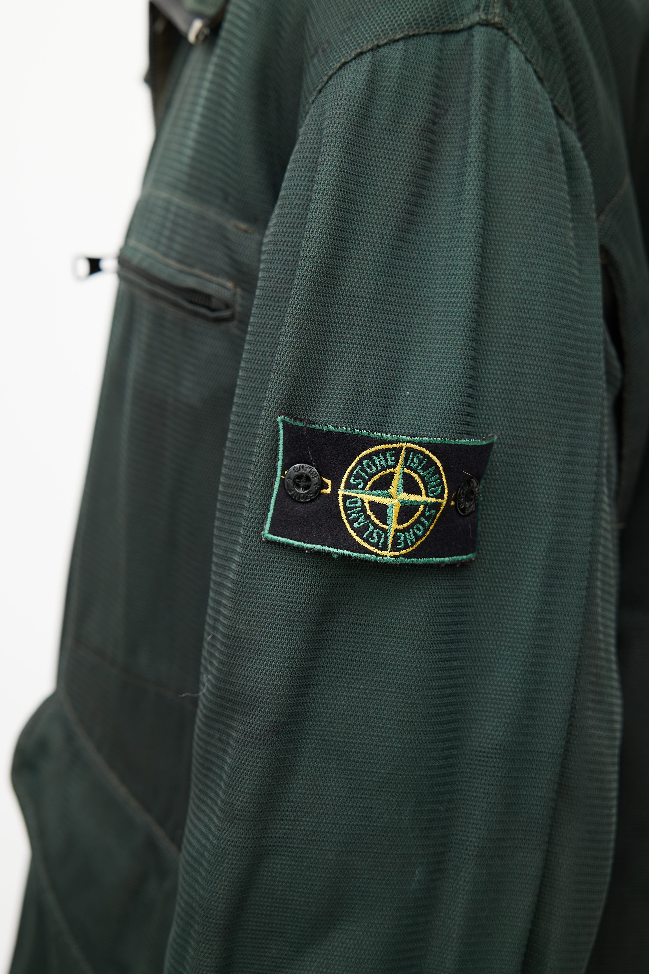 Pre-owned Stone Island green textured utility jacket featuring a foldover collar, full zip front, long sleeves with velcro cuffs, two zip pockets at chest and two buttoned flap pockets at waist and a logo patch at left arm. Lined.