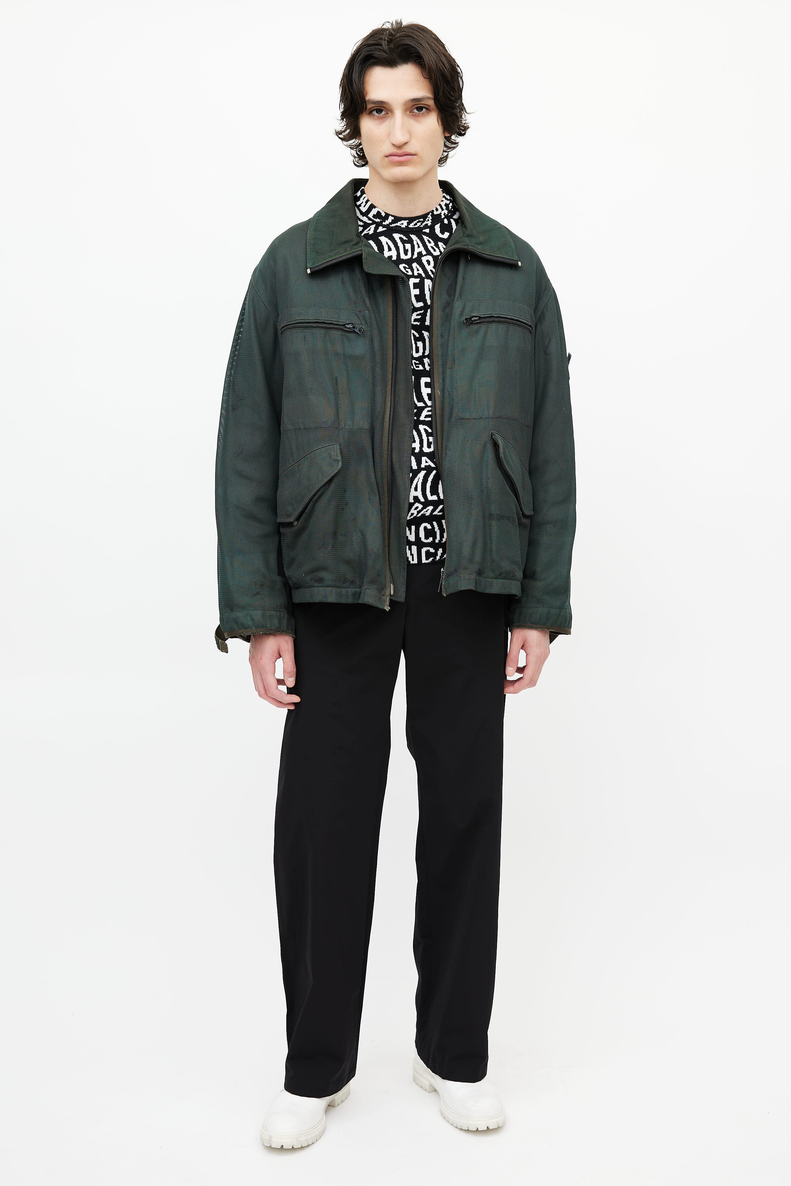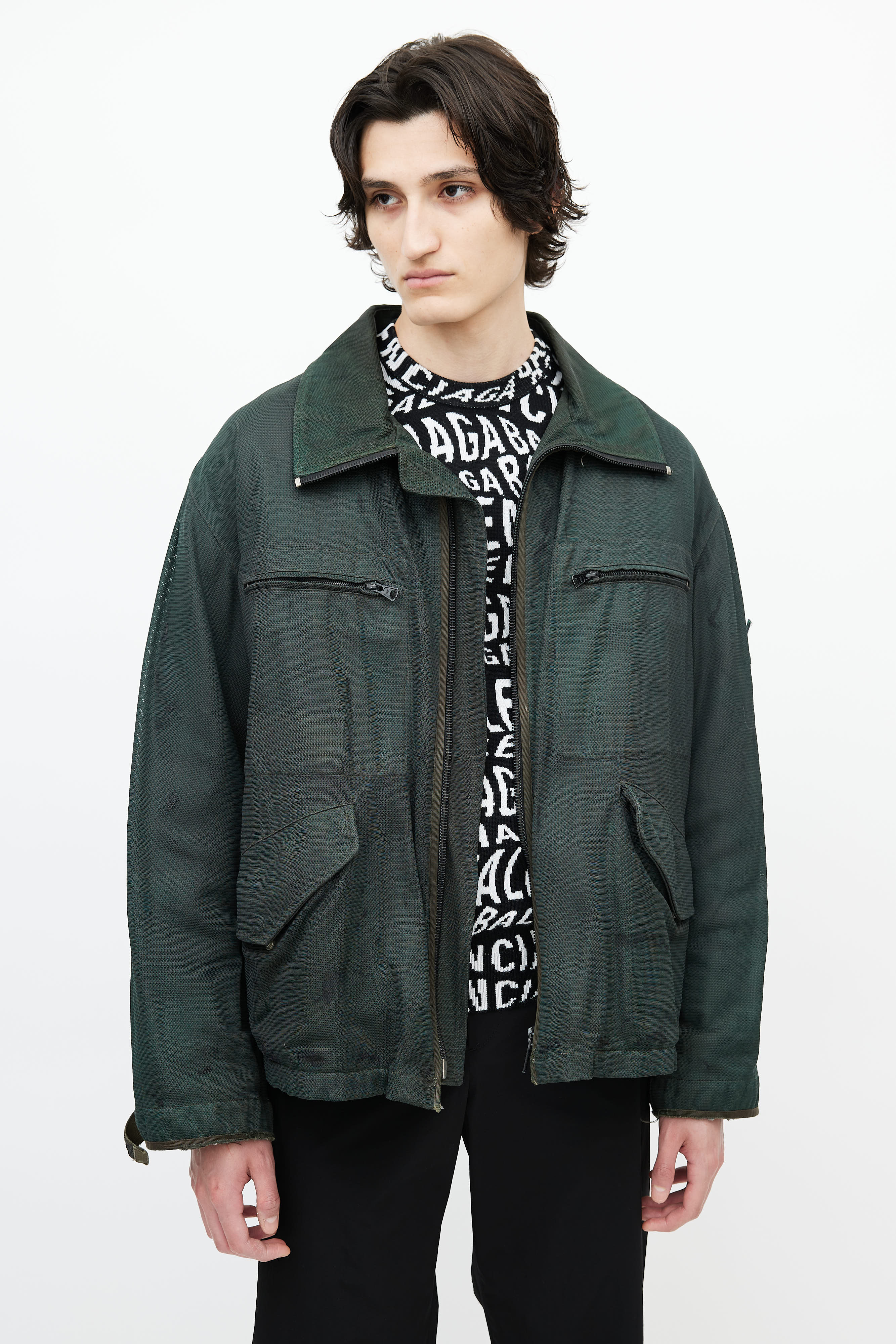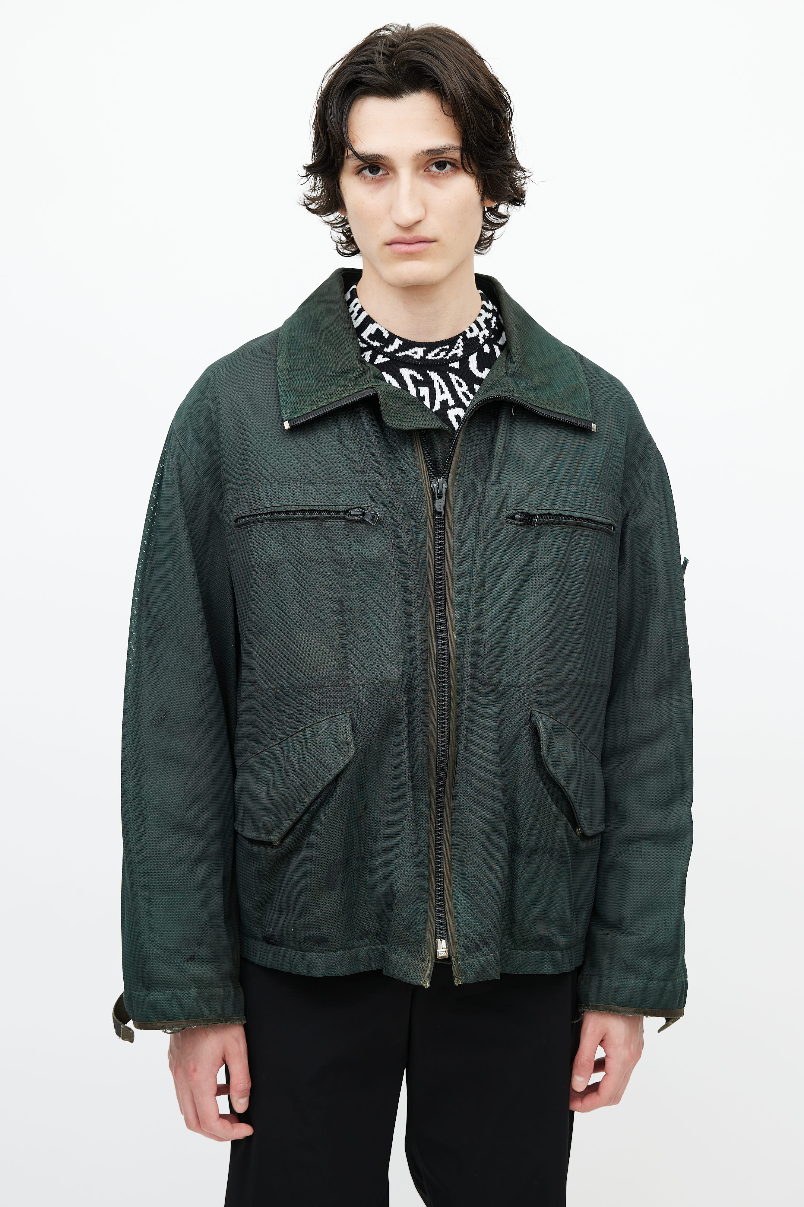 Pre-owned Stone Island green textured utility jacket featuring a foldover collar, full zip front, long sleeves with velcro cuffs, two zip pockets at chest and two buttoned flap pockets at waist and a logo patch at left arm. Lined.