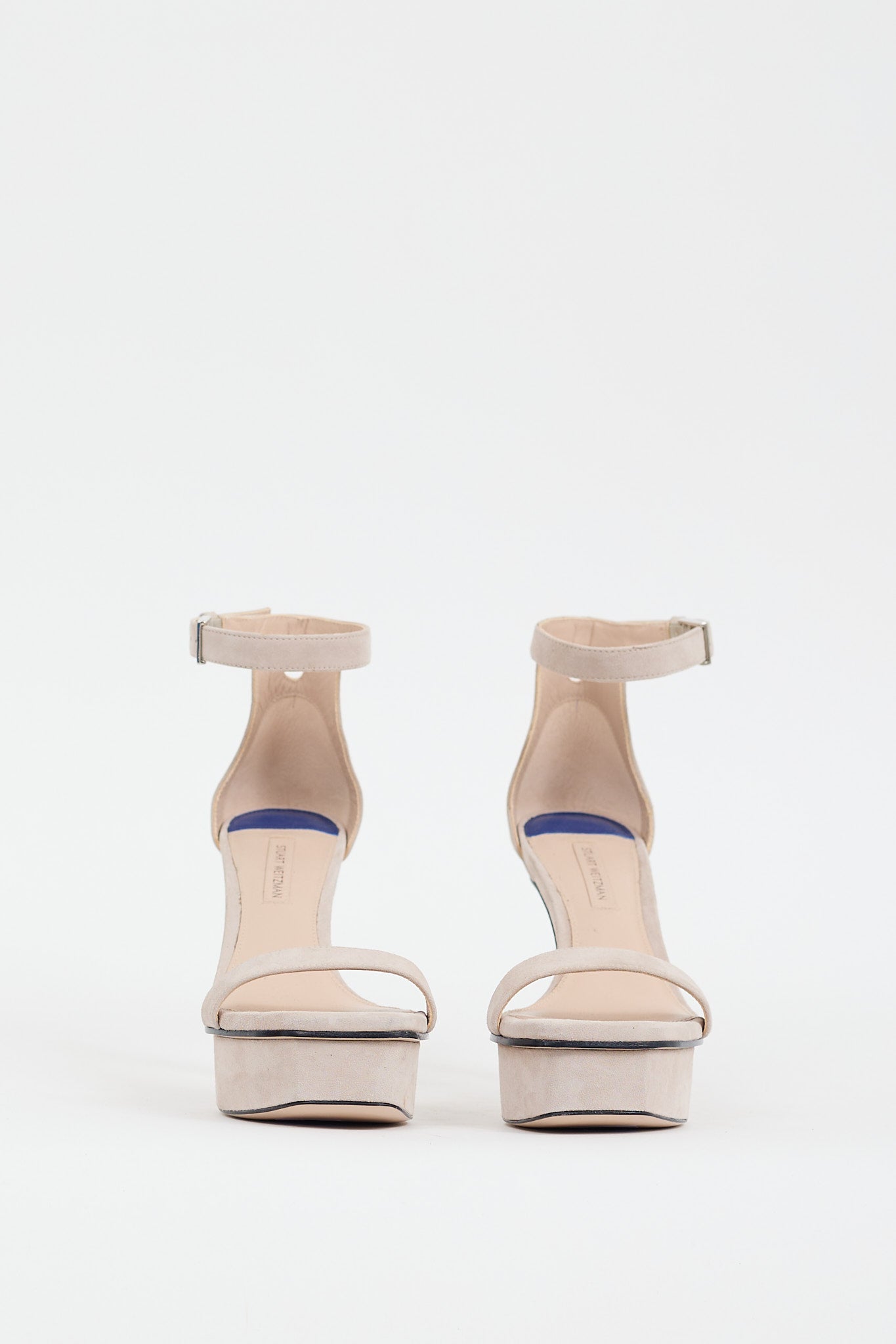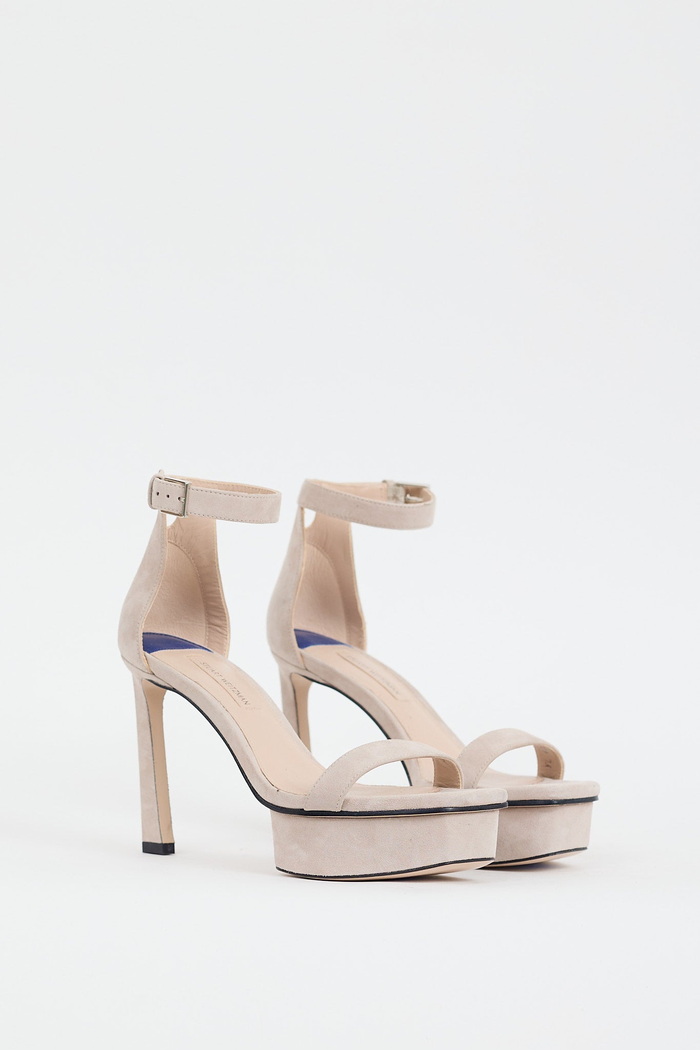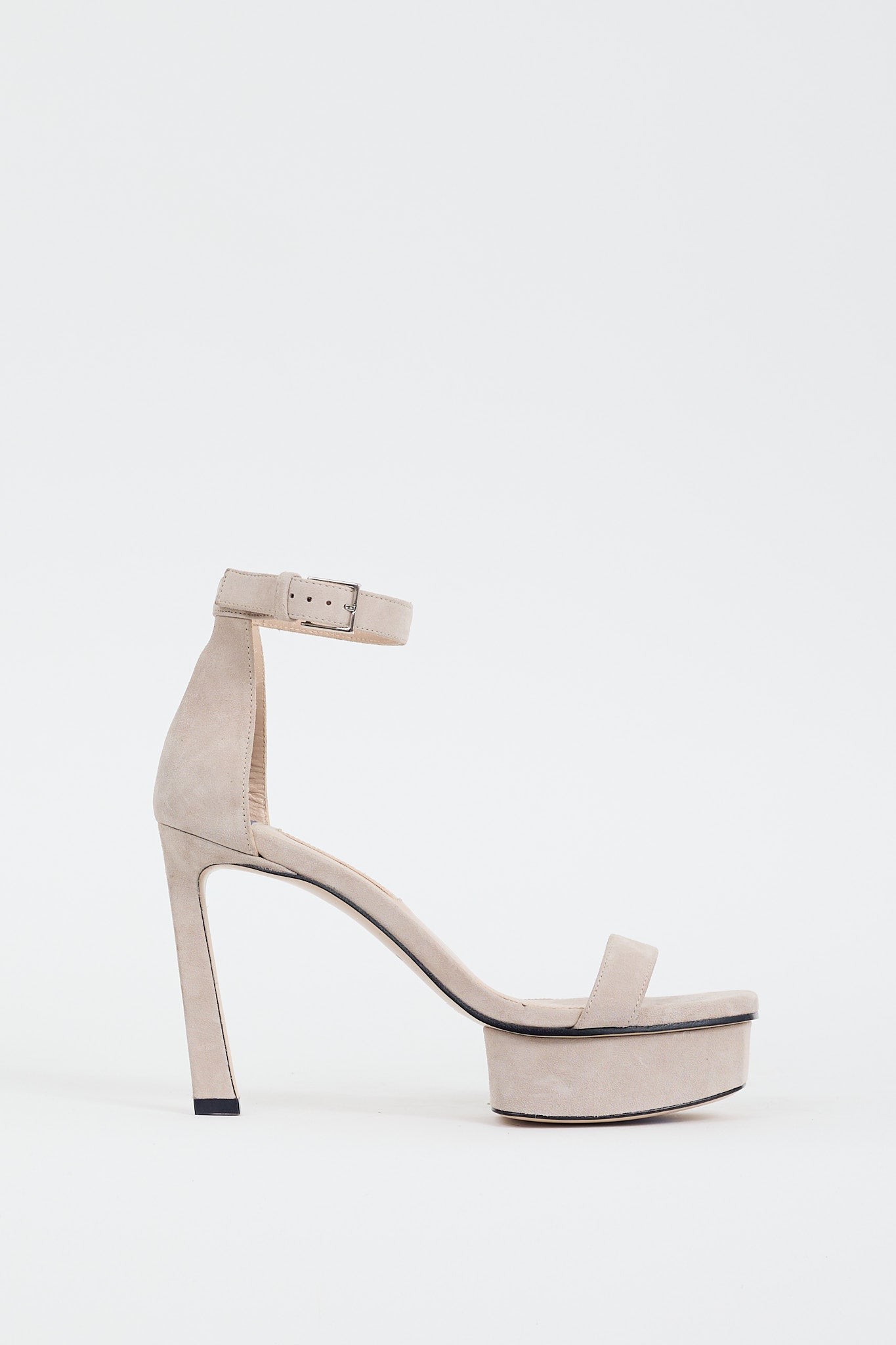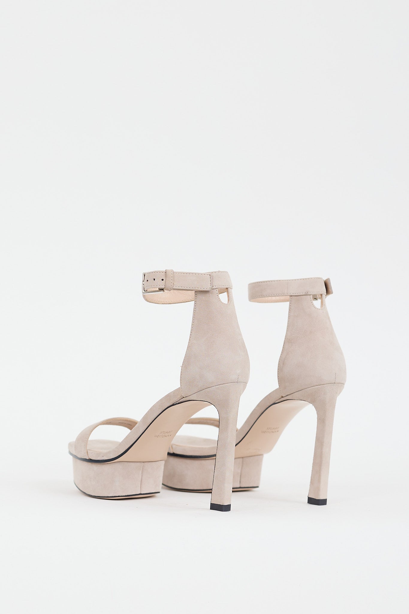 Pre-owned Stuart Weitzman grey suede heels featuring an open square toe, single strap across vamp, adjustable ankle strap, covered platform, and covered angled heel.