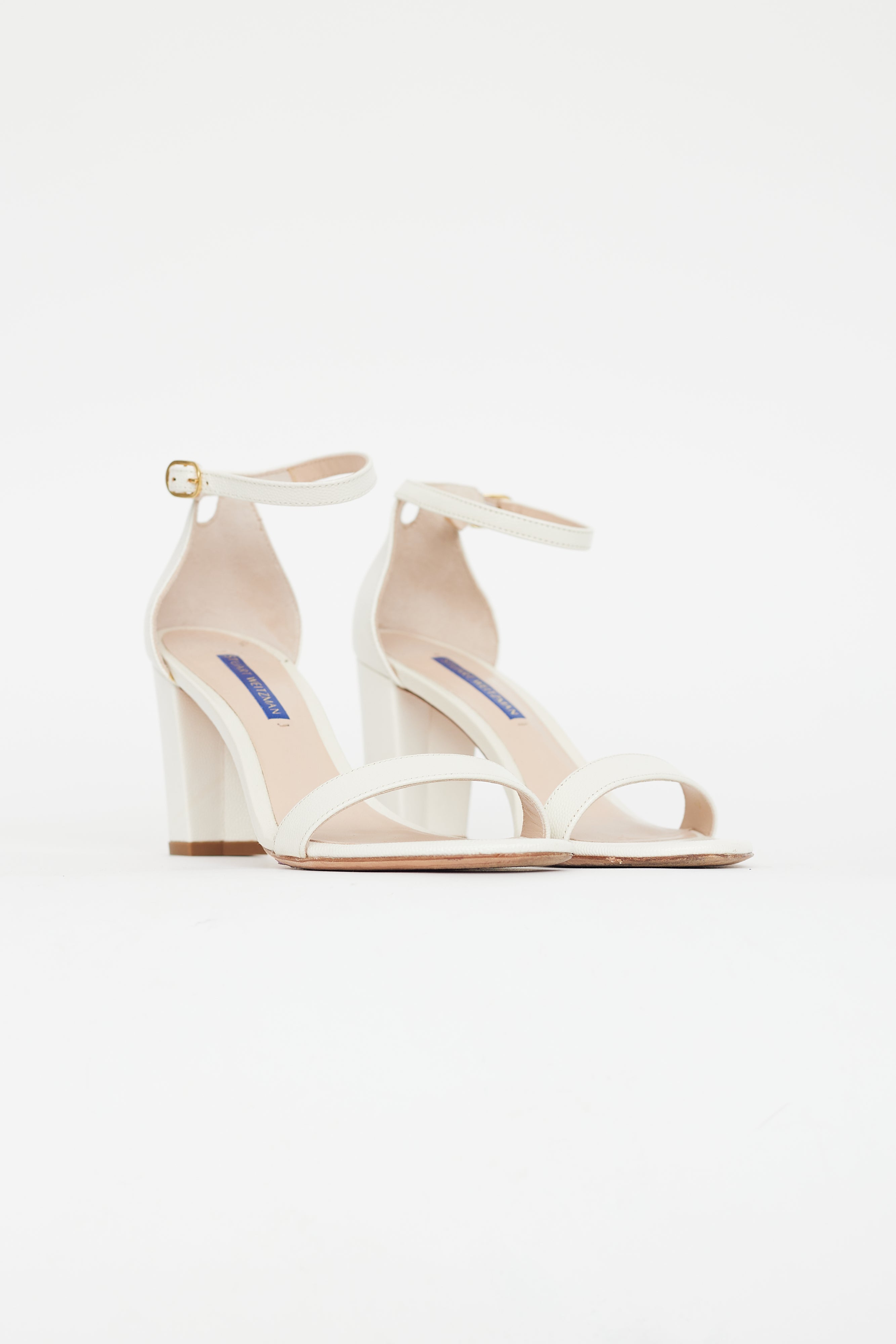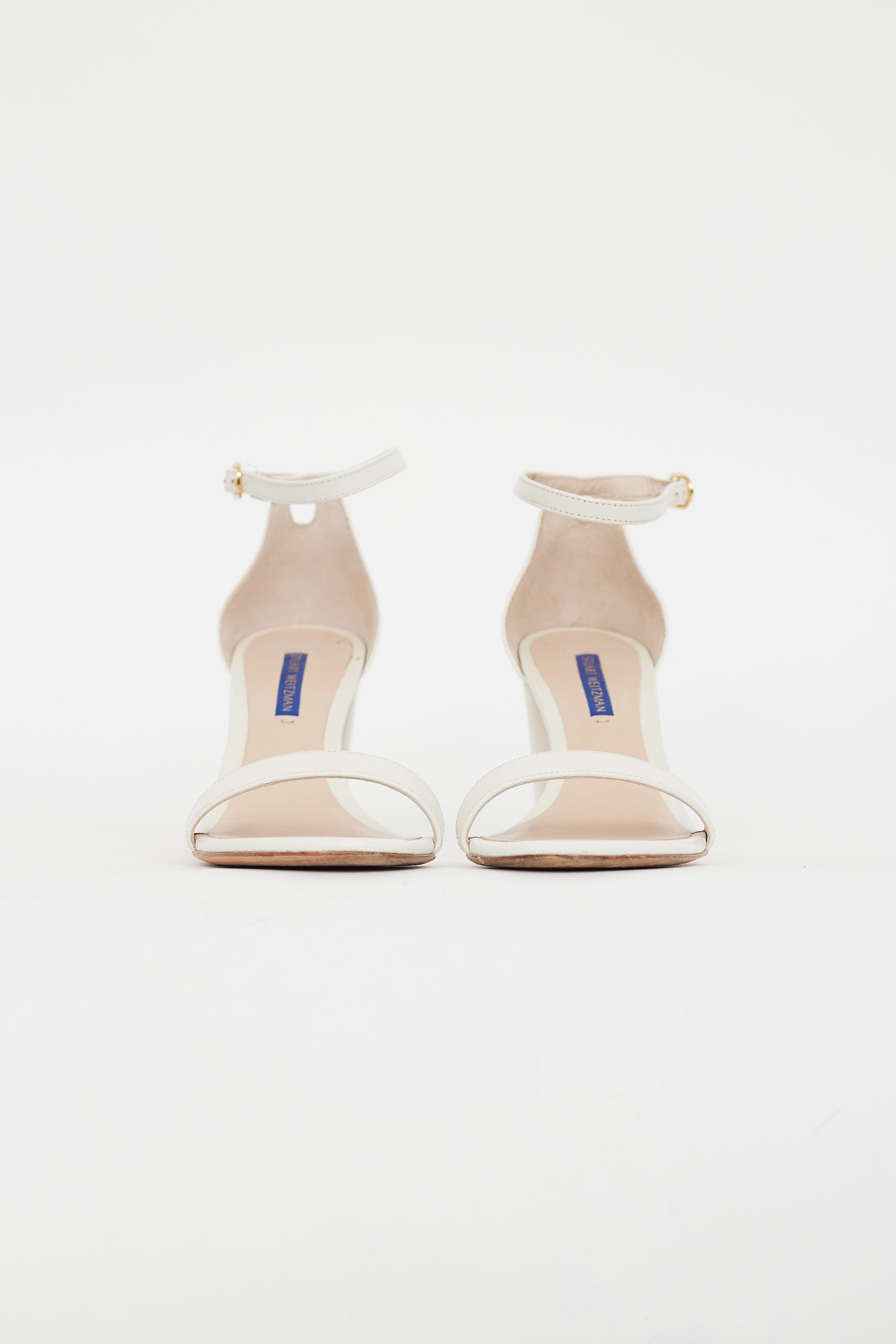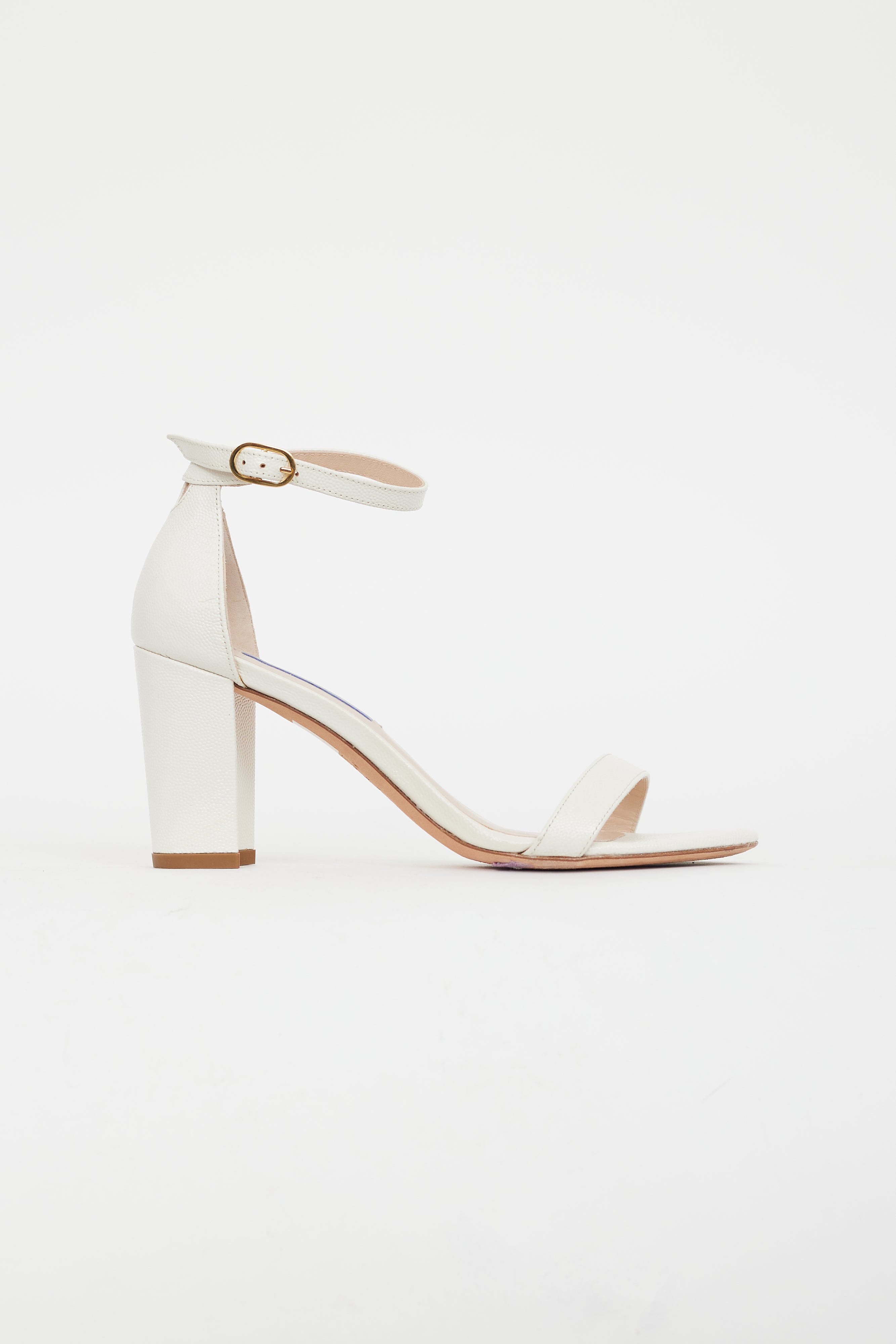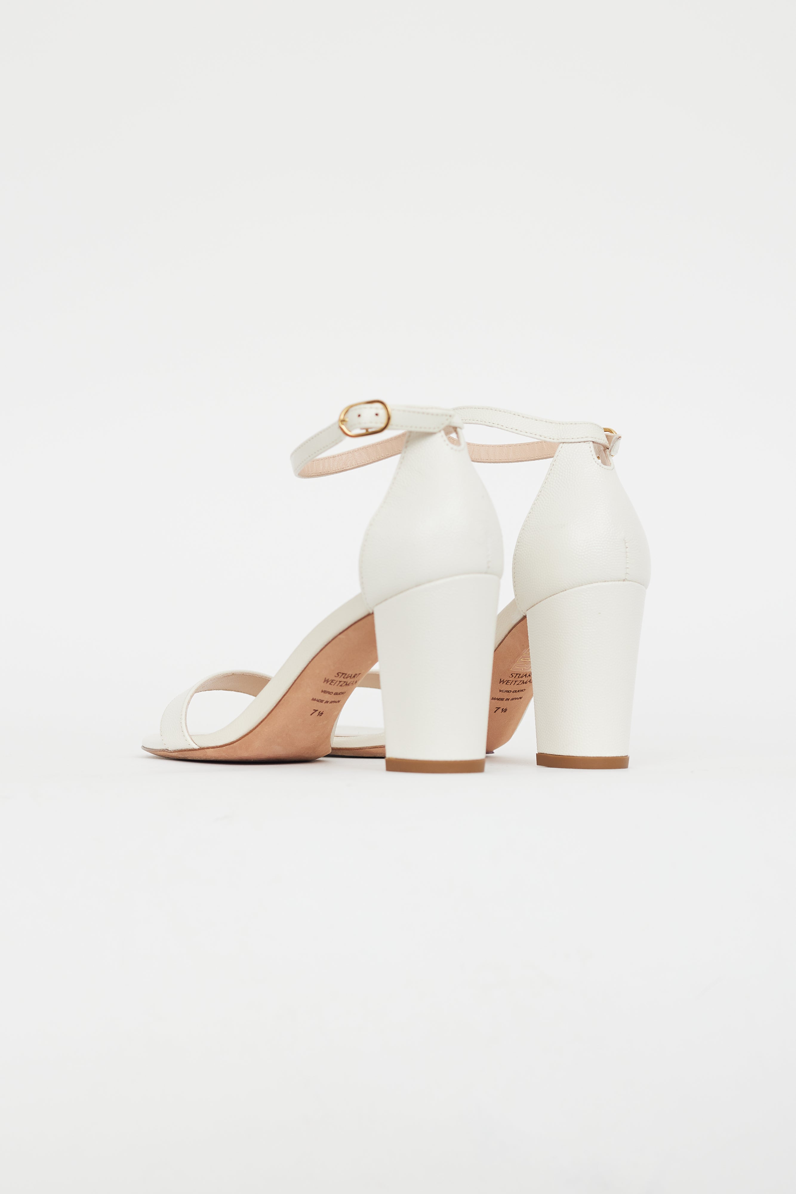 Pre-owned Stuart Weitzman white pebbled leather sandals featuring an open round toe, wrapped block heel, strap at vamp, and adjustable buckle closure at ankle.