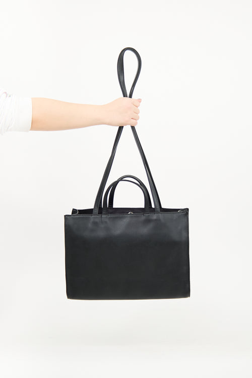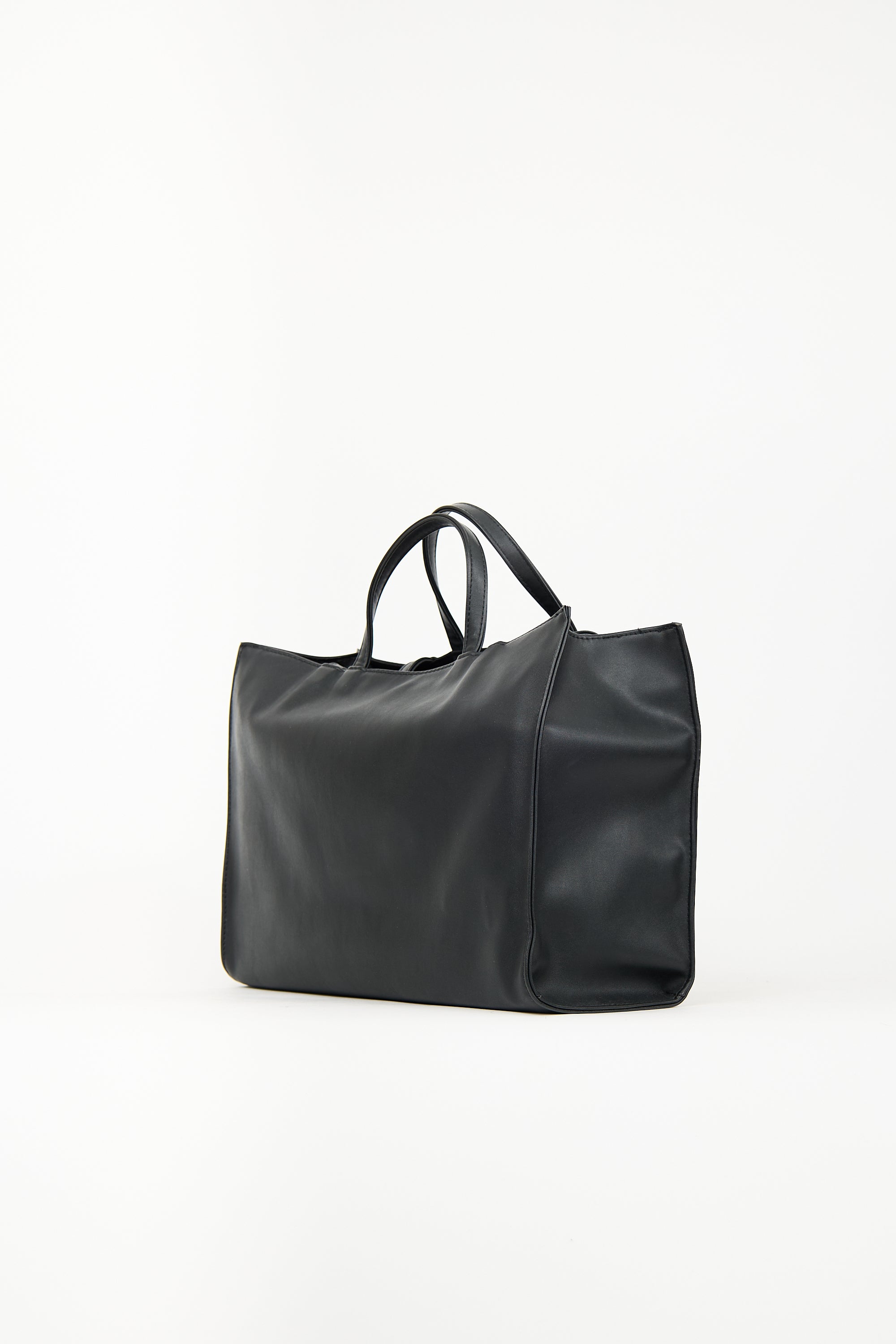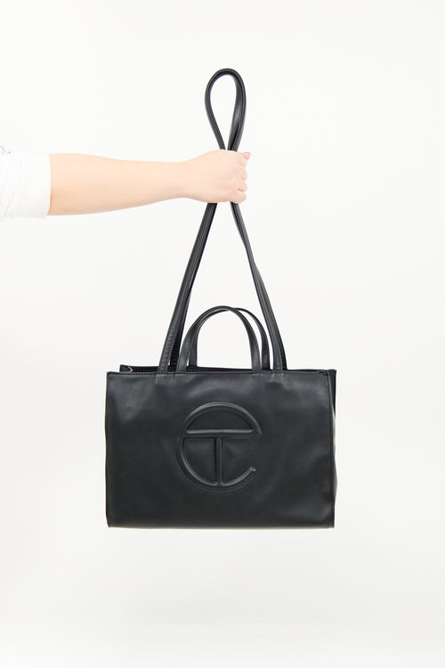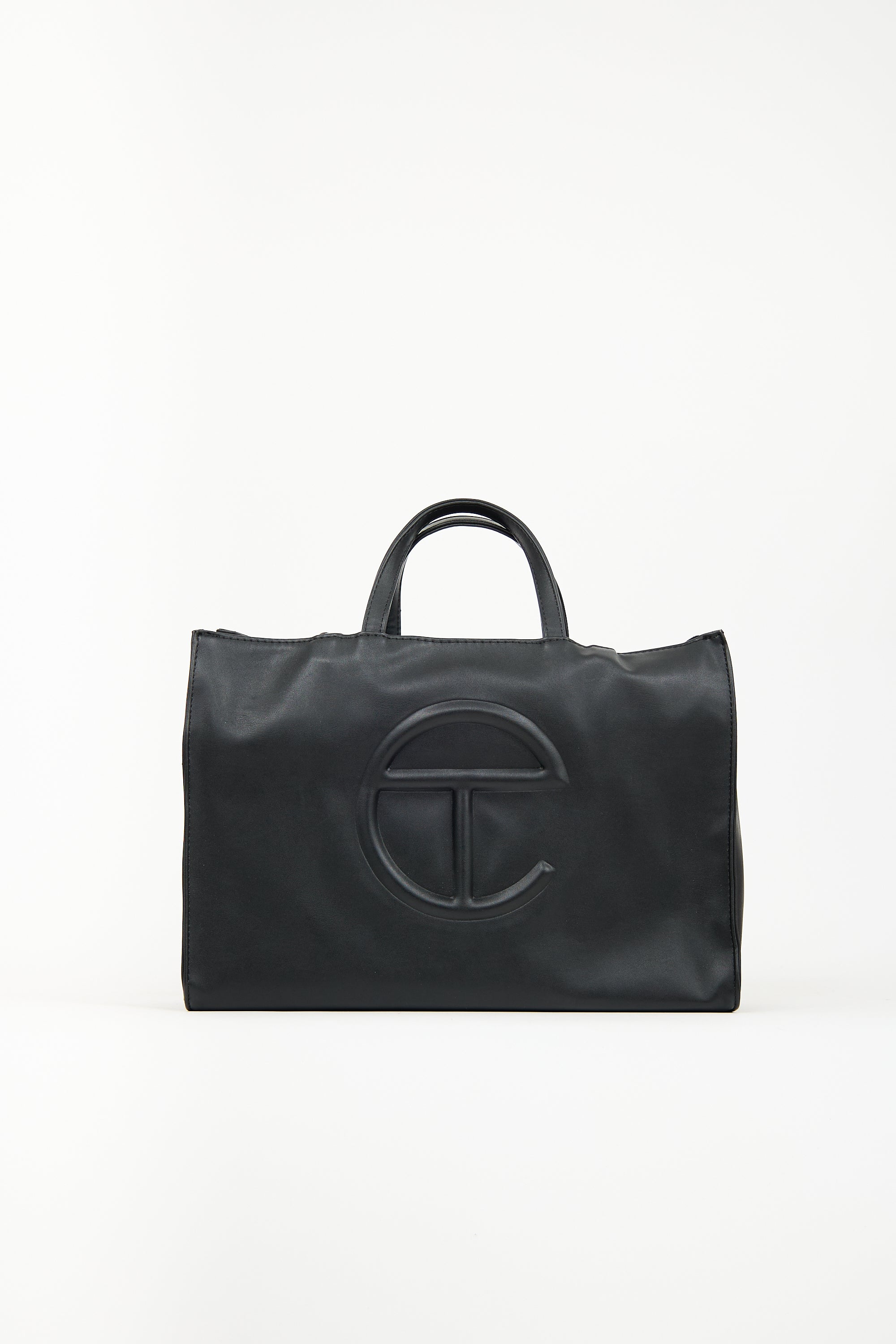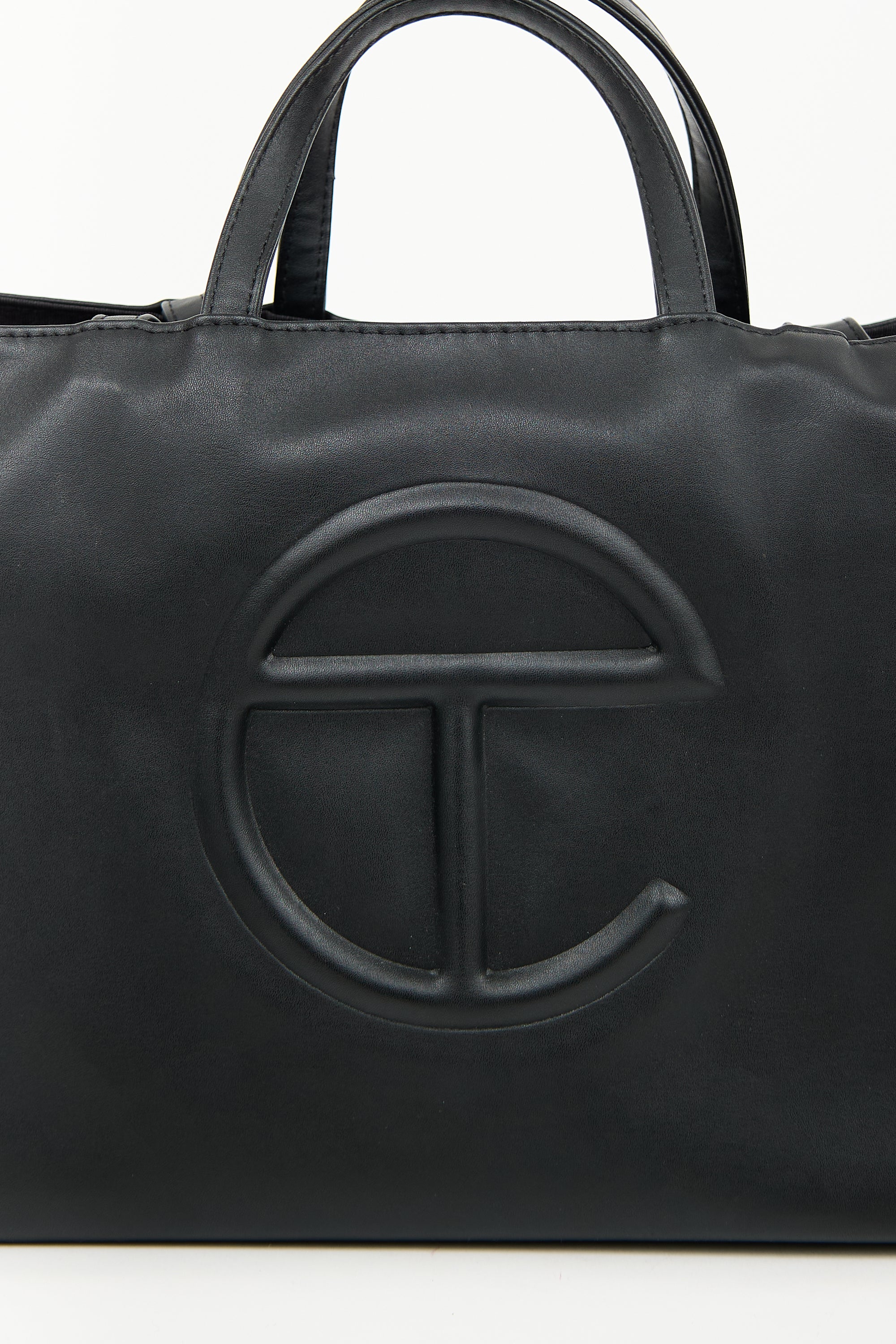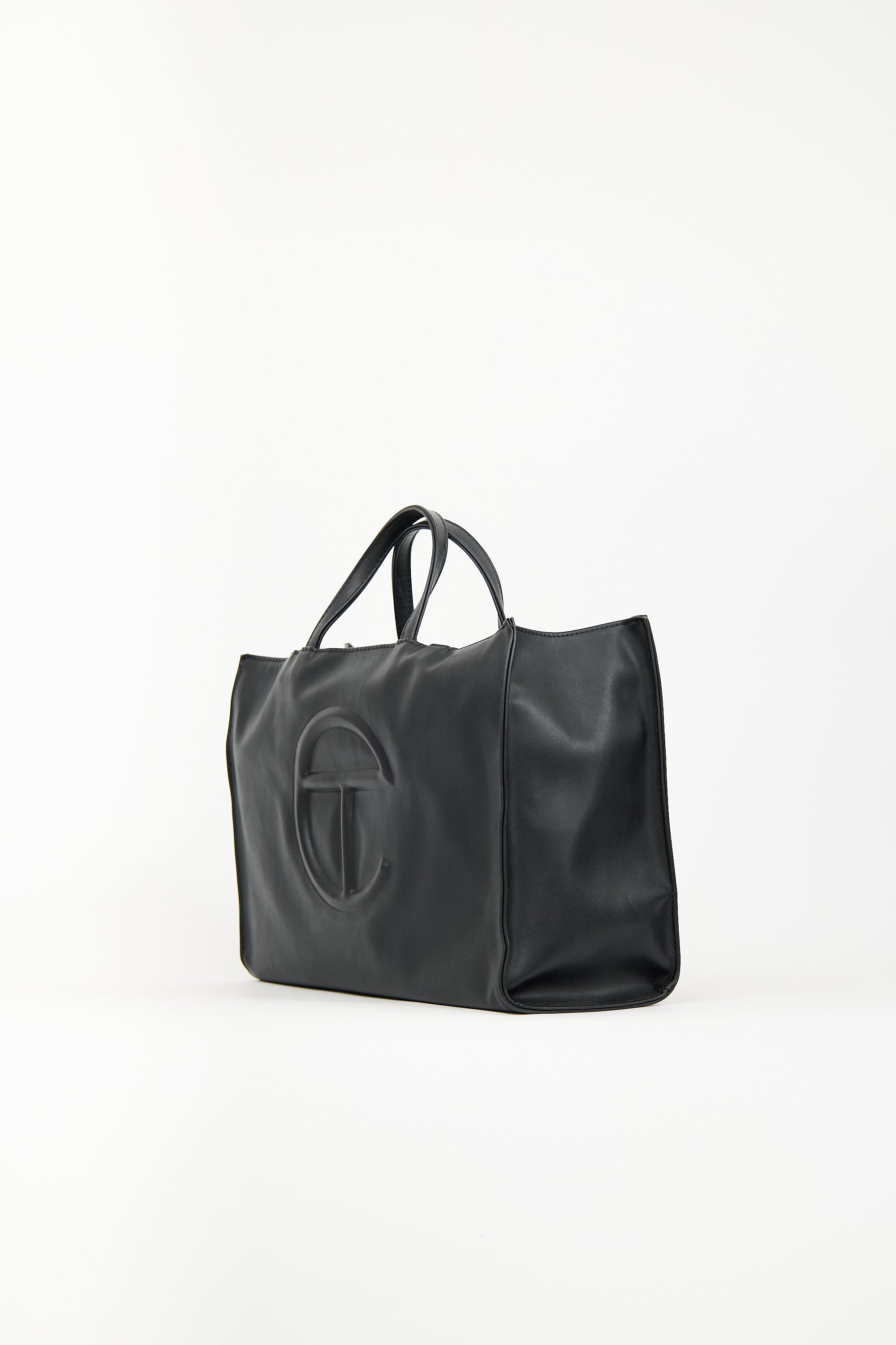 Pre-owned Telfar black Medium Shopping bag featuring two top handles, two fixed cross body straps, embossed logo at front, one main compartment with magnetic snap closure, internal zip pocket with stitched logo, and twill lining.