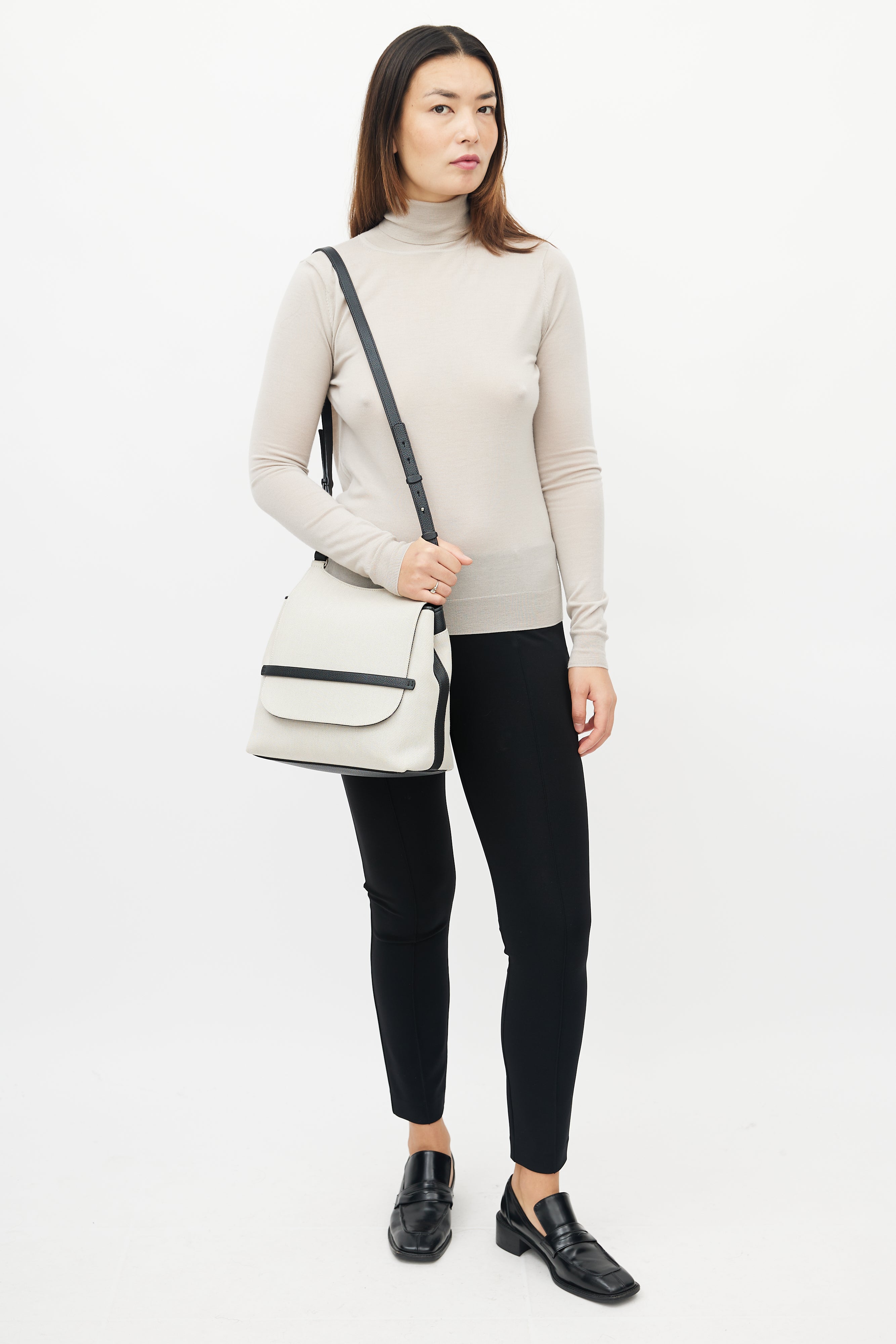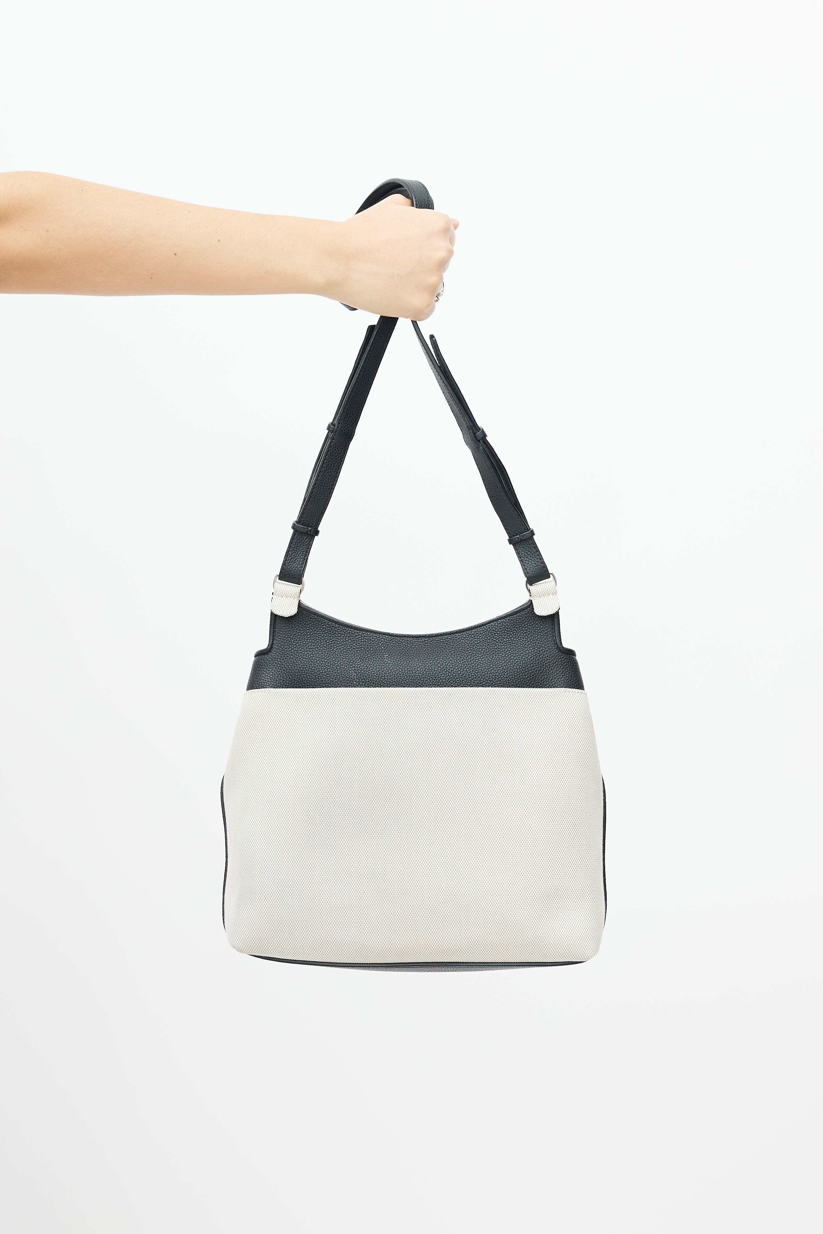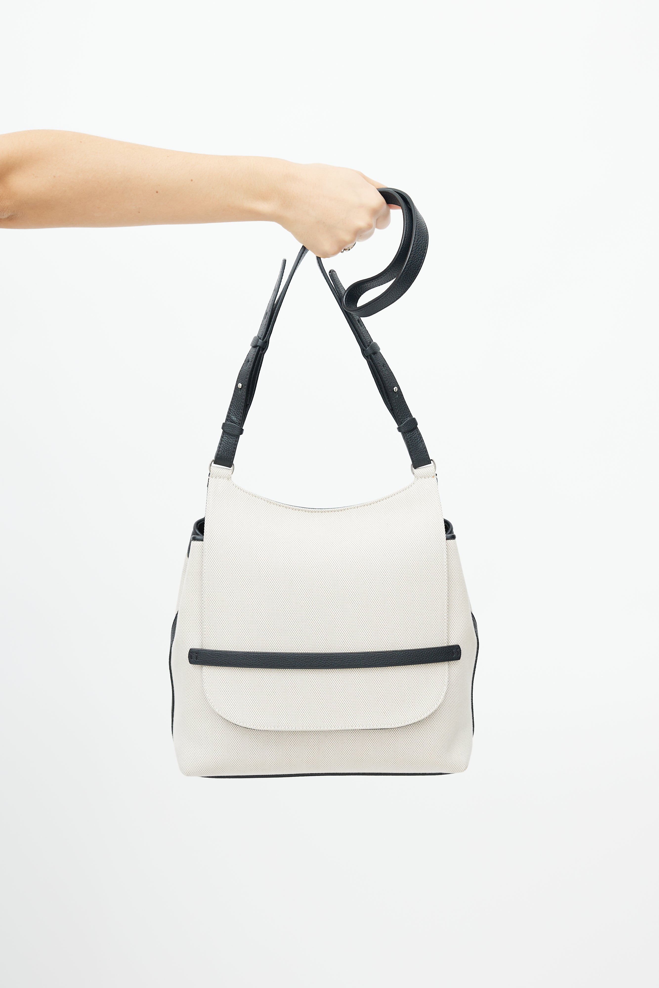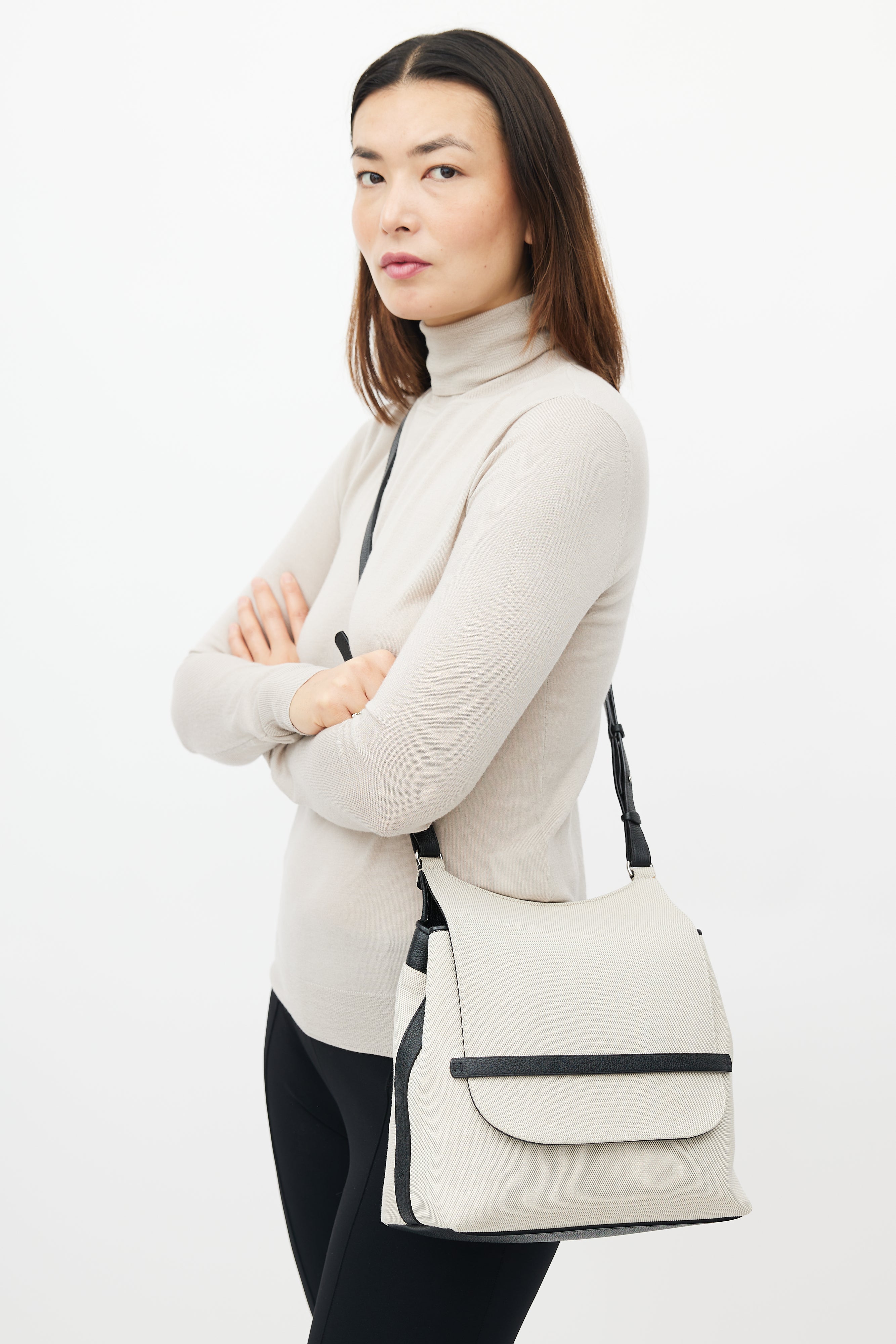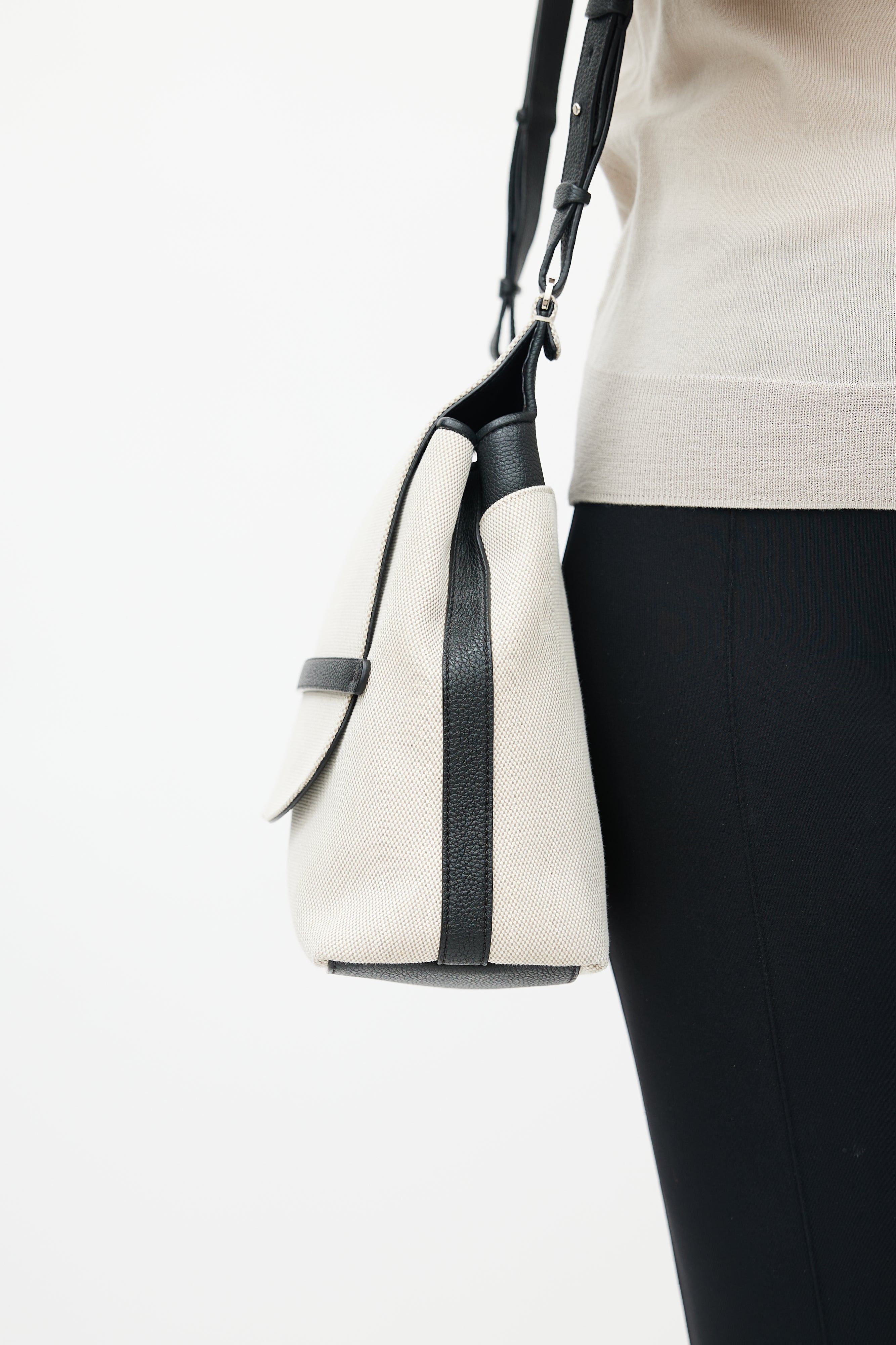 Pre-owned The Row Sideby crossbody bag featuring beige canvas outer, black leather trim and interior, side zip pocket, small slip pocket and small box pocket at interior, silver tone hardware, adjustable shoulder strap and logo embossed at interior.