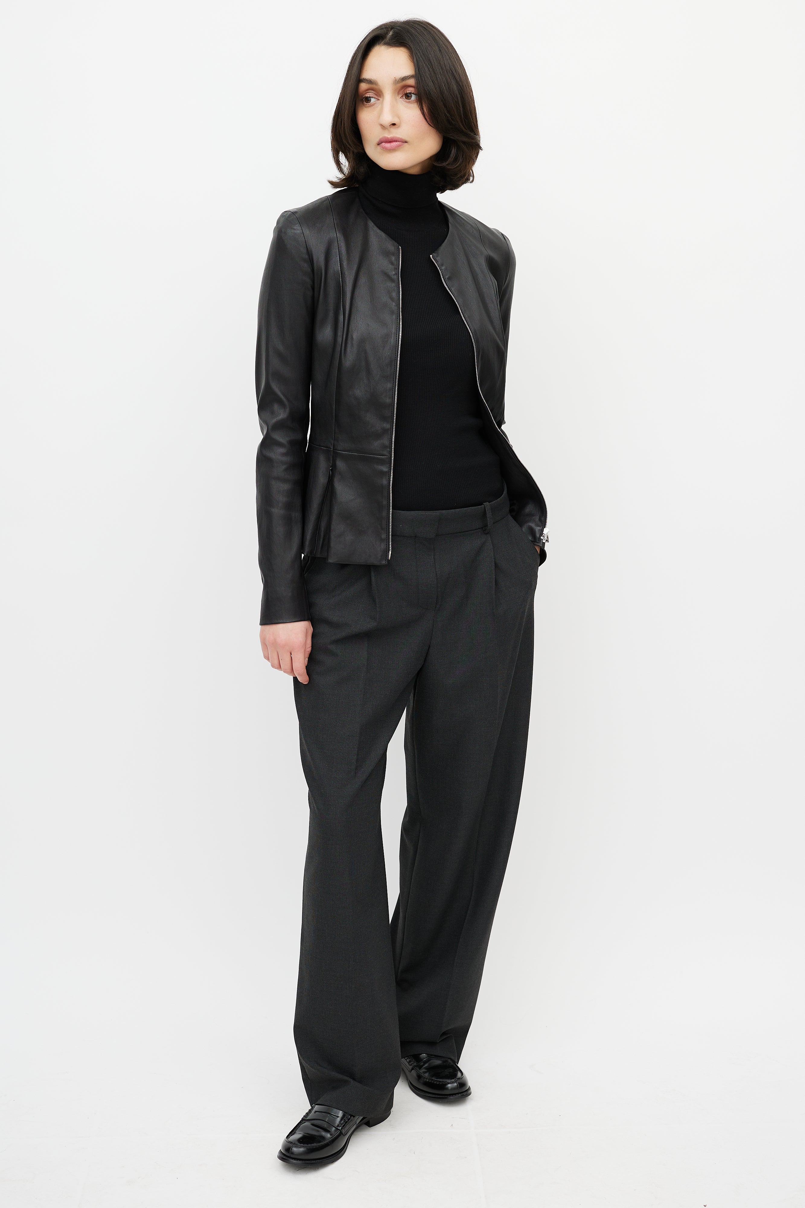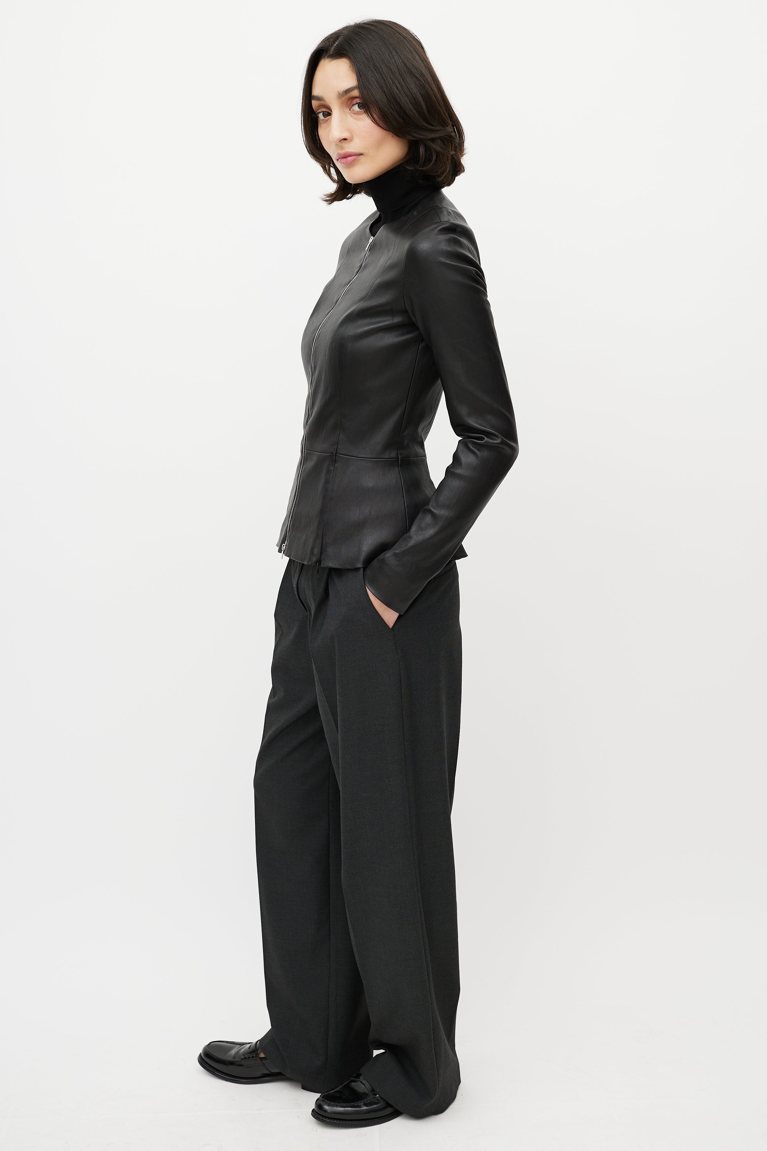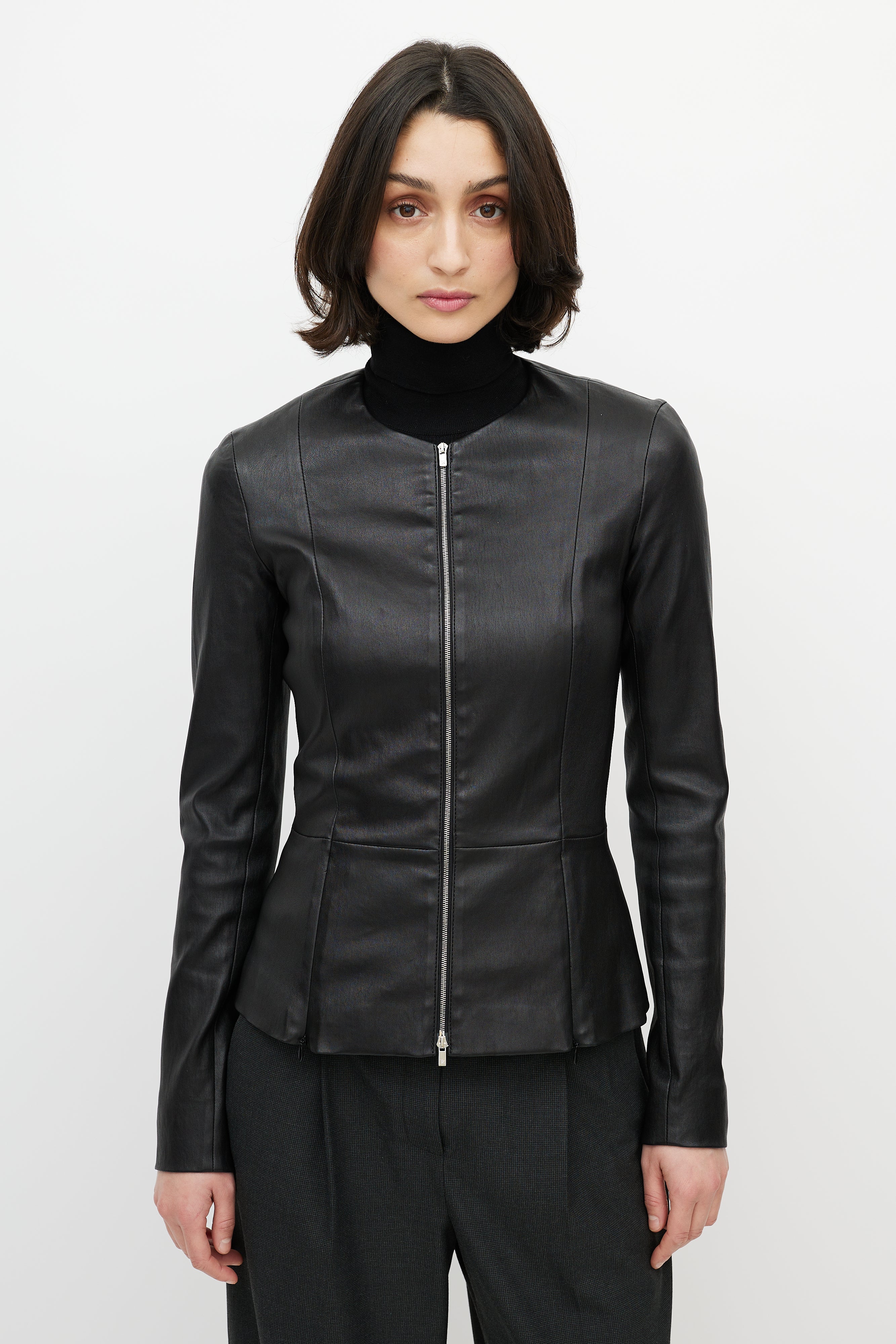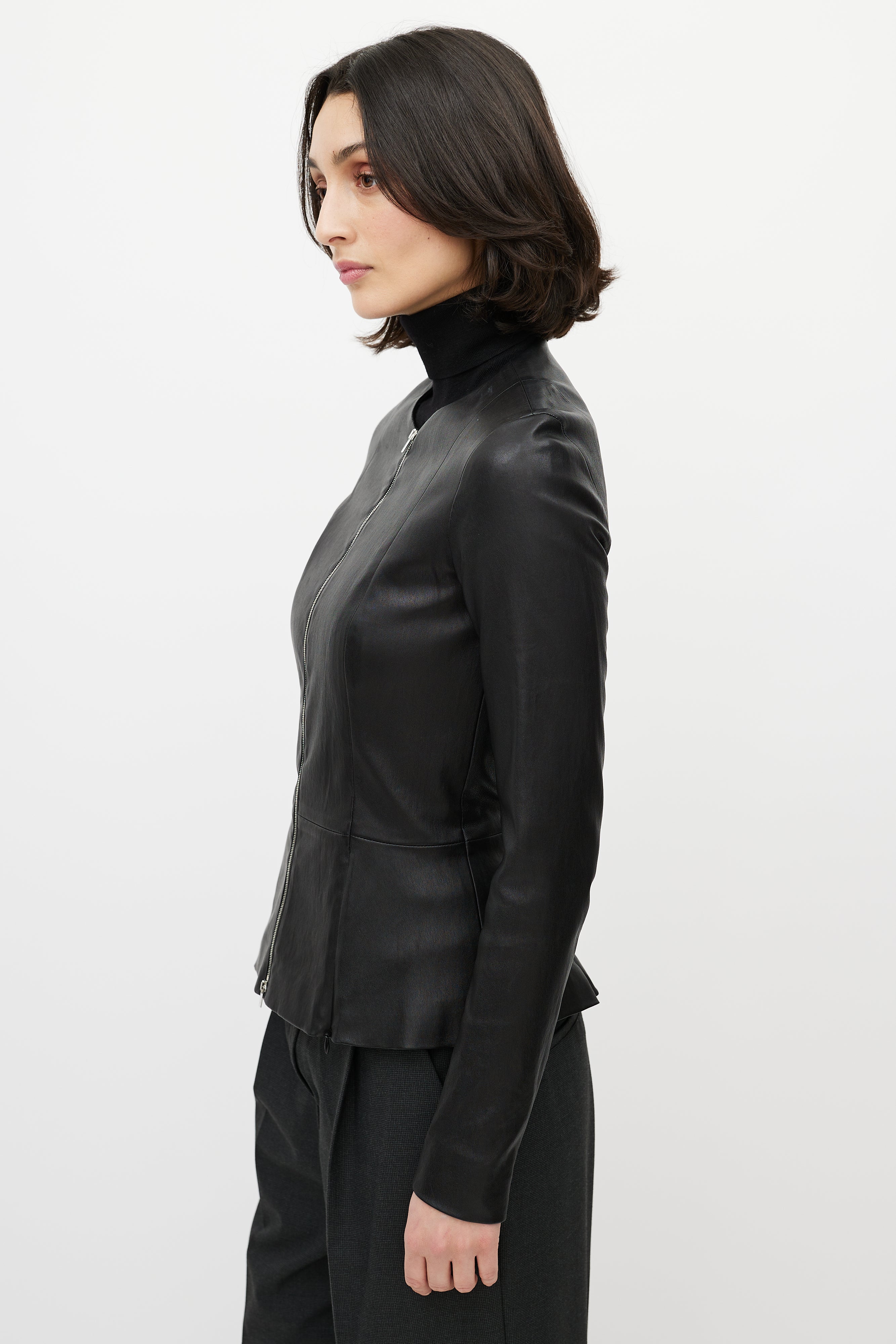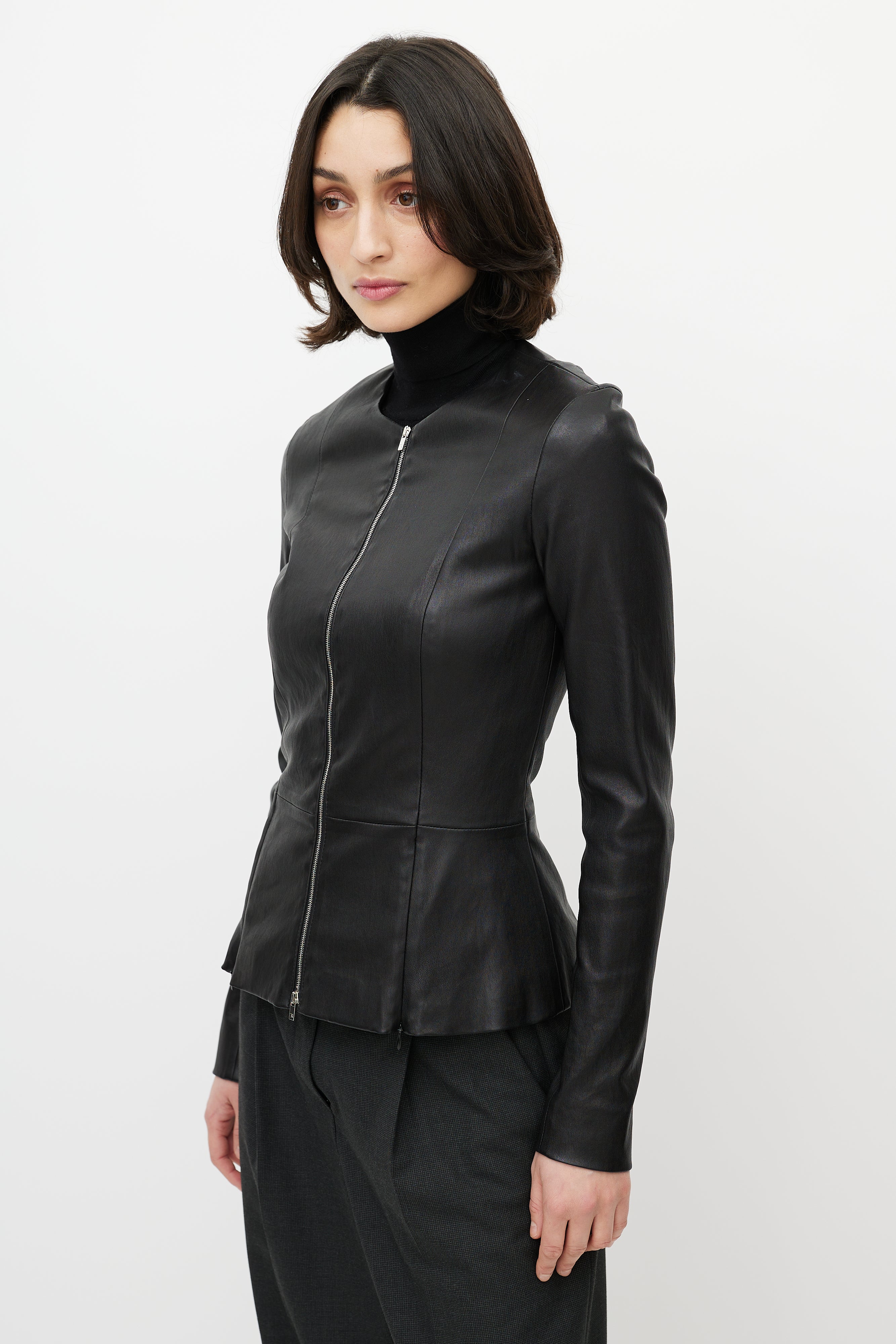 Pre-owned The Row black leather Anasta jacket featuring round neck, exposed silver tone zip at front and cuffs, peplum waist with concealed zips at front and back. Lined.