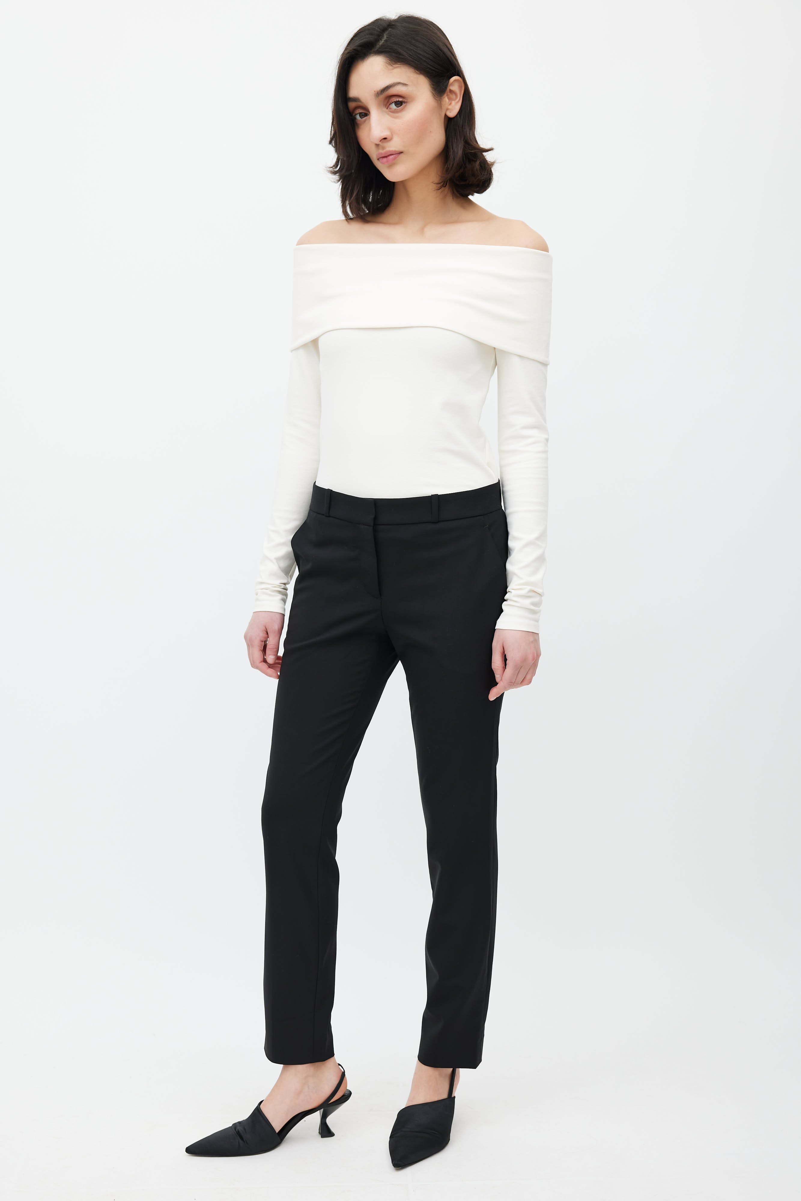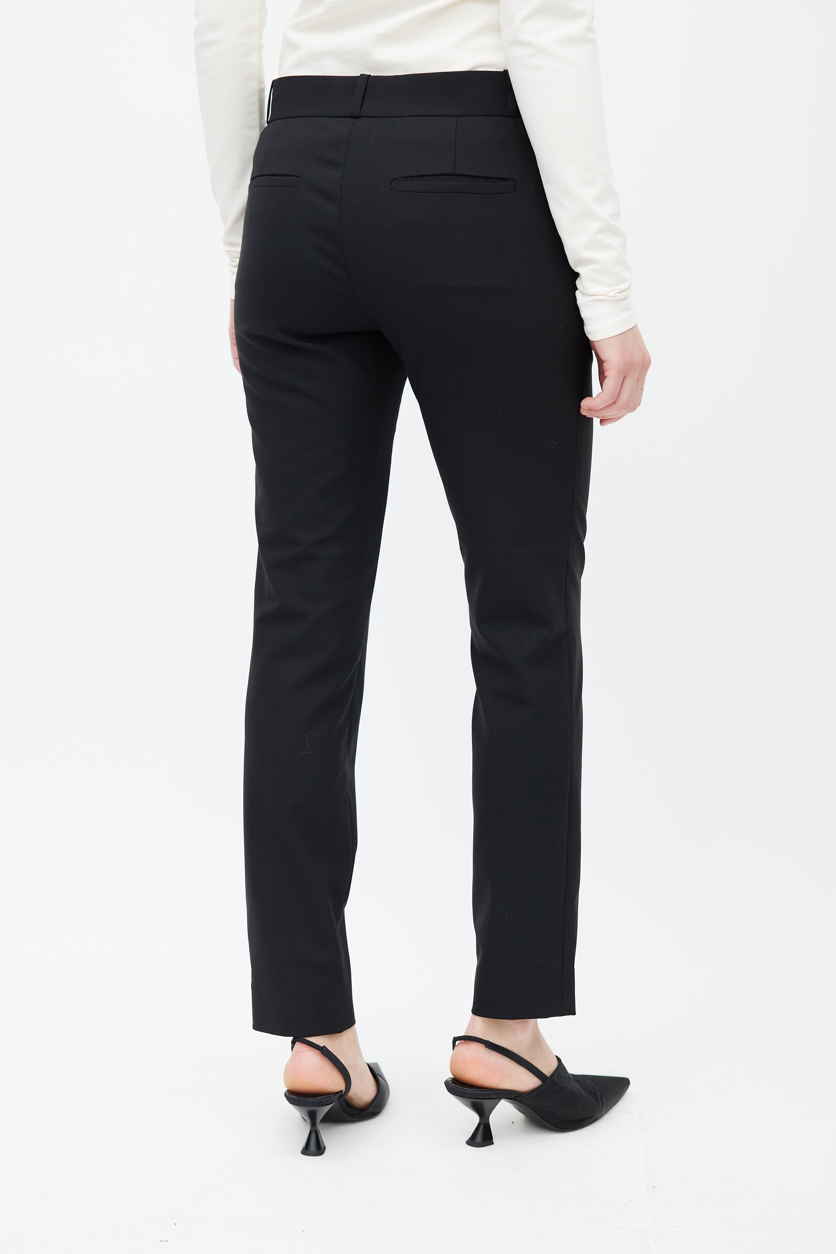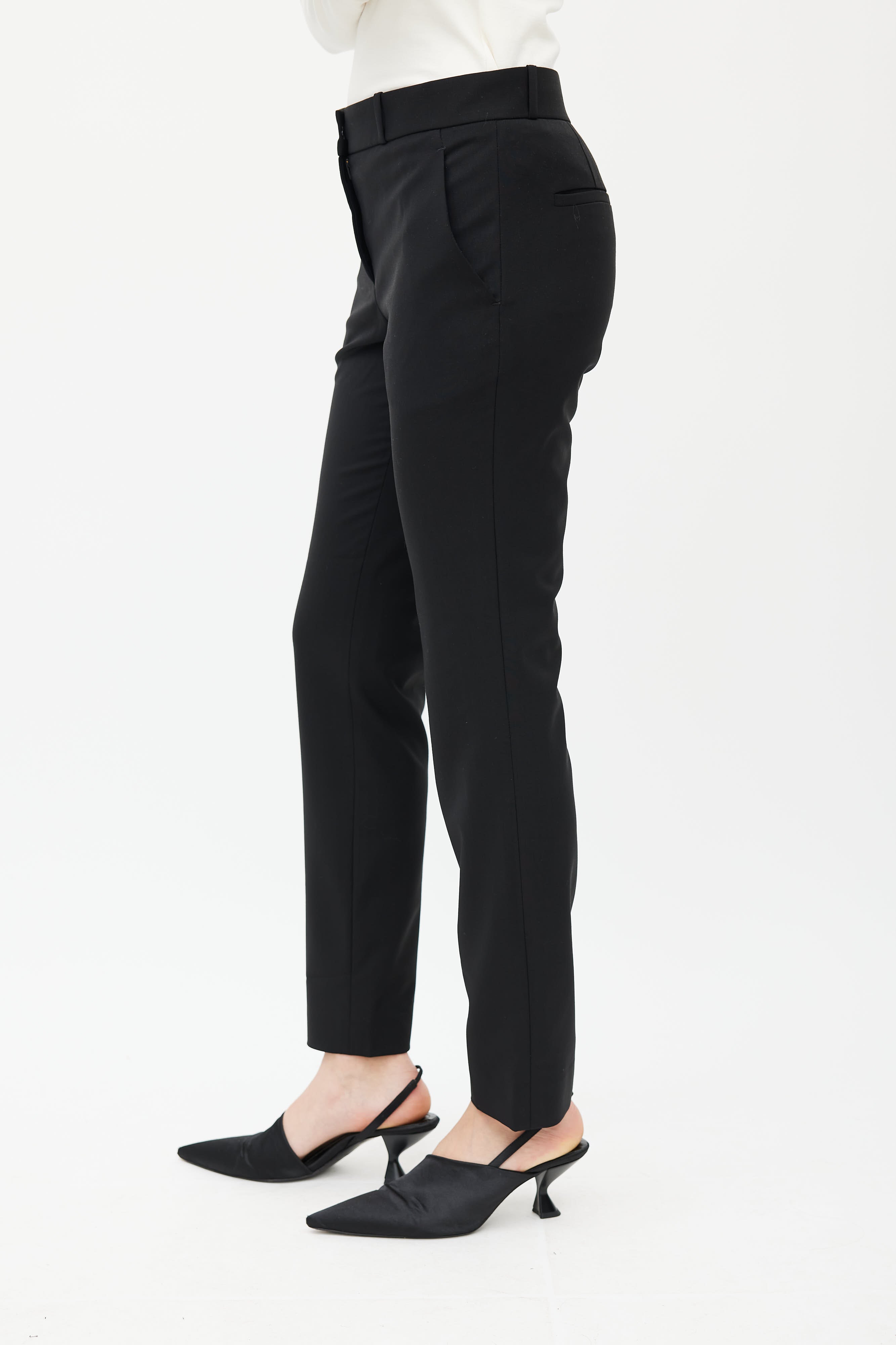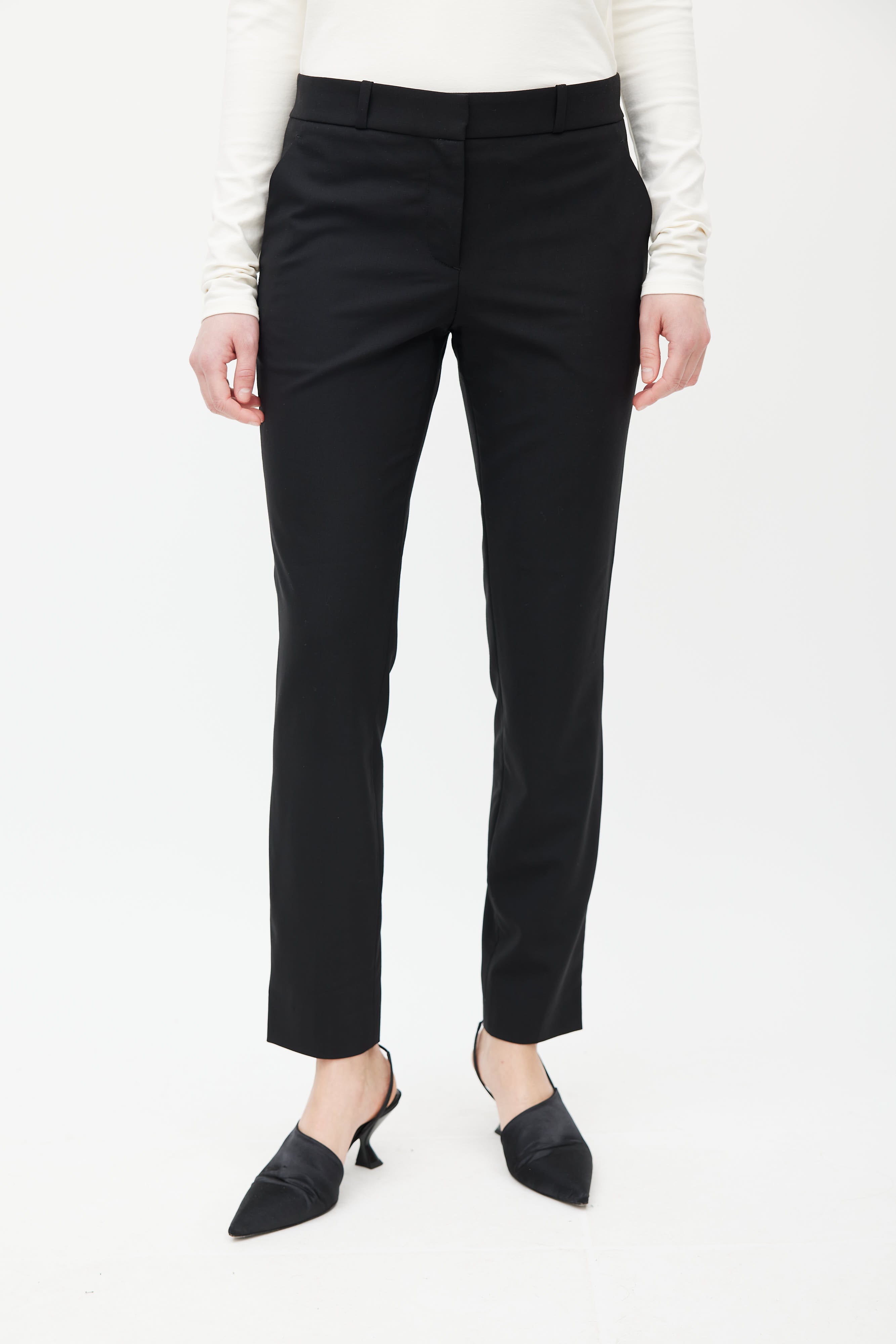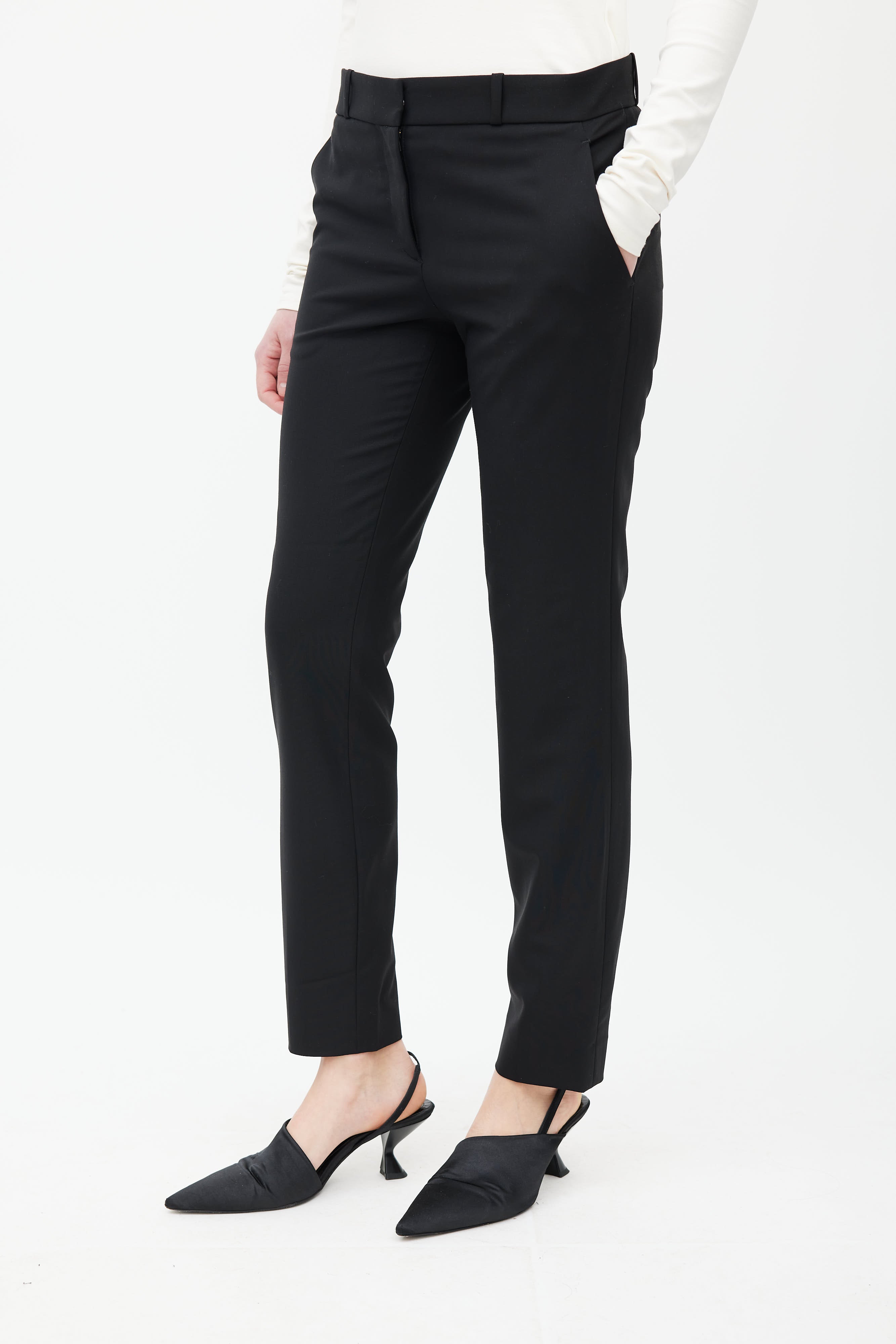 Pre-owned The Row black wool trousers featuring two slip pockets at hip, two welt pockets at back, slim leg, and zip fly with hook and eye closure.