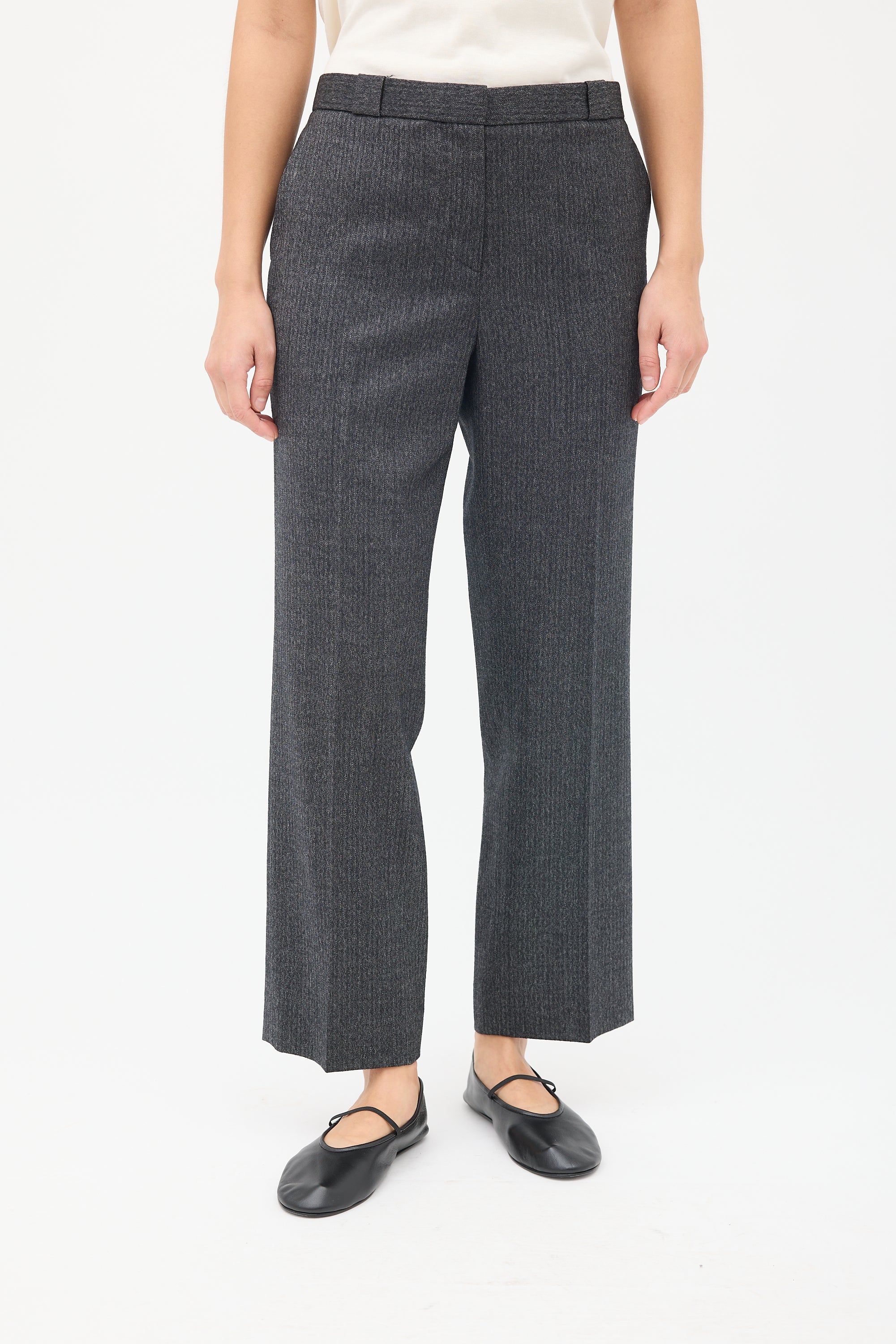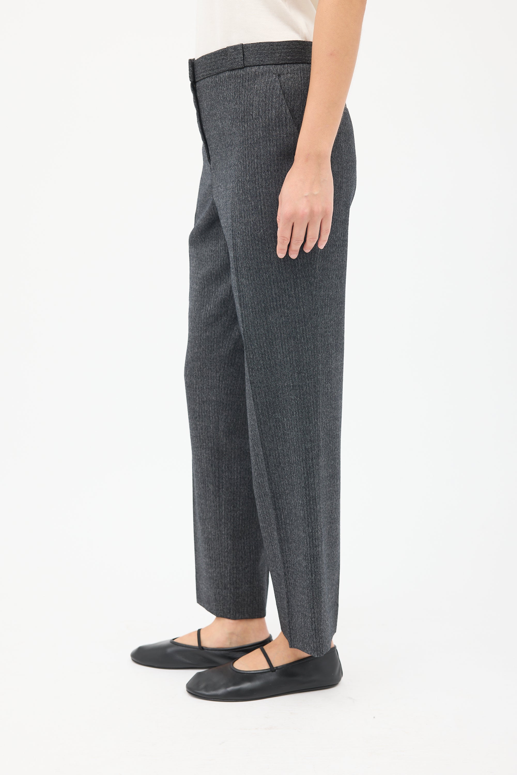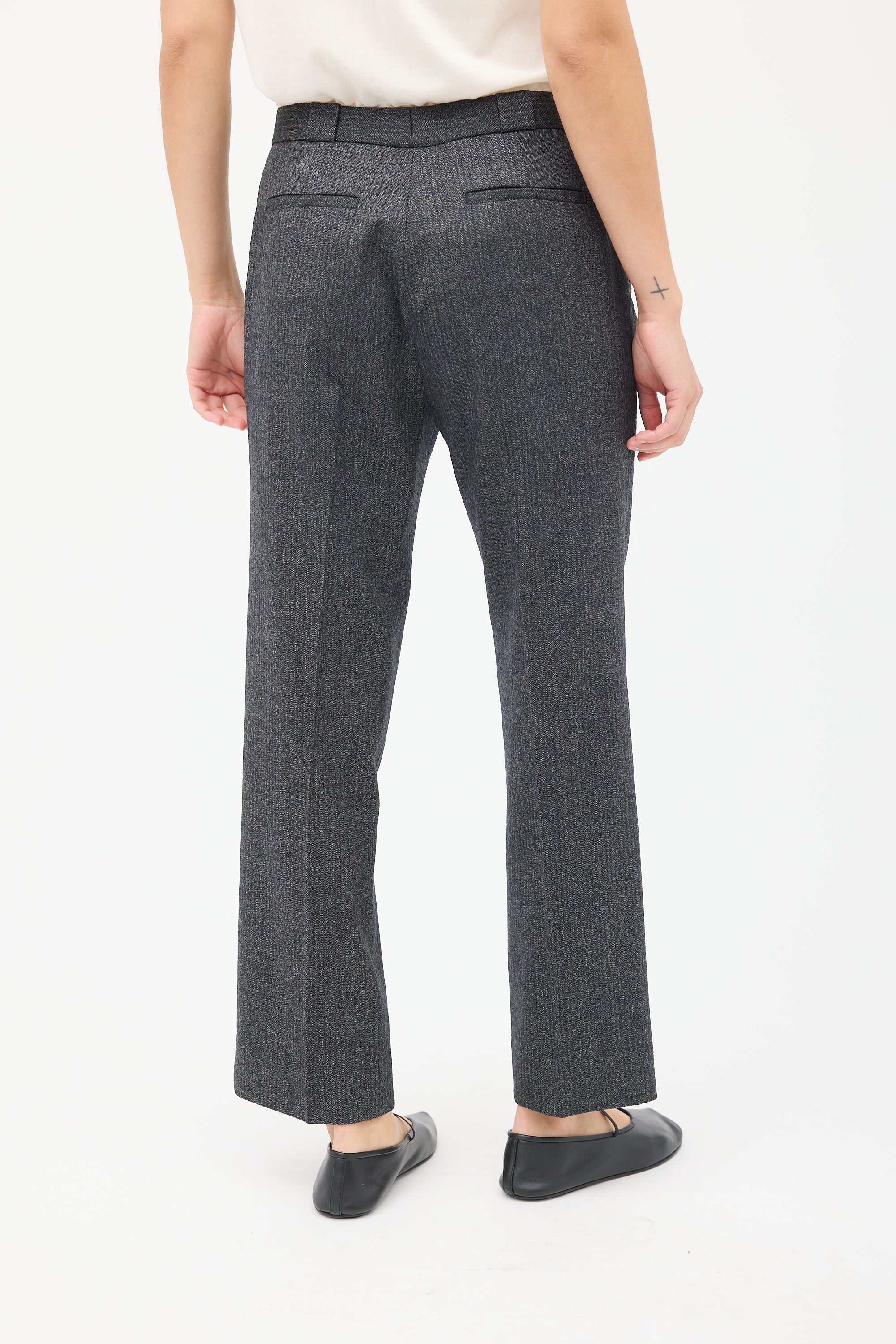 Pre-owned The Row dark grey wool trousers featuring a high waist, dropped seat, slim leg with creases, four pocket styling, and zip fly.