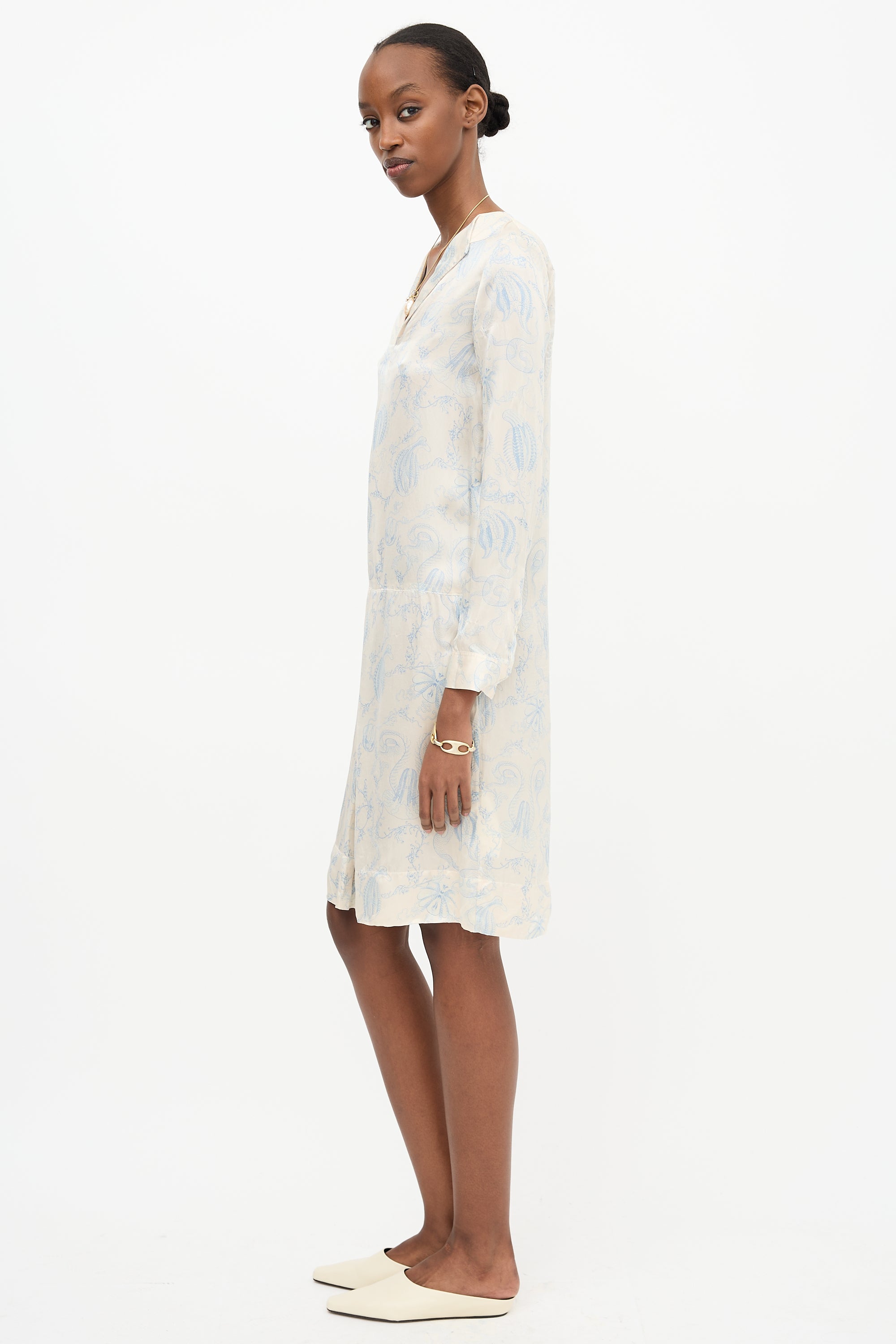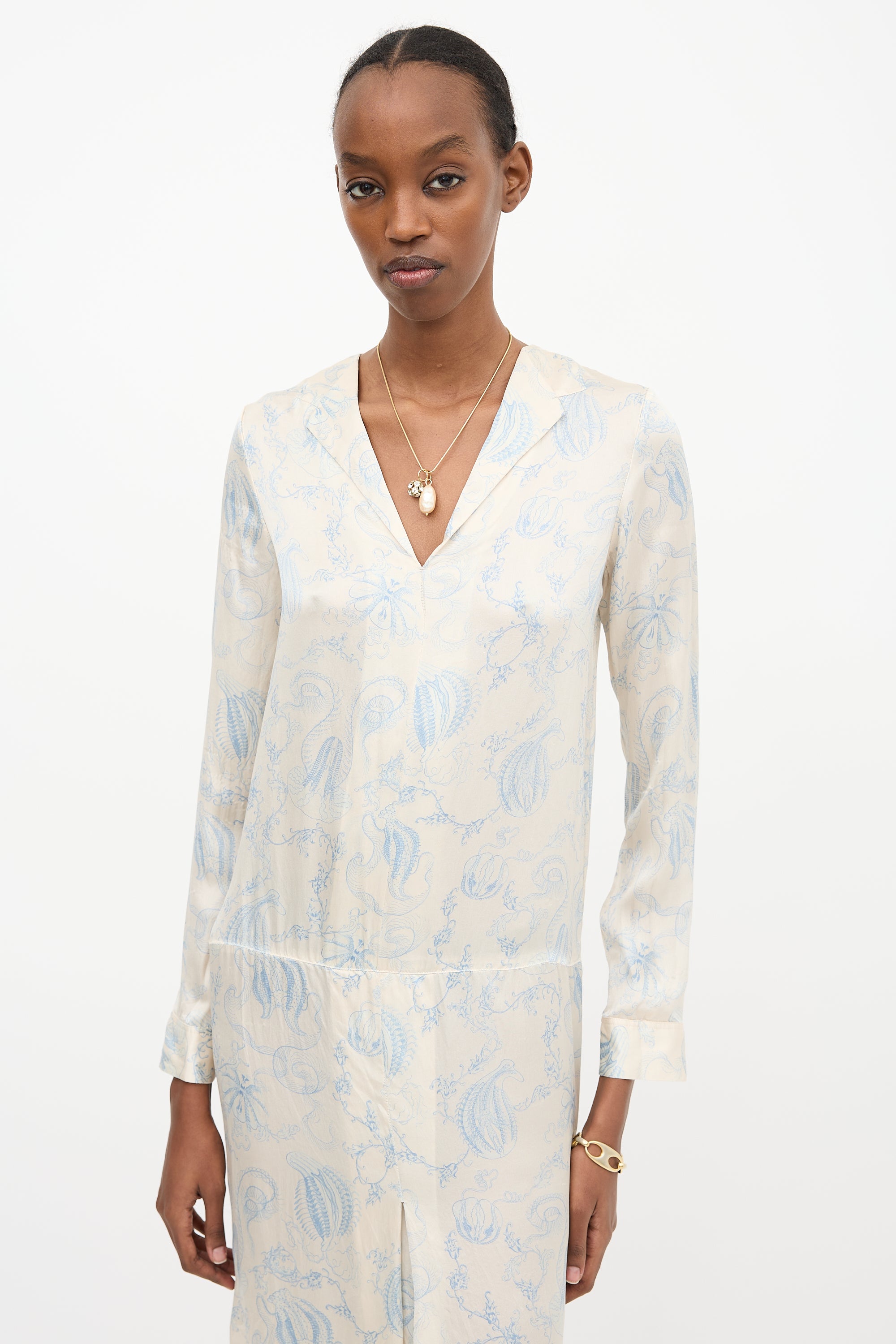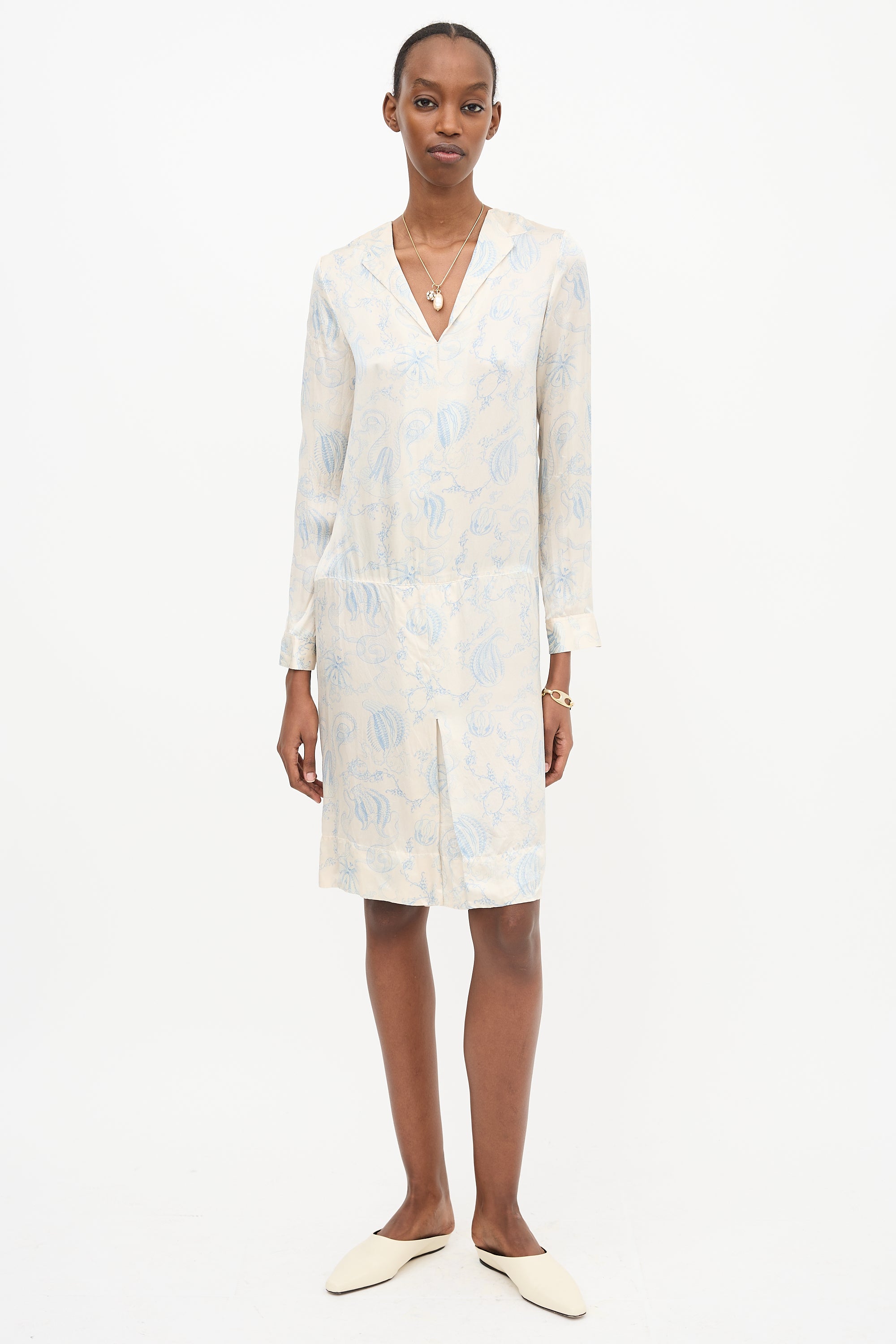 Pre-owned The Row cream and blue silk dress featuring V-neckline with a notched lapel design, long sleeves with buttoned cuffs, drop waist, inverted pleat at front, and a jellyfish pattern throughout.