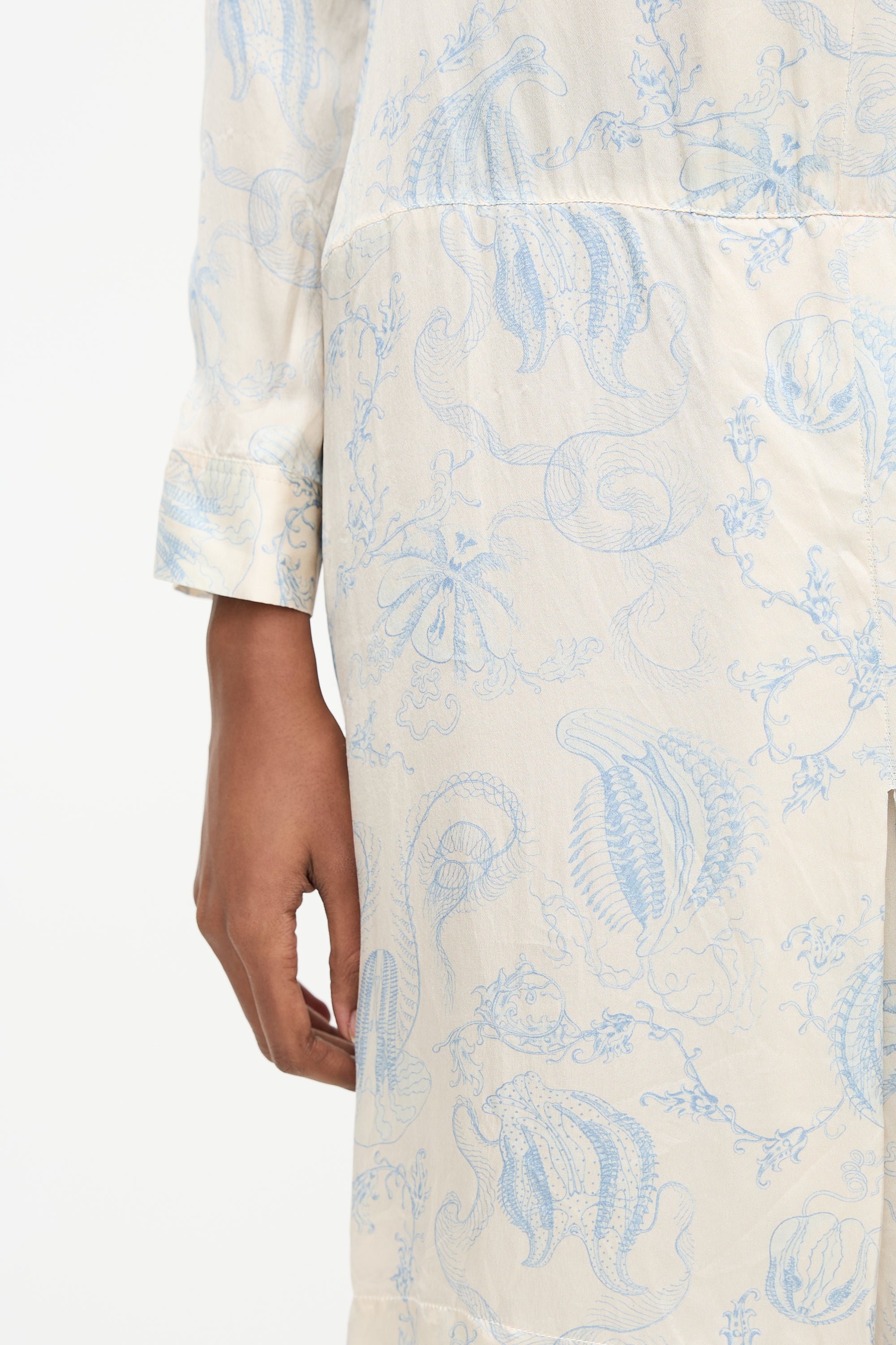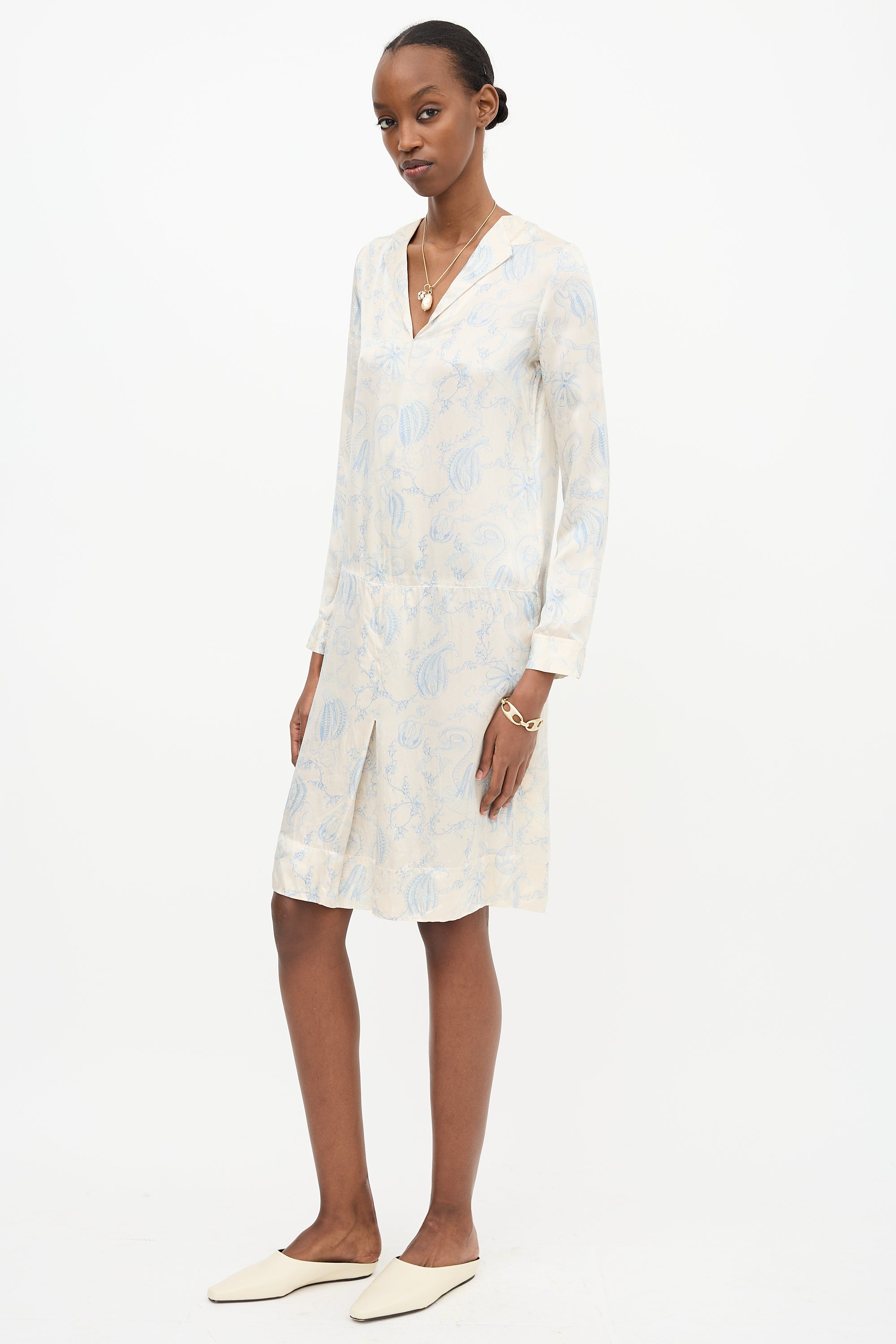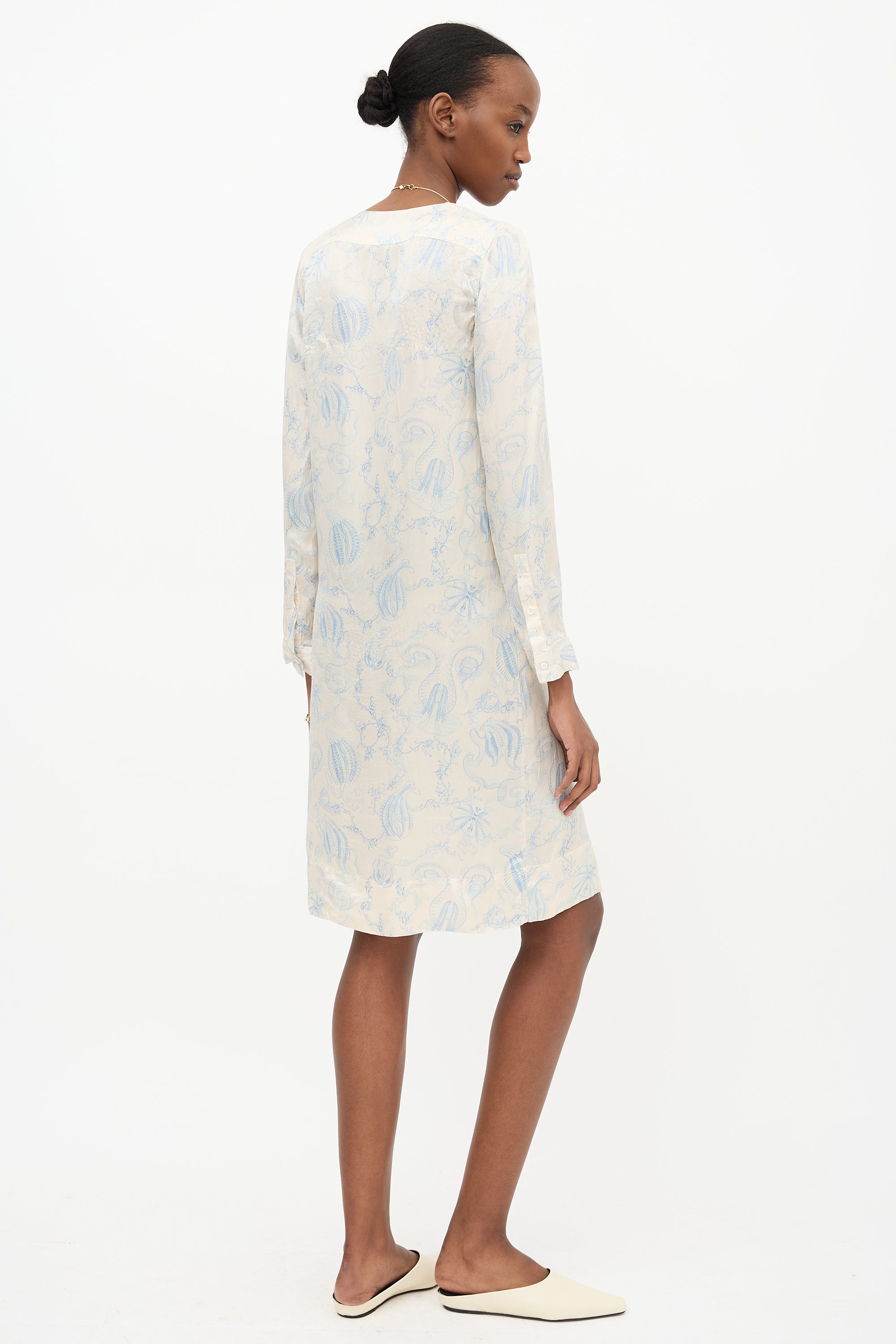 Pre-owned The Row cream and blue silk dress featuring V-neckline with a notched lapel design, long sleeves with buttoned cuffs, drop waist, inverted pleat at front, and a jellyfish pattern throughout.
