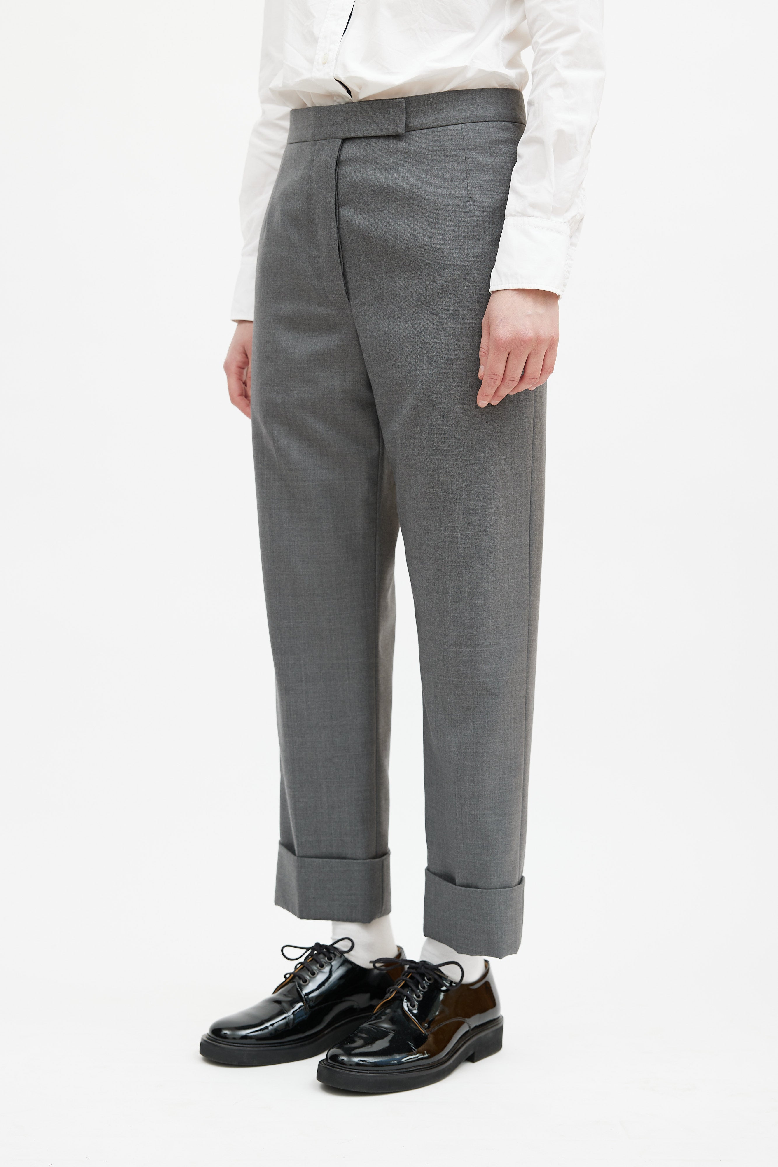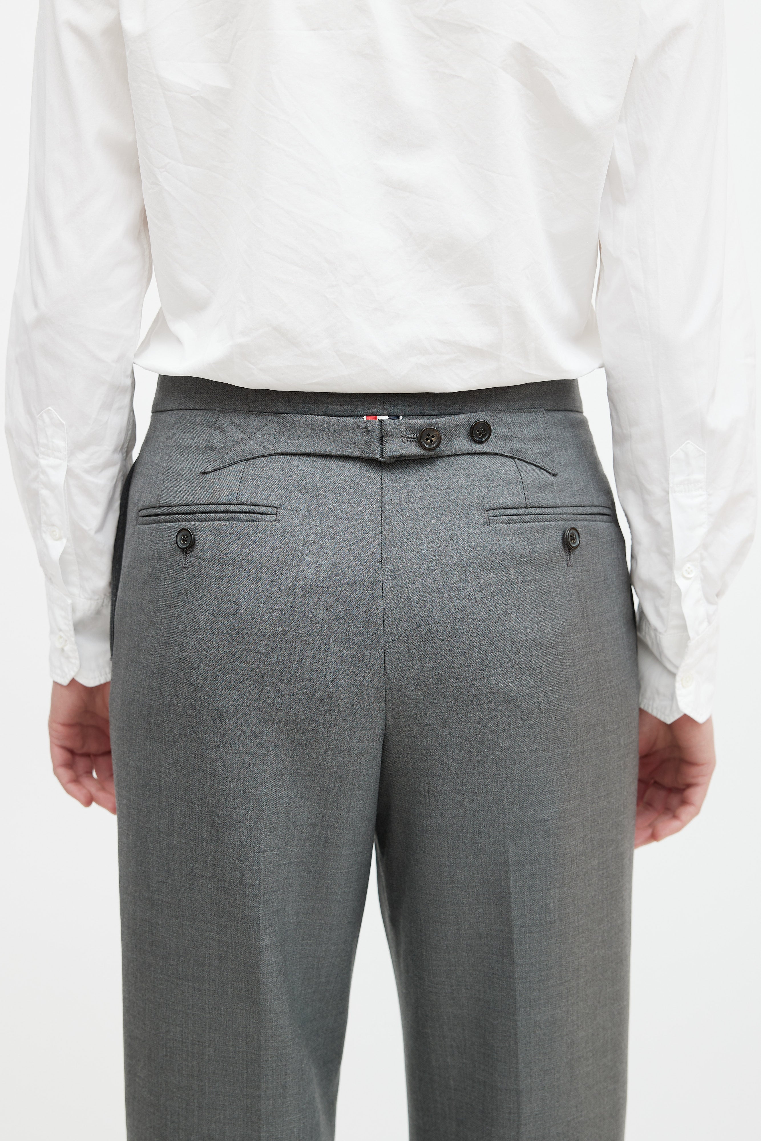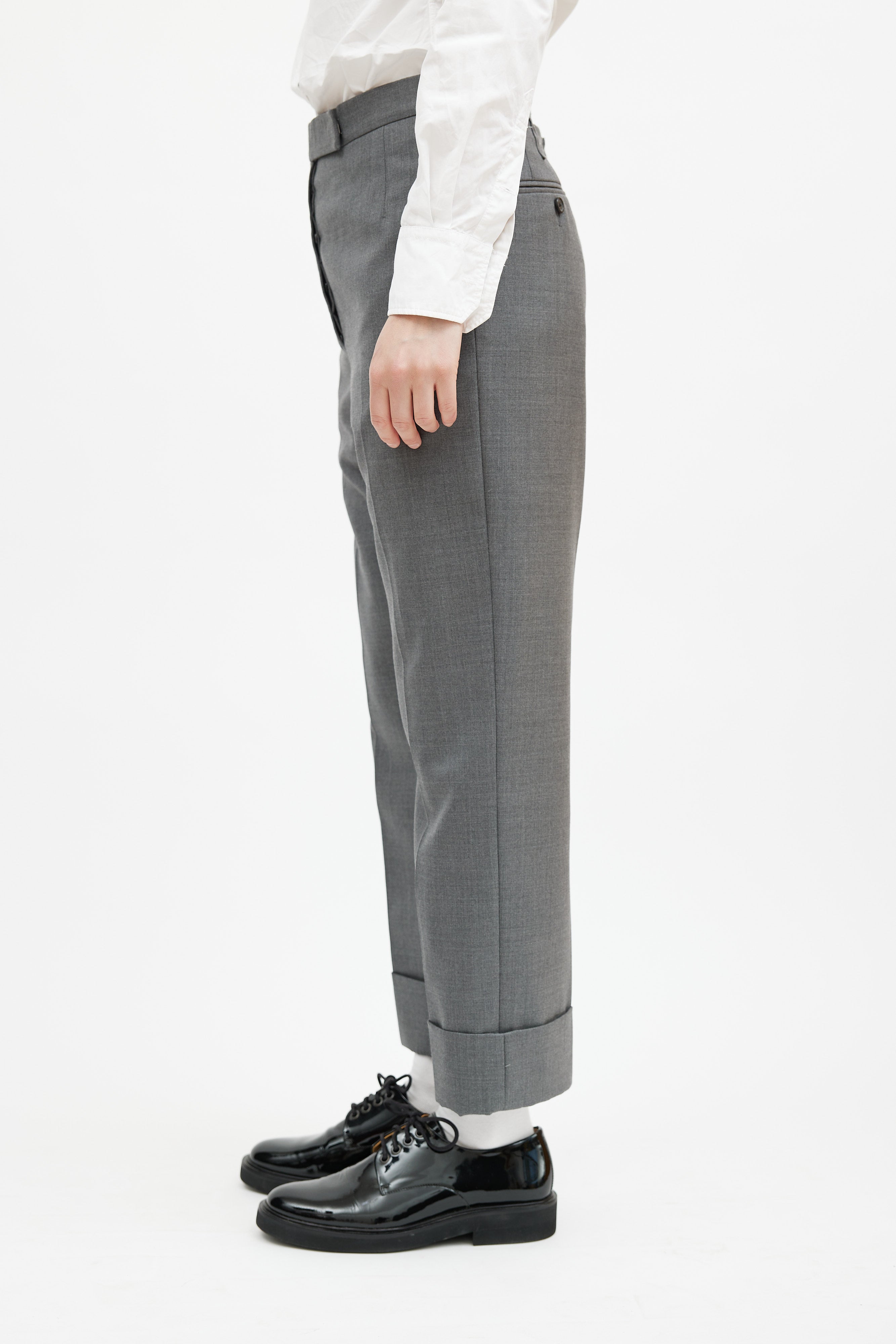 Pre-owned Thom Browne grey wool trousers featuring two slip pockets at hip, two welt pockets at back, striped grosgrain tab at waist, cuffed hem, and button fly closure. Lined.