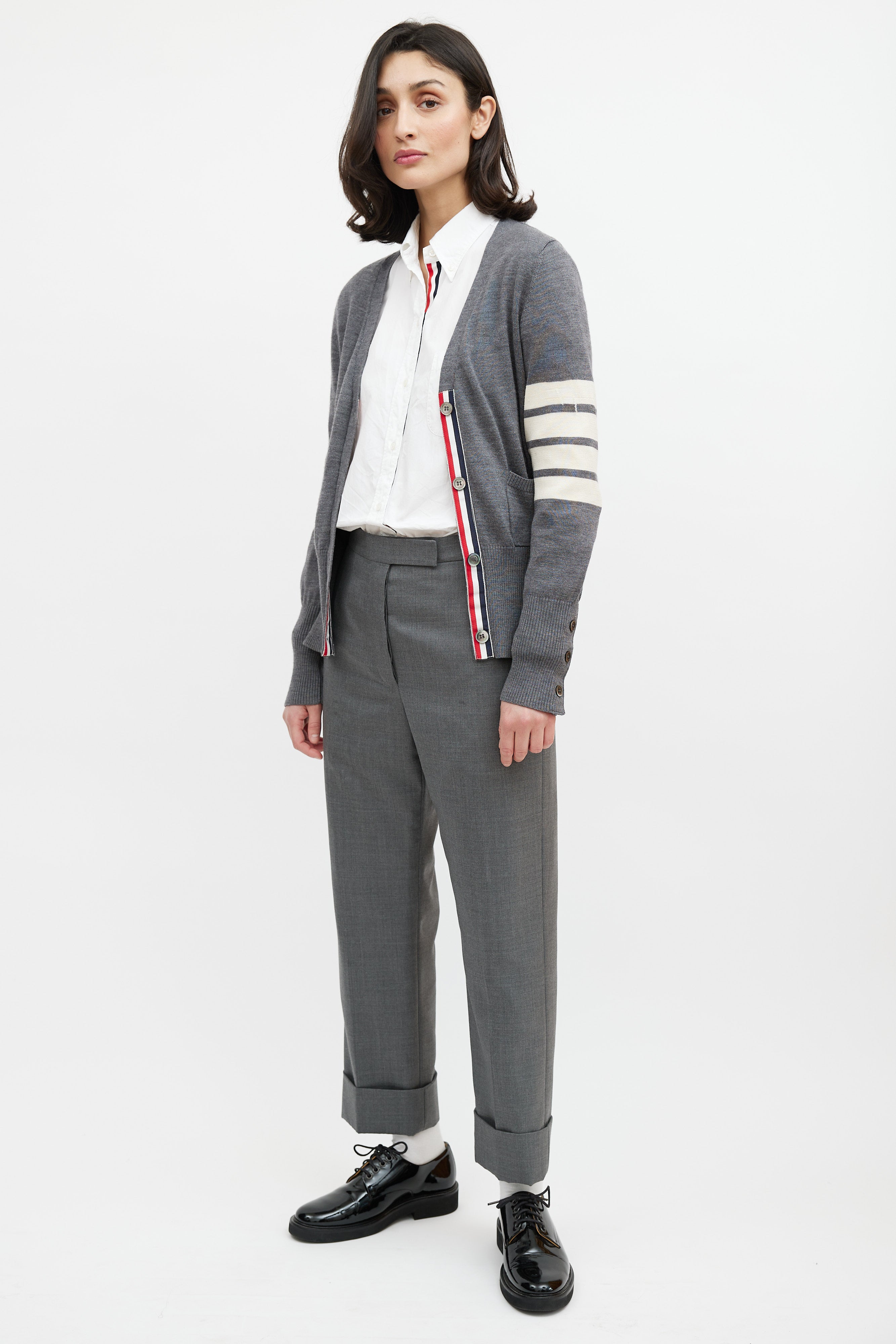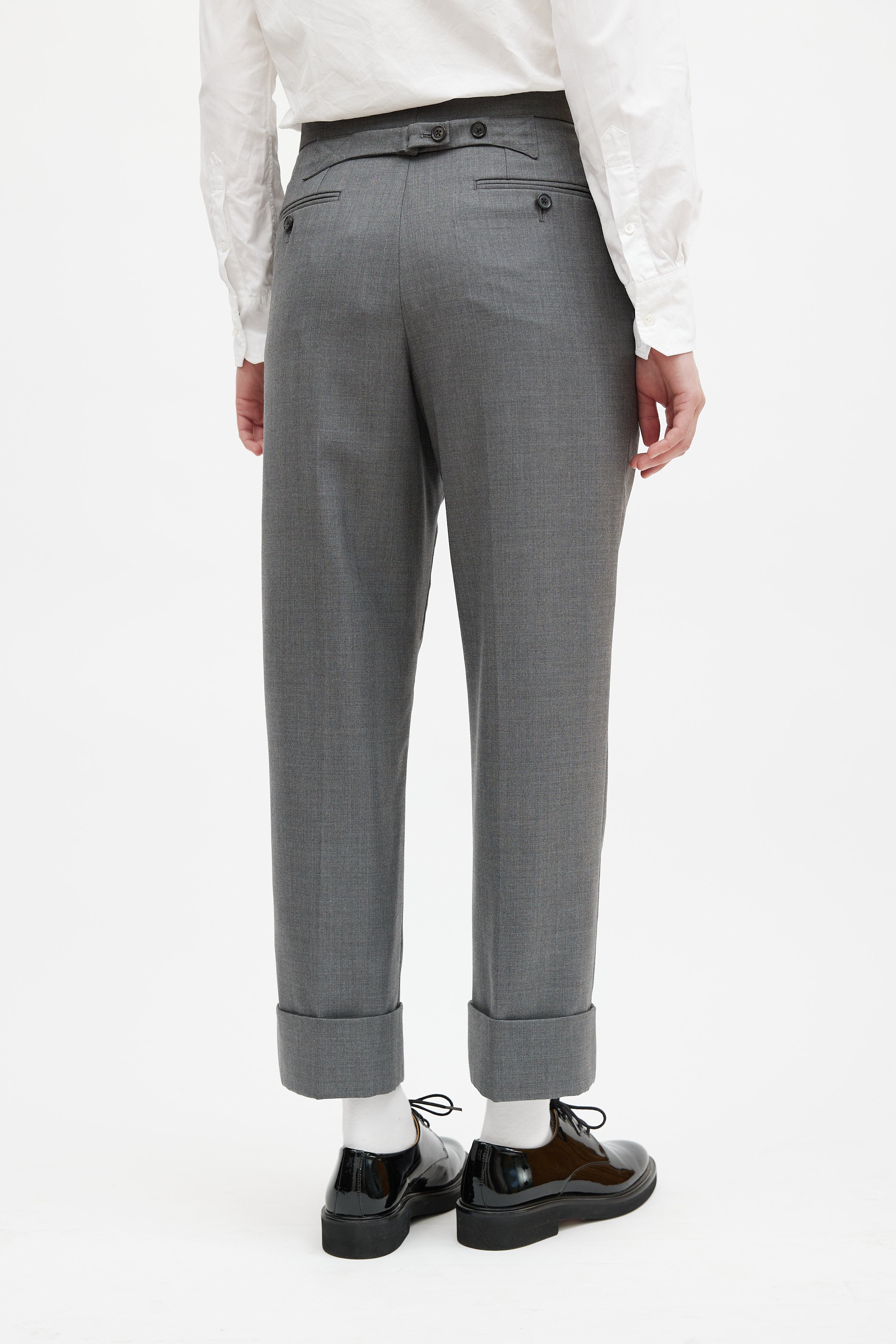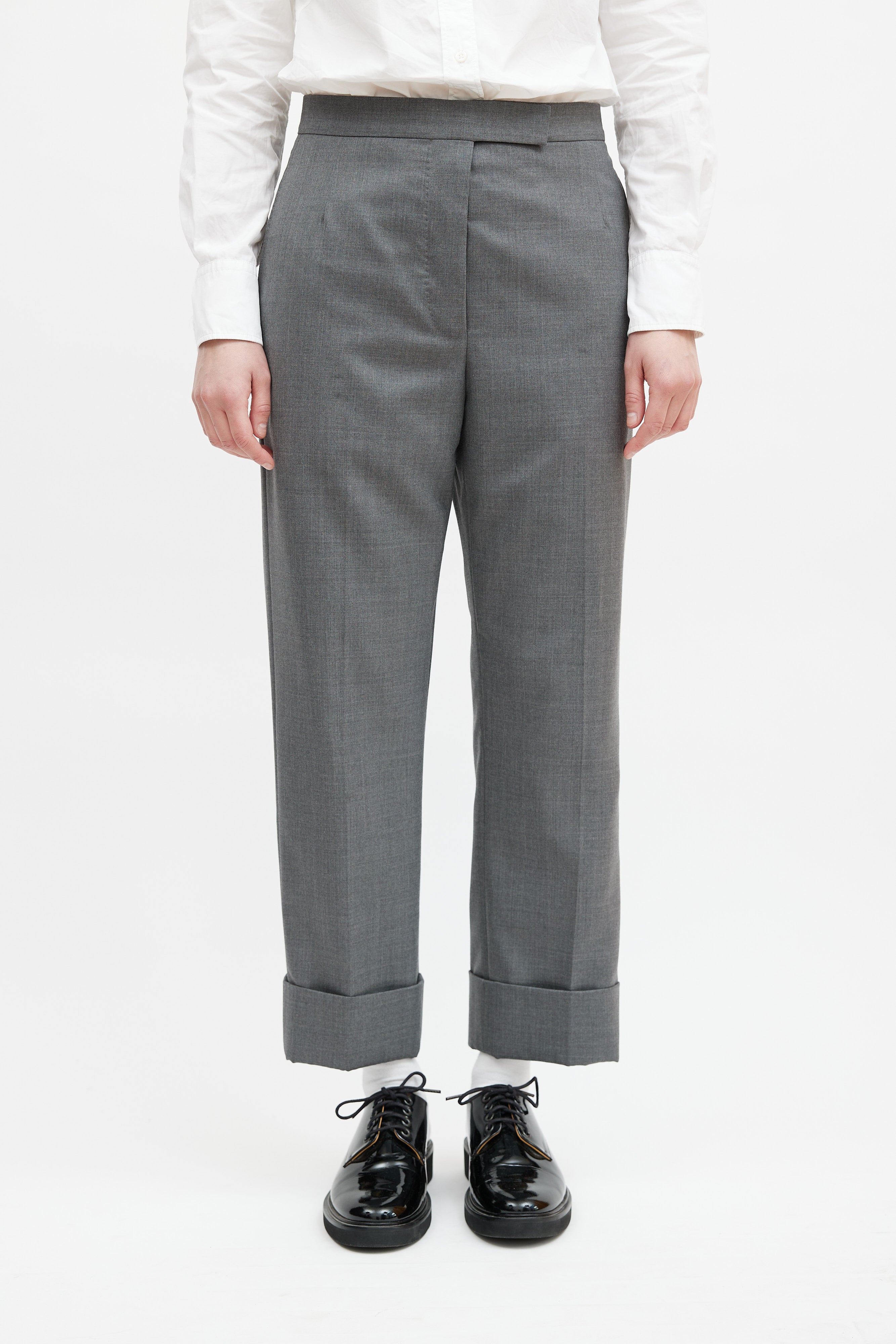 Pre-owned Thom Browne grey wool trousers featuring two slip pockets at hip, two welt pockets at back, striped grosgrain tab at waist, cuffed hem, and button fly closure. Lined.