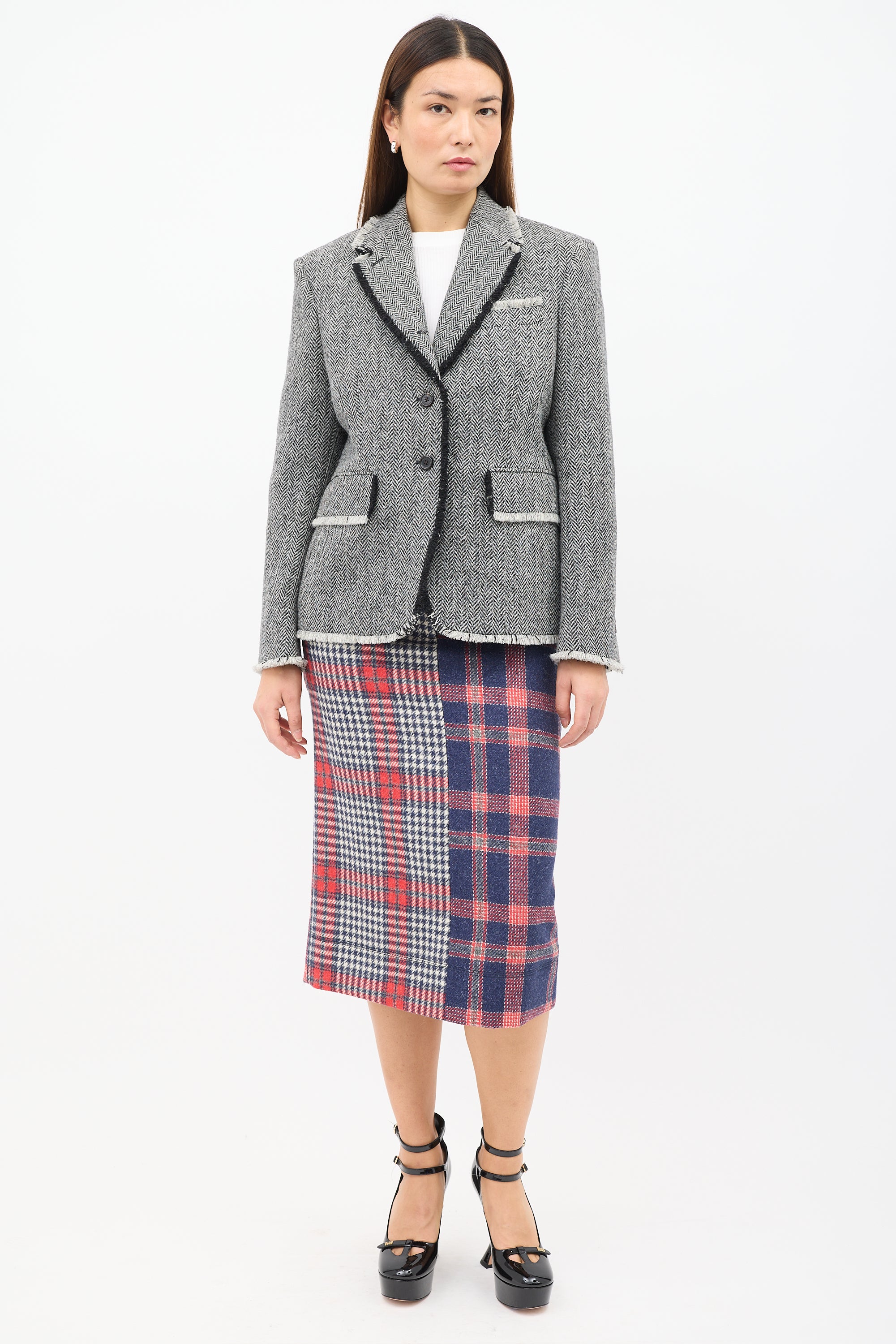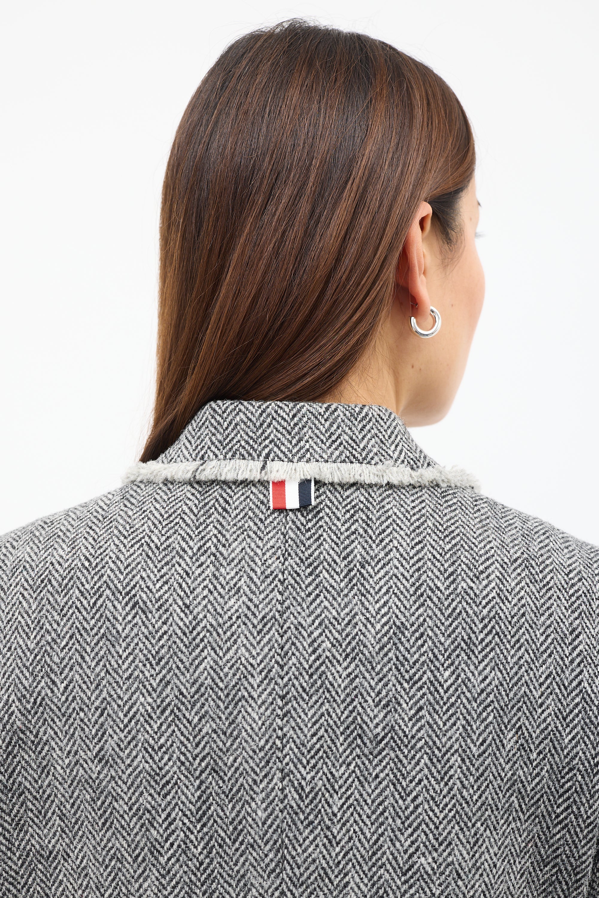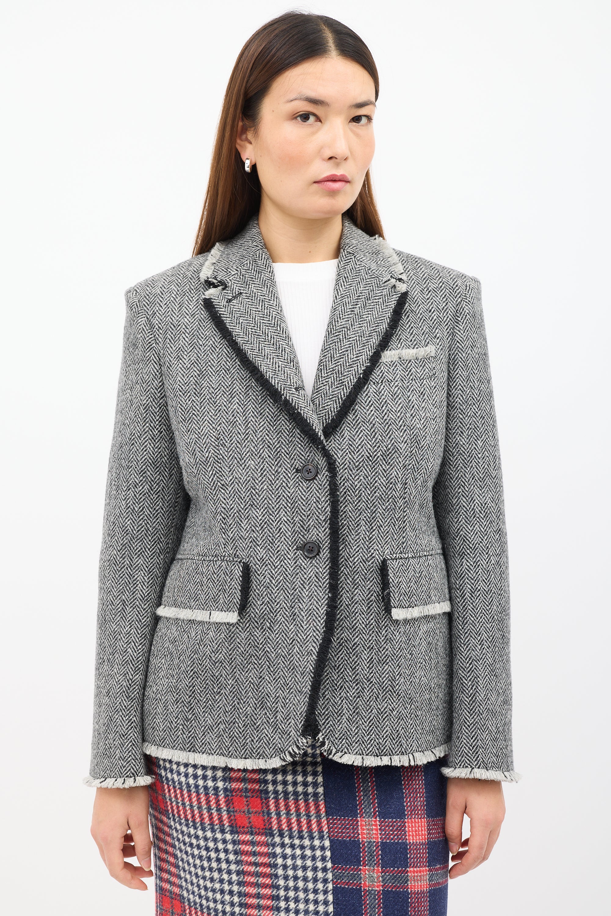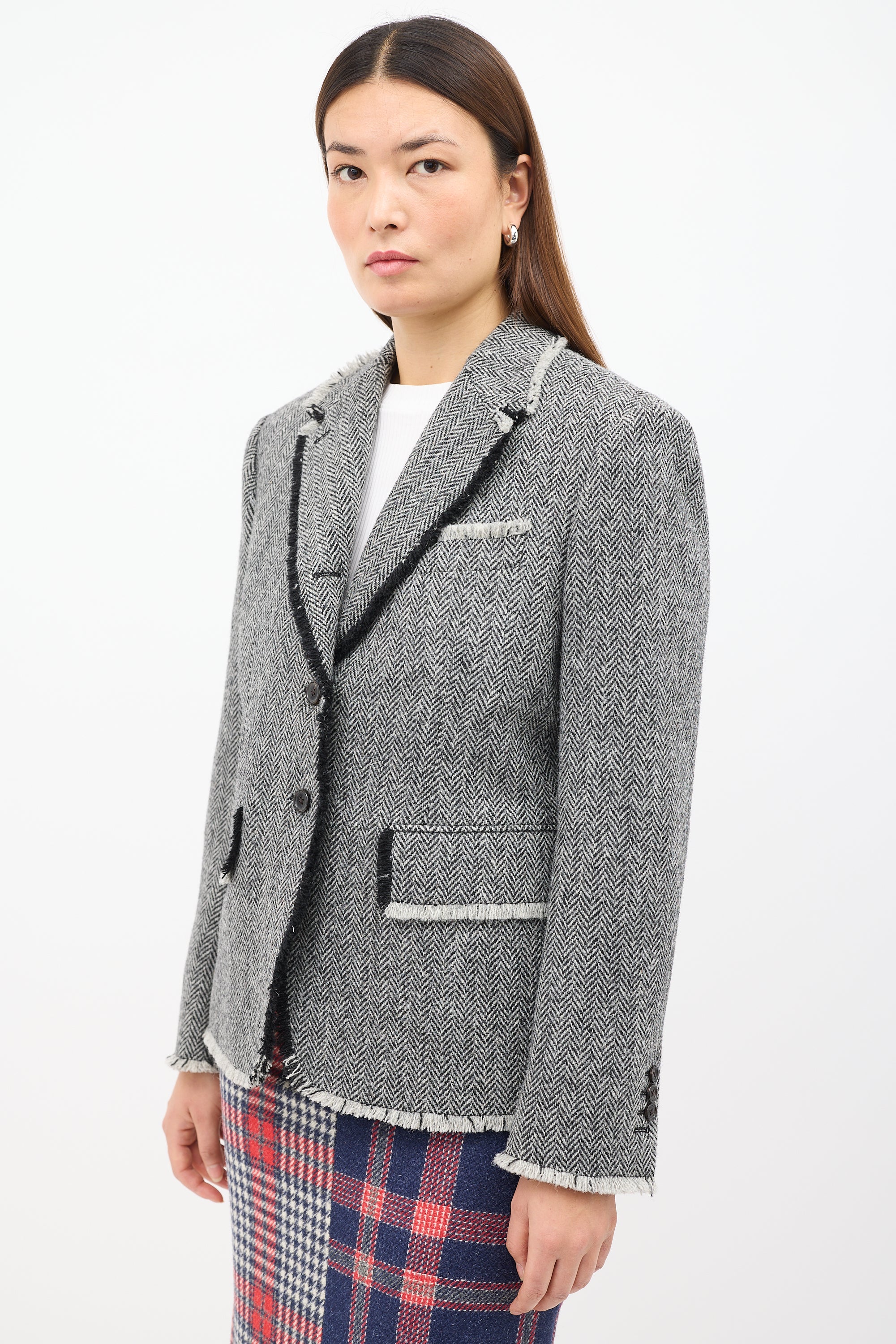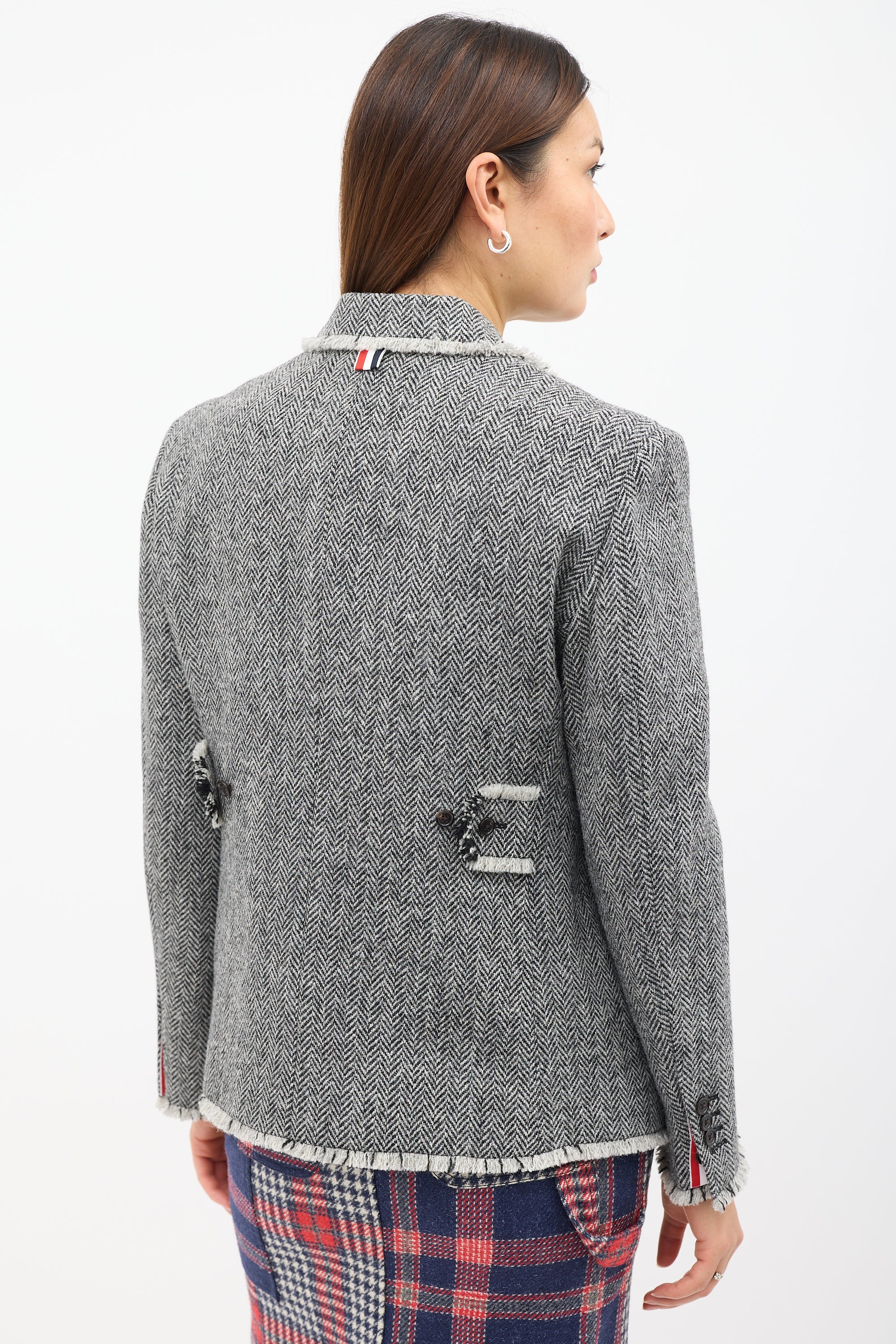 Pre-owned Thom Browne grey wool blazer featuring peak lapel, multicolour fringe trim, chevron knit, buttoned front, one welt pocket at chest, two flap pockets at hips, buttoned straps at back, buttoned cuffs, and signature RWB printed lining.