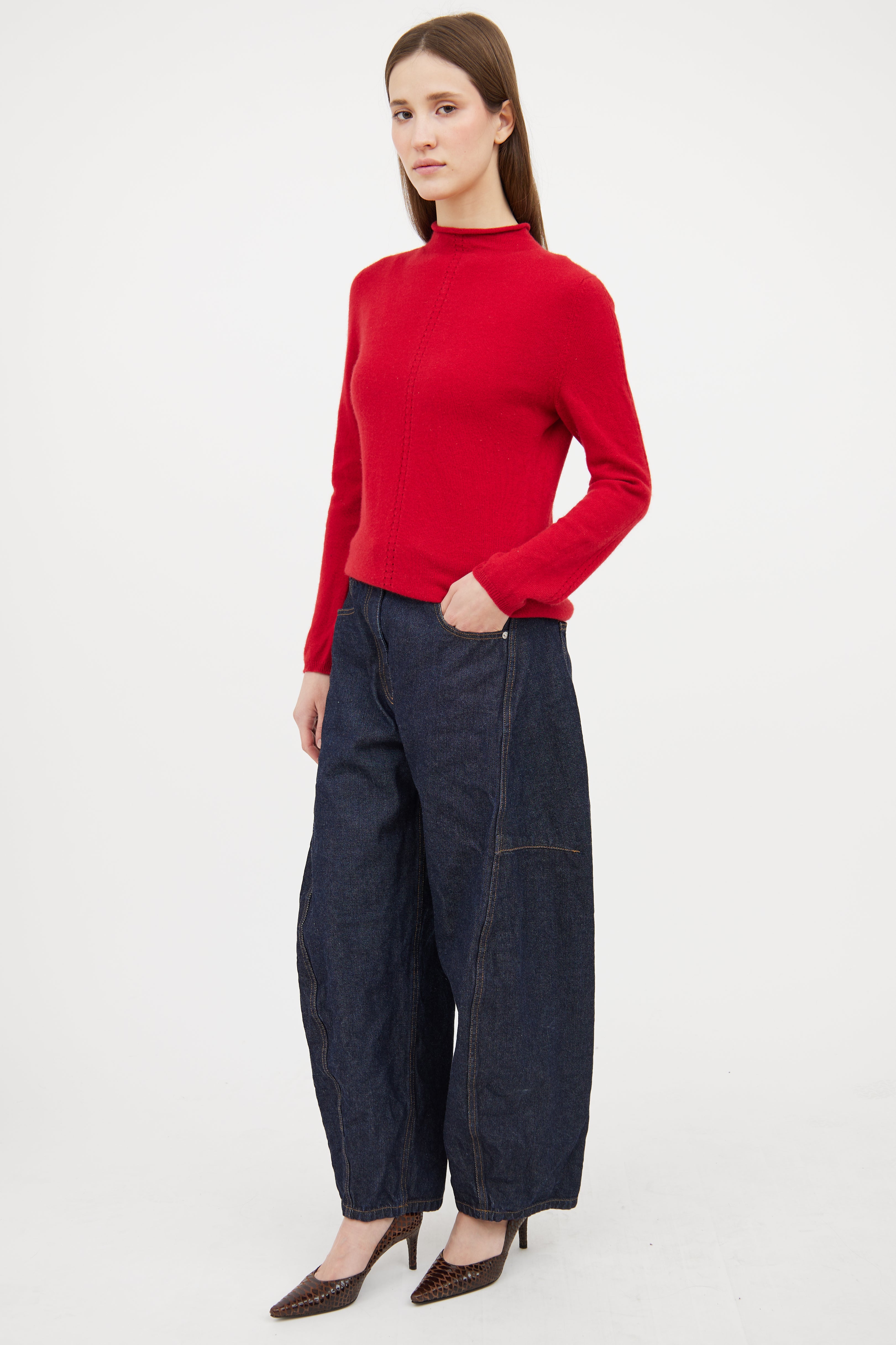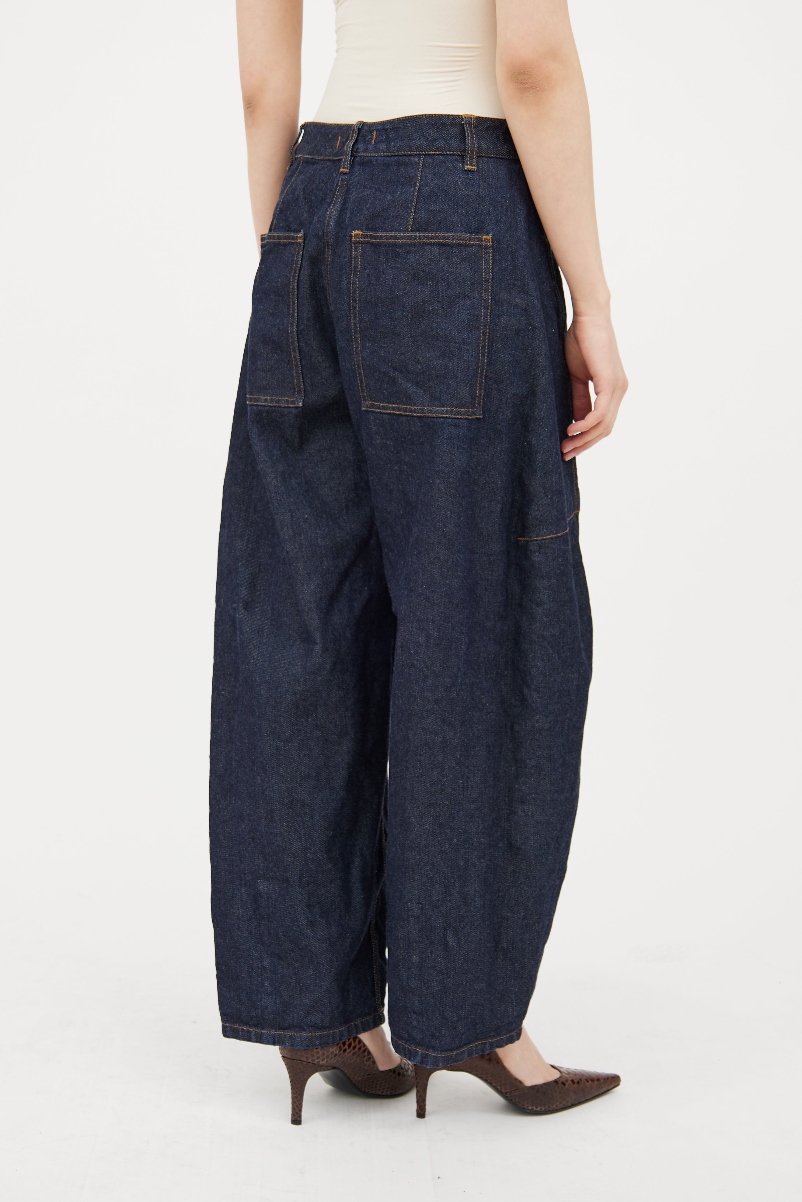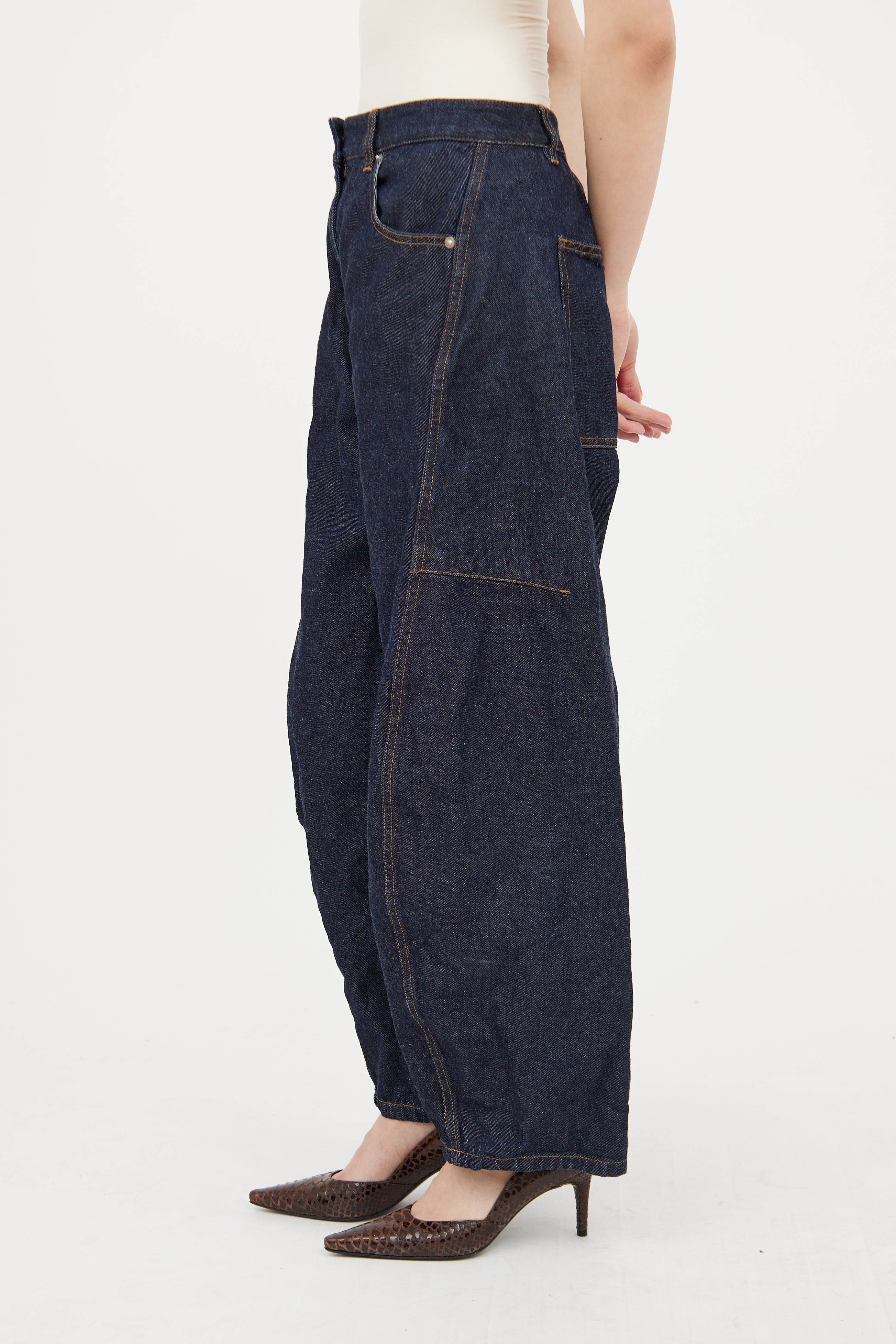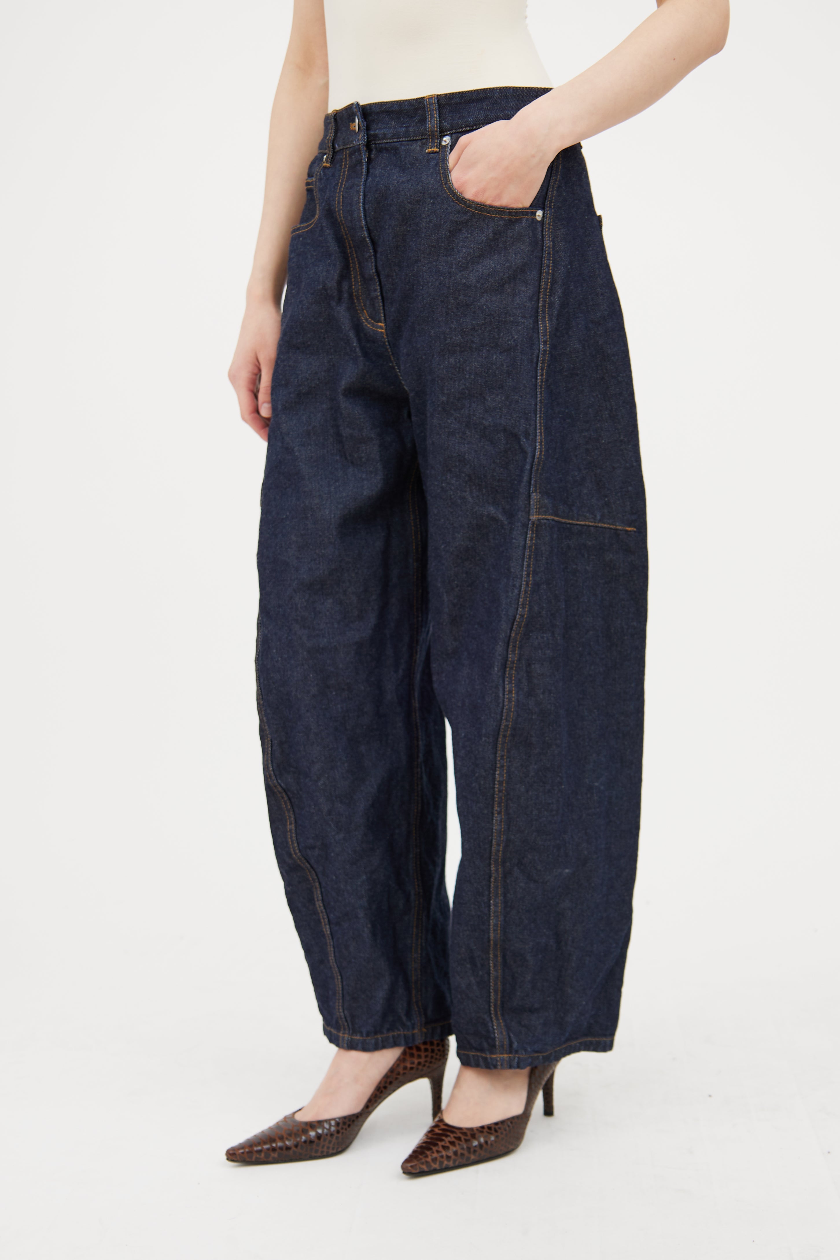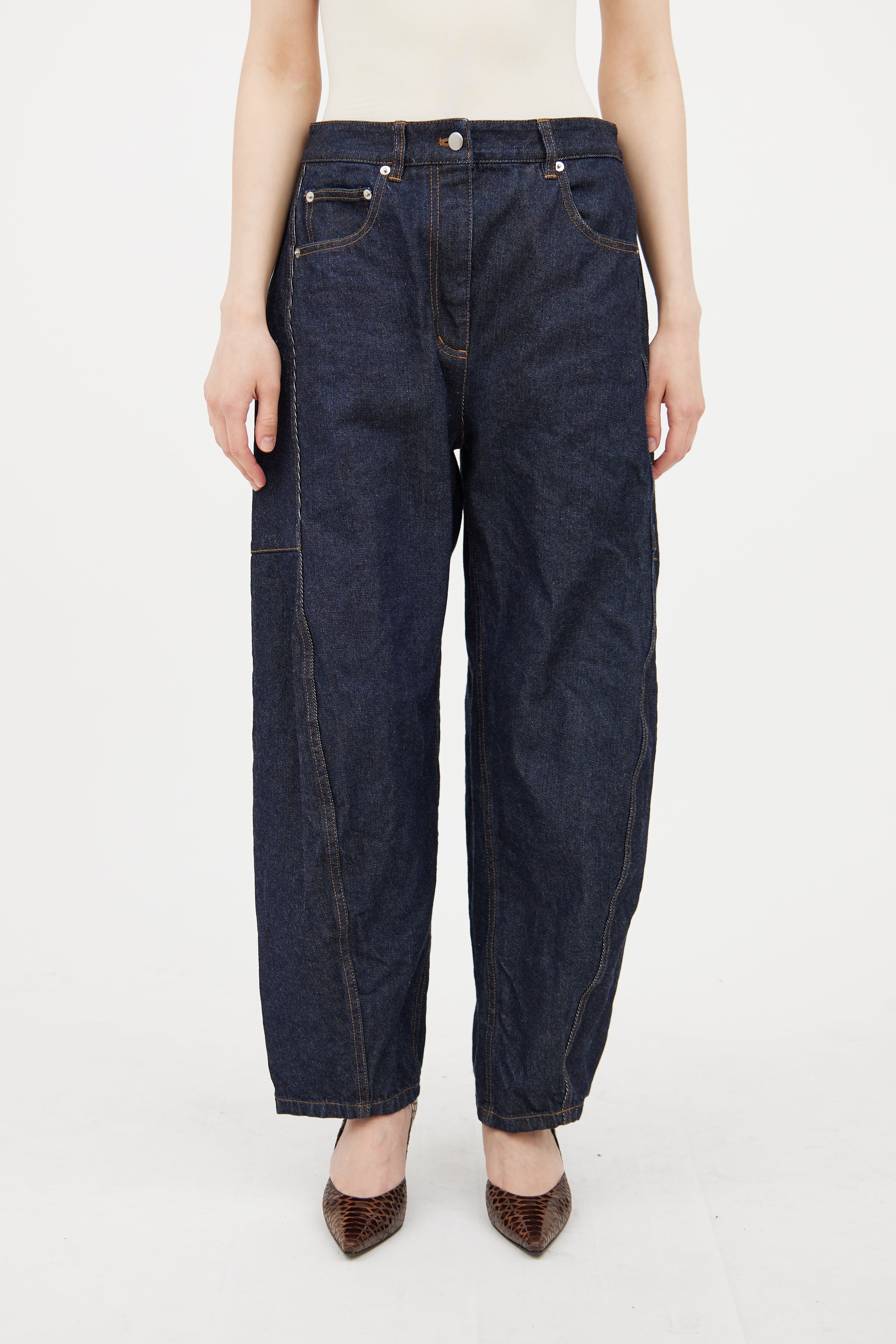 Pre-owned Tibi dark wash Sid jeans featuring five pocket styling, contrast stitching, twisted tapered leg, and zip fly with button closure.