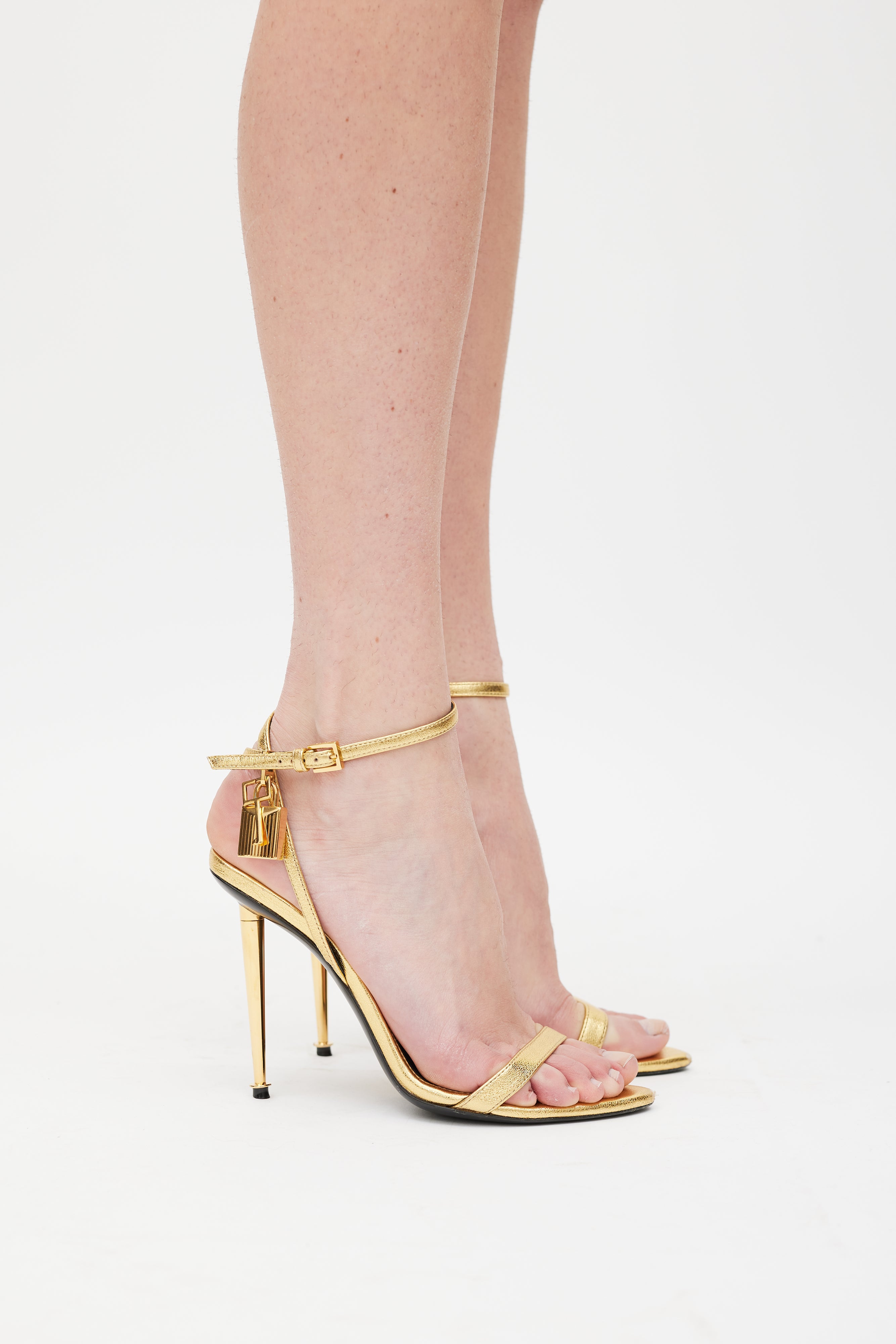 Pre-owned Tom Ford gold tone heels featuring a pointed toe, metallic leather upper, strap across vamp, adjustable ankle strap with gold tone padlock and key at outer side, and metal stiletto heel. Comes with original dust bags.