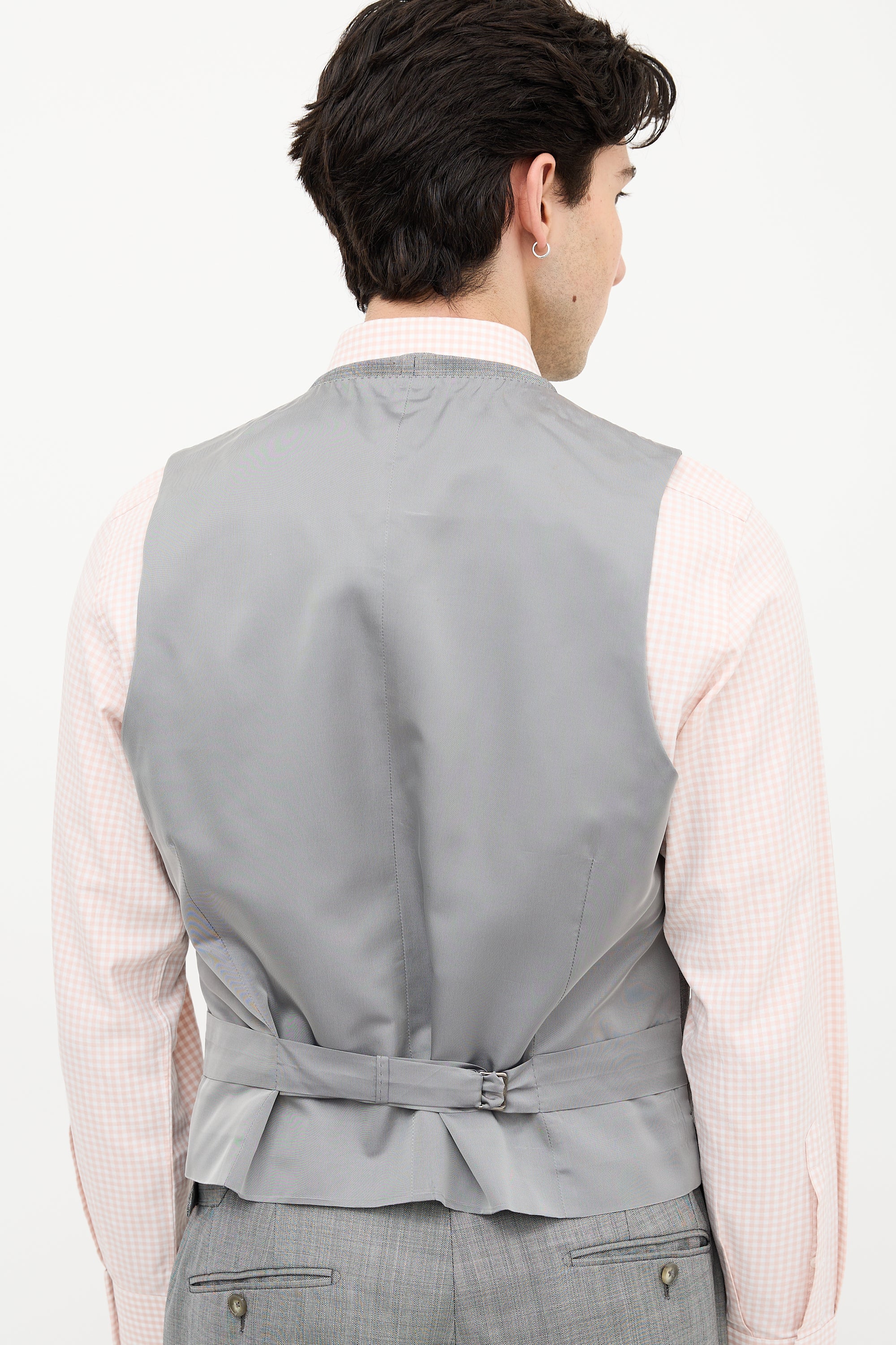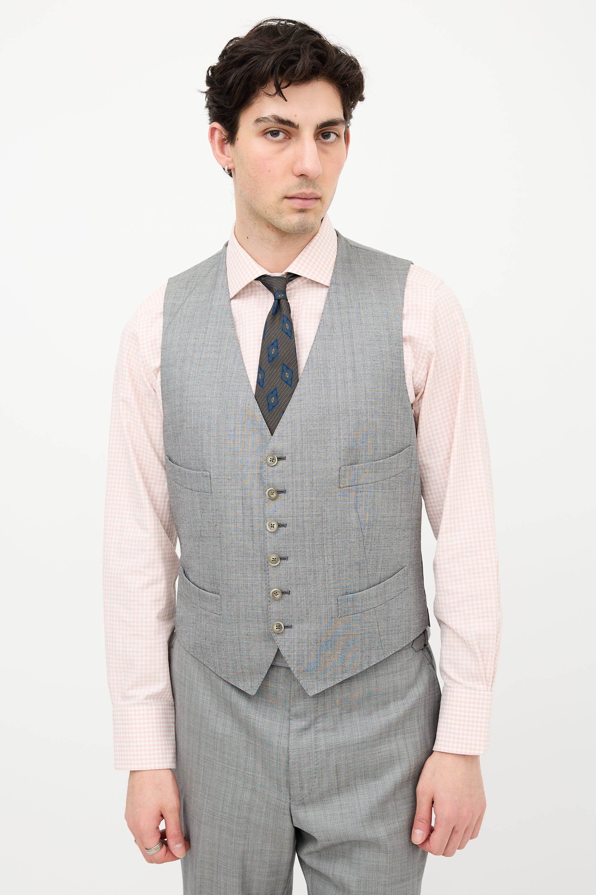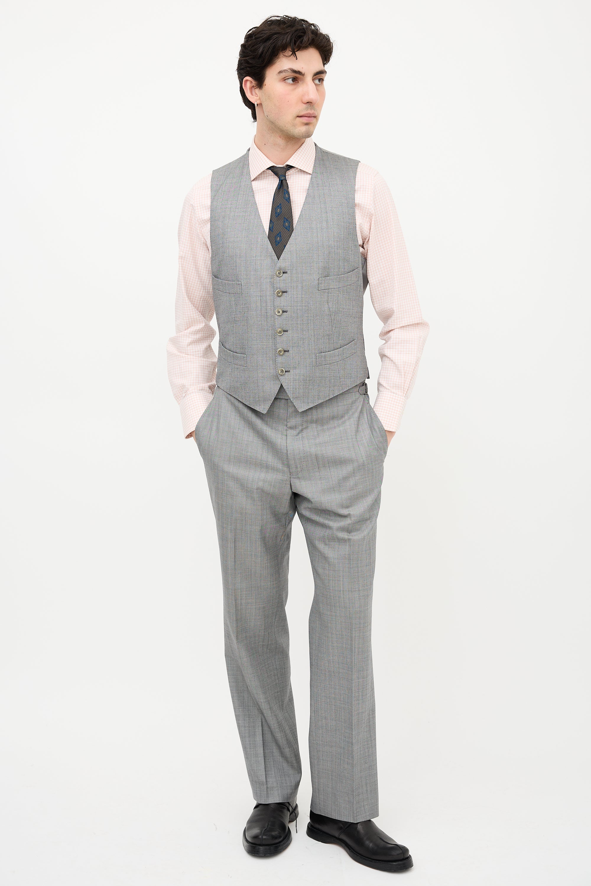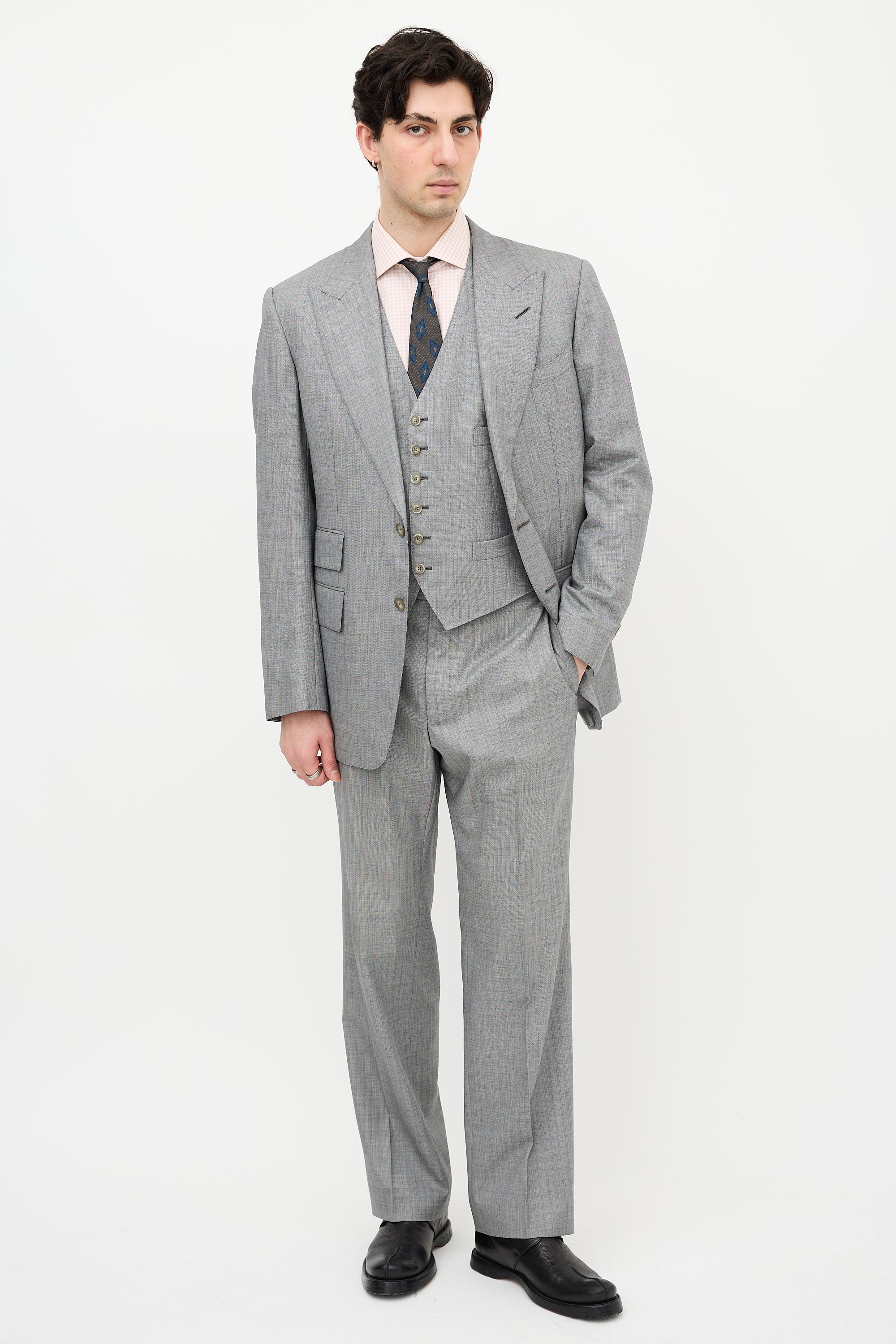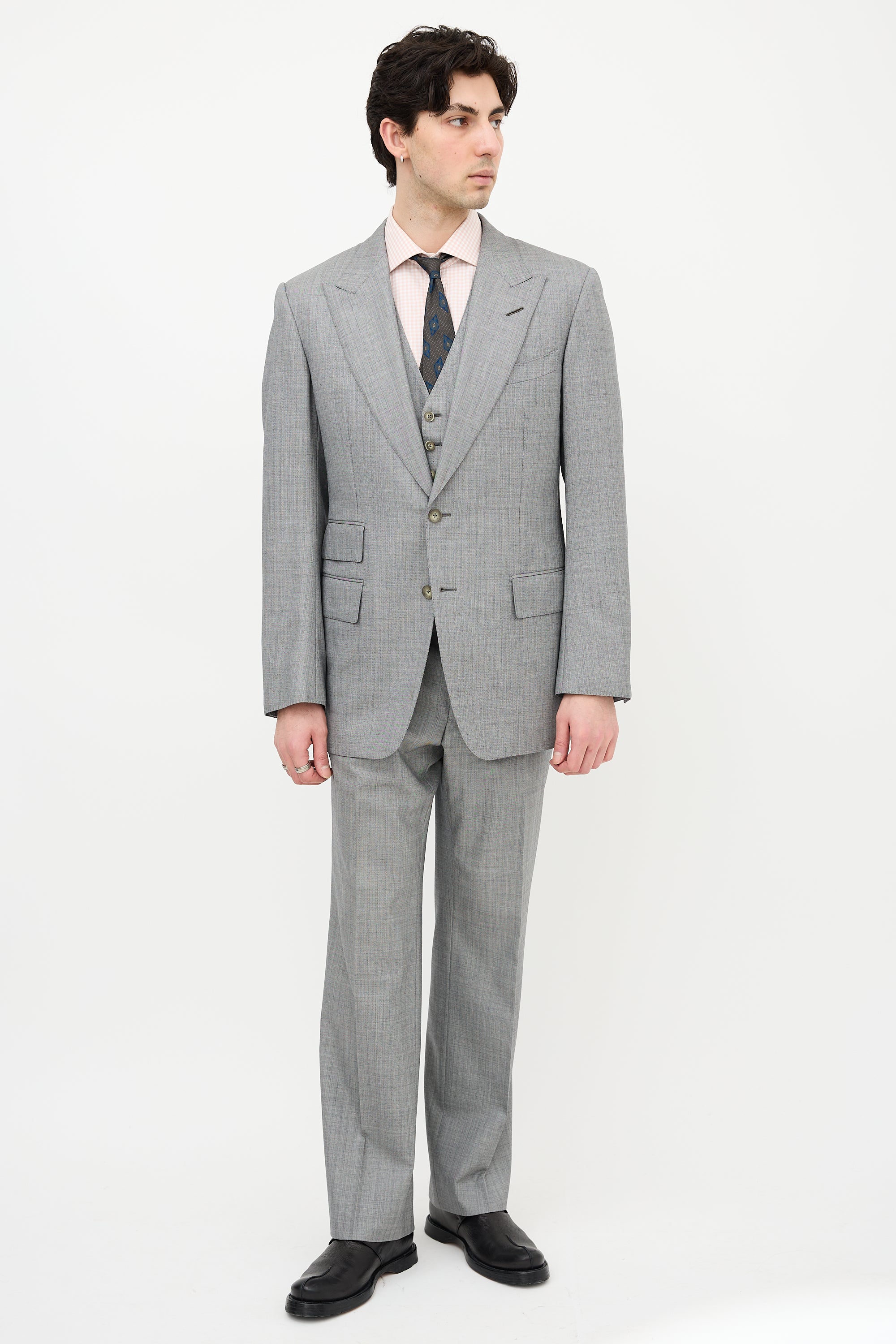 Pre-owned Tom Ford grey herringbone suit jacket featuring a peak lapel, buttoned front, one welt pocket at chest, three flap pockets across hip, dual vented back, padded shoulders, and buttoned cuffs. Matching vest featuring a V-neckline, buttoned front, four welt pockets, and adjustable strap at back waist. Matching trousers featuring a zip fly with hook fastenings, adjustable straps at waist with D-ring buckle, two slash pockets at hip, two buttoned welt pockets at back, and pressed seams.