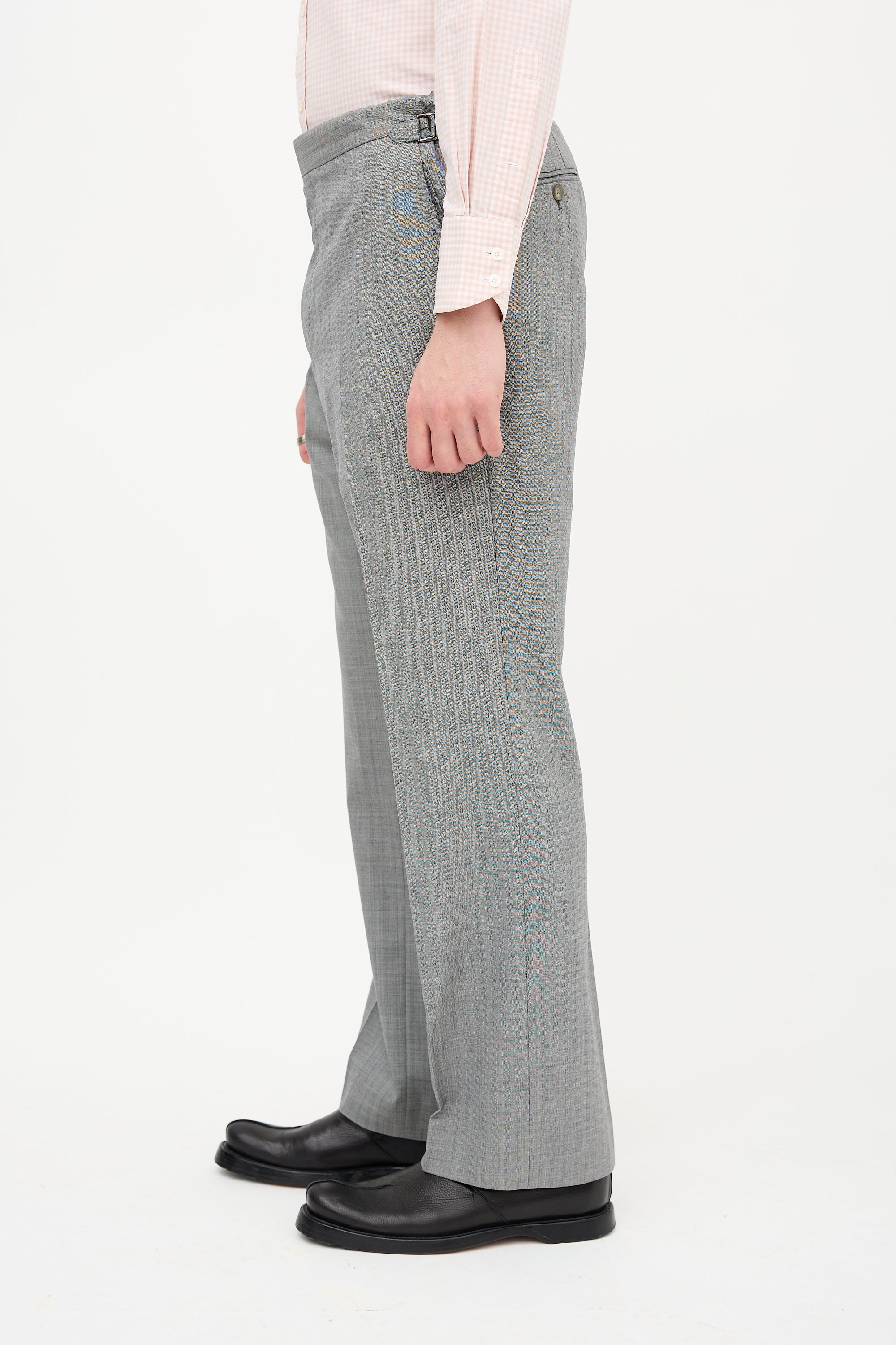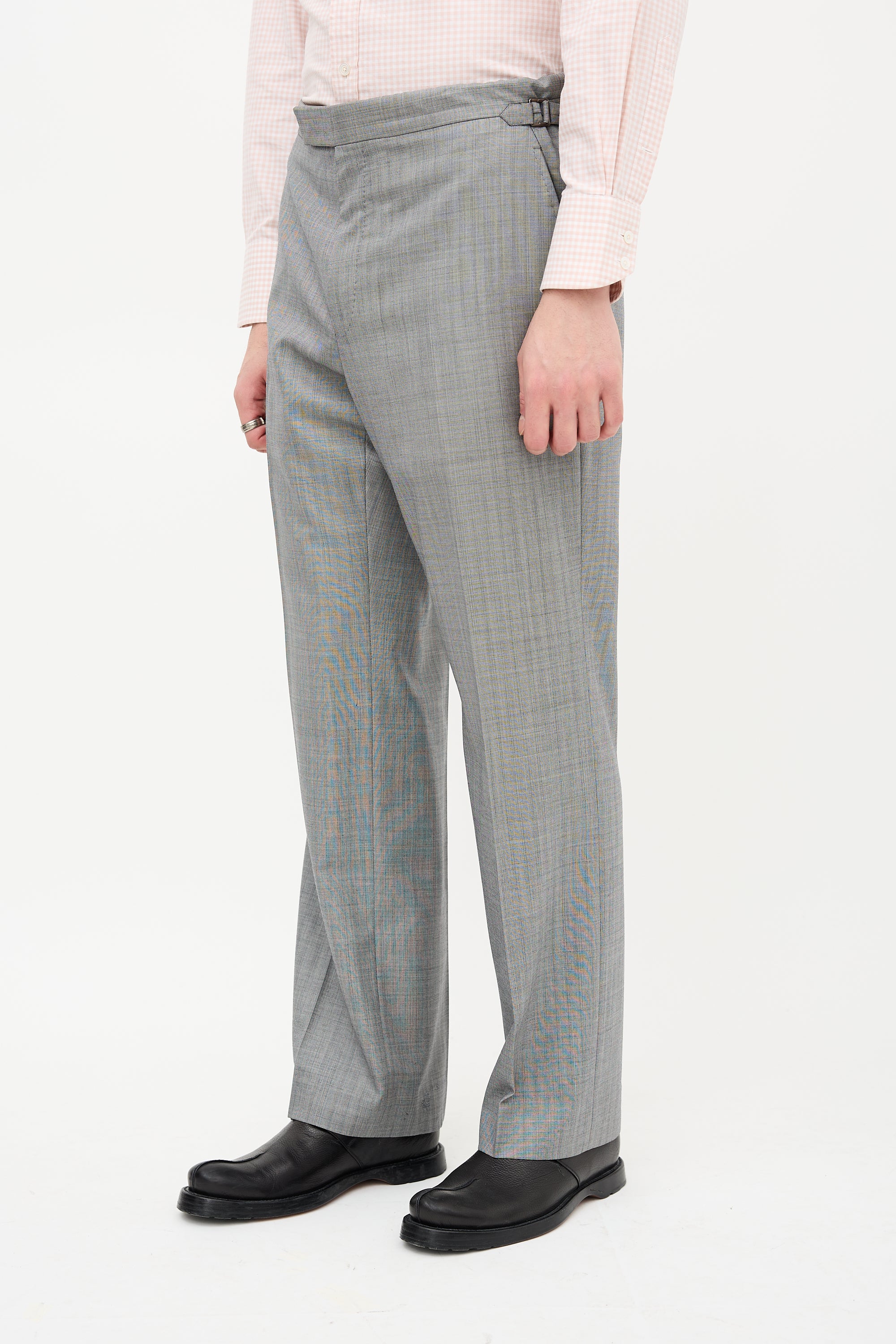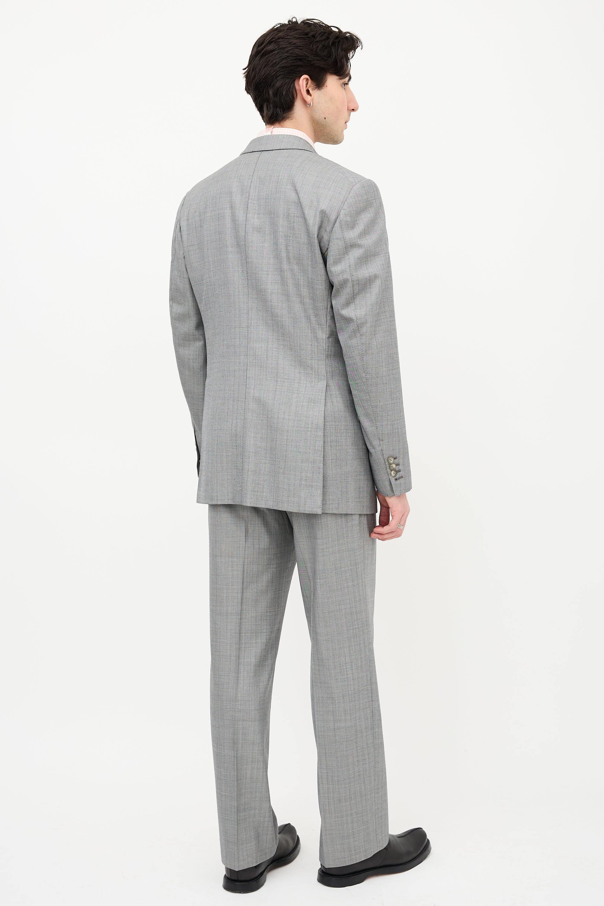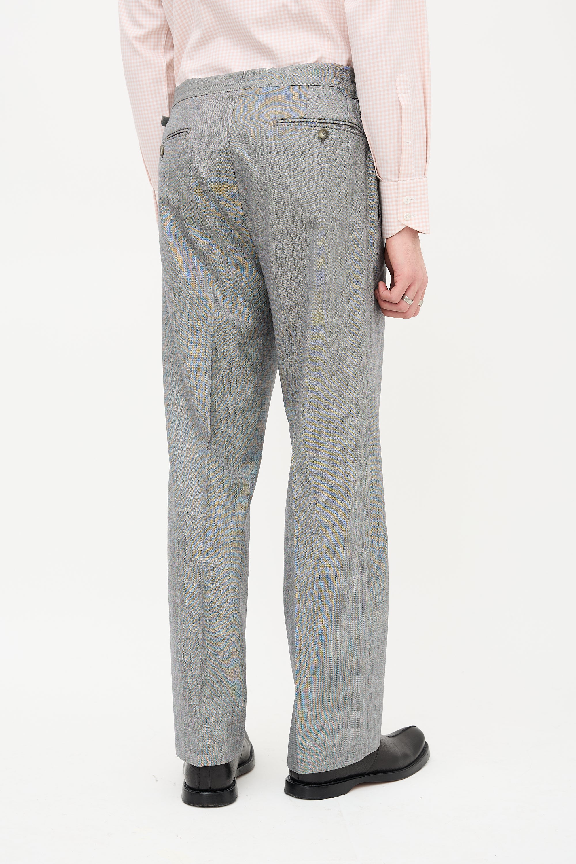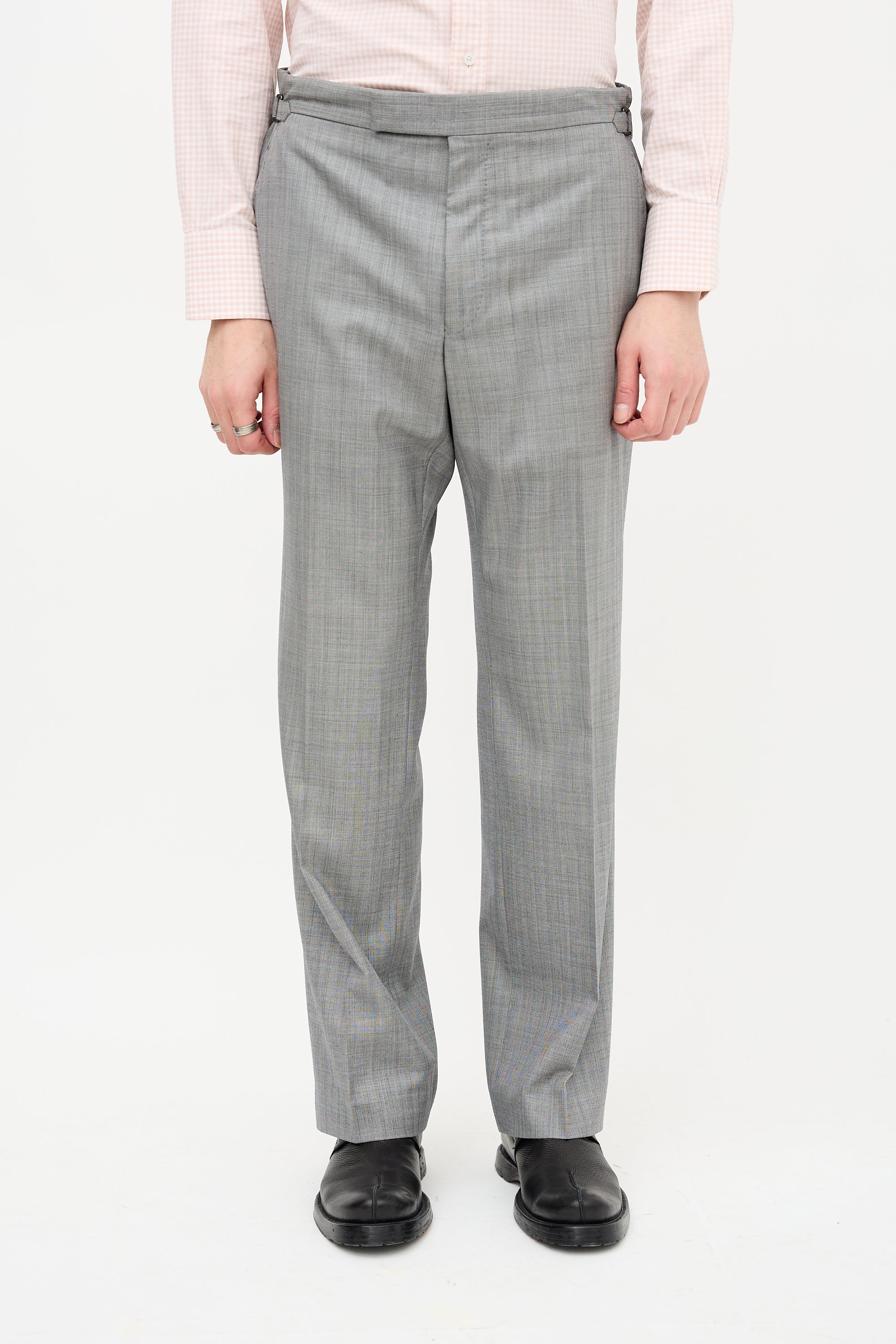 Pre-owned Tom Ford grey herringbone suit jacket featuring a peak lapel, buttoned front, one welt pocket at chest, three flap pockets across hip, dual vented back, padded shoulders, and buttoned cuffs. Matching vest featuring a V-neckline, buttoned front, four welt pockets, and adjustable strap at back waist. Matching trousers featuring a zip fly with hook fastenings, adjustable straps at waist with D-ring buckle, two slash pockets at hip, two buttoned welt pockets at back, and pressed seams.