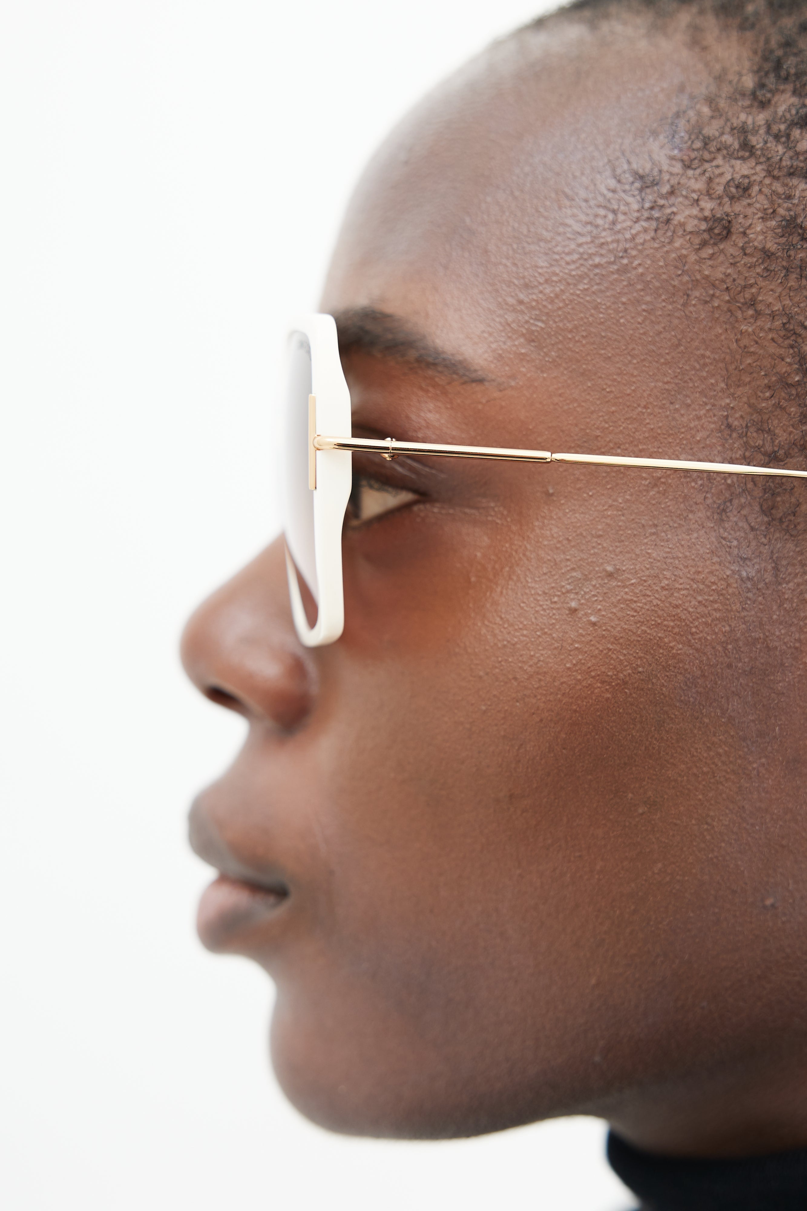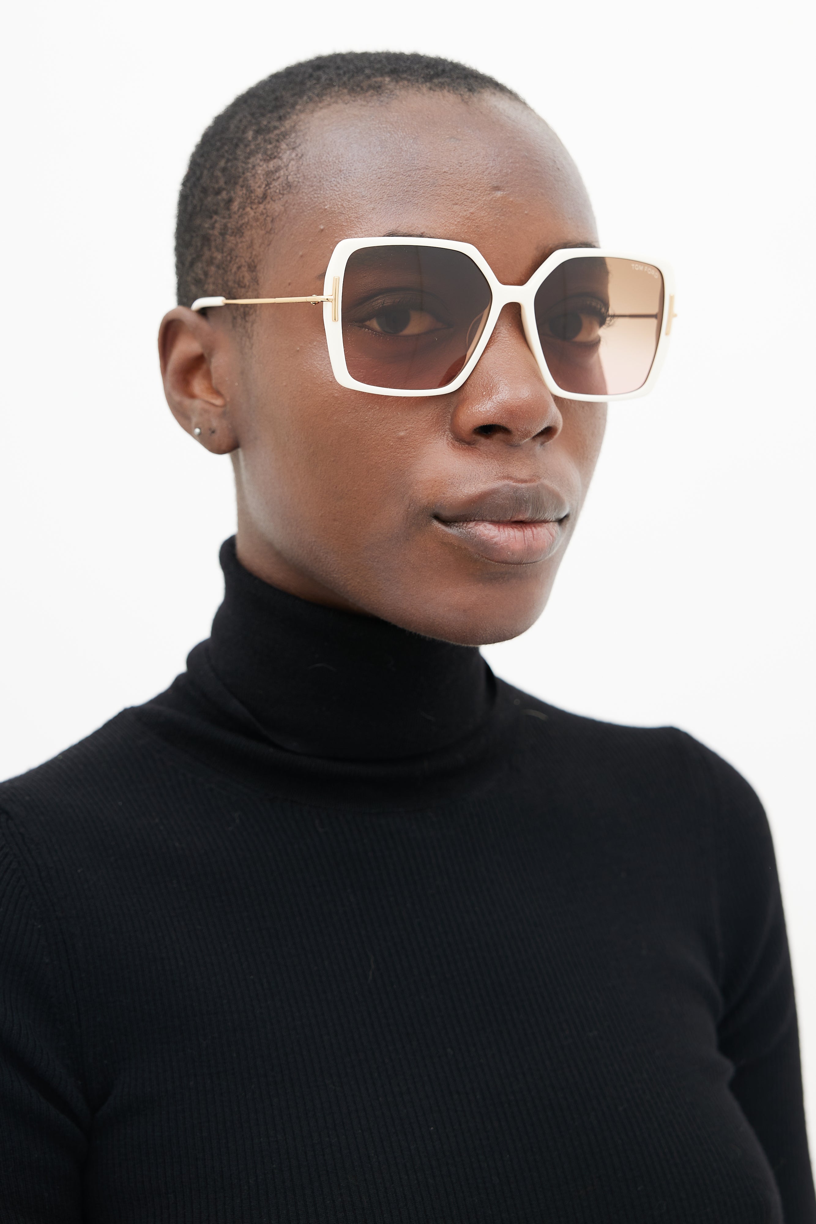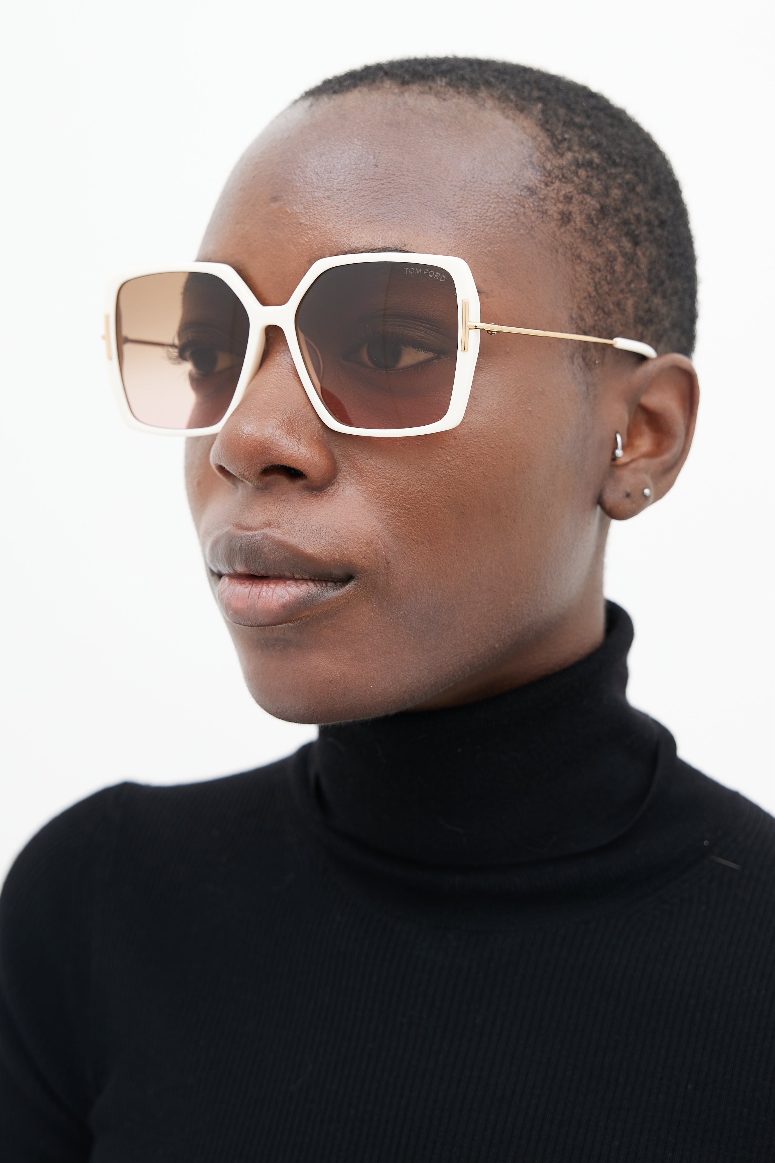 Pre-owned Tom Ford white Joanna sunglasses featuring a square frame, tinted lenses, nose pads, and gold tone arms with logo hardware. Comes with original case.