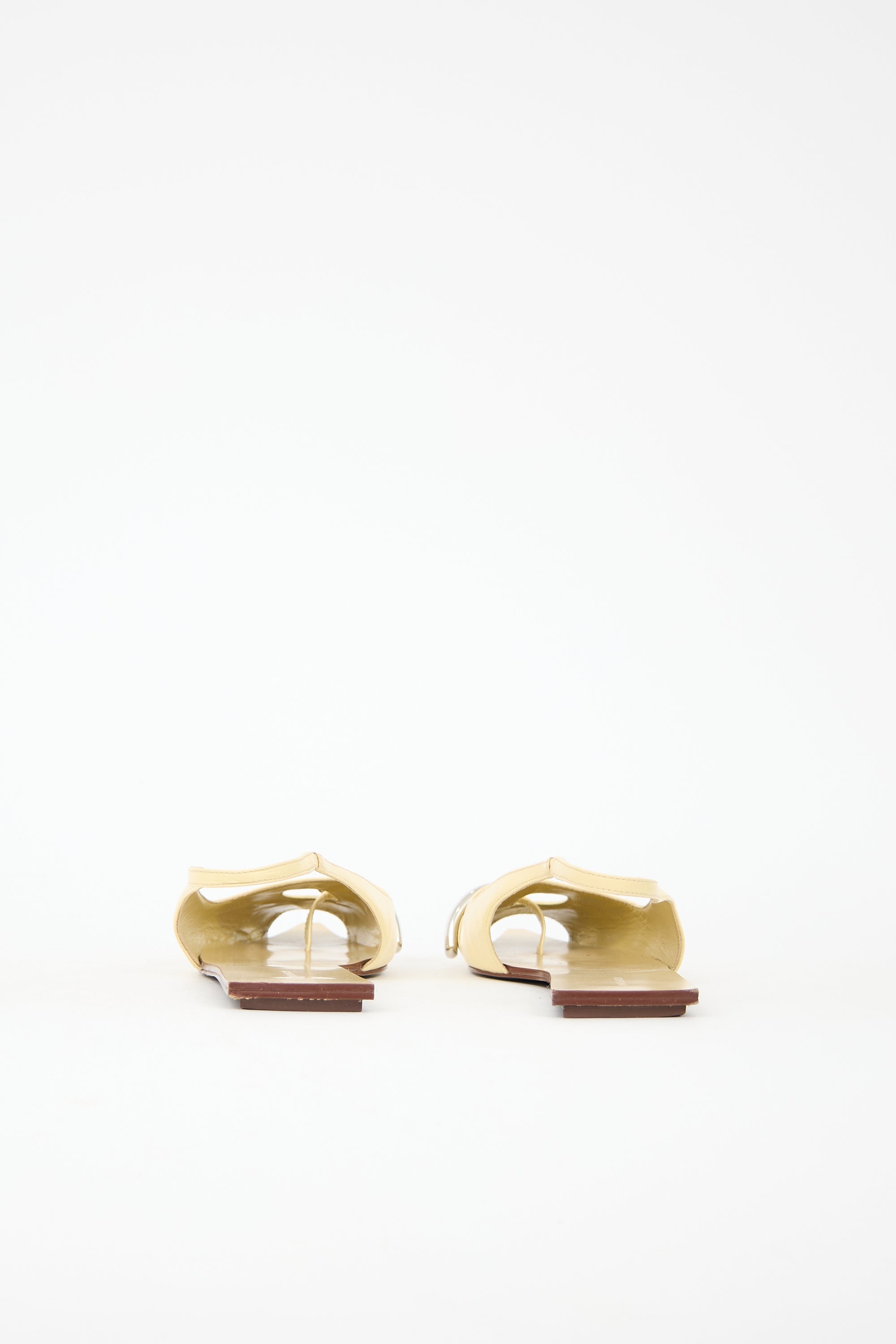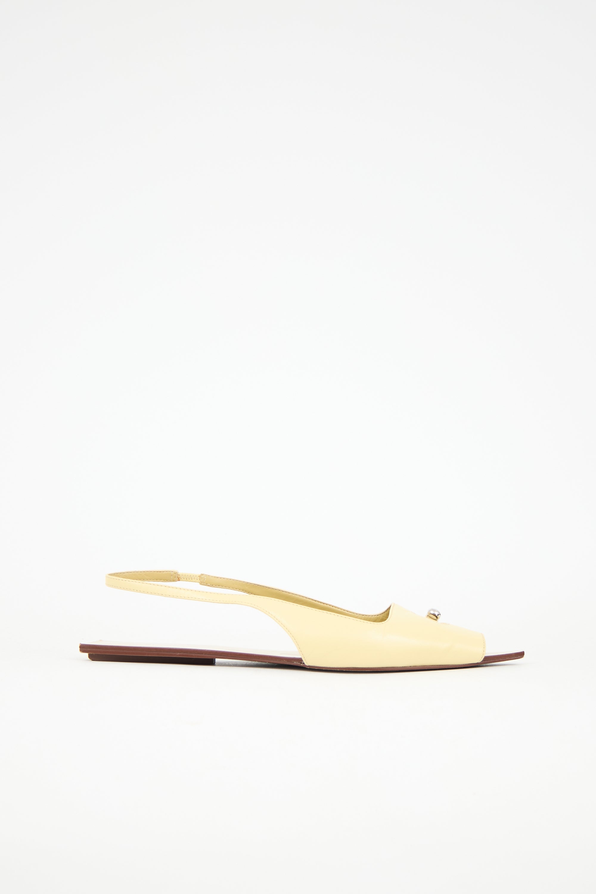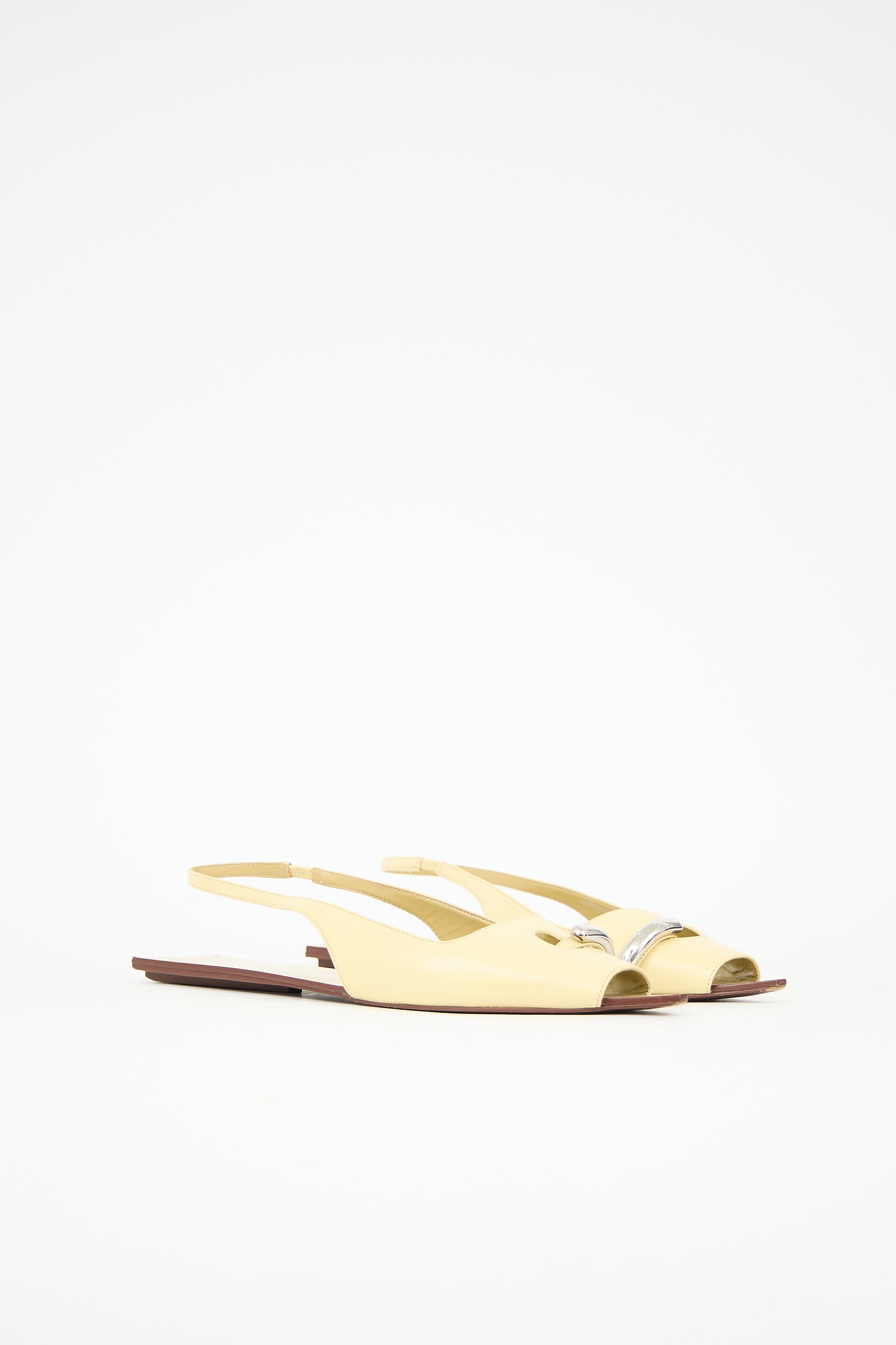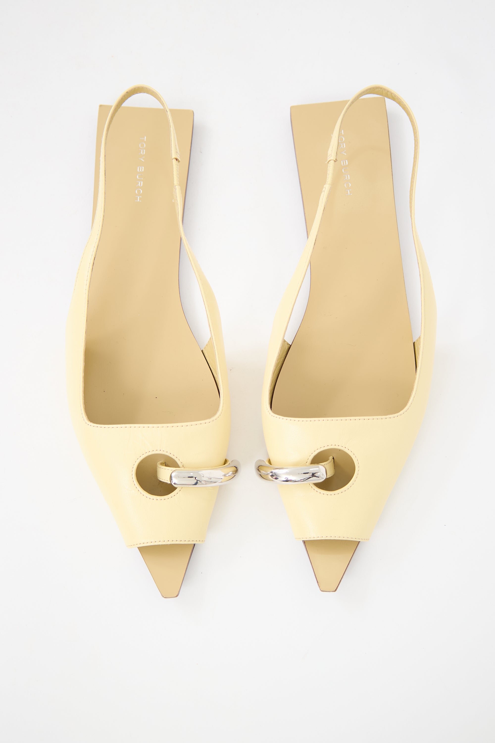 Pre-owned Tory Burch yellow leather Pierced mules featuring exaggerated pointed toe, toe loop with silver tone ring, flat wooden sole, and slingback strap.