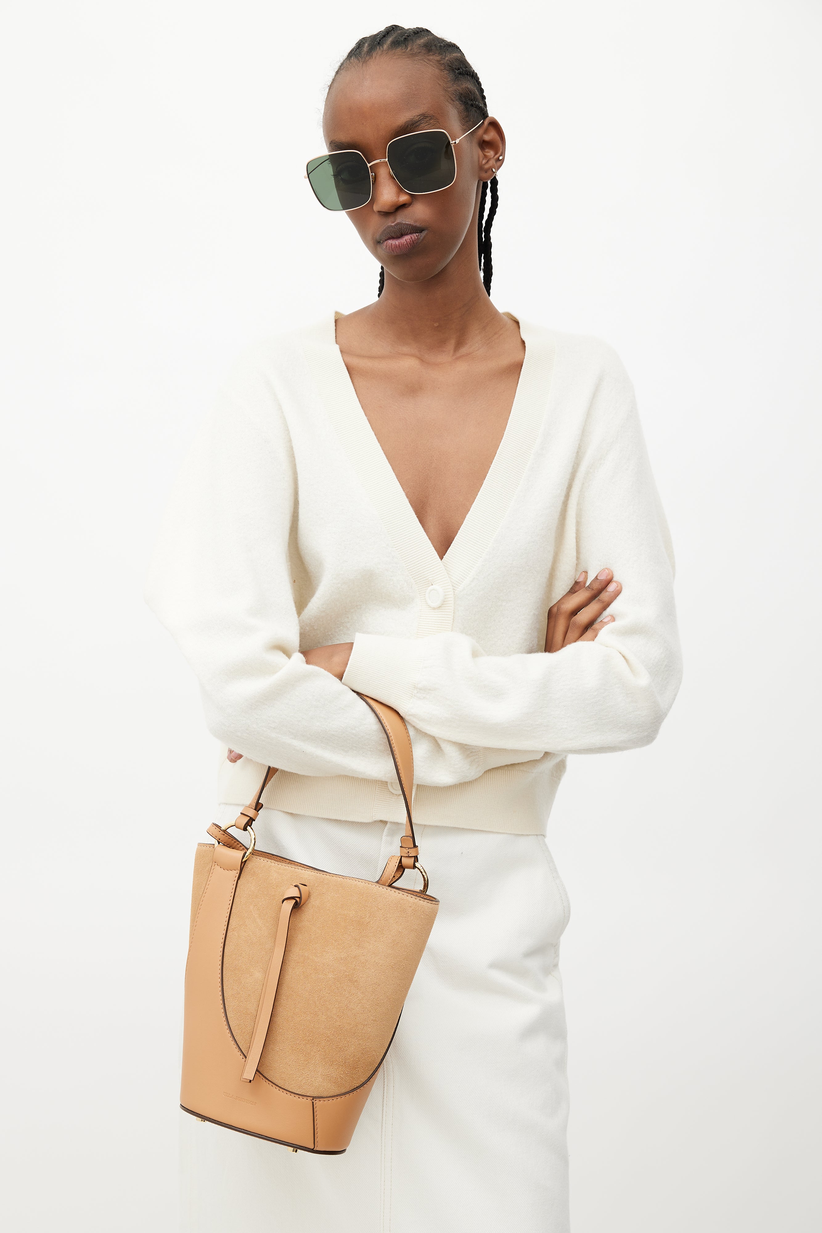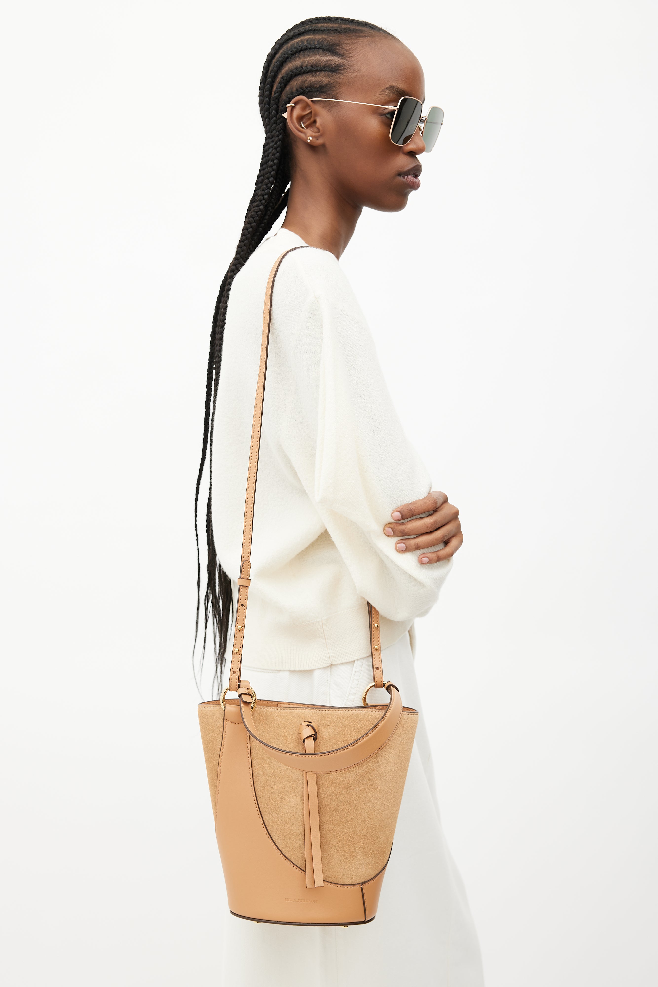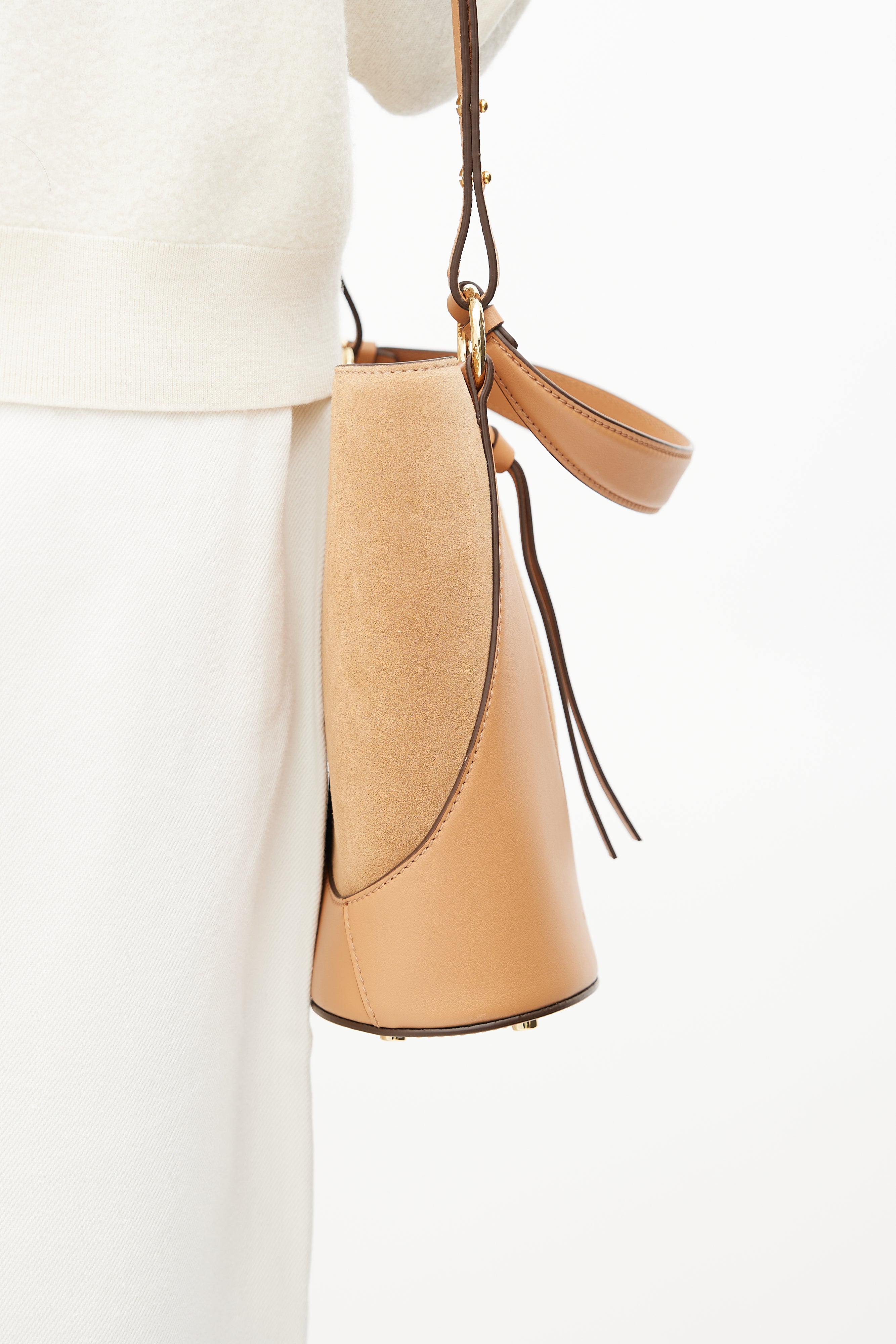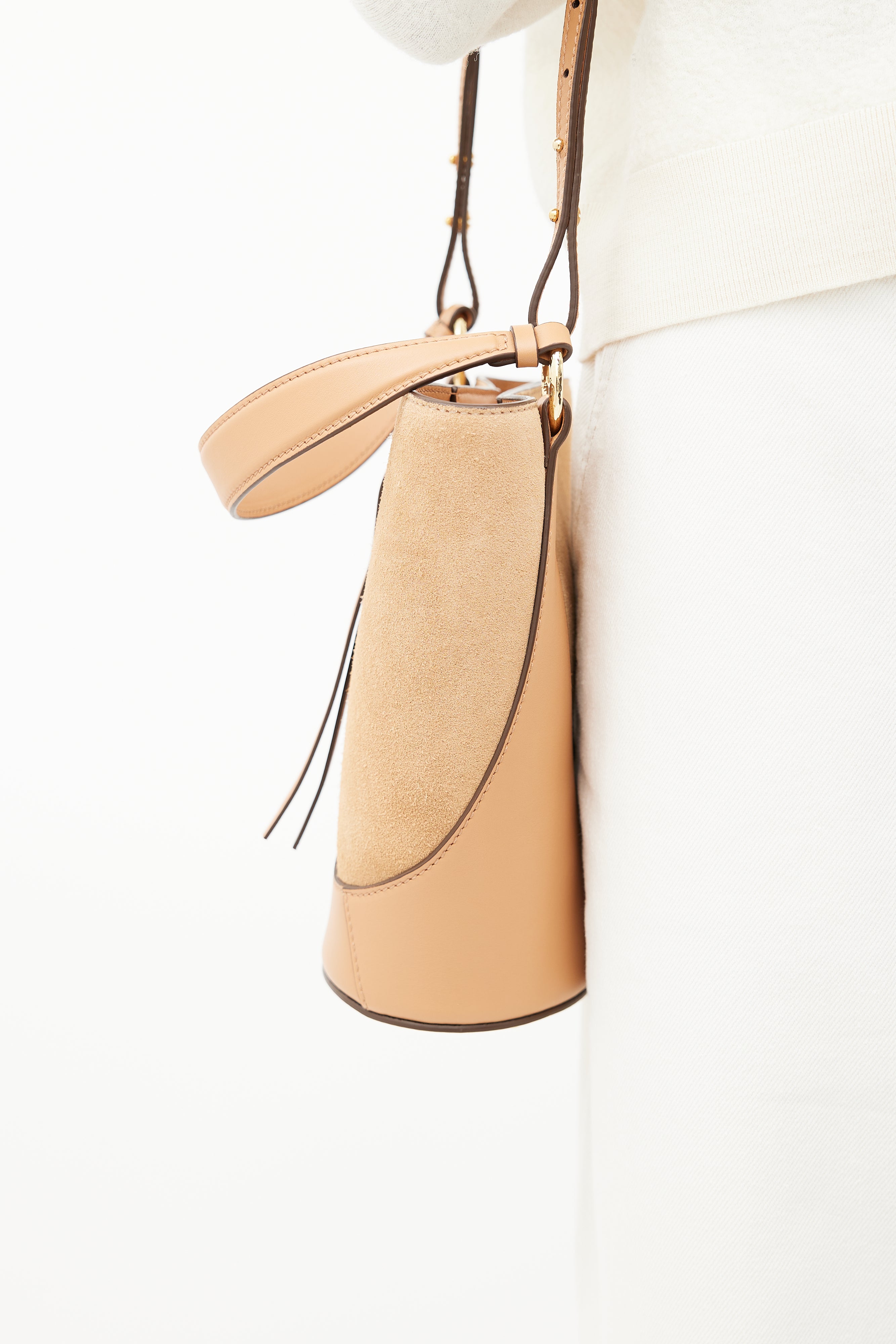 Ulla Johnson brown Esme bucket bag featuring embossed logo at face, mixed leather and suede outer, gold tone hardware, fixed top handle, adjustable shoulder strap, snap button closure, open compartment, lined main compartment, and interior card slot. Comes with original dust bag.