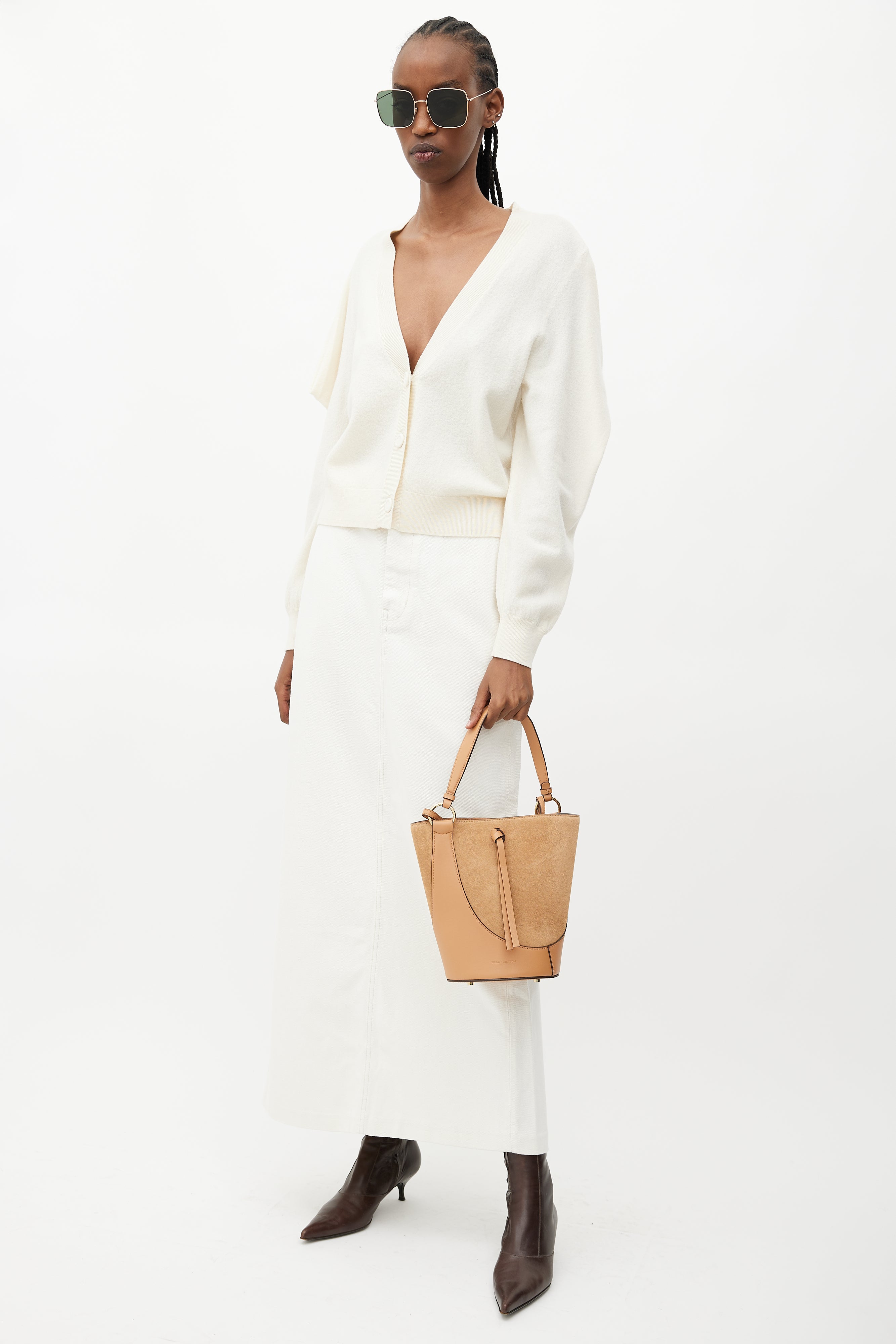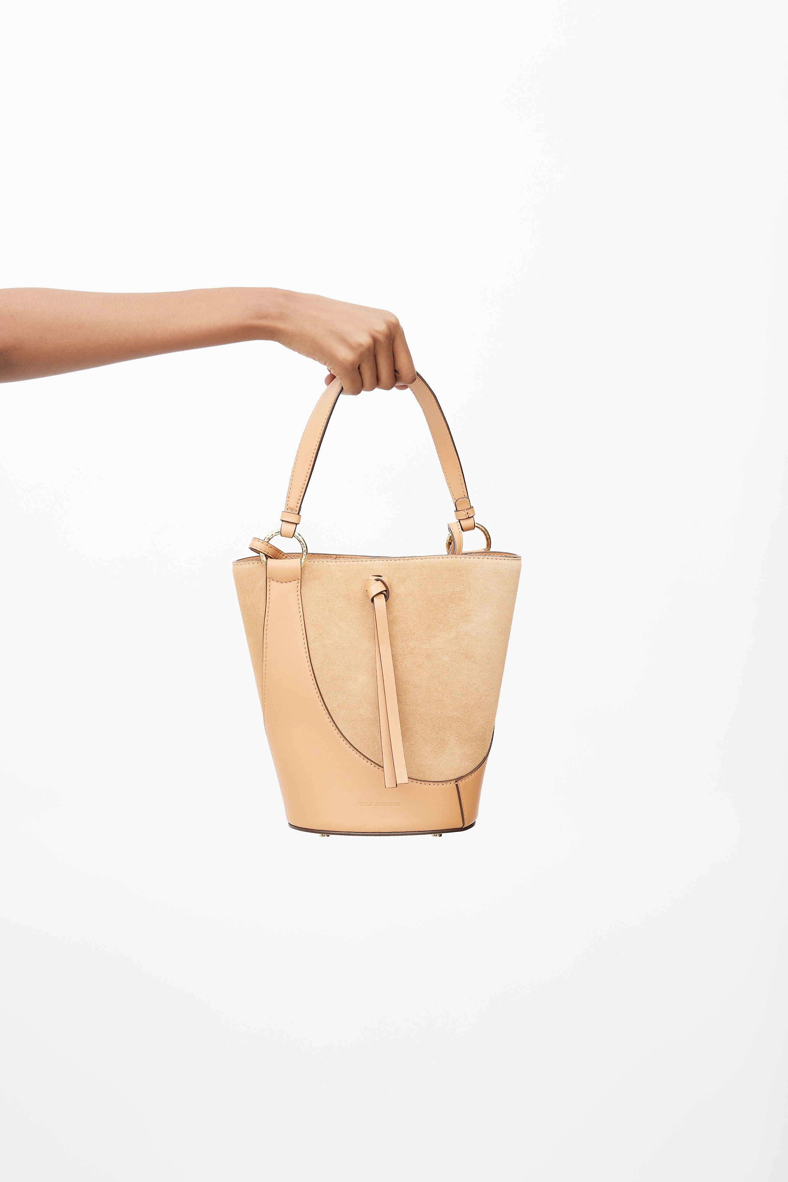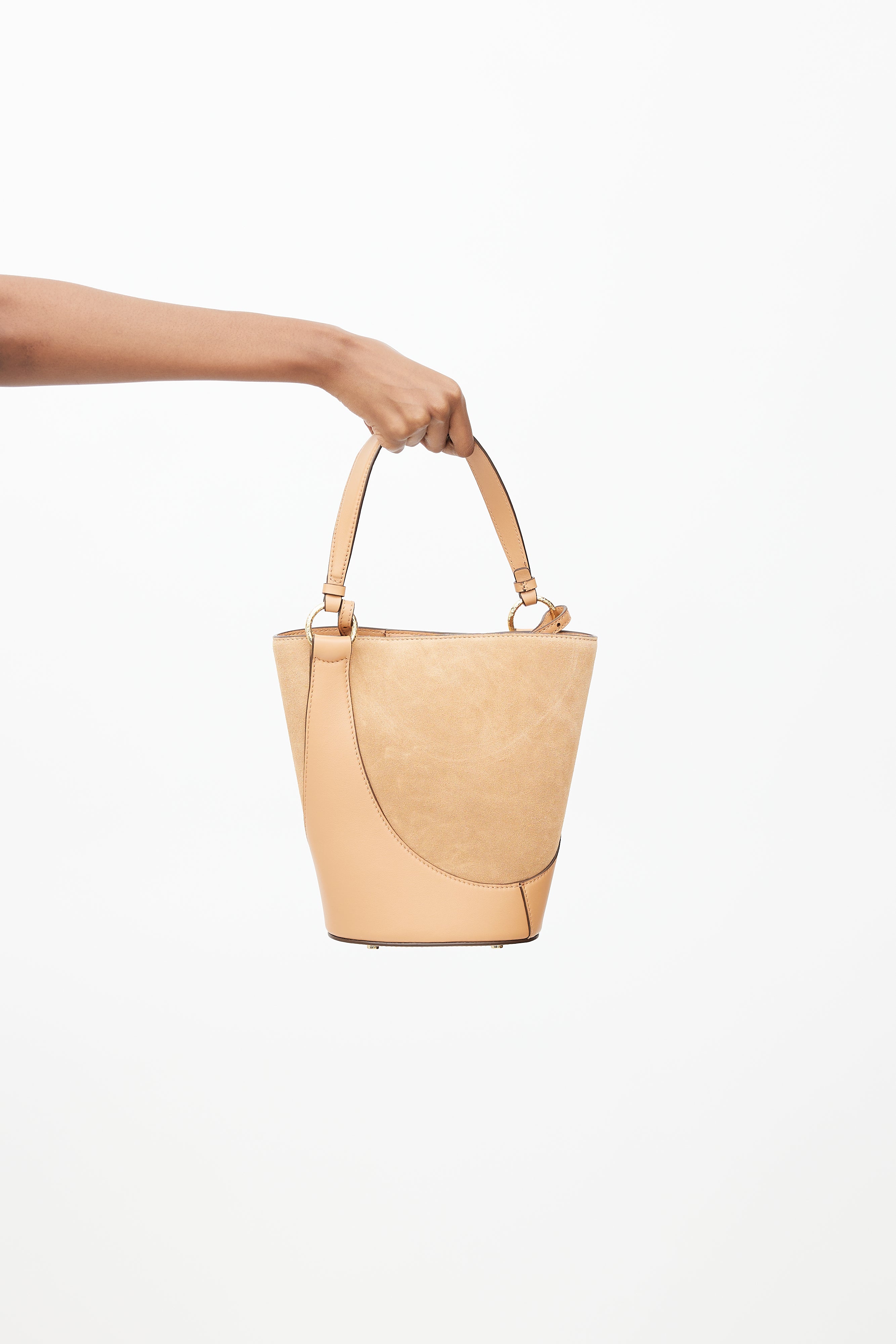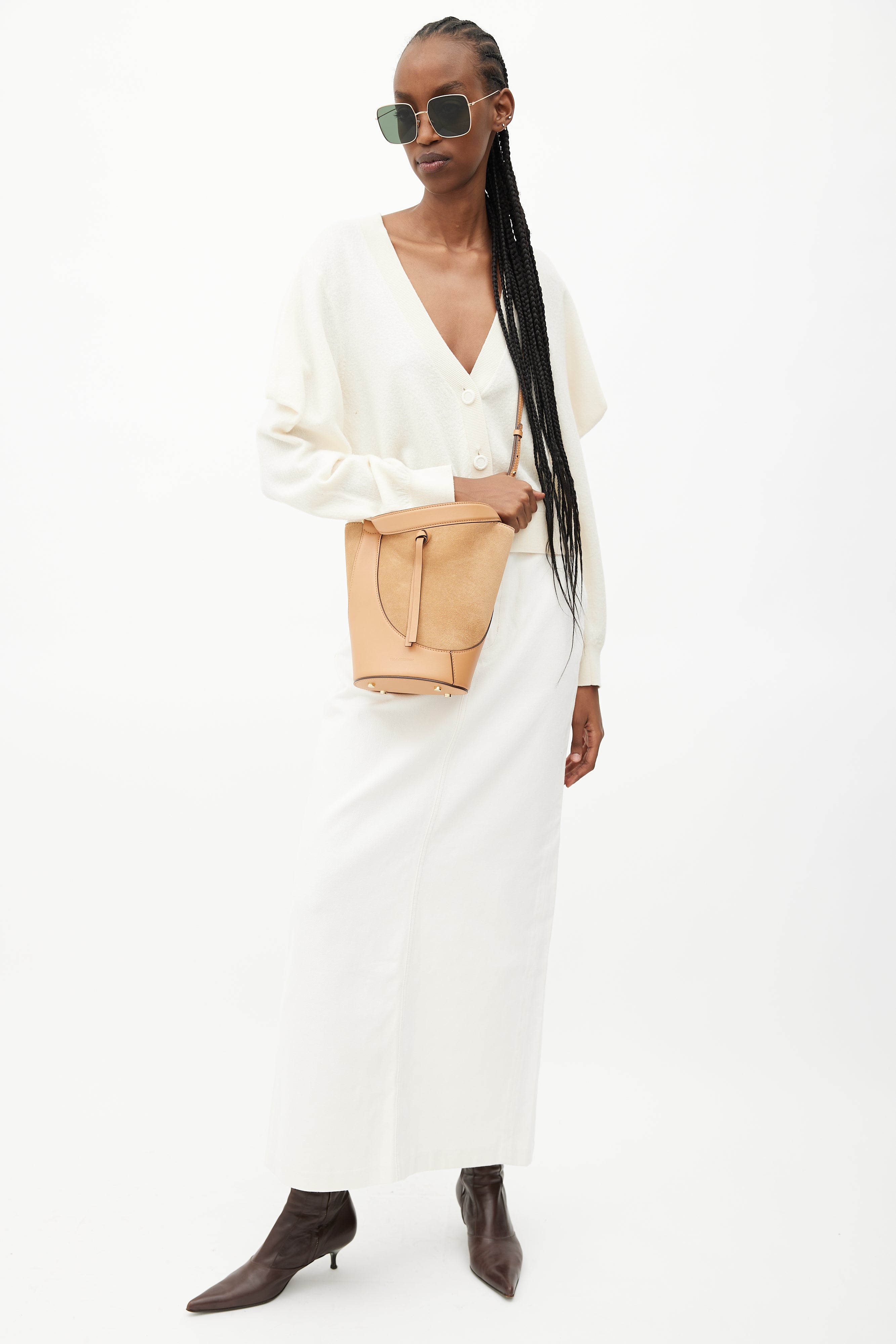 Ulla Johnson brown Esme bucket bag featuring embossed logo at face, mixed leather and suede outer, gold tone hardware, fixed top handle, adjustable shoulder strap, snap button closure, open compartment, lined main compartment, and interior card slot. Comes with original dust bag.