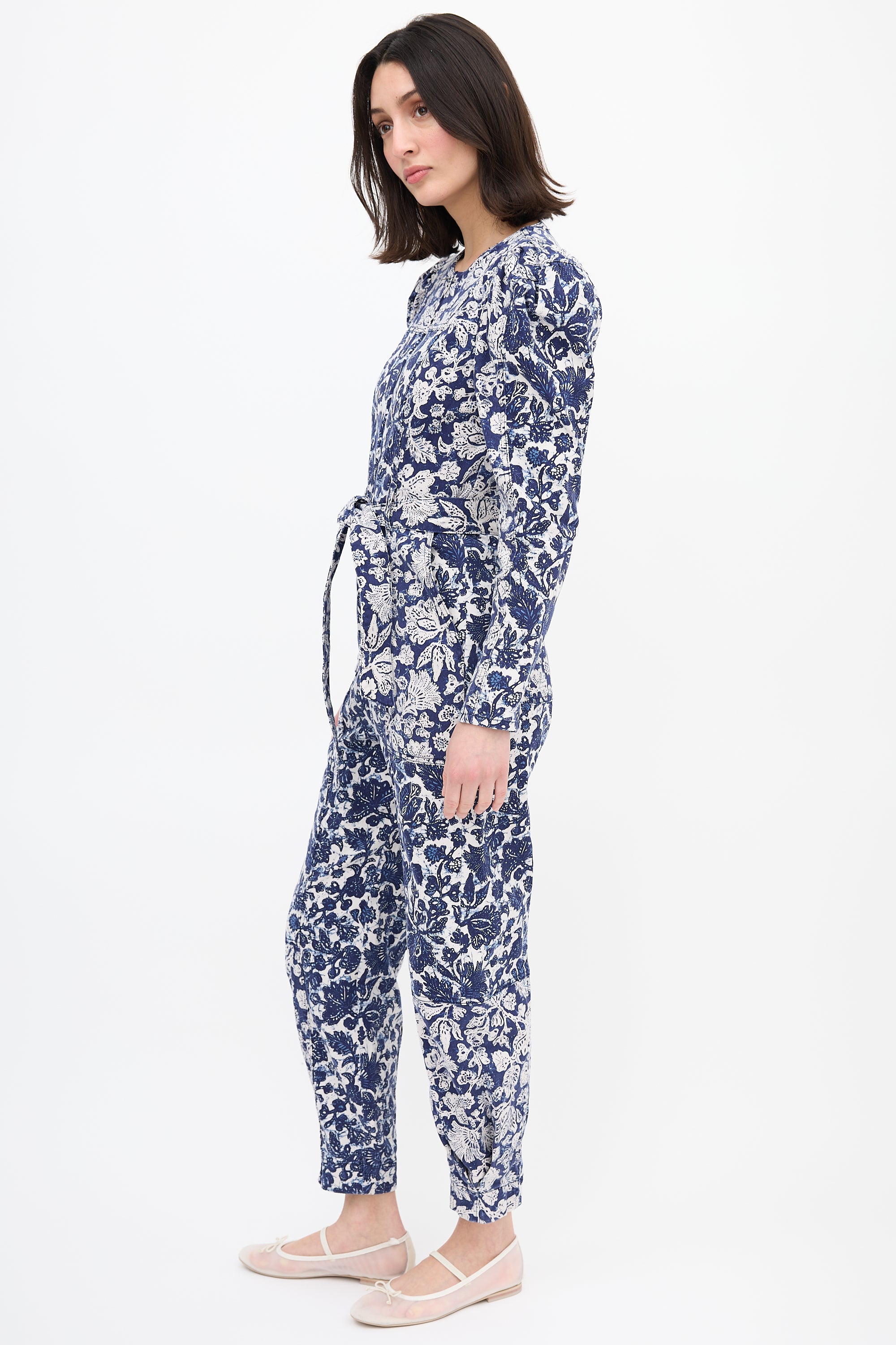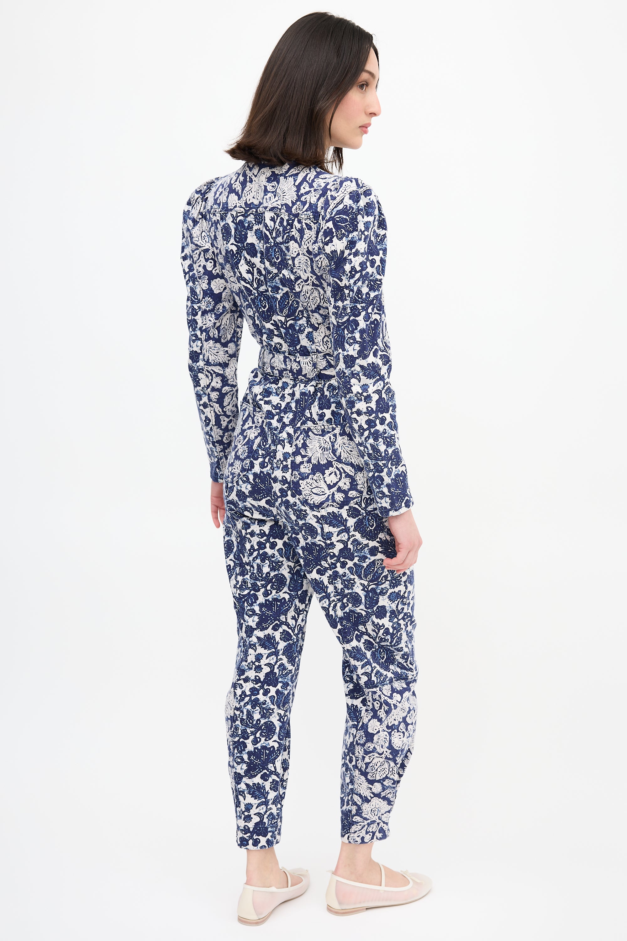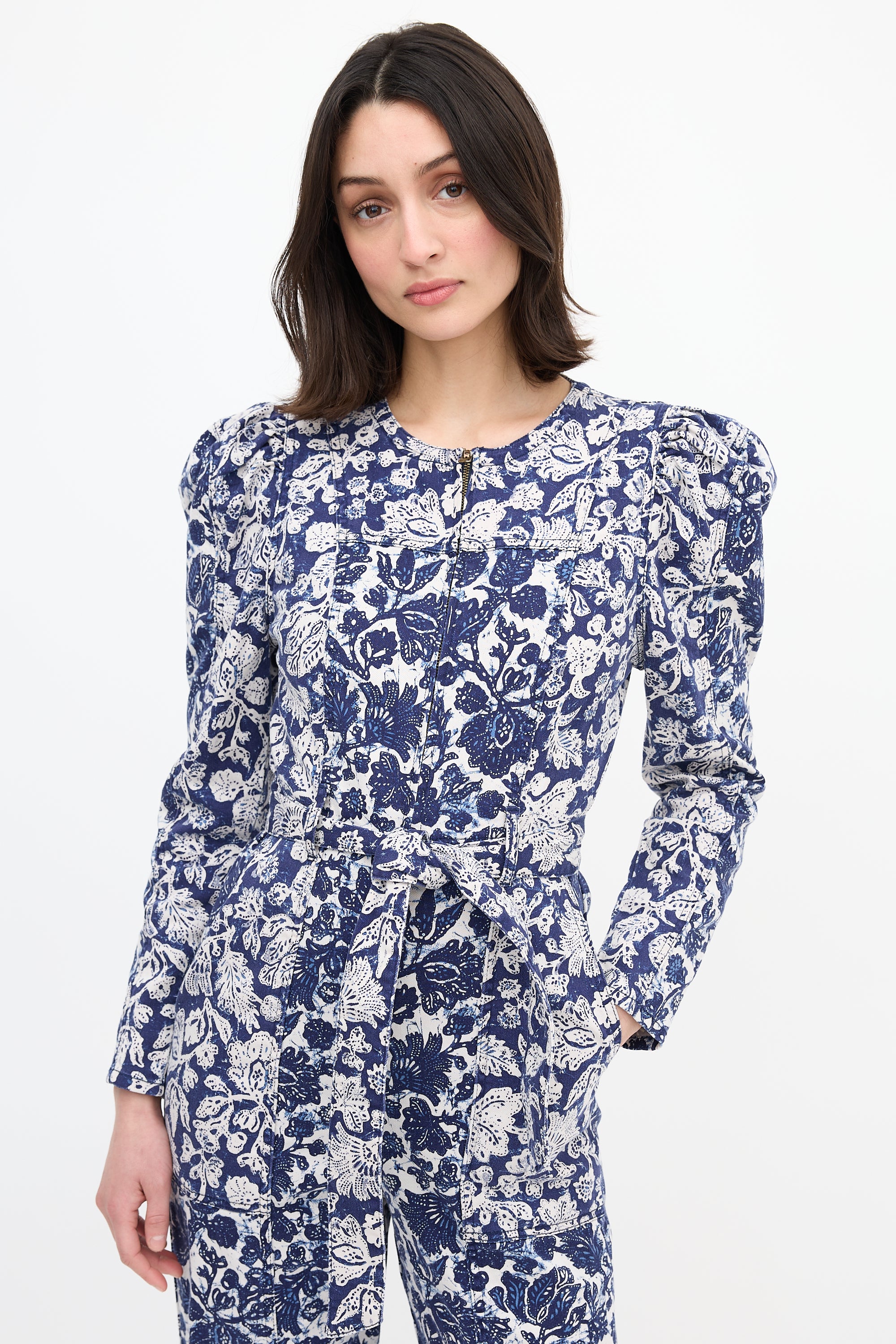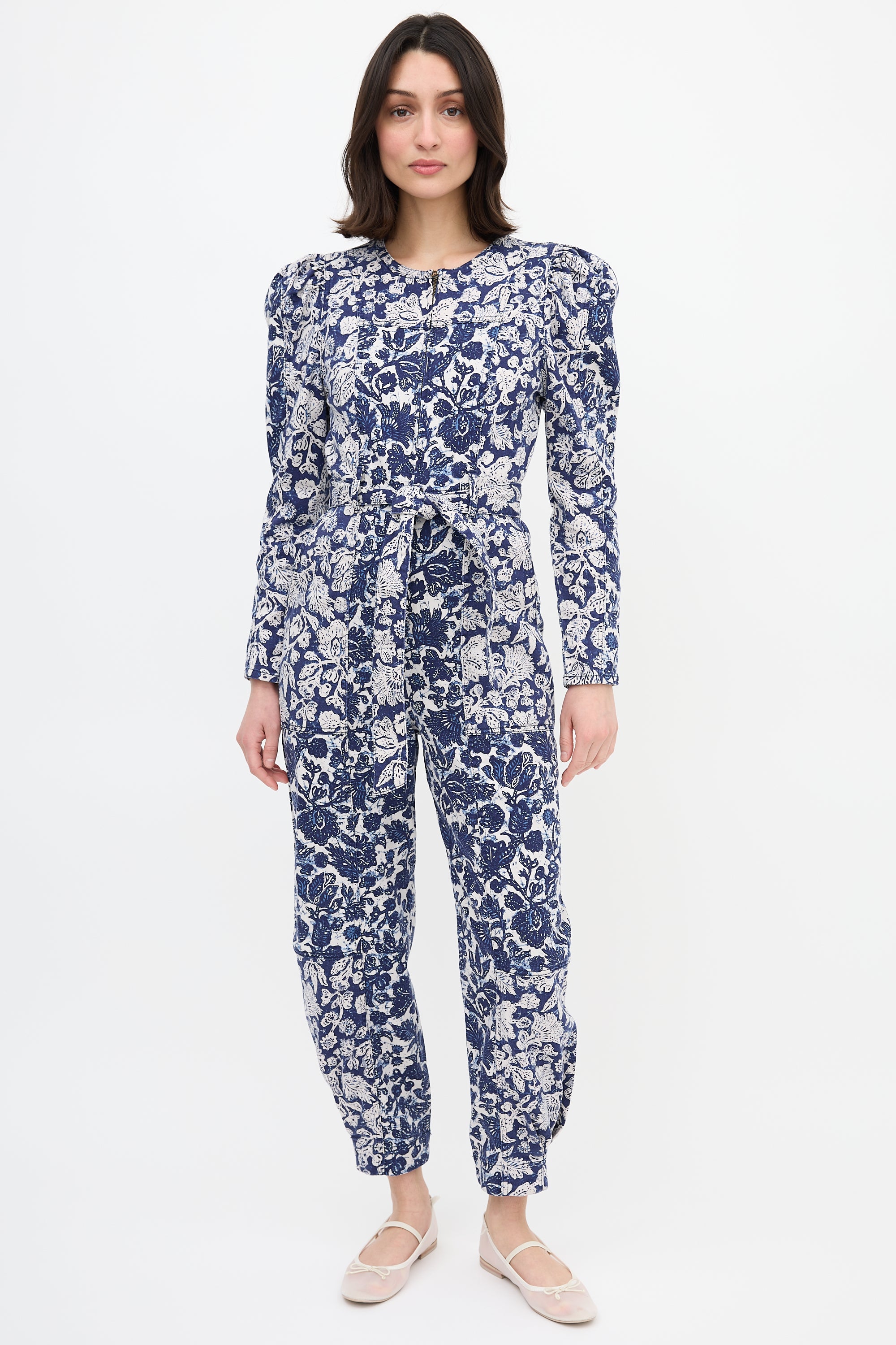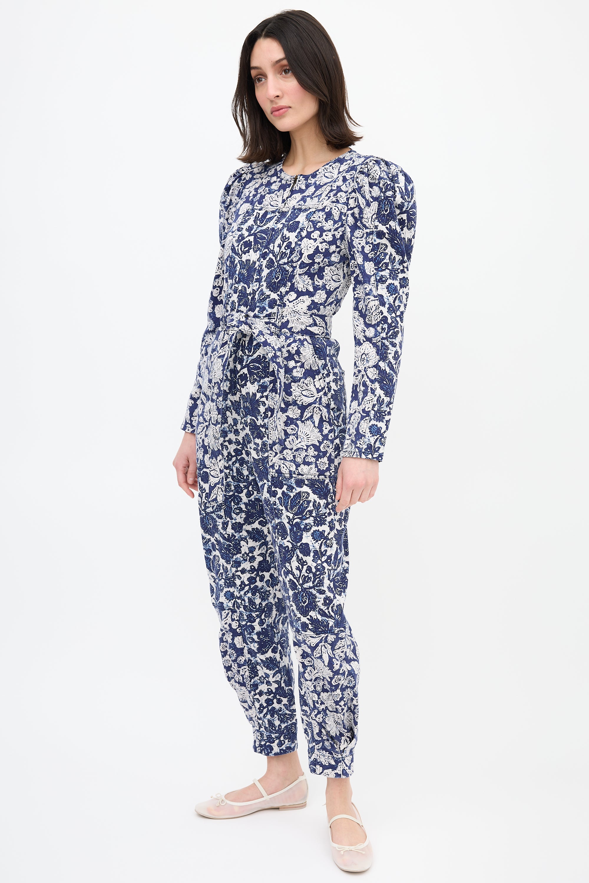 Pre-owned Ulla Johnson navy and white denim Hesper jumpsuit featuring floral print, round neckline, zip front, dropped seat, tapered leg with tucks at hem, four pocket styling, waist belt, and puff sleeves.