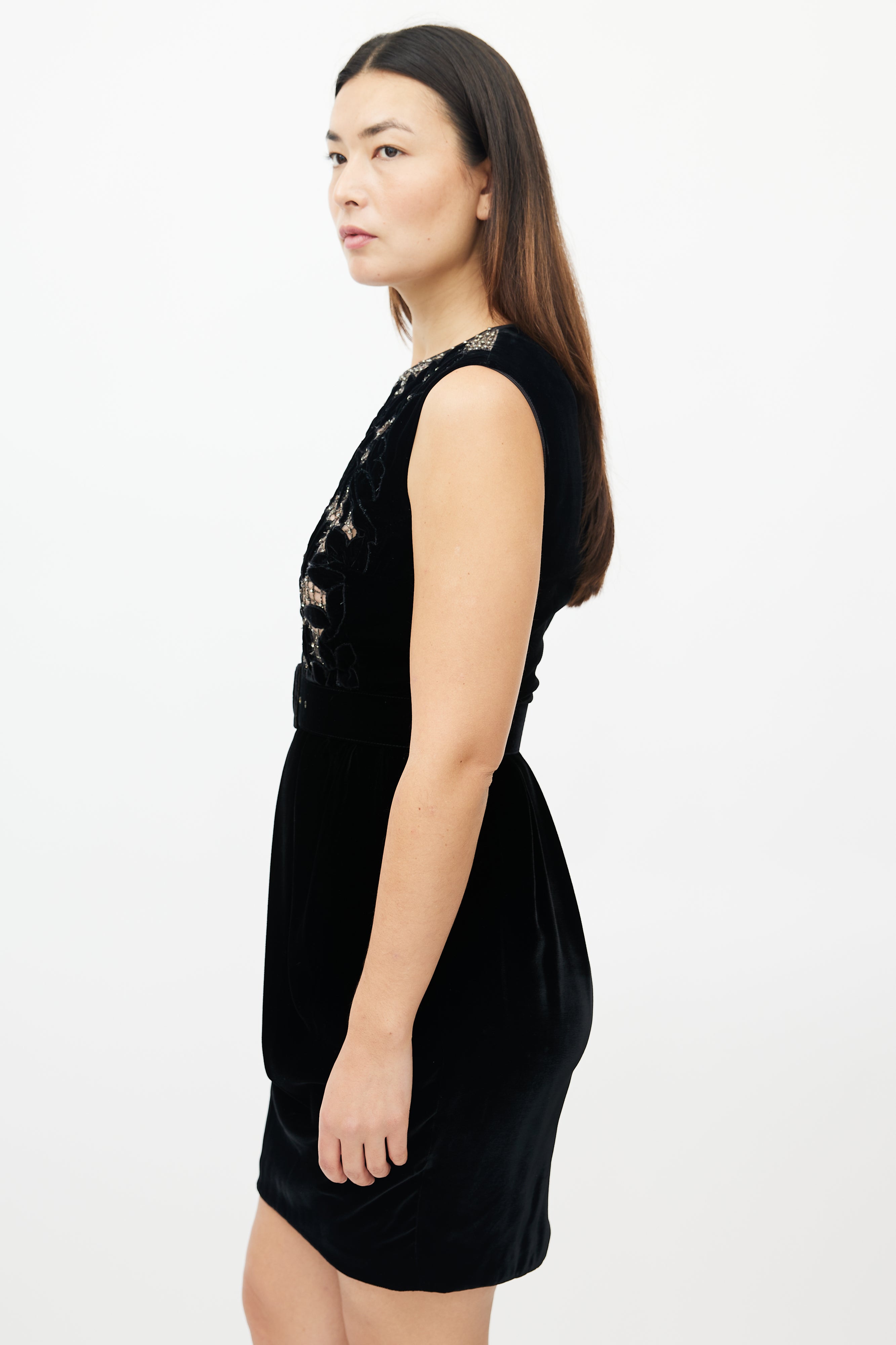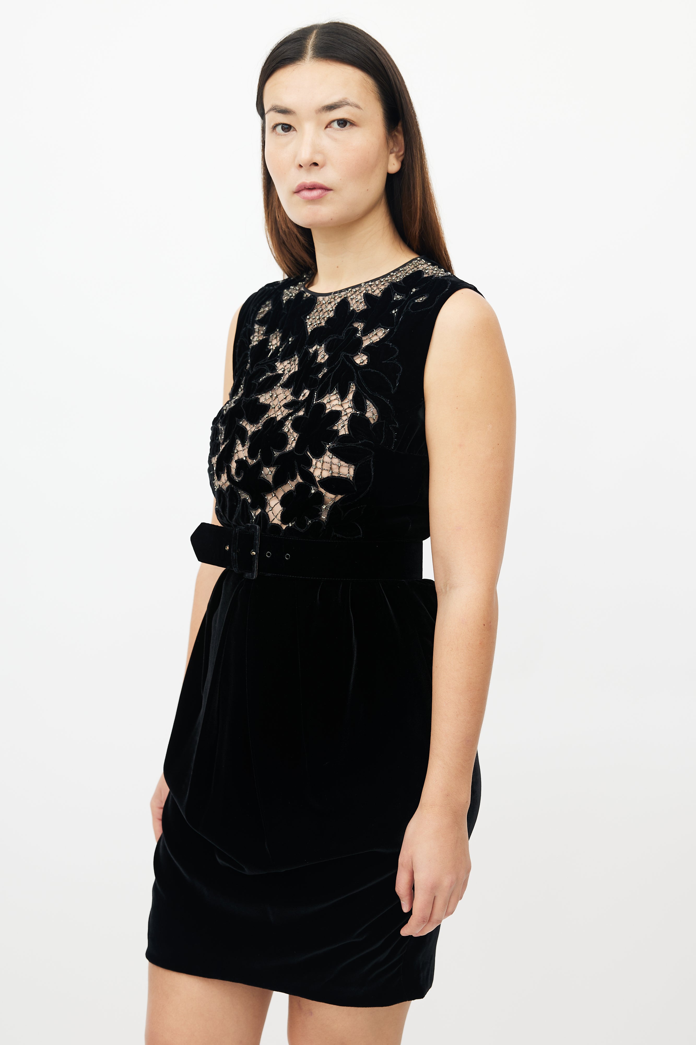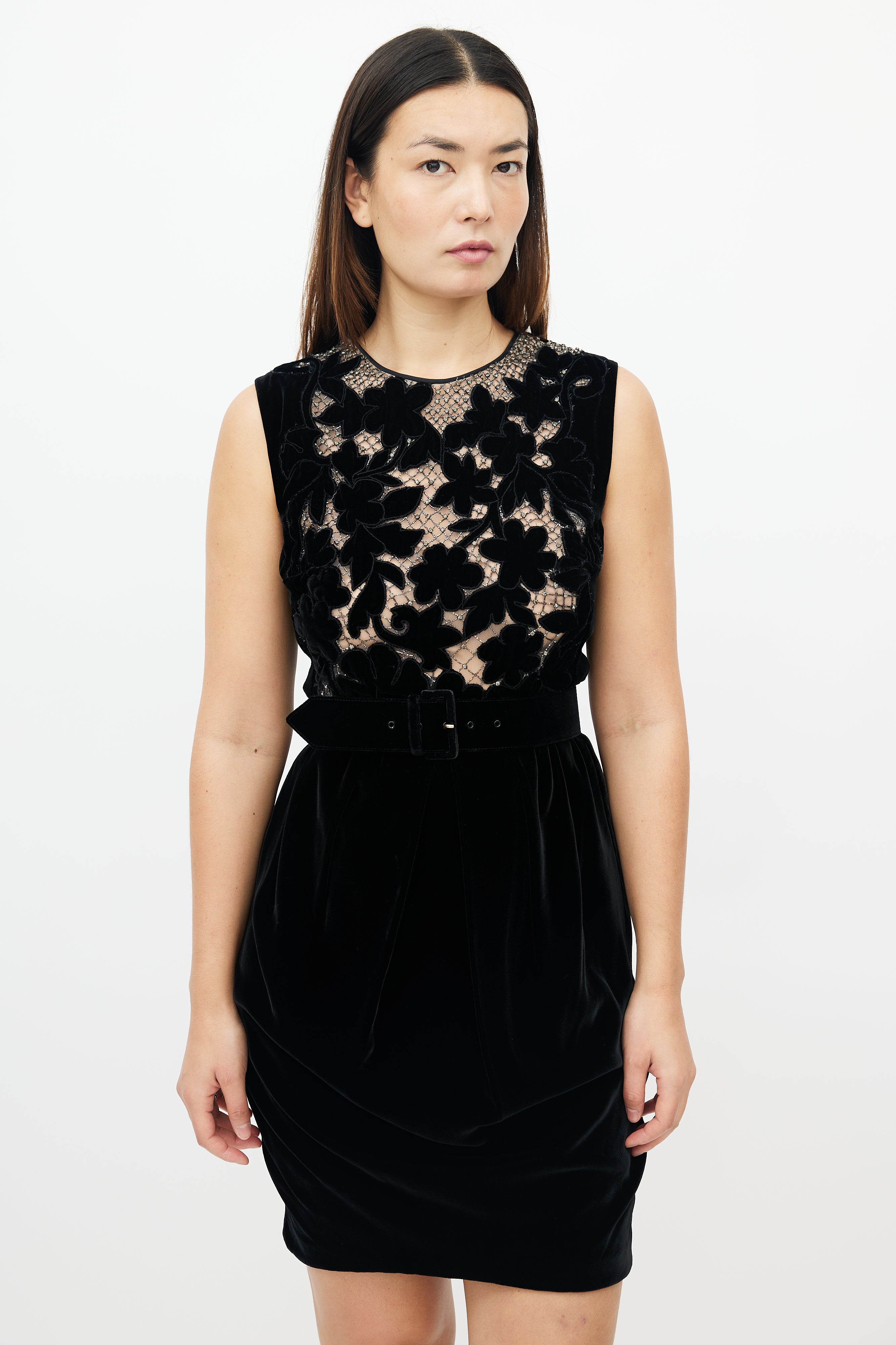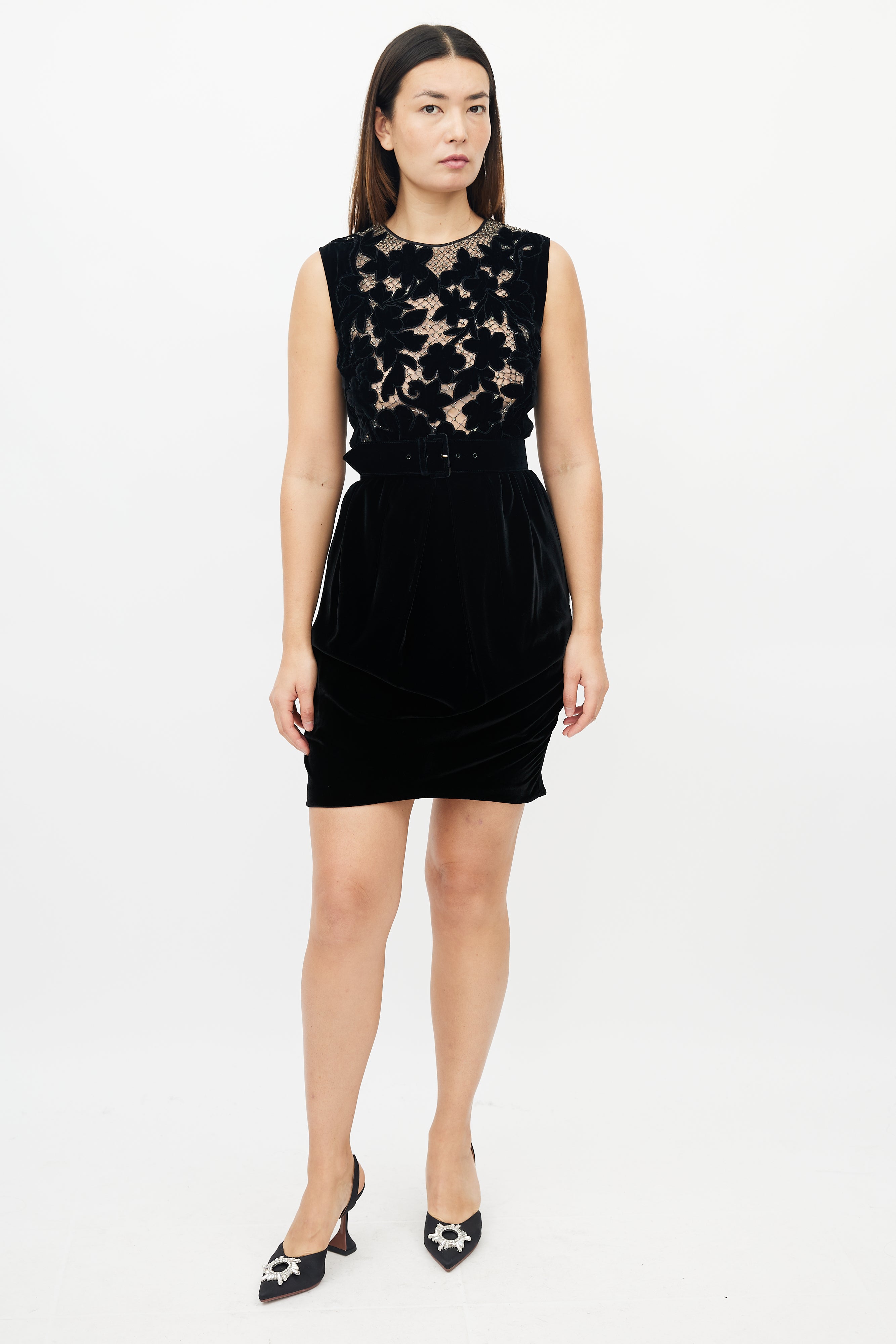 Pre-owned Valentino black knee length dress featuring mesh with beaded embellishments and velvet cut outs at chest, removable tonal belt, concealed zip at back and vent at back.