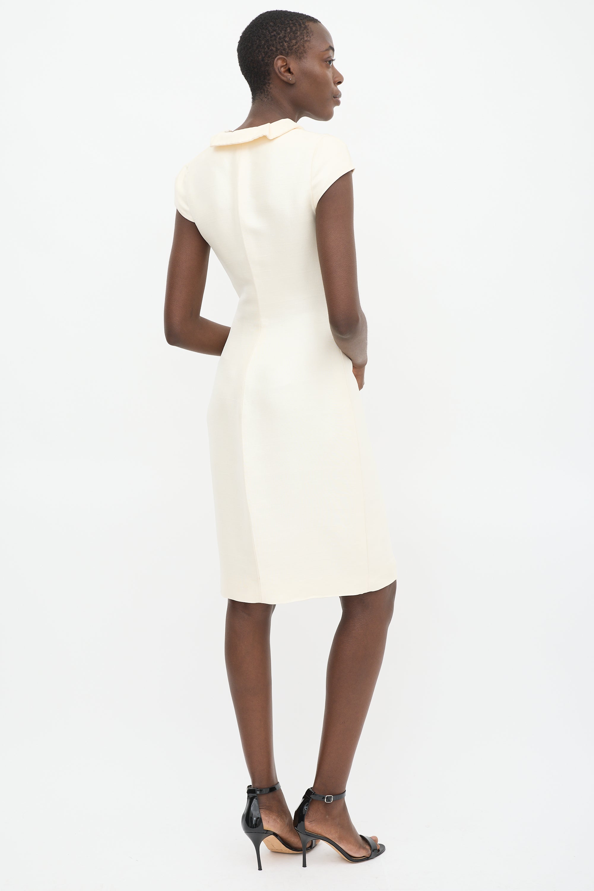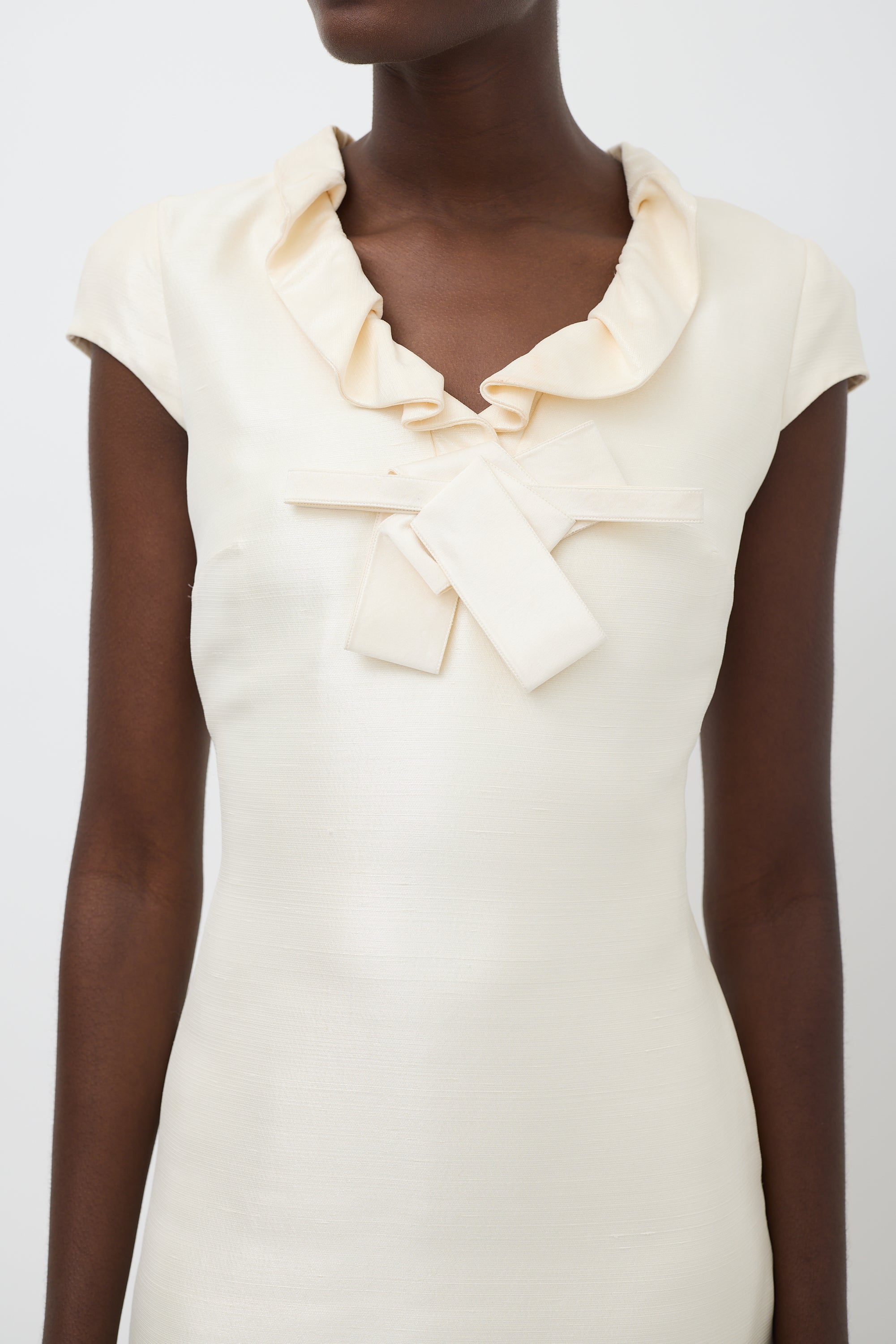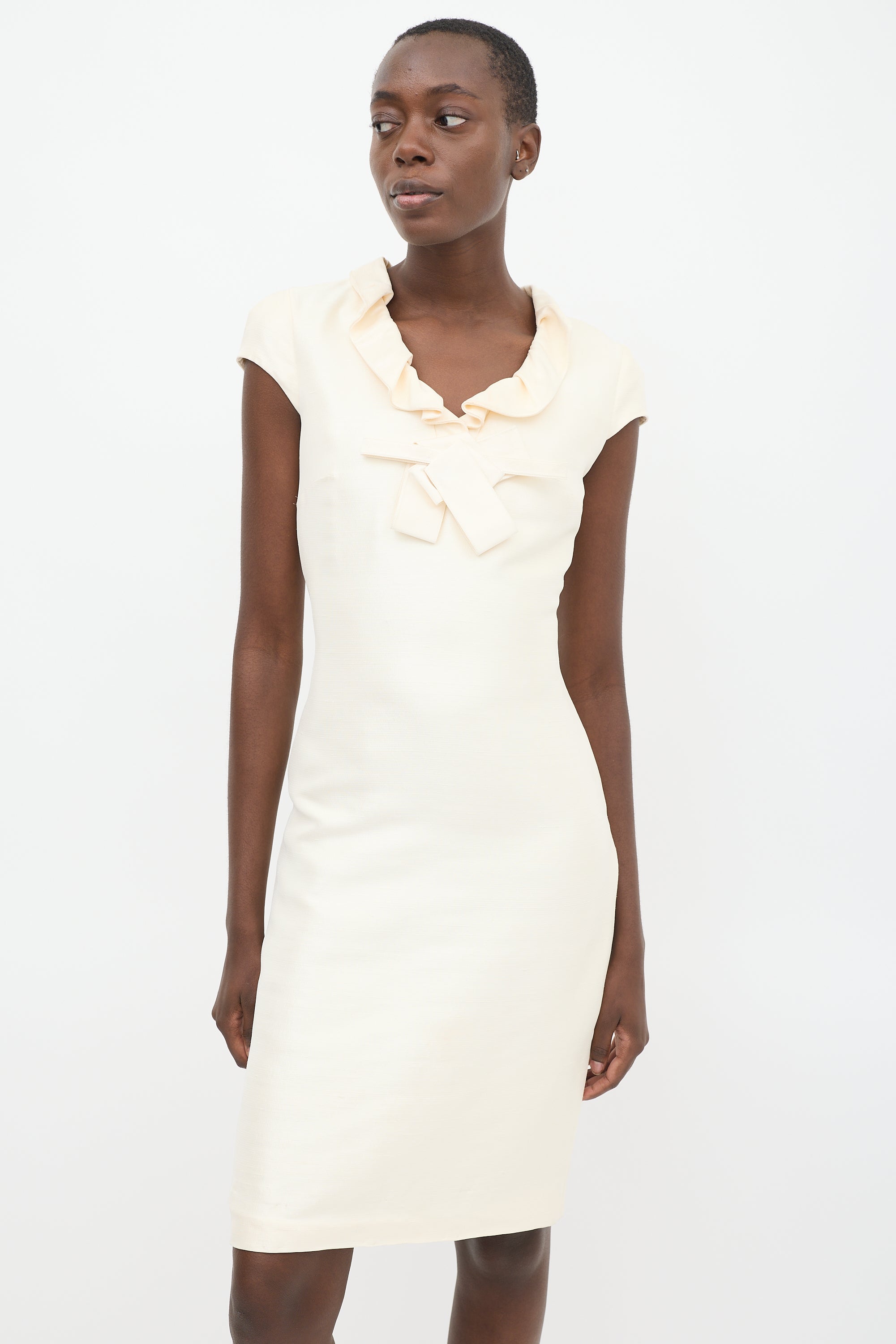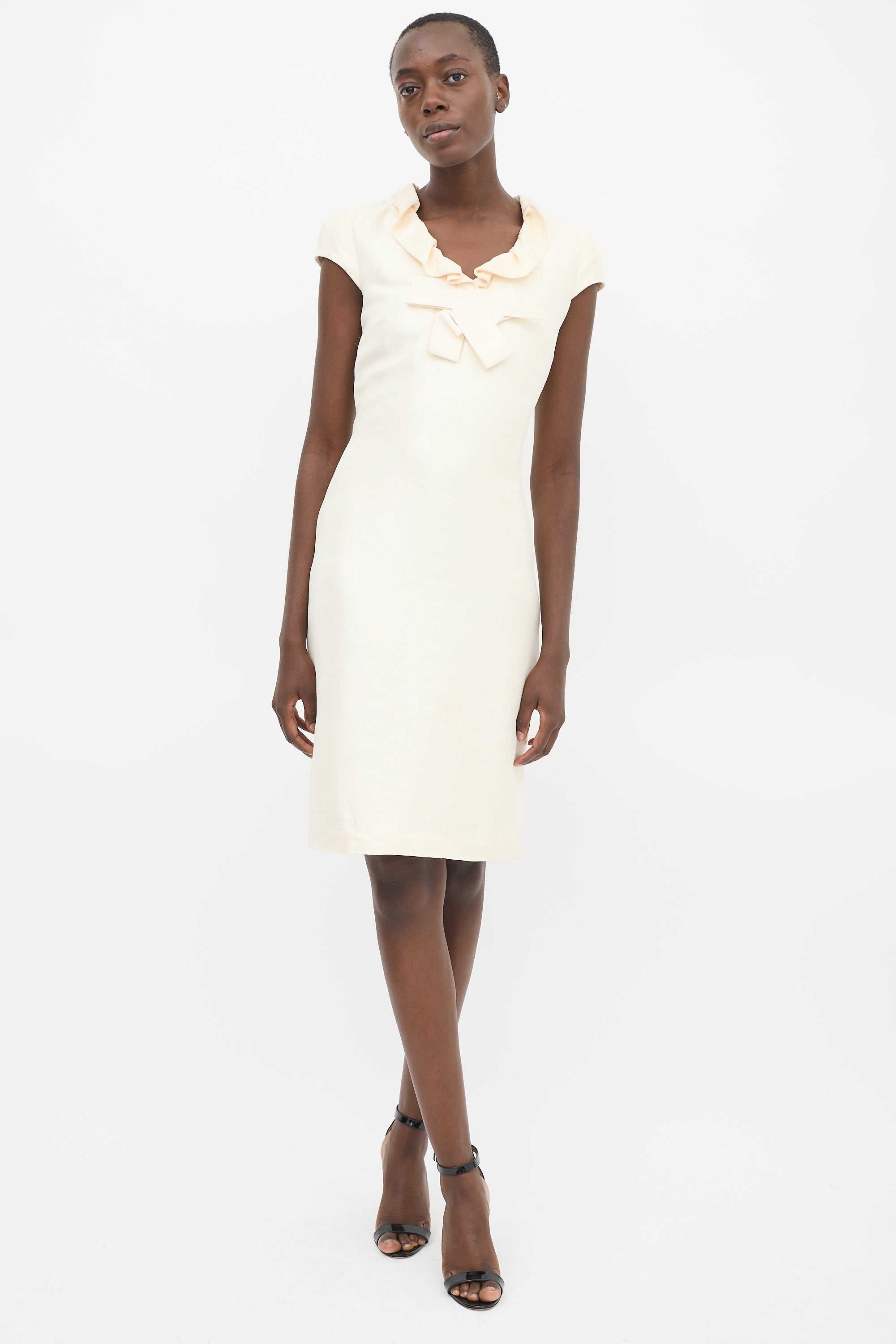 Pre-owned Valentino cream silk blend midi sheath dress featuring a V-neckline with ruffled collar and bow detail at centre front, cap sleeves, and concealed side zip. Lined. Clipped to fit model.