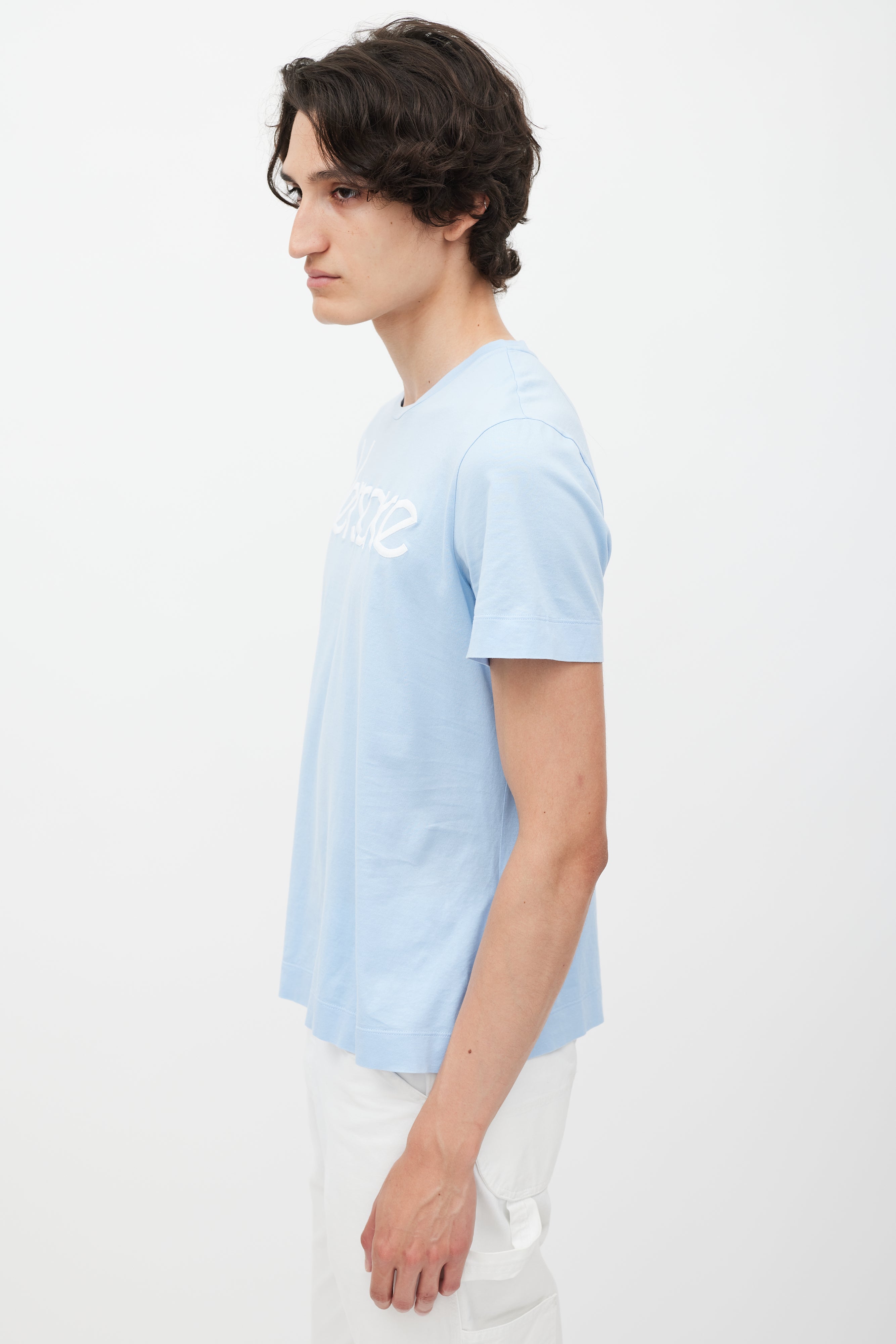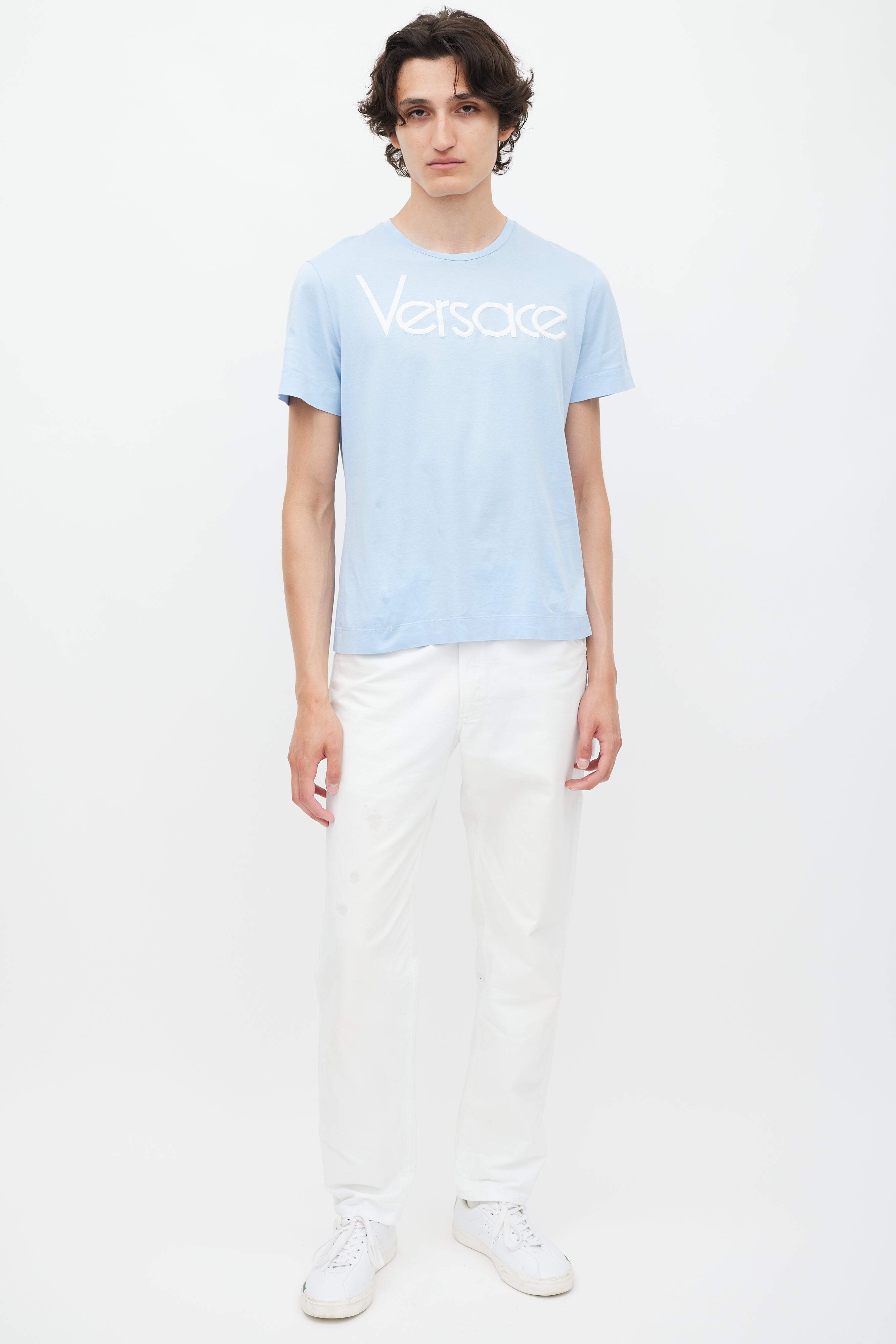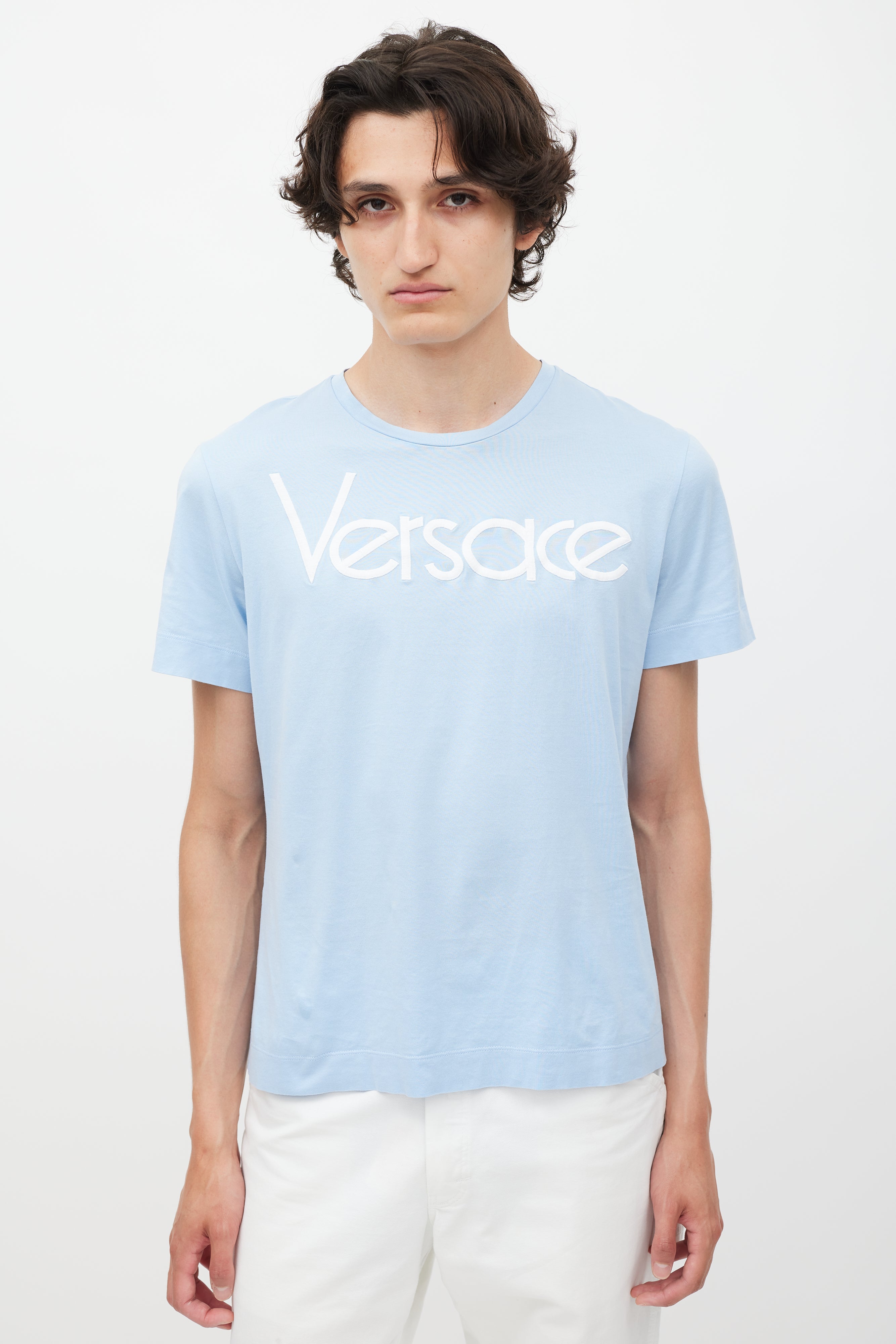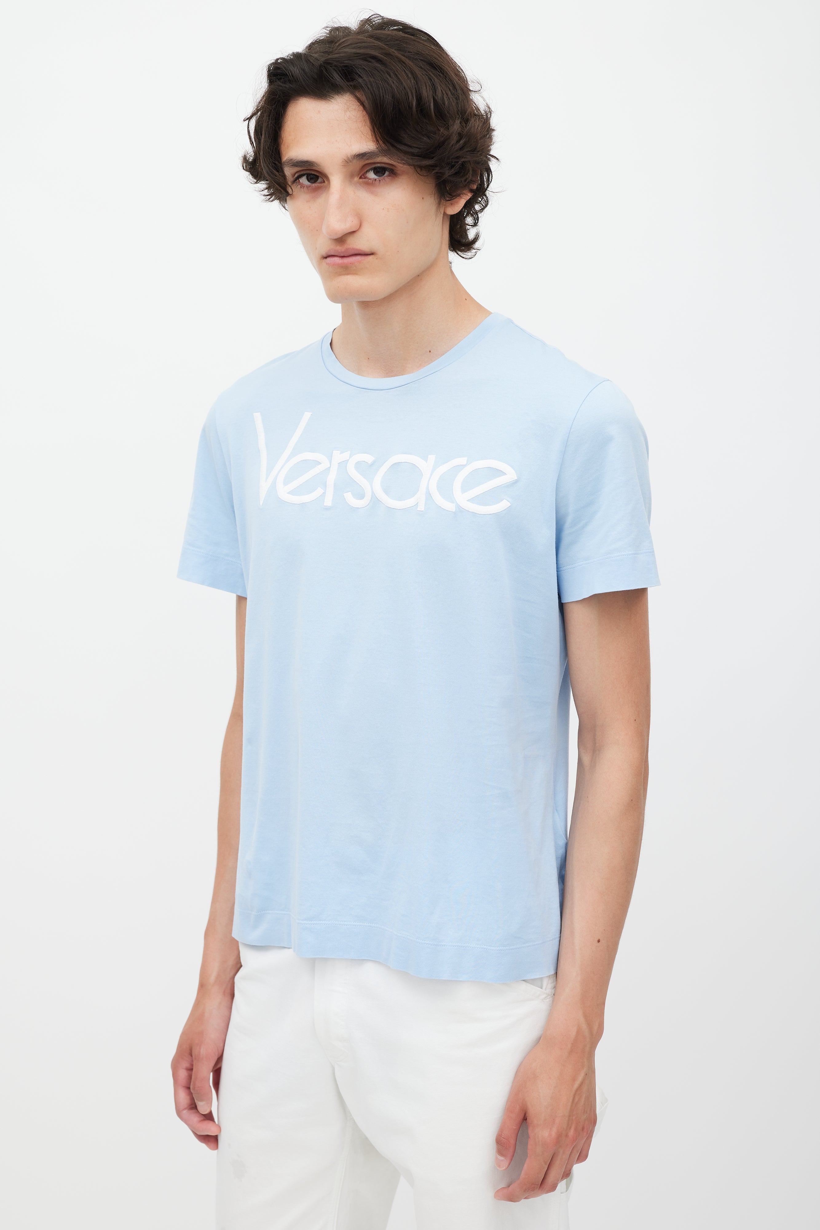 Pre-owned Versace blue T-shirt featuring a white embroidered logo at chest, round neckline, and short sleeves.