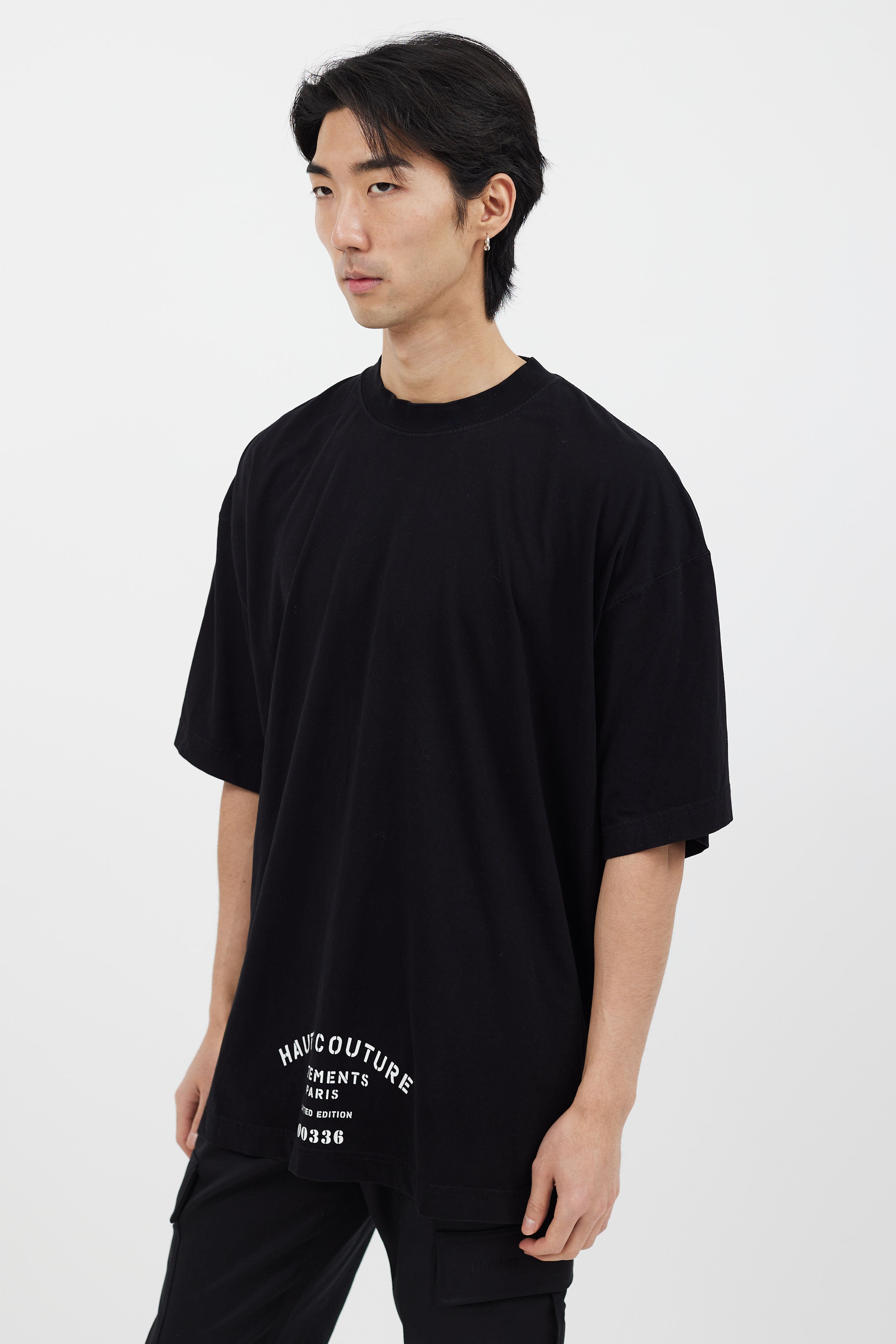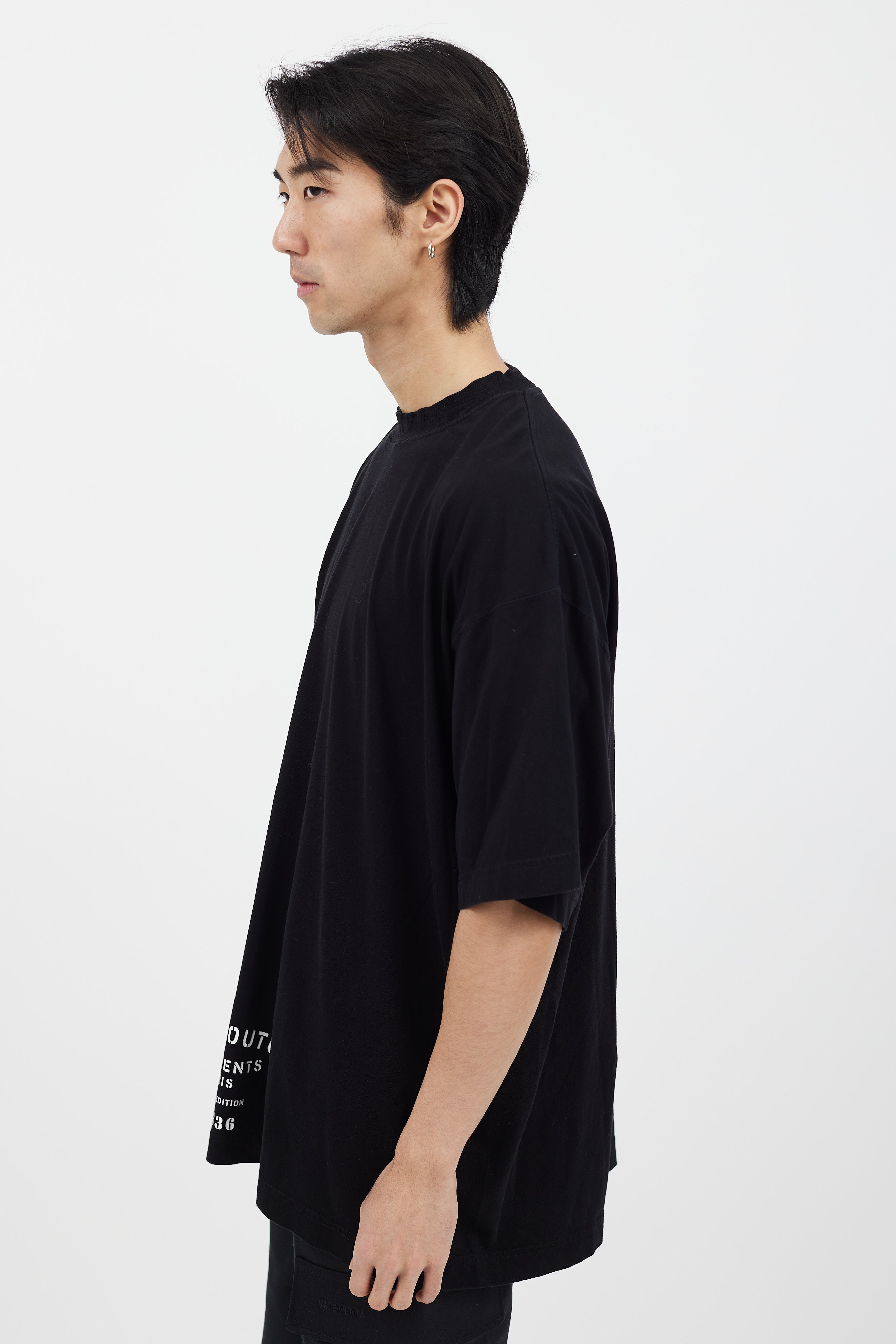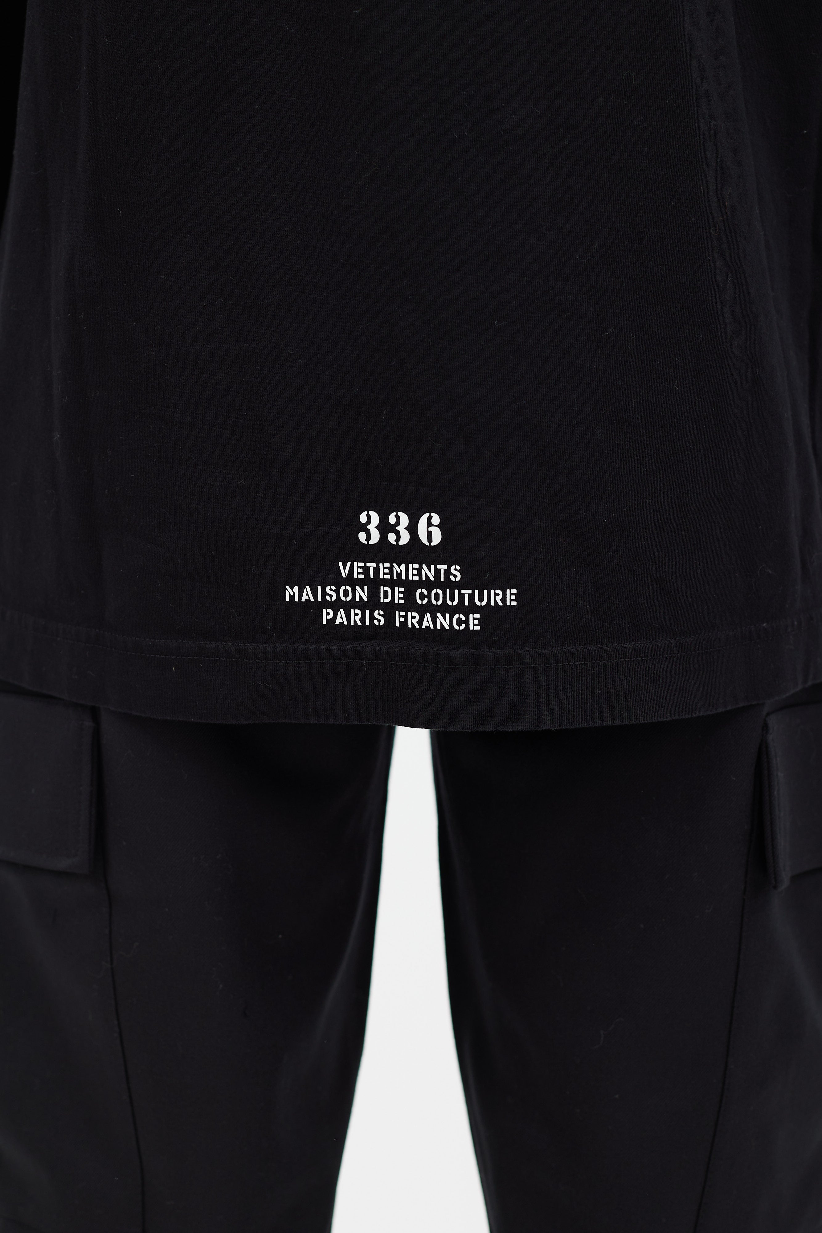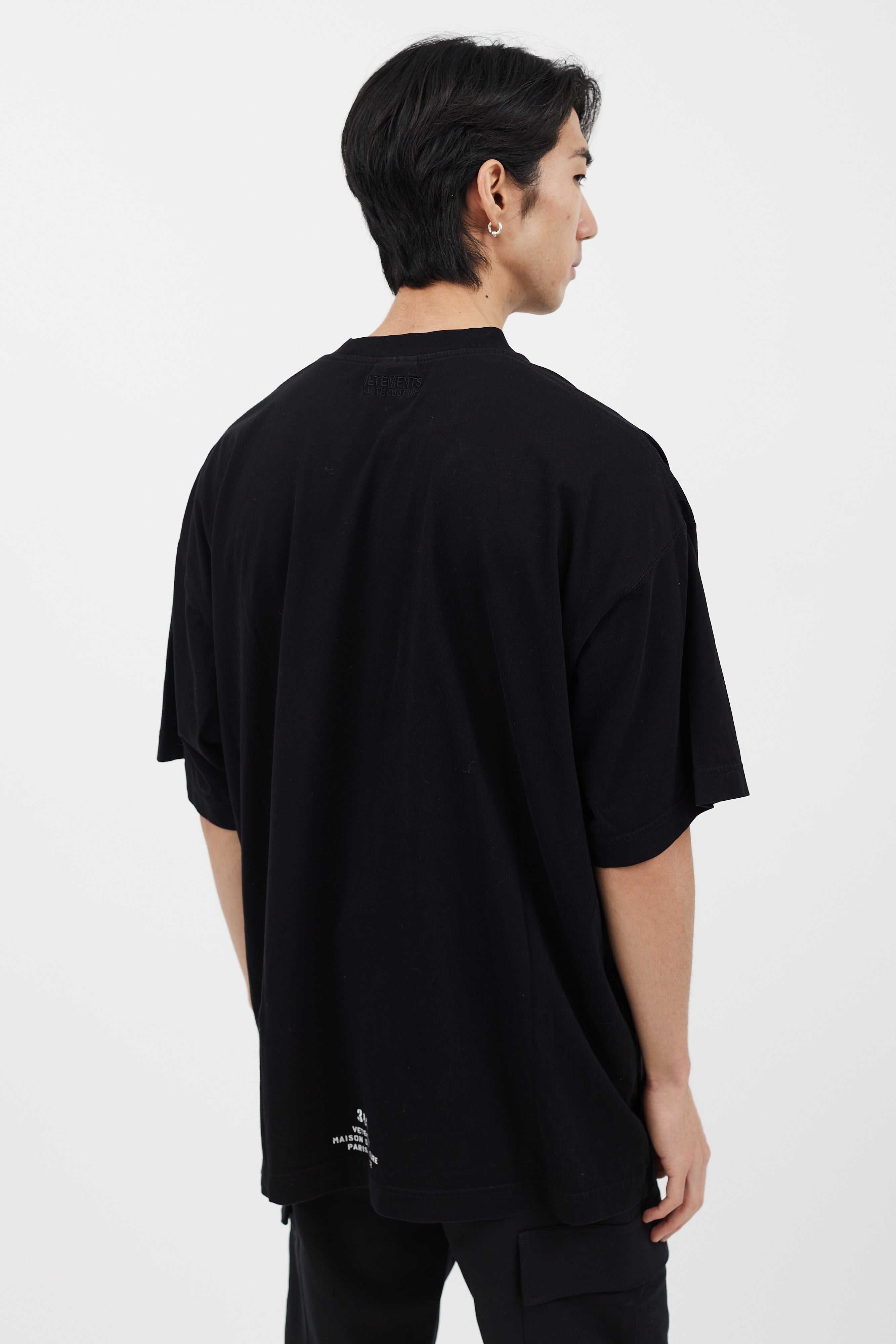 Pre-owned Vetements black t-shirt featuring white logo print at front, crew neckline, and short sleeves.