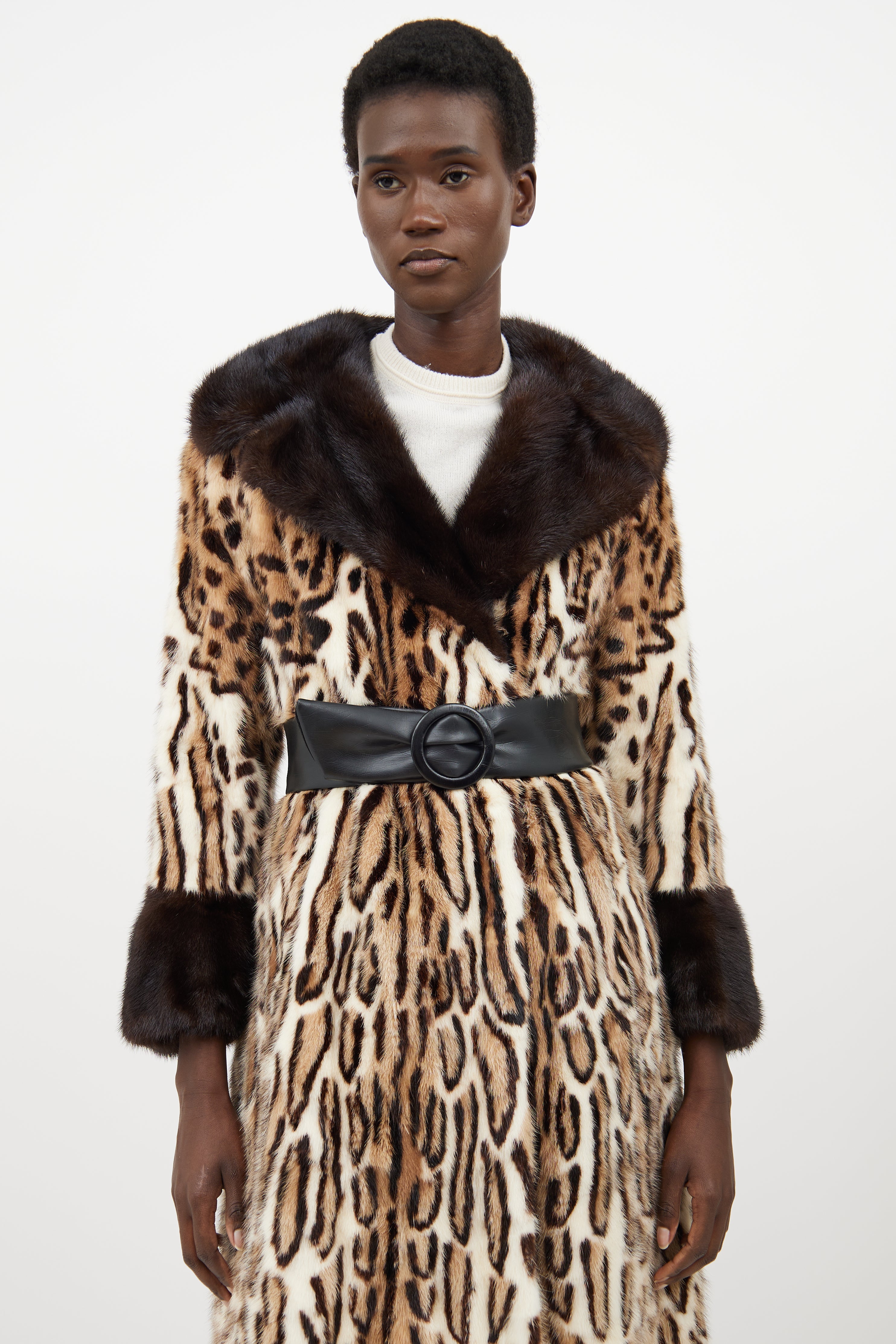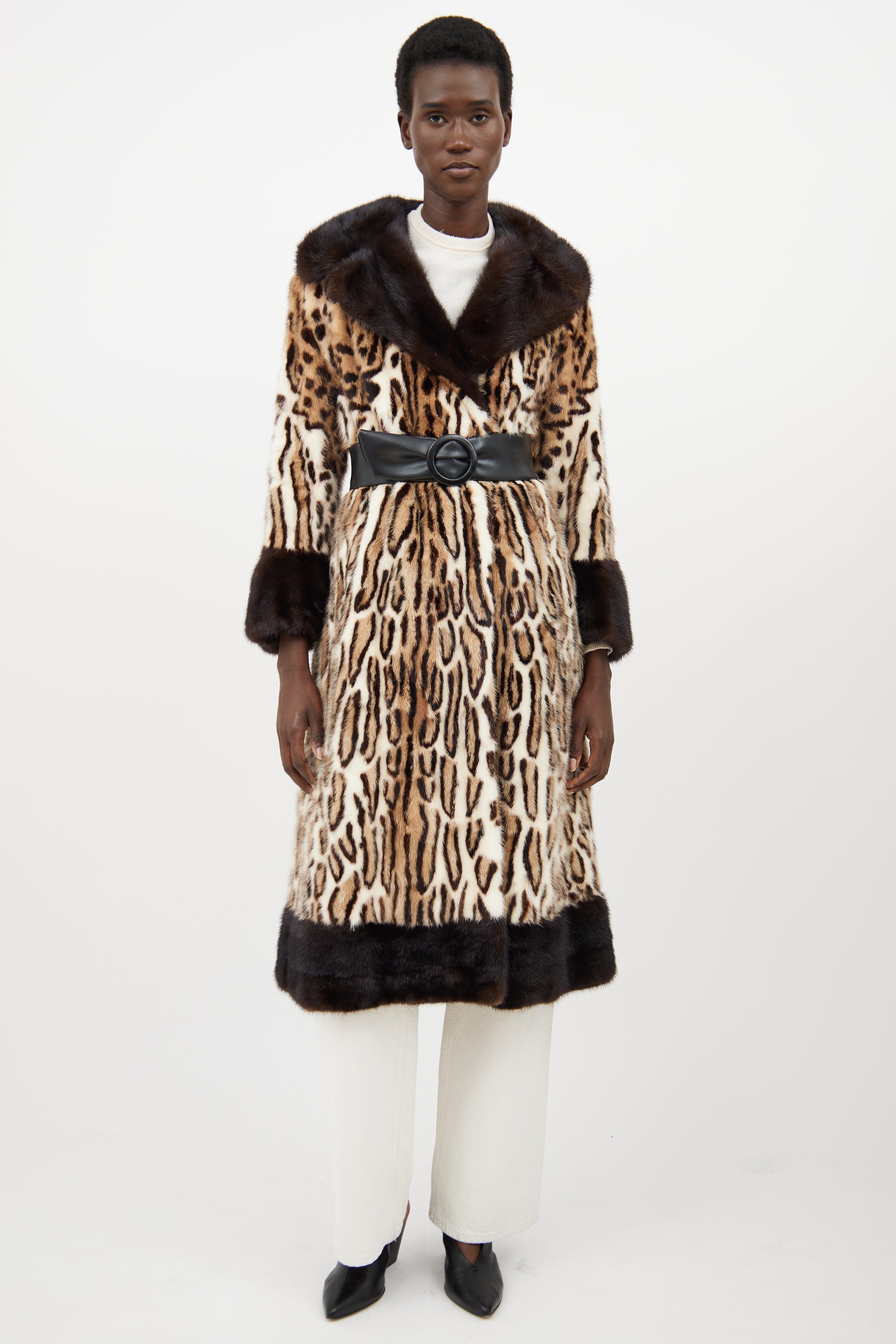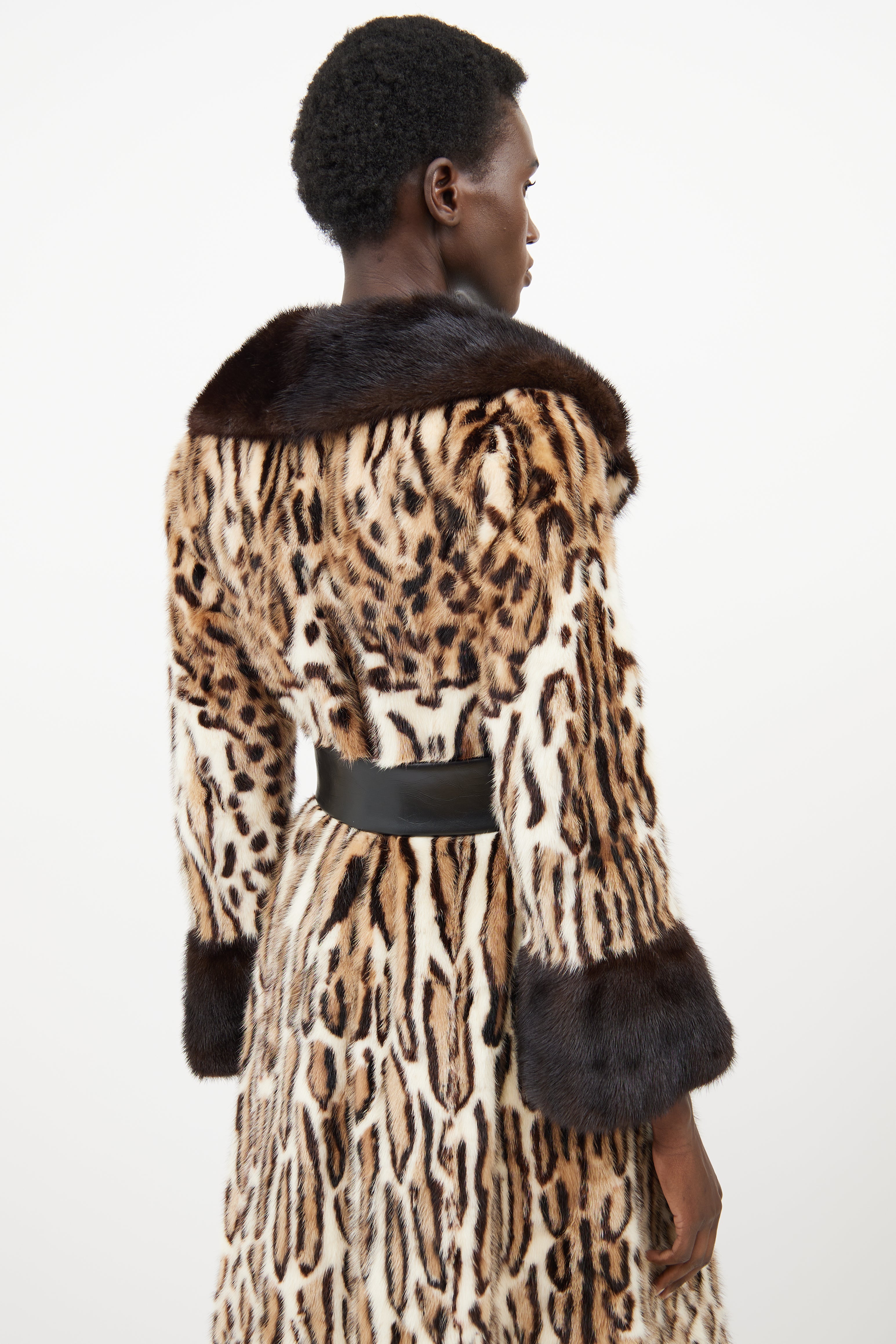 Pre-owned Simpsons beige fur coat featuring a spotted pattern throughout, peak lapel, long flared sleeves, two slip pockets at hip, adjustable belt at waist, and hook and eye closure. Lined.