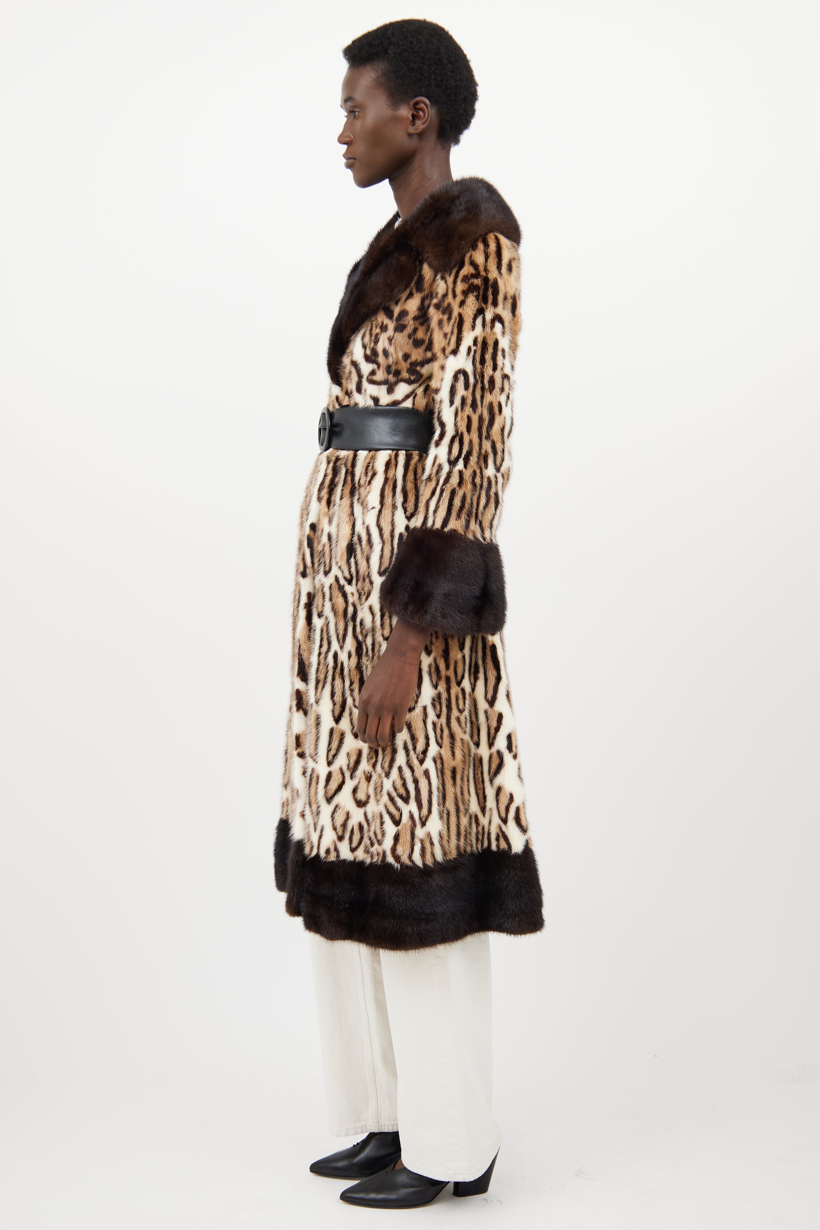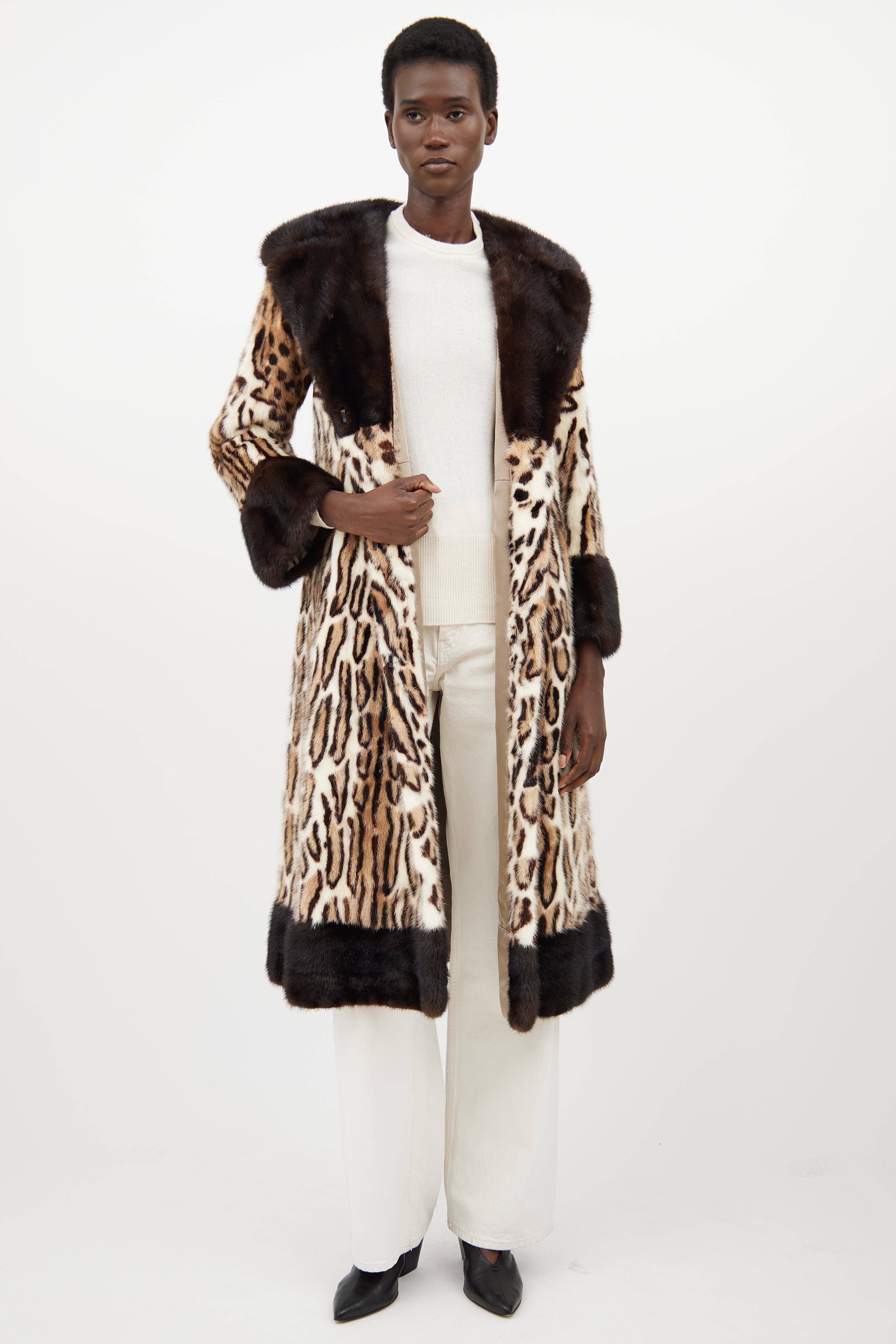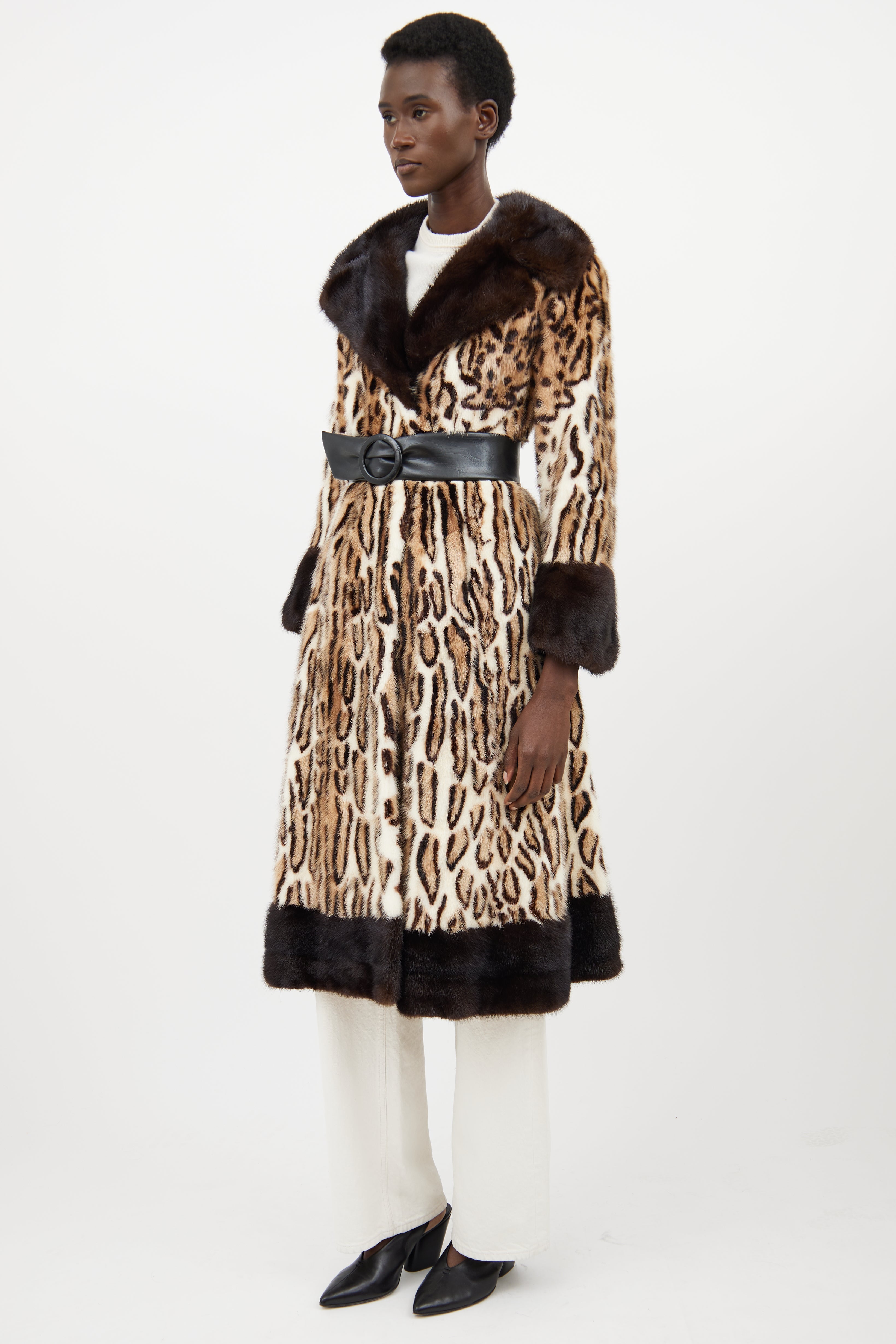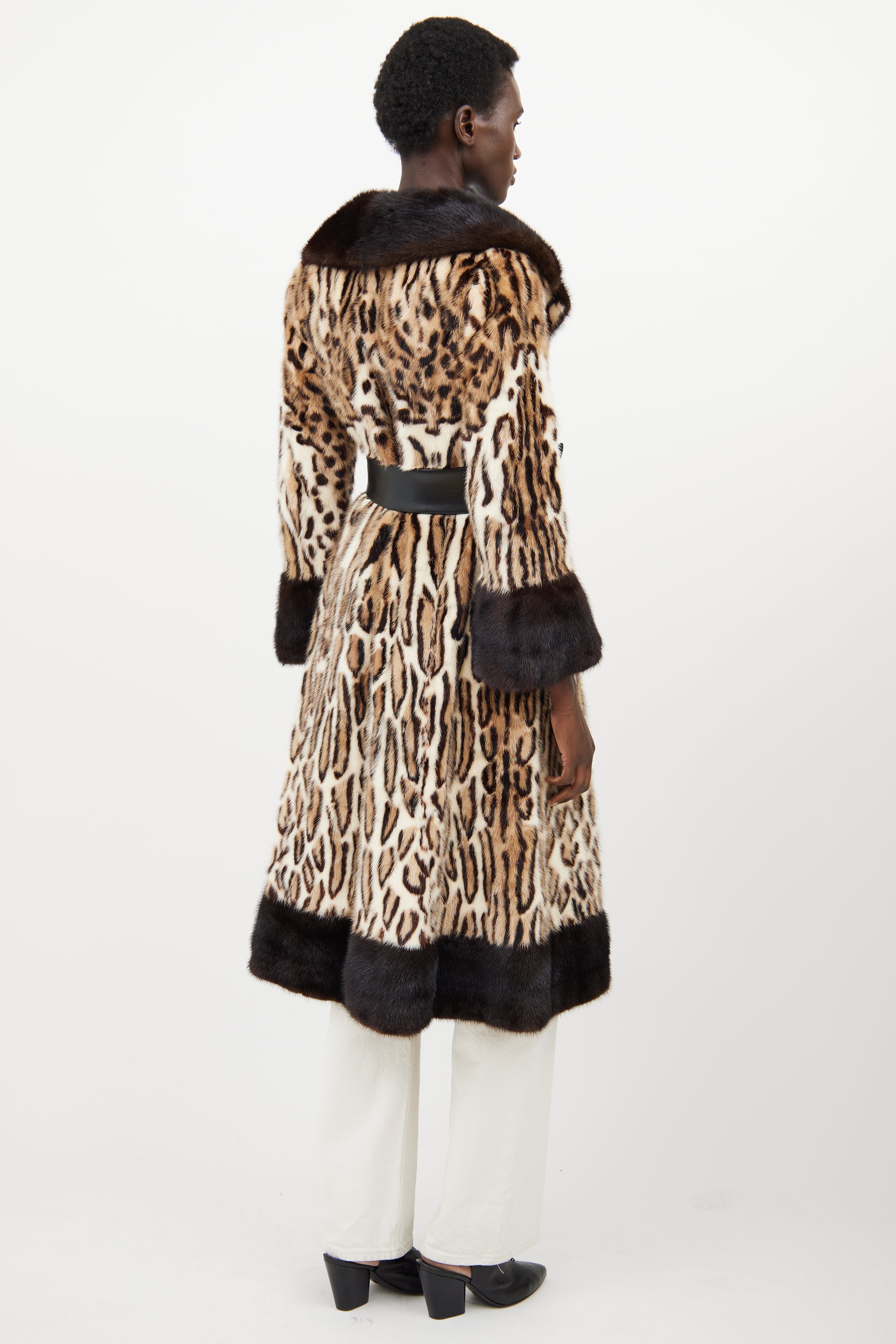 Pre-owned Simpsons beige fur coat featuring a spotted pattern throughout, peak lapel, long flared sleeves, two slip pockets at hip, adjustable belt at waist, and hook and eye closure. Lined.