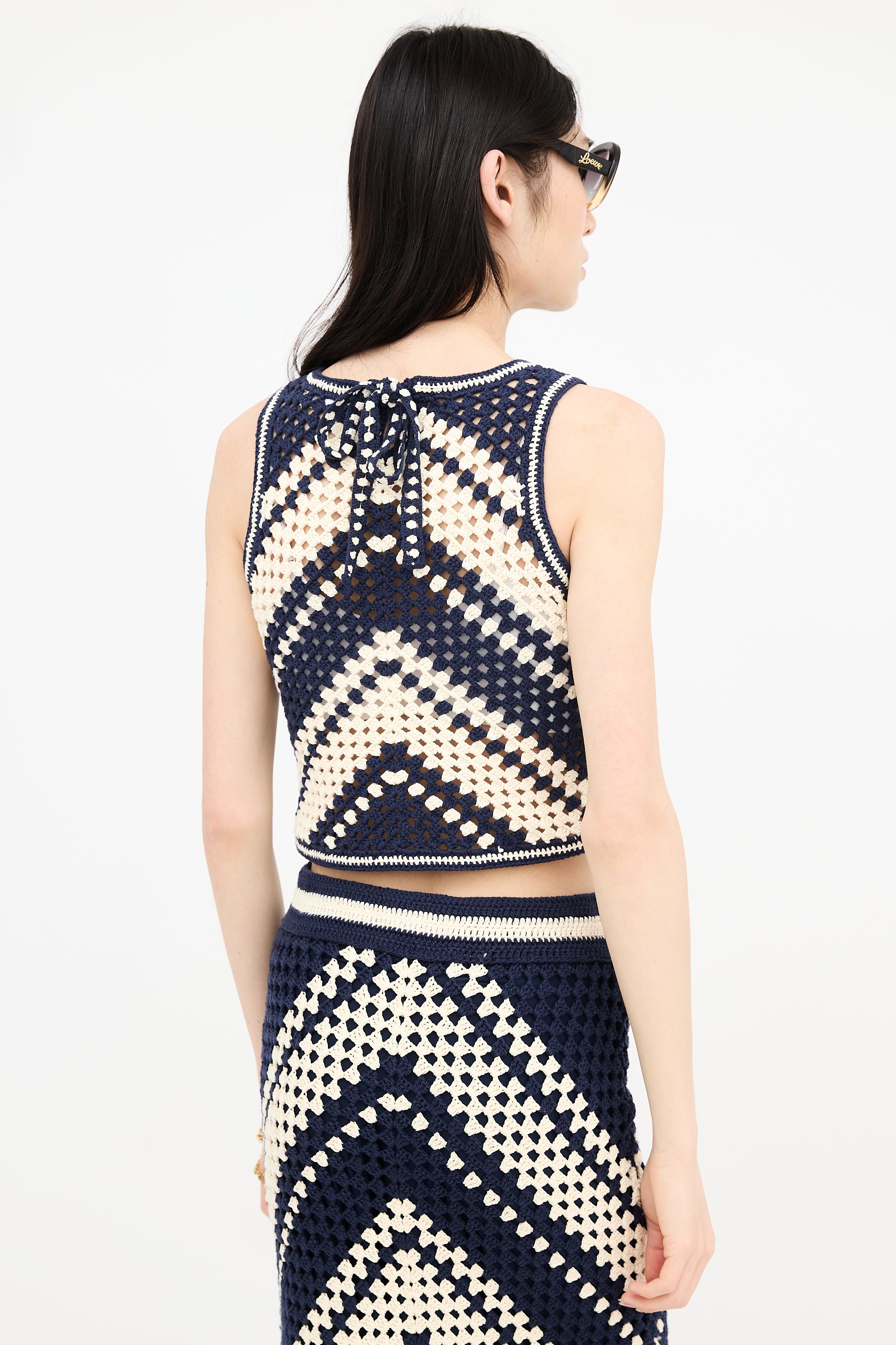 Pre-owned Zimmermann navy and cream crochet crop top featuring round neckline, herringbone pattern, back neck ribbon closure, and garter stitch trim at neck, armholes, and hem.