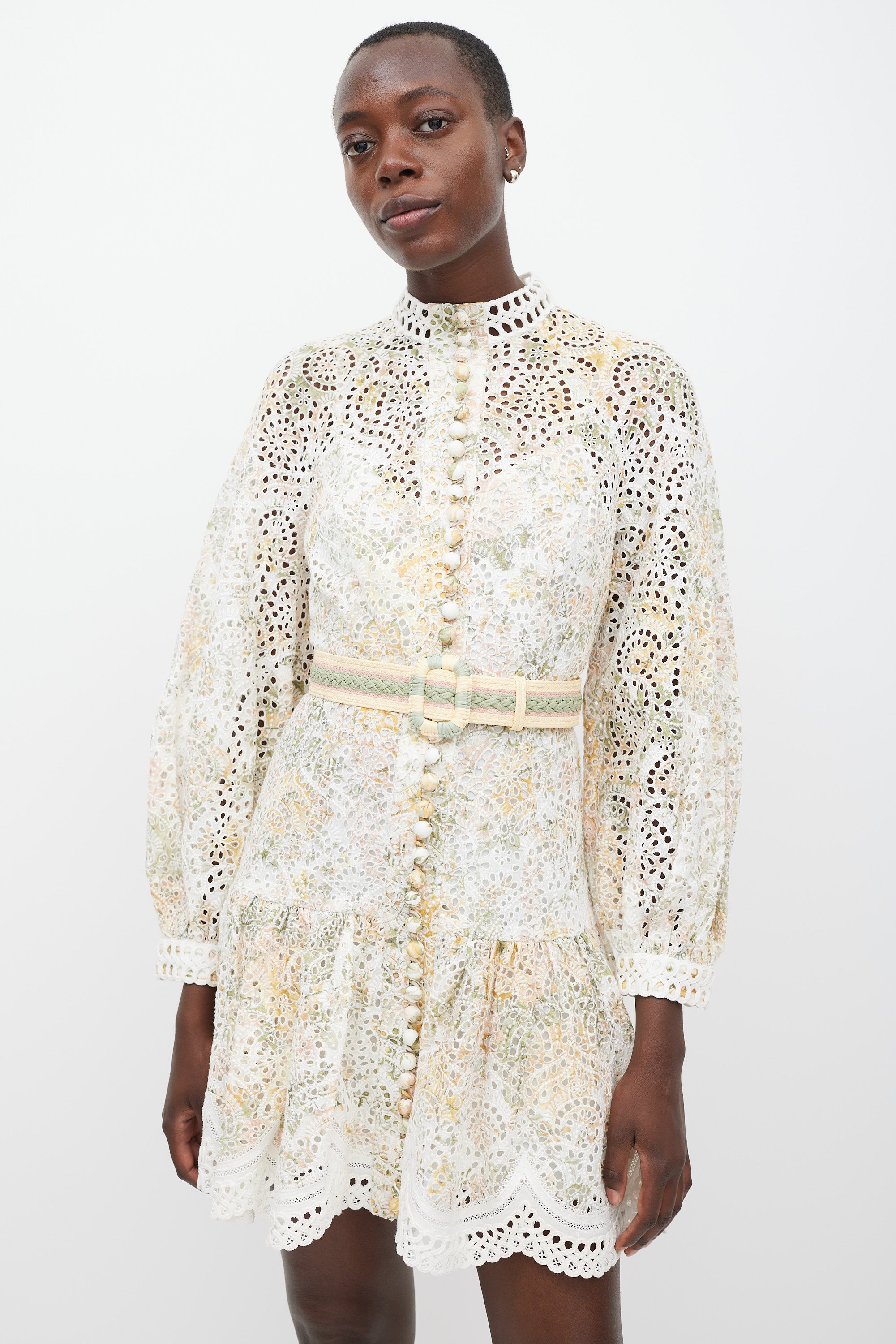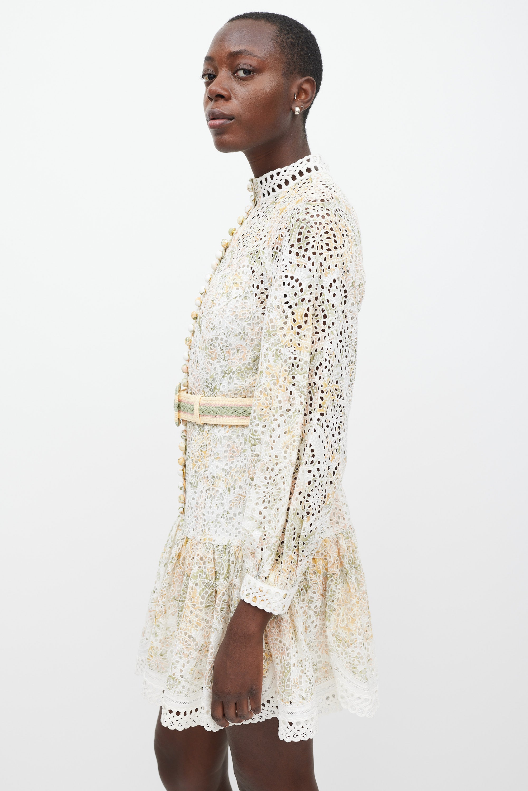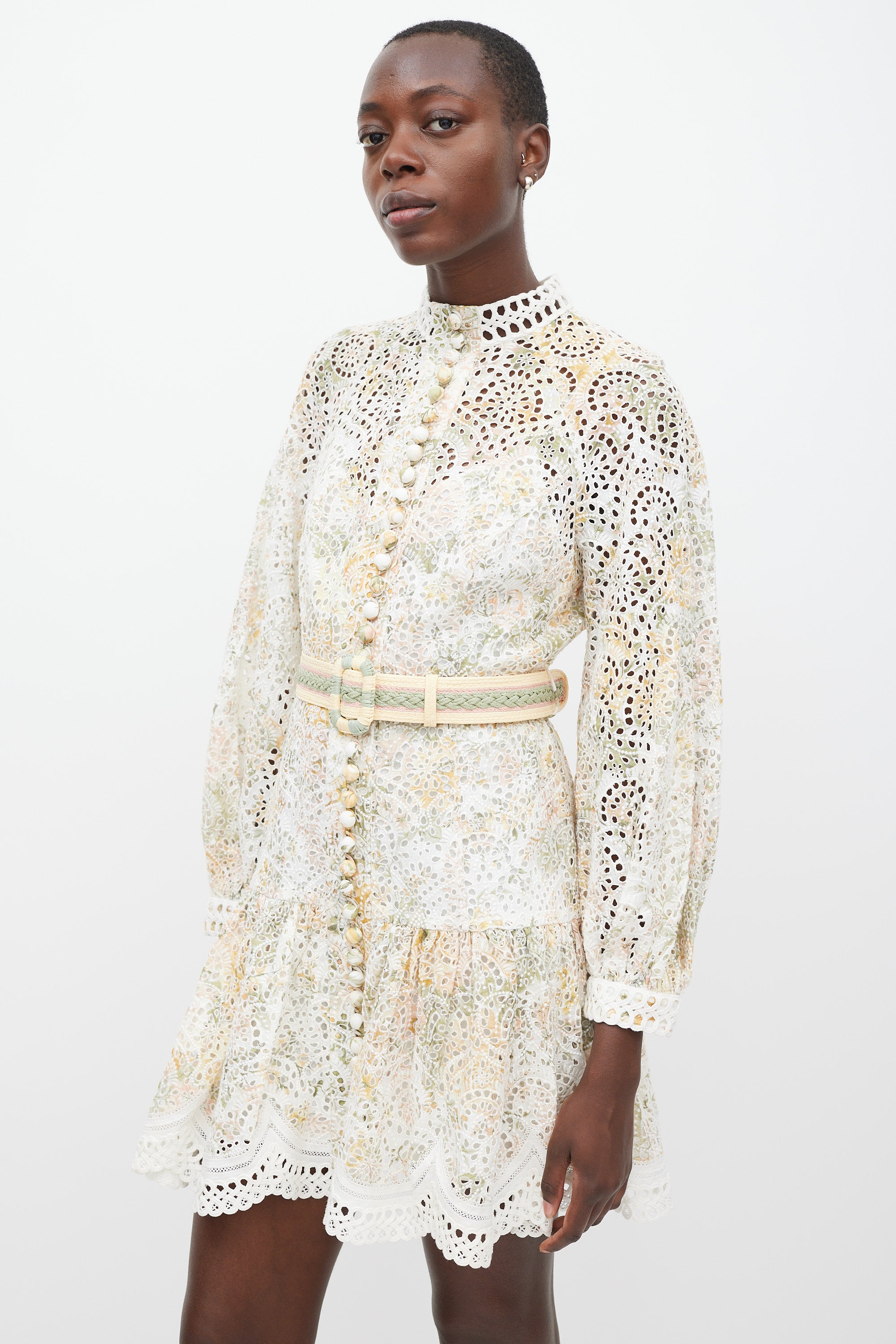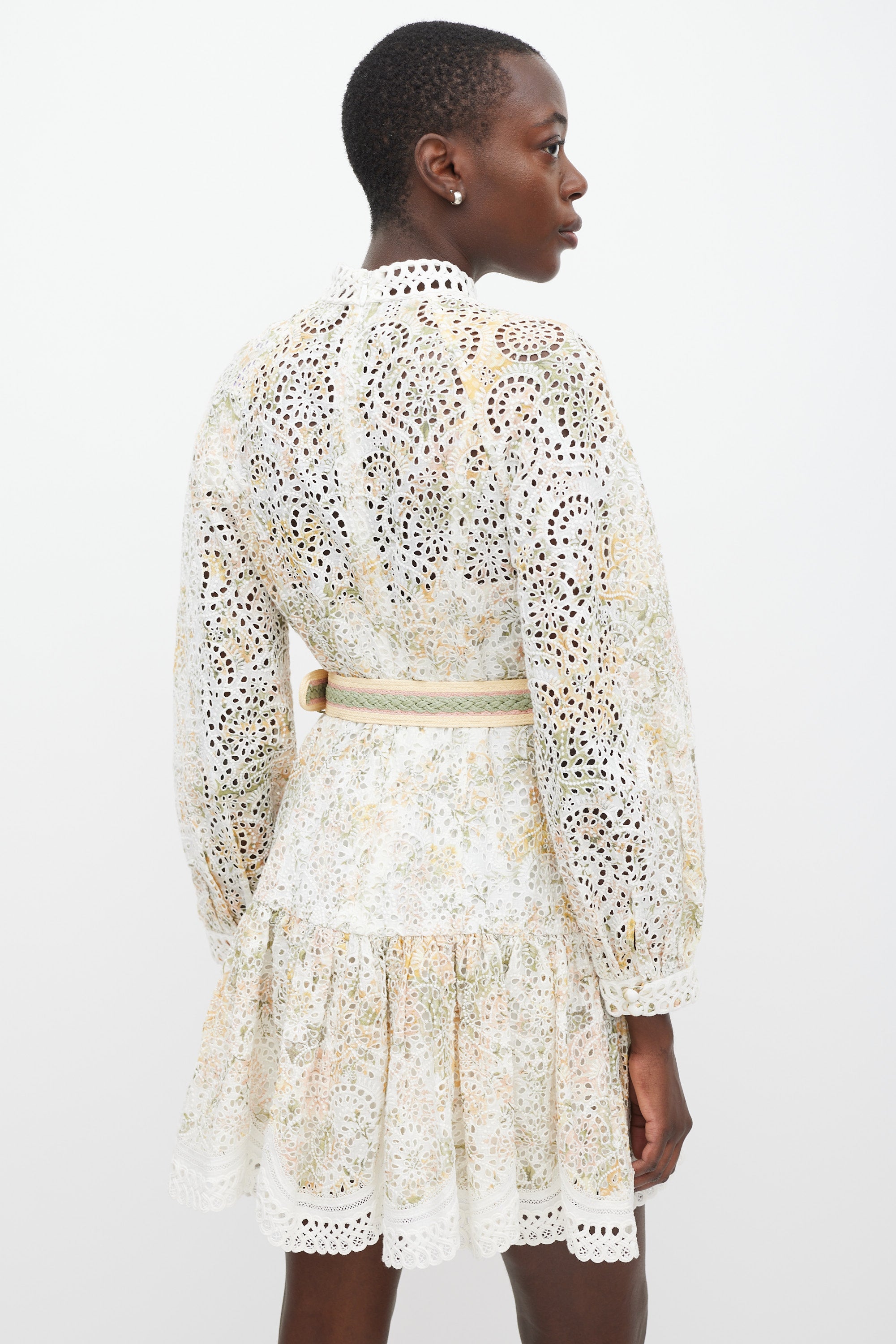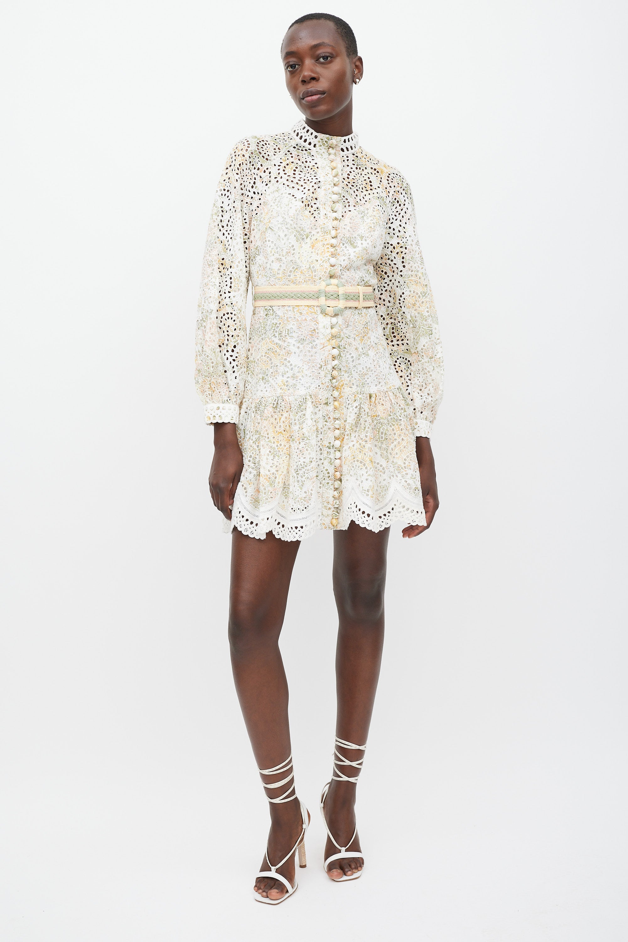Zimmermann white linen dress featuring a multicolour floral pattern, round neckline, long raglan sleeves with buttoned cuffs, eyelet cut out detailing throughout, ruffled skirt, wrapped button up detail at front, adjustable woven raffia belt at waist, and zip closure at back. Comes with matching slip.